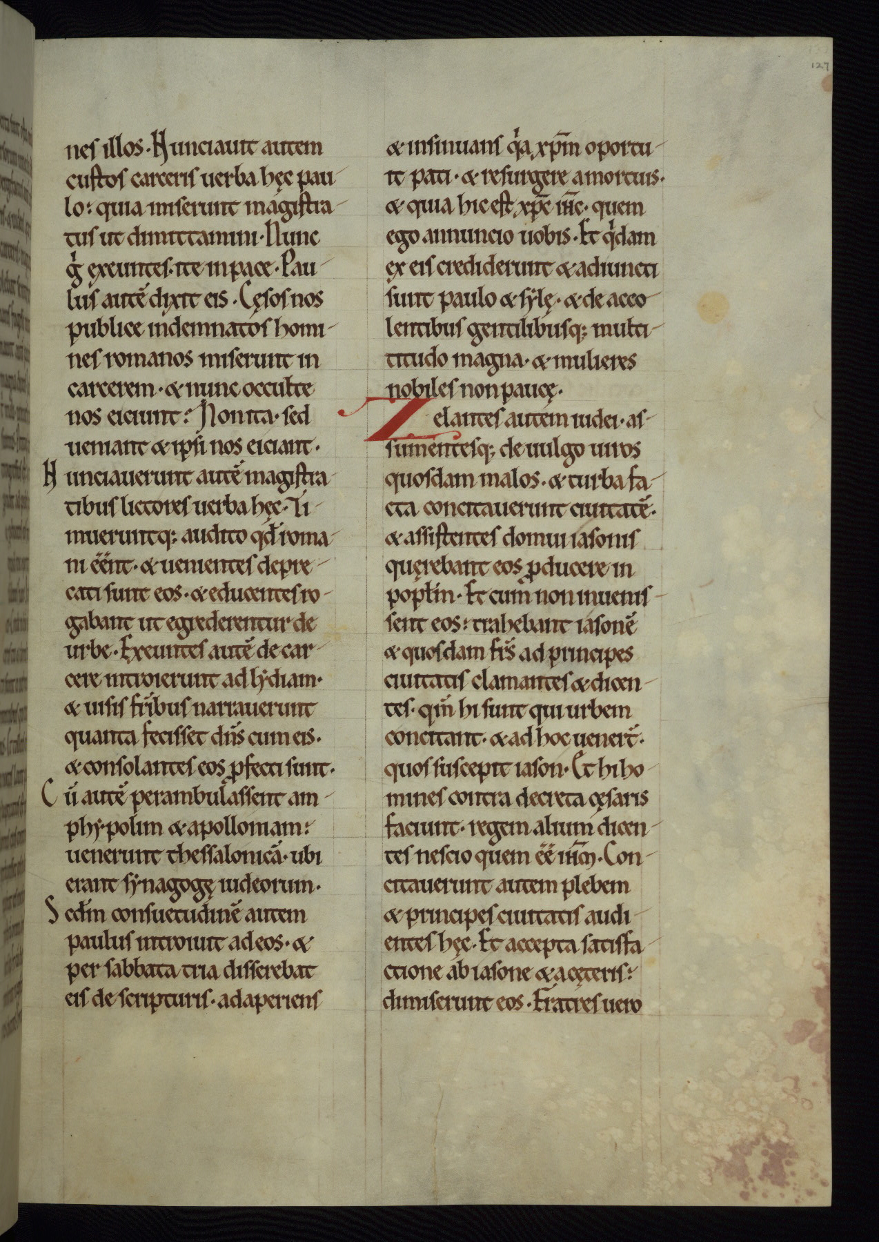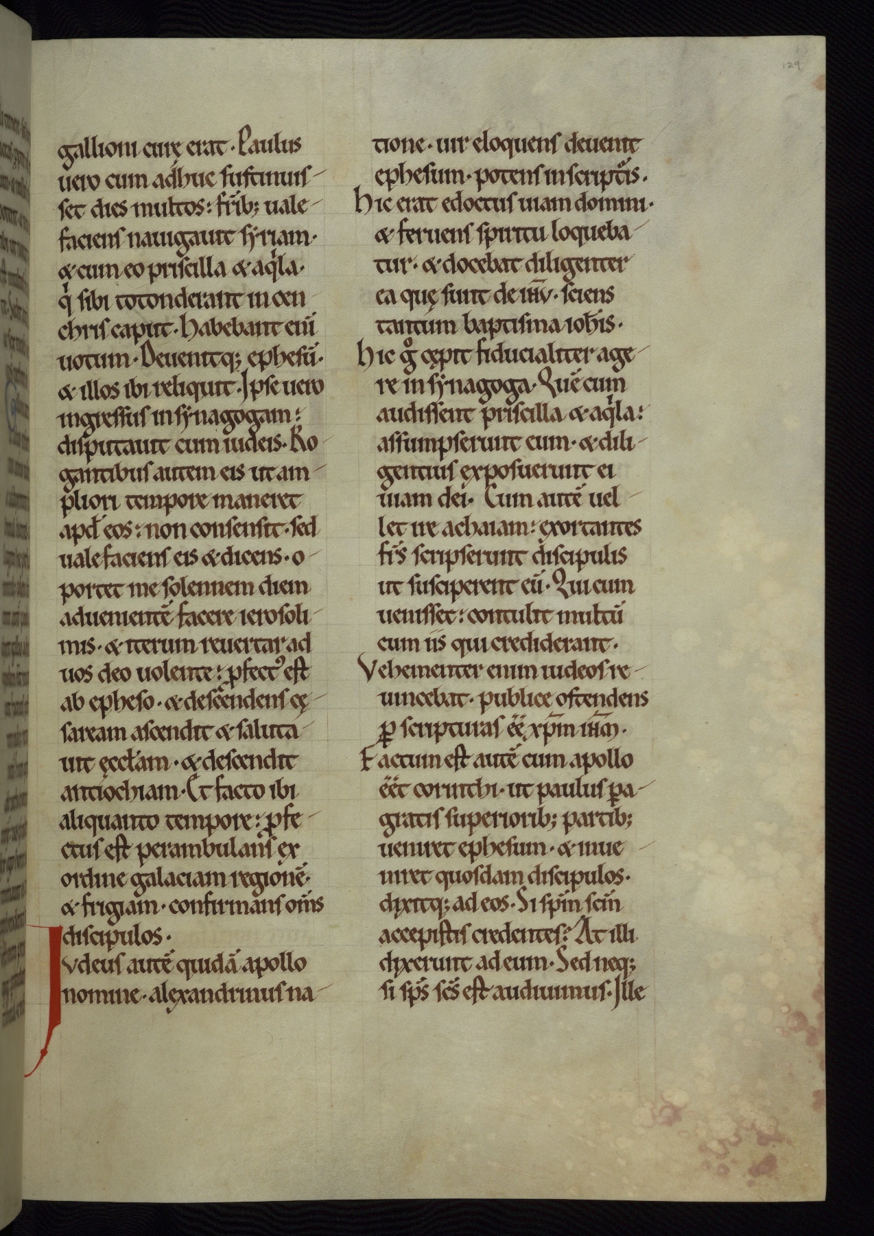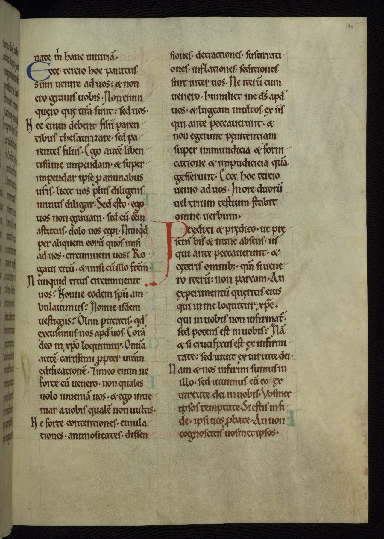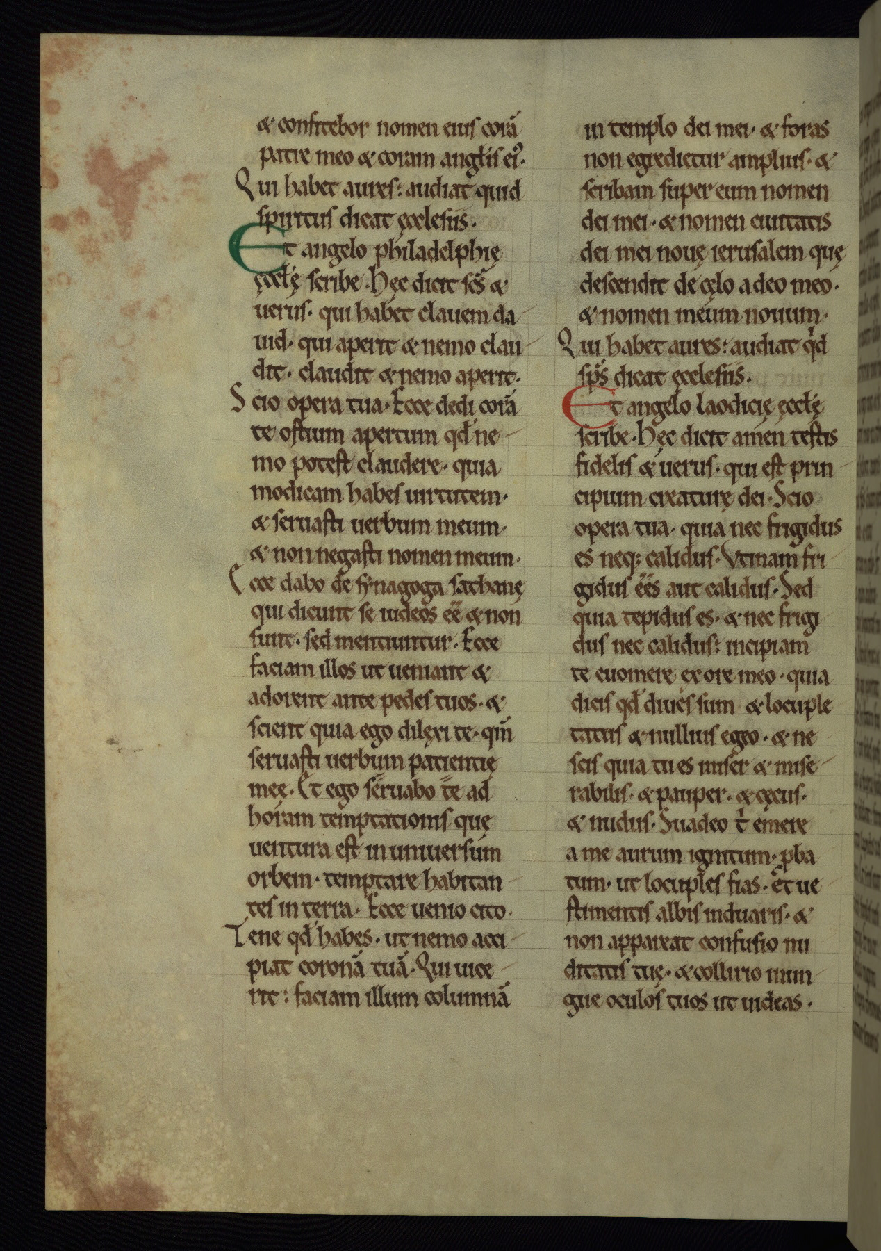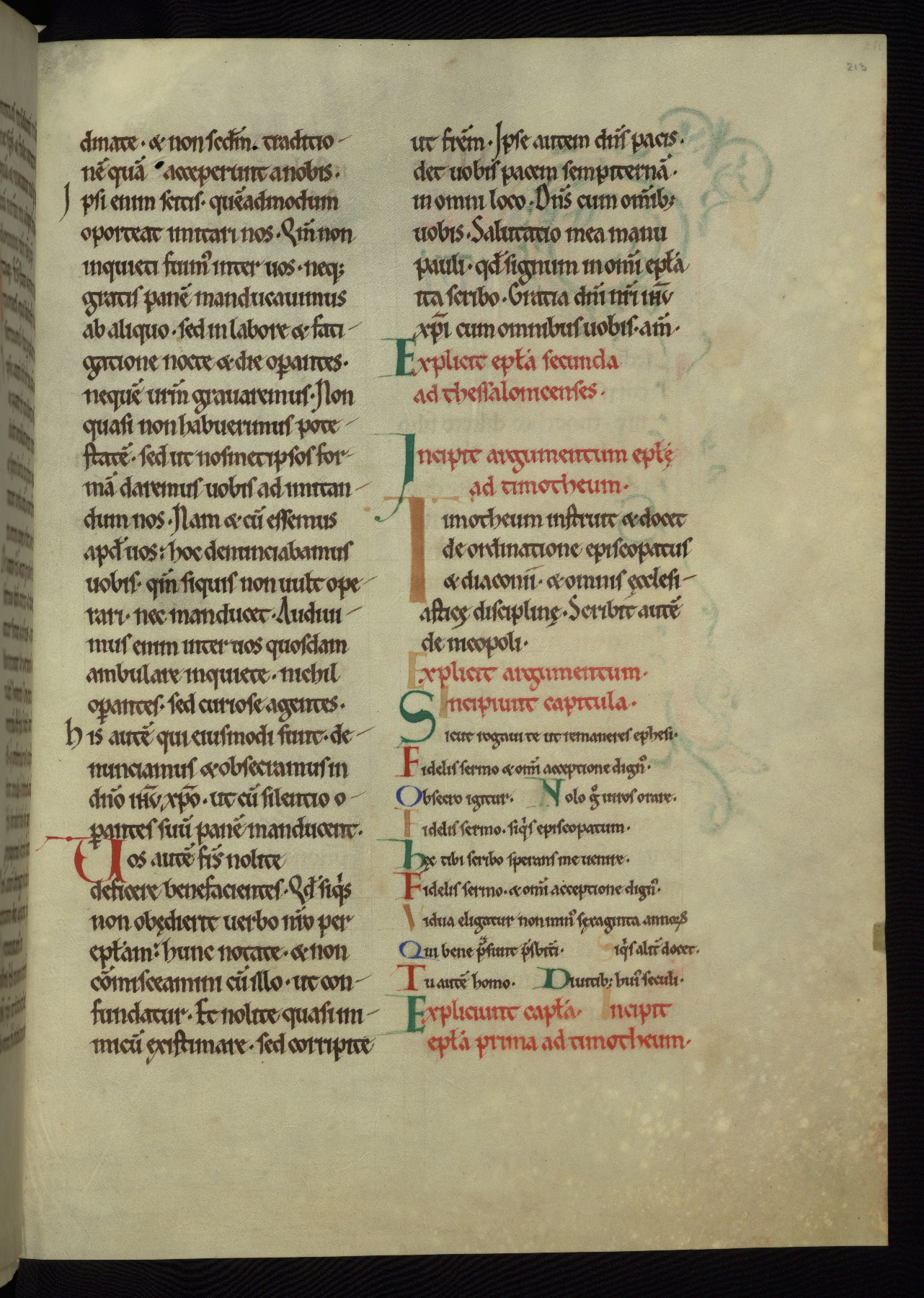 This large-format copy of the New Testament was almost certainly created at Rochester Cathedral Priory, England, in the first half of the twelfth century. It was part of a five-volume Bible, only one other volume of which, London, British Library Ms. Royal I.C.VII, has survived. The decorated initials in these manuscripts compare closely with those in other books securely attributed to Rochester. Textually these books are closely related to the Gundulph Bible (San Marino, Huntington Library Ms. HM 62), known to have been produced at Rochester in the second half of the eleventh century. Although neither the Walters' nor the British Library's volume includes an inscription associating this Bible with Rochester, the two medieval catalogs of the Rochester Cathedral library, produced around 1130 and in 1202, contain references to manuscripts that correspond well with them. The book’s large size indicates it that was designed to be read aloud, either during services or at meals in the refectory. Large, fanciful initials filled with succulent foliage, fruit, dragons, animals, and human faces begin each section of the text. Executed in a vibrant palette of red, blue, green, ochre (in place of gold), and yellow, the intricate, dynamic designs capture the essence of Romanesque manuscript illumination. Royal I.C.VII also includes four historiated initials (for the books of Joshua, I Samuel, 2 Samuel, and 2 Kings). Although the Bible was made at Rochester, the pre-Gothic script of W.18 in particular is extremely close to that practiced at nearby Canterbury at the time.
