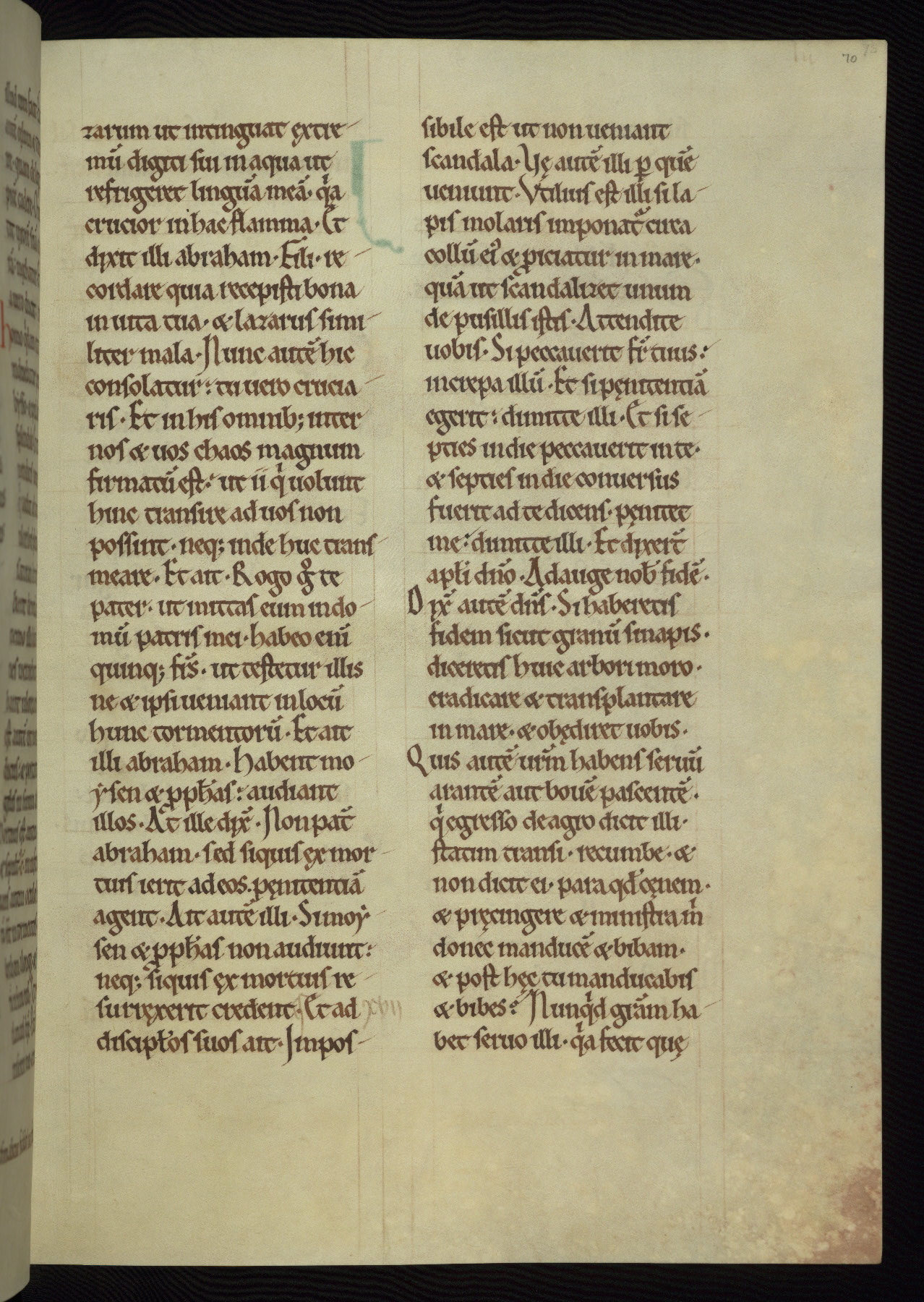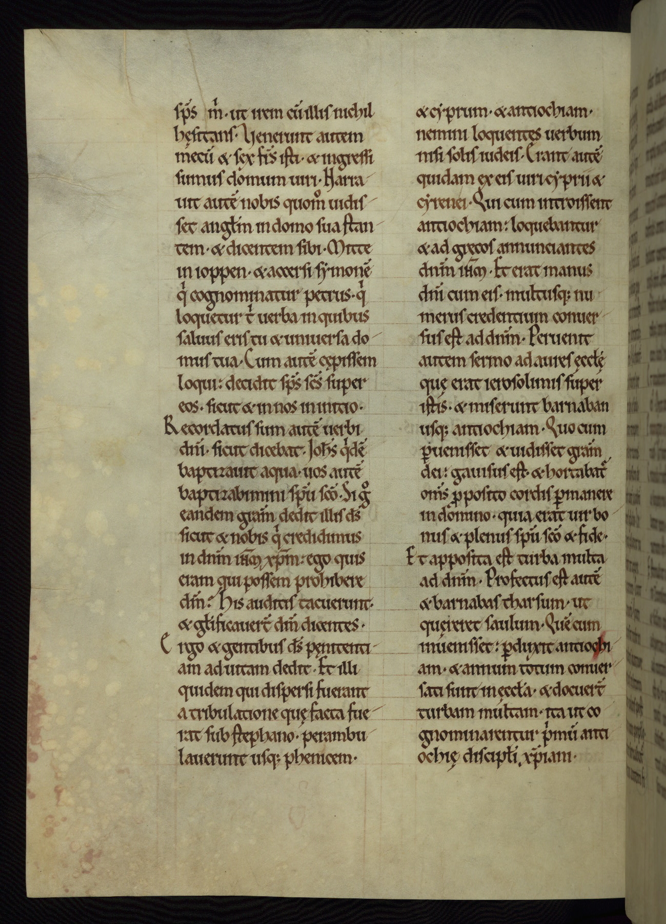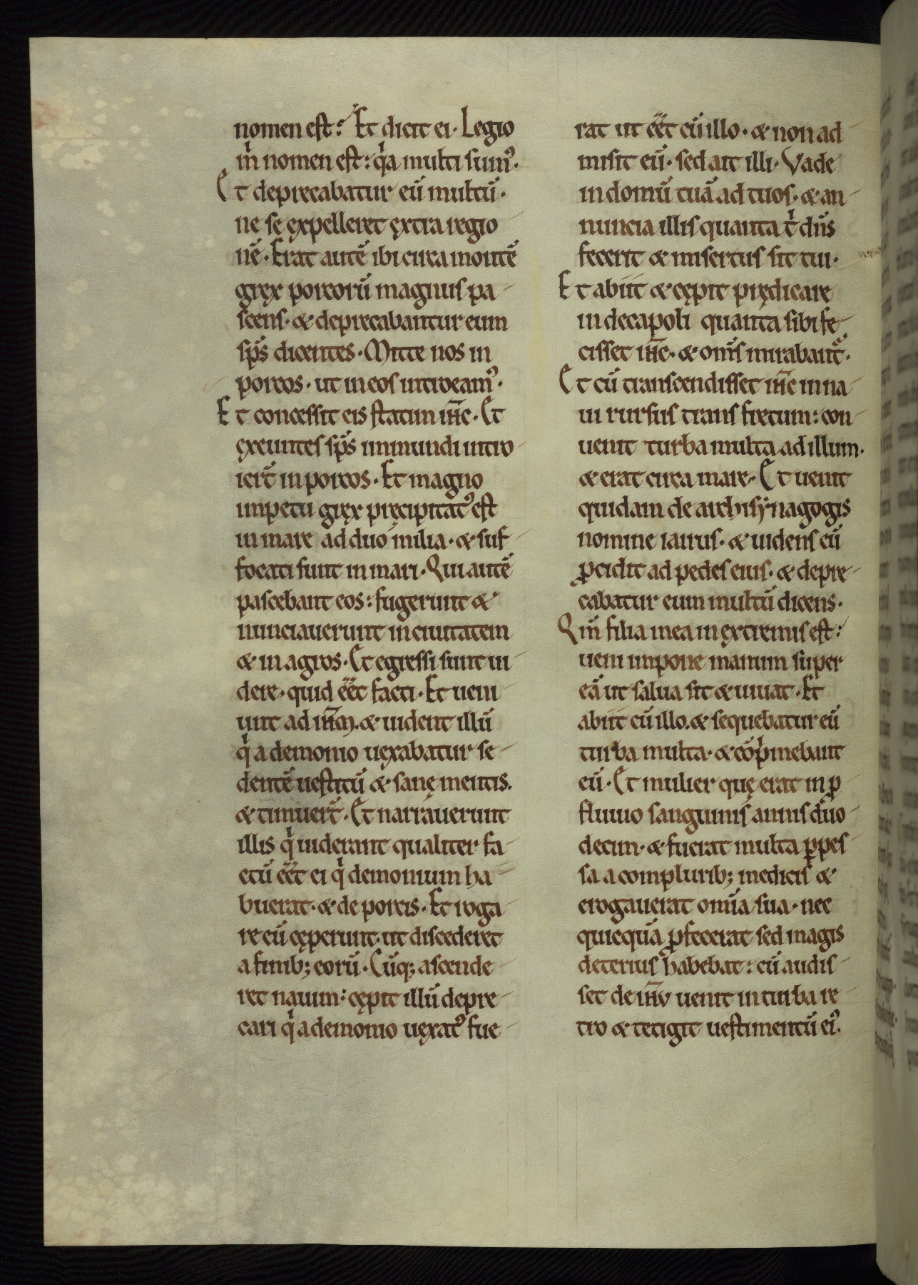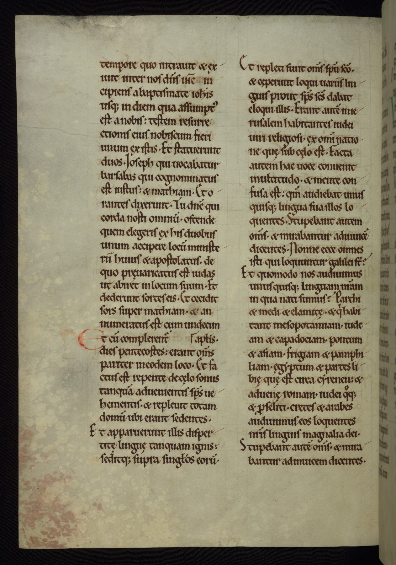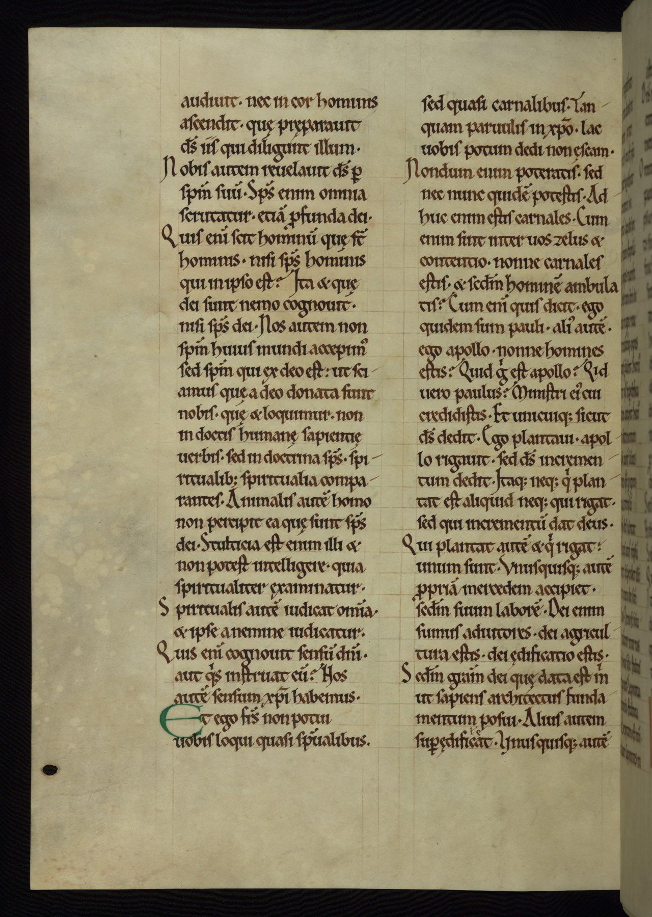 This large-format copy of the New Testament was almost certainly created at Rochester Cathedral Priory, England, in the first half of the twelfth century. It was part of a five-volume Bible, only one other volume of which, London, British Library Ms. Royal I.C.VII, has survived. The decorated initials in these manuscripts compare closely with those in other books securely attributed to Rochester. Textually these books are closely related to the Gundulph Bible (San Marino, Huntington Library Ms. HM 62), known to have been produced at Rochester in the second half of the eleventh century. Although neither the Walters' nor the British Library's volume includes an inscription associating this Bible with Rochester, the two medieval catalogs of the Rochester Cathedral library, produced around 1130 and in 1202, contain references to manuscripts that correspond well with them. The book’s large size indicates it that was designed to be read aloud, either during services or at meals in the refectory. Large, fanciful initials filled with succulent foliage, fruit, dragons, animals, and human faces begin each section of the text. Executed in a vibrant palette of red, blue, green, ochre (in place of gold), and yellow, the intricate, dynamic designs capture the essence of Romanesque manuscript illumination. Royal I.C.VII also includes four historiated initials (for the books of Joshua, I Samuel, 2 Samuel, and 2 Kings). Although the Bible was made at Rochester, the pre-Gothic script of W.18 in particular is extremely close to that practiced at nearby Canterbury at the time.