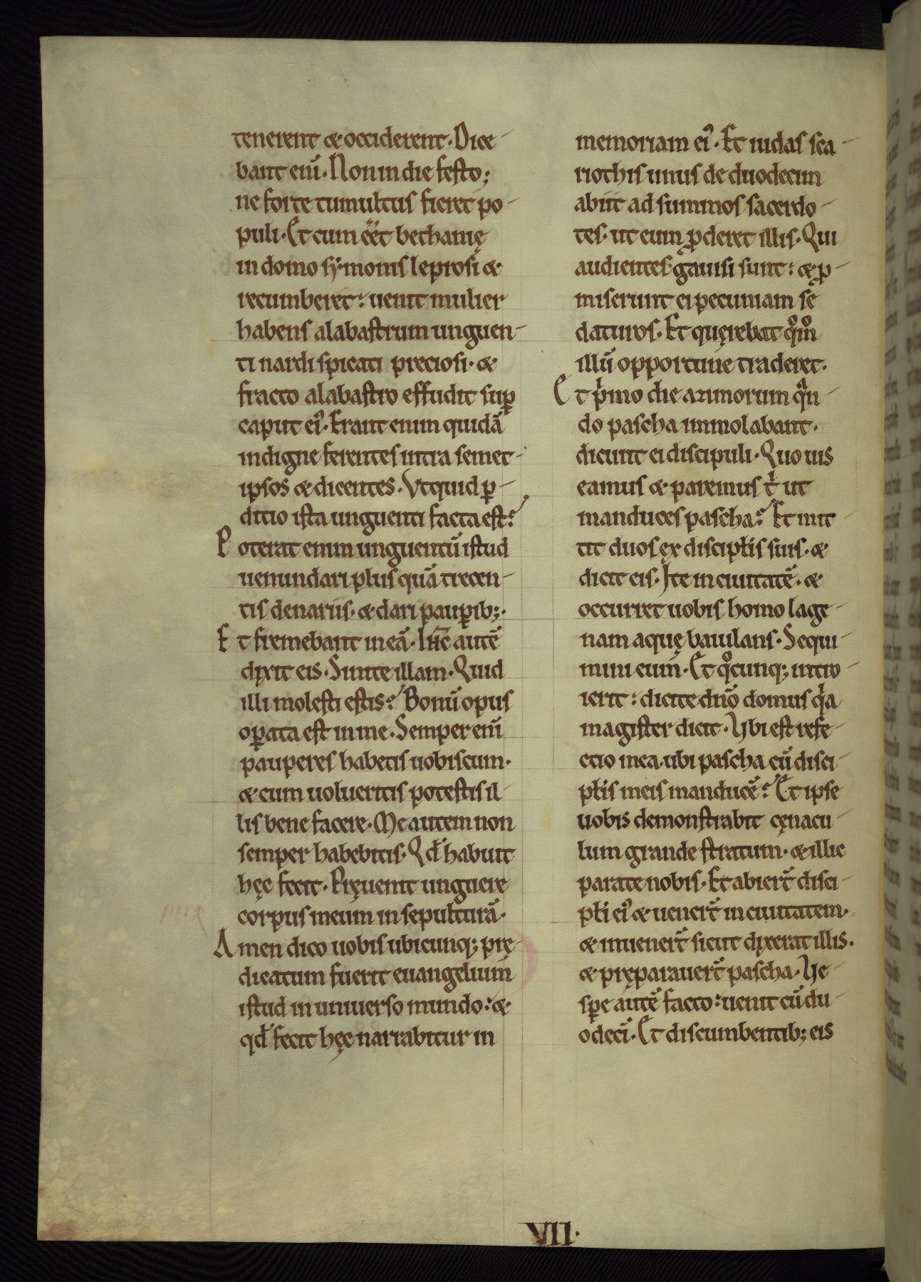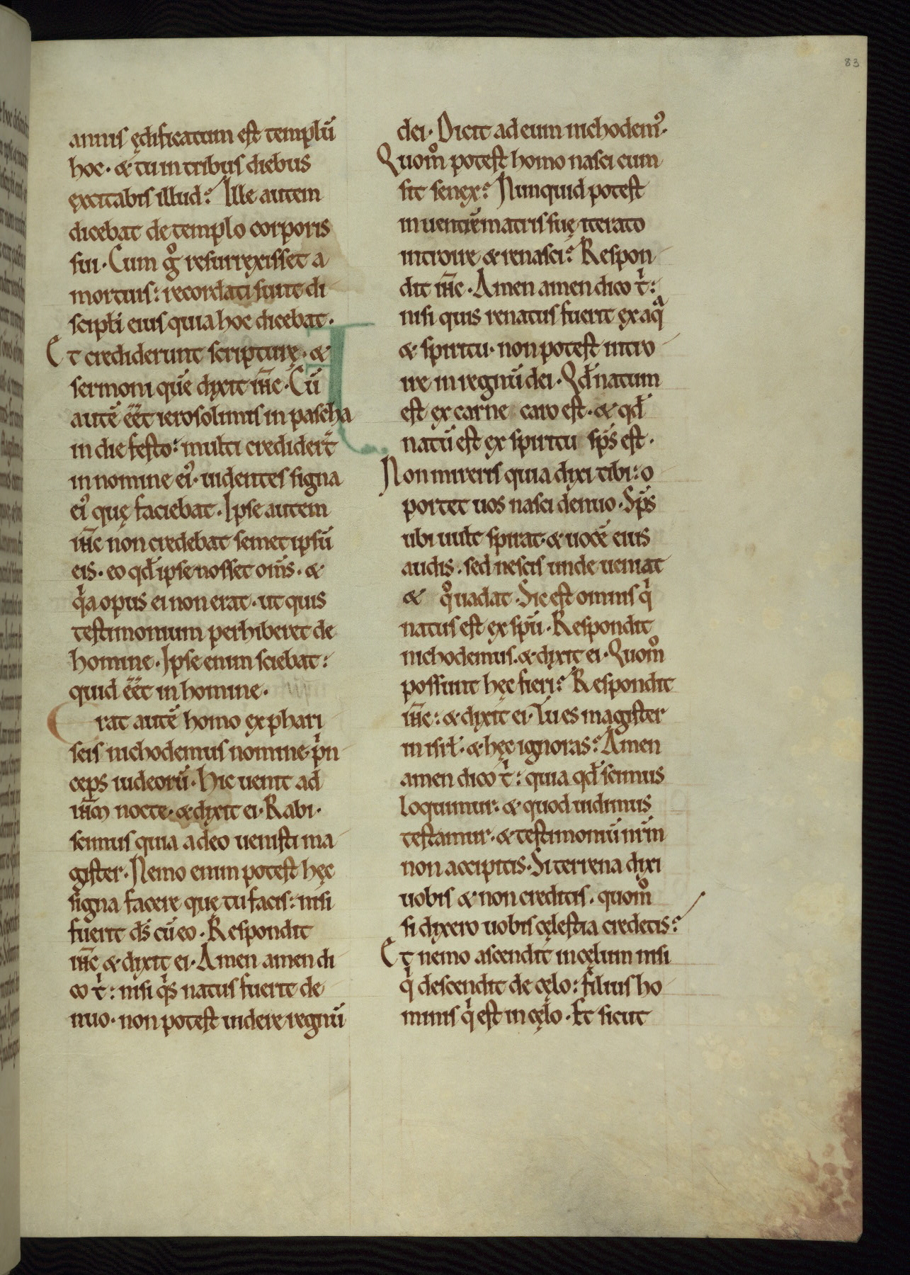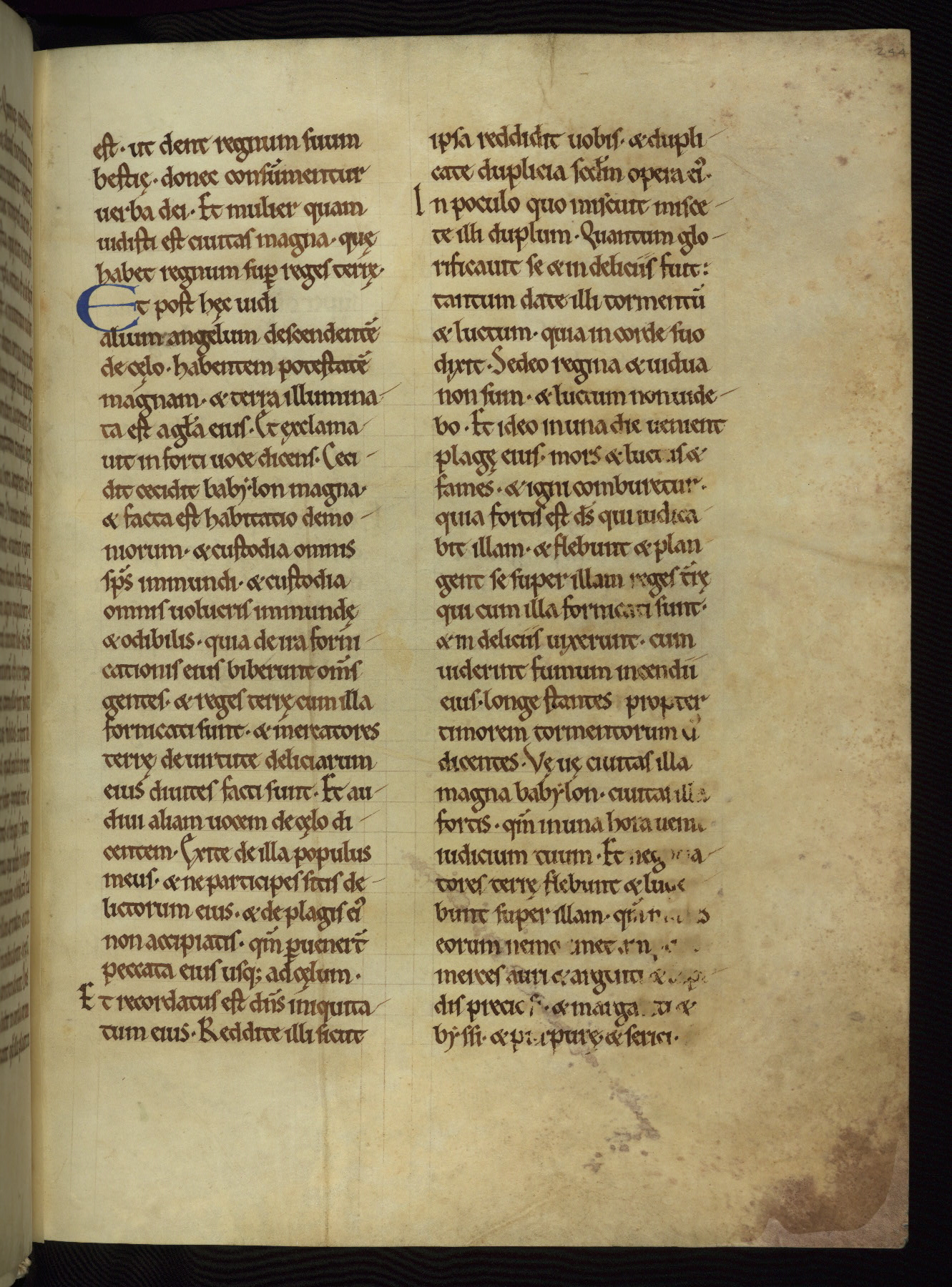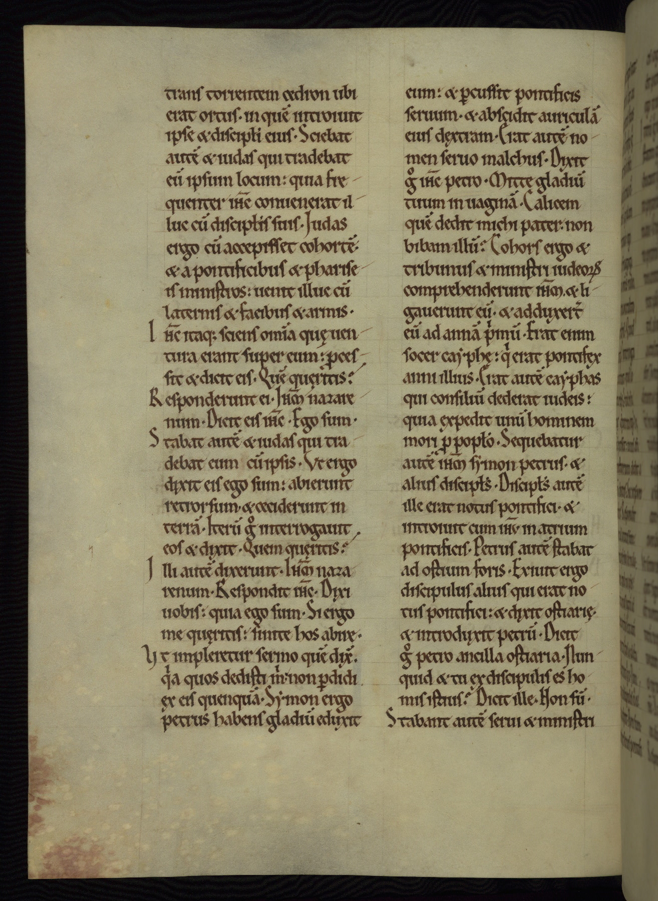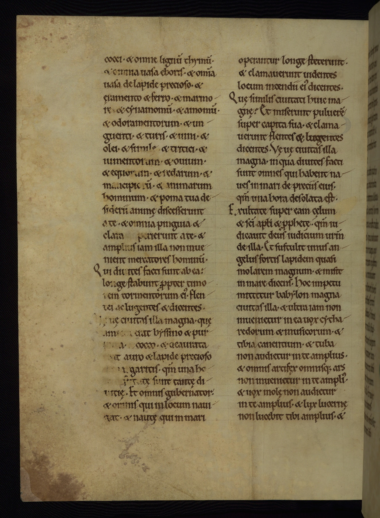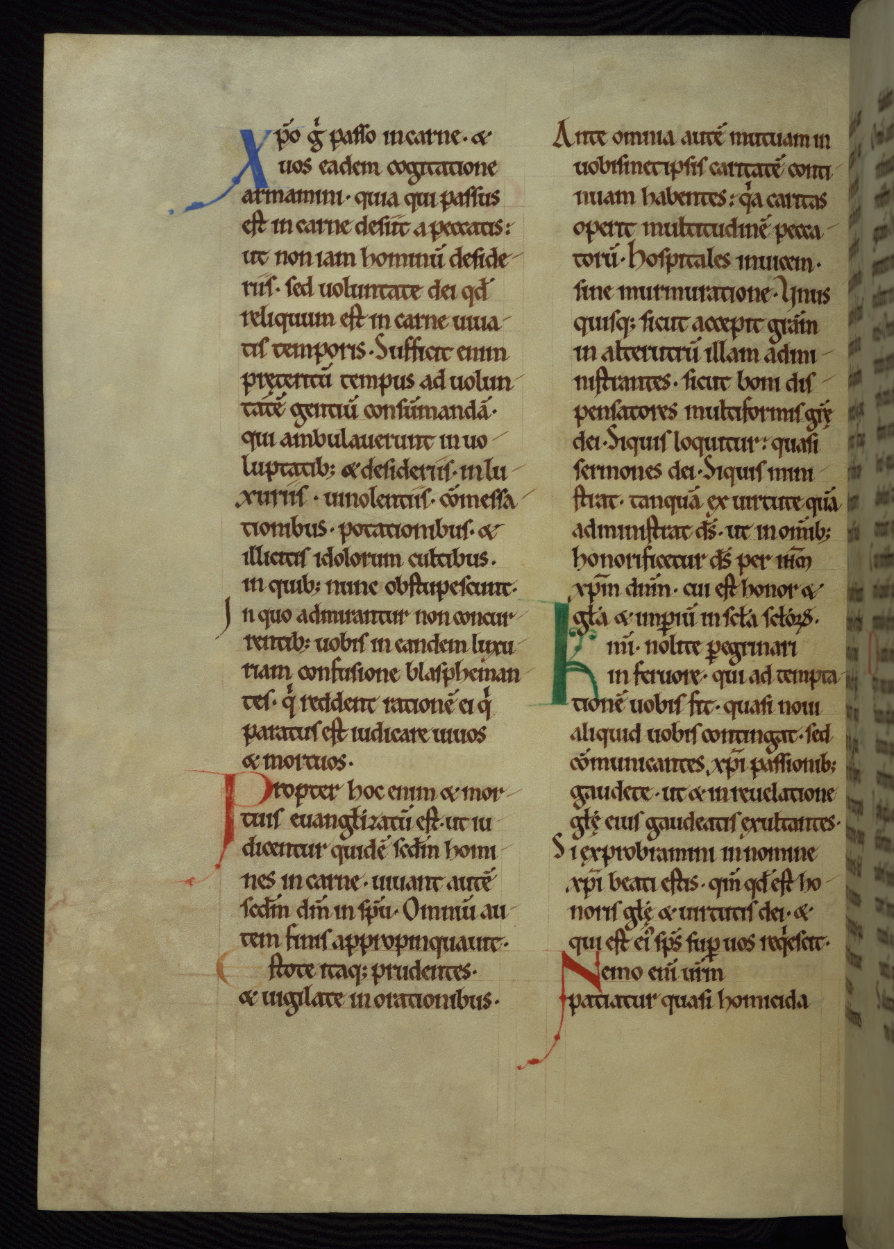 This large-format copy of the New Testament was almost certainly created at Rochester Cathedral Priory, England, in the first half of the twelfth century. It was part of a five-volume Bible, only one other volume of which, London, British Library Ms. Royal I.C.VII, has survived. The decorated initials in these manuscripts compare closely with those in other books securely attributed to Rochester. Textually these books are closely related to the Gundulph Bible (San Marino, Huntington Library Ms. HM 62), known to have been produced at Rochester in the second half of the eleventh century. Although neither the Walters' nor the British Library's volume includes an inscription associating this Bible with Rochester, the two medieval catalogs of the Rochester Cathedral library, produced around 1130 and in 1202, contain references to manuscripts that correspond well with them. The book’s large size indicates it that was designed to be read aloud, either during services or at meals in the refectory. Large, fanciful initials filled with succulent foliage, fruit, dragons, animals, and human faces begin each section of the text. Executed in a vibrant palette of red, blue, green, ochre (in place of gold), and yellow, the intricate, dynamic designs capture the essence of Romanesque manuscript illumination. Royal I.C.VII also includes four historiated initials (for the books of Joshua, I Samuel, 2 Samuel, and 2 Kings). Although the Bible was made at Rochester, the pre-Gothic script of W.18 in particular is extremely close to that practiced at nearby Canterbury at the time.
