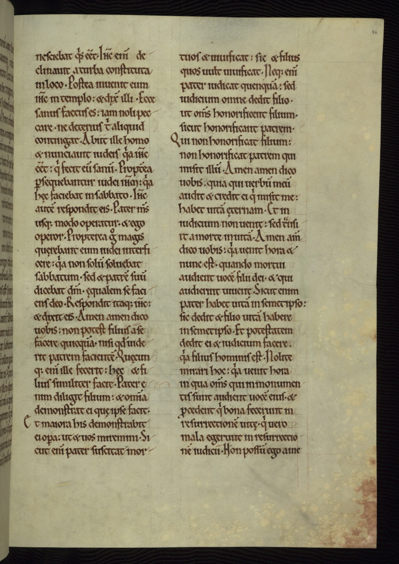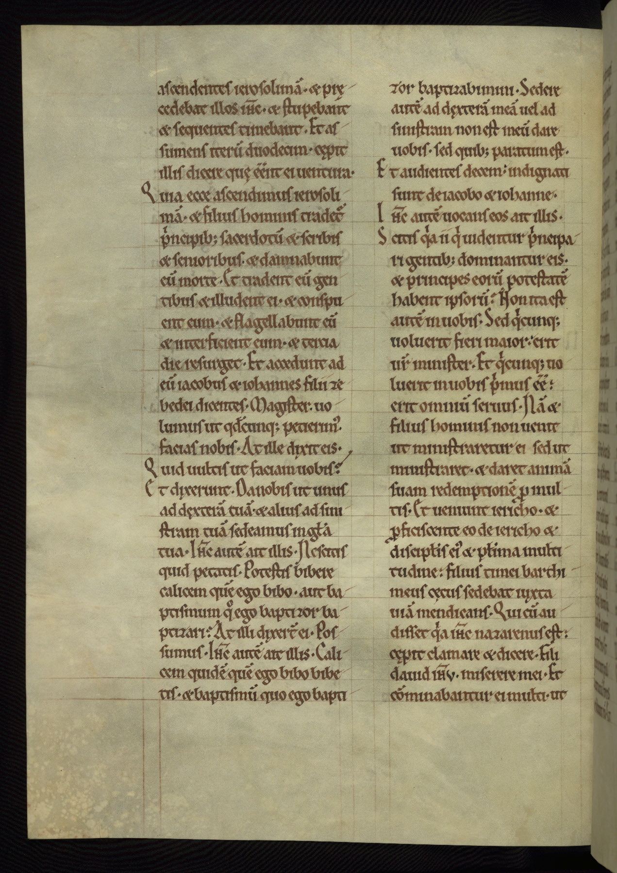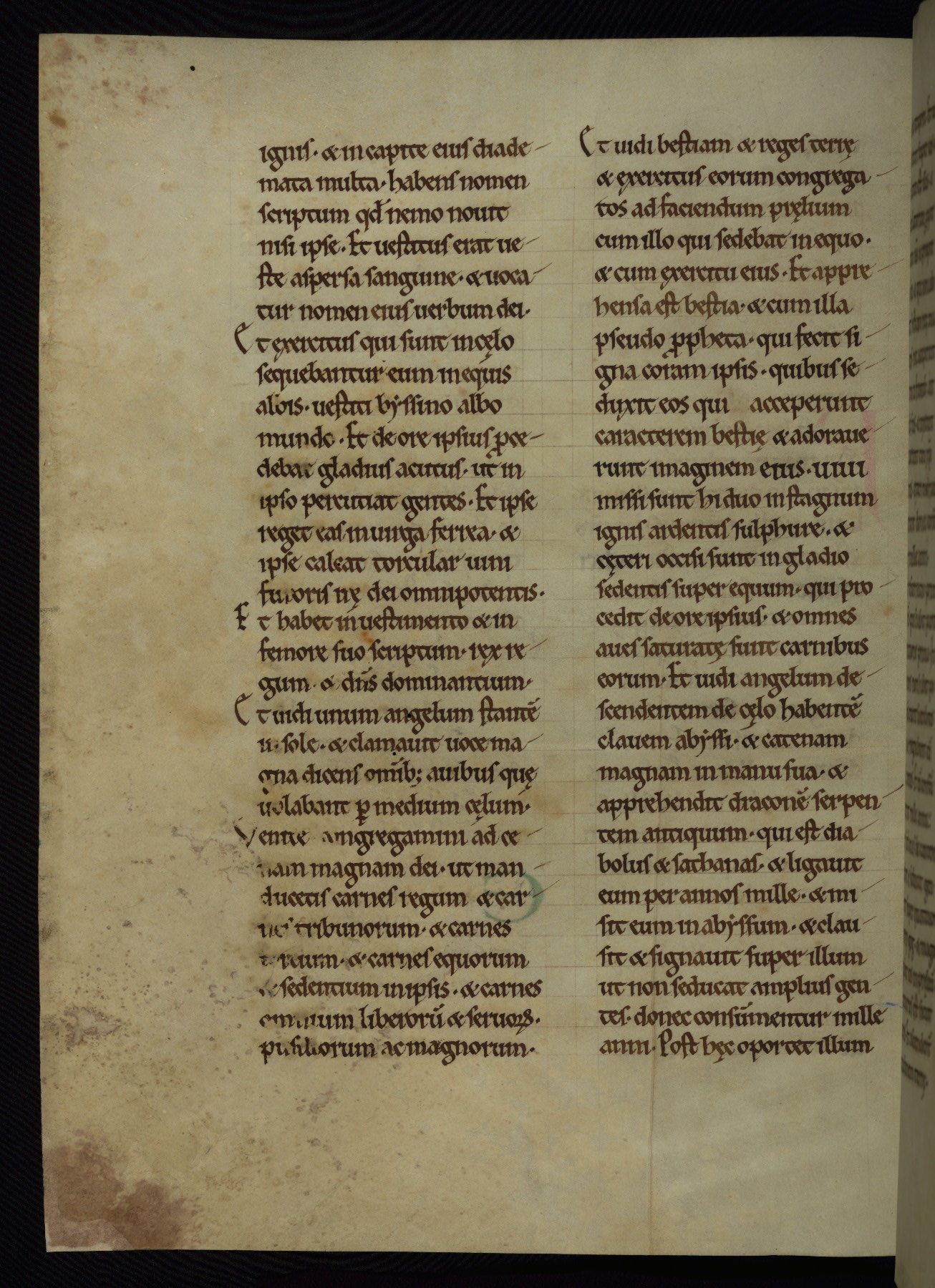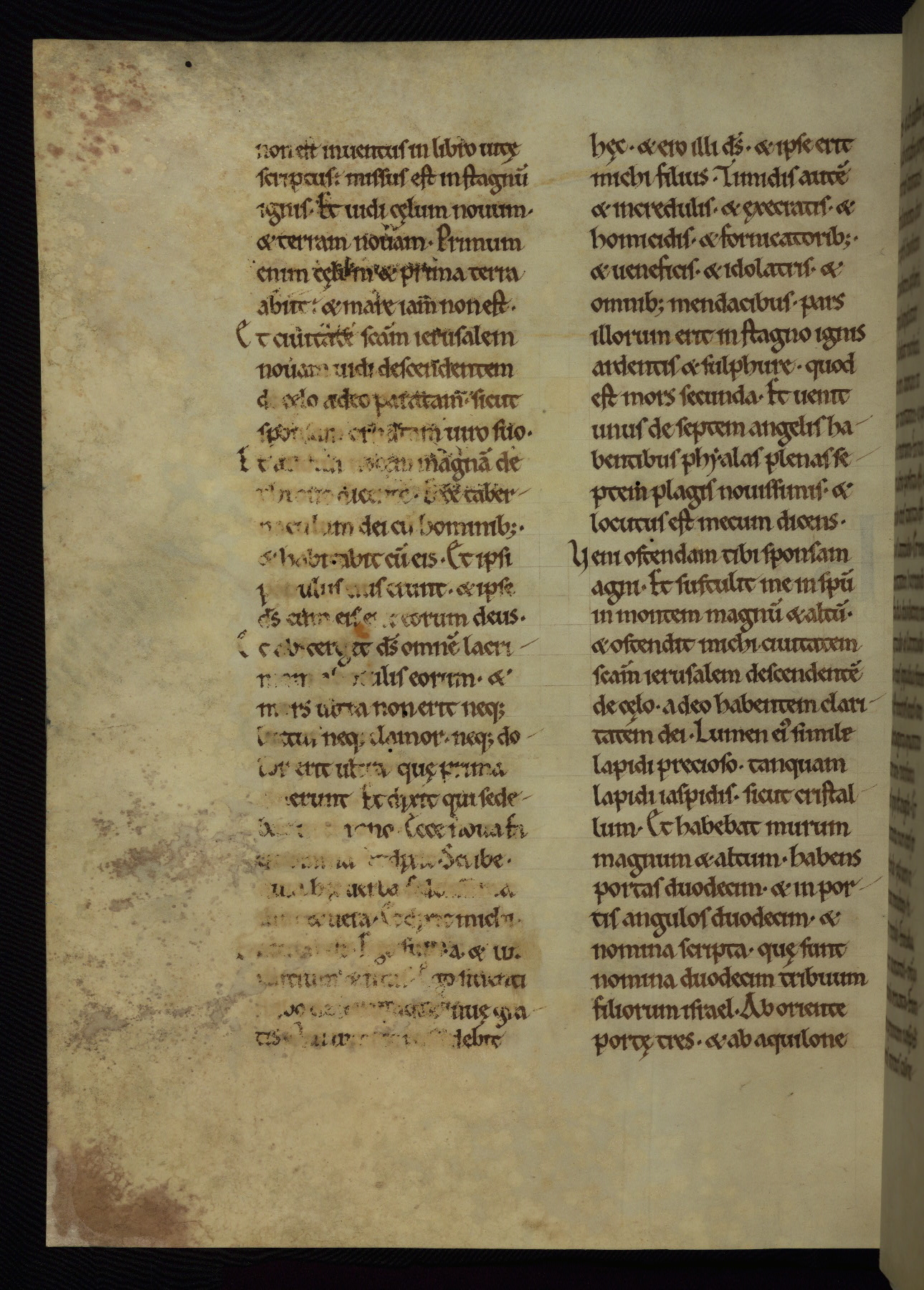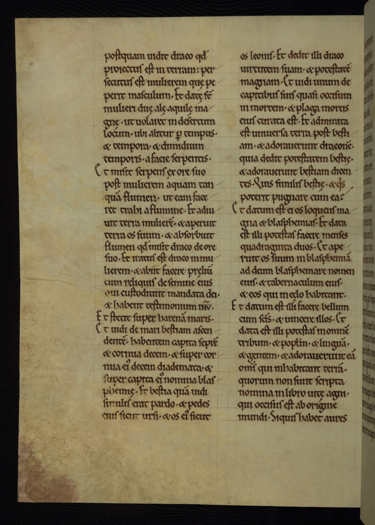 This large-format copy of the New Testament was almost certainly created at Rochester Cathedral Priory, England, in the first half of the twelfth century. It was part of a five-volume Bible, only one other volume of which, London, British Library Ms. Royal I.C.VII, has survived. The decorated initials in these manuscripts compare closely with those in other books securely attributed to Rochester. Textually these books are closely related to the Gundulph Bible (San Marino, Huntington Library Ms. HM 62), known to have been produced at Rochester in the second half of the eleventh century. Although neither the Walters' nor the British Library's volume includes an inscription associating this Bible with Rochester, the two medieval catalogs of the Rochester Cathedral library, produced around 1130 and in 1202, contain references to manuscripts that correspond well with them. The book’s large size indicates it that was designed to be read aloud, either during services or at meals in the refectory. Large, fanciful initials filled with succulent foliage, fruit, dragons, animals, and human faces begin each section of the text. Executed in a vibrant palette of red, blue, green, ochre (in place of gold), and yellow, the intricate, dynamic designs capture the essence of Romanesque manuscript illumination. Royal I.C.VII also includes four historiated initials (for the books of Joshua, I Samuel, 2 Samuel, and 2 Kings). Although the Bible was made at Rochester, the pre-Gothic script of W.18 in particular is extremely close to that practiced at nearby Canterbury at the time.