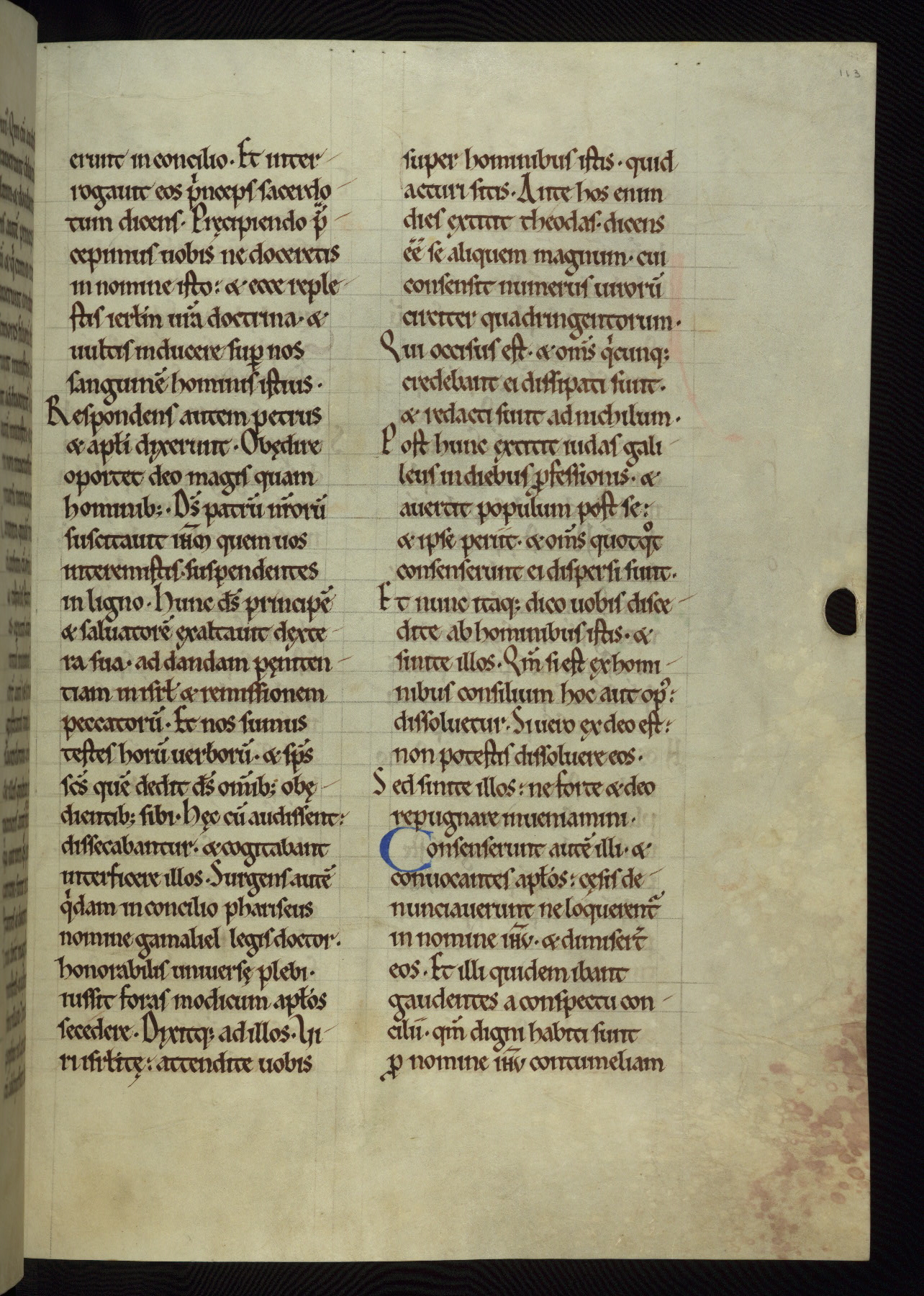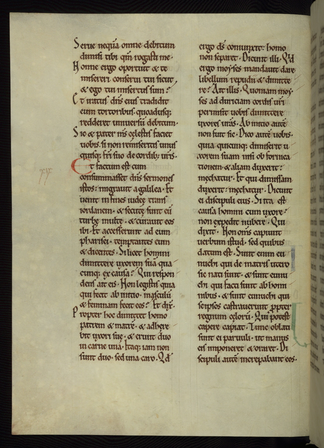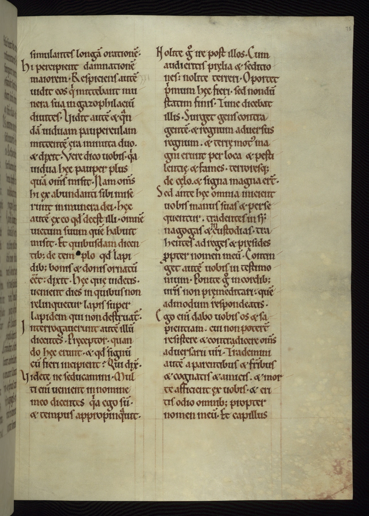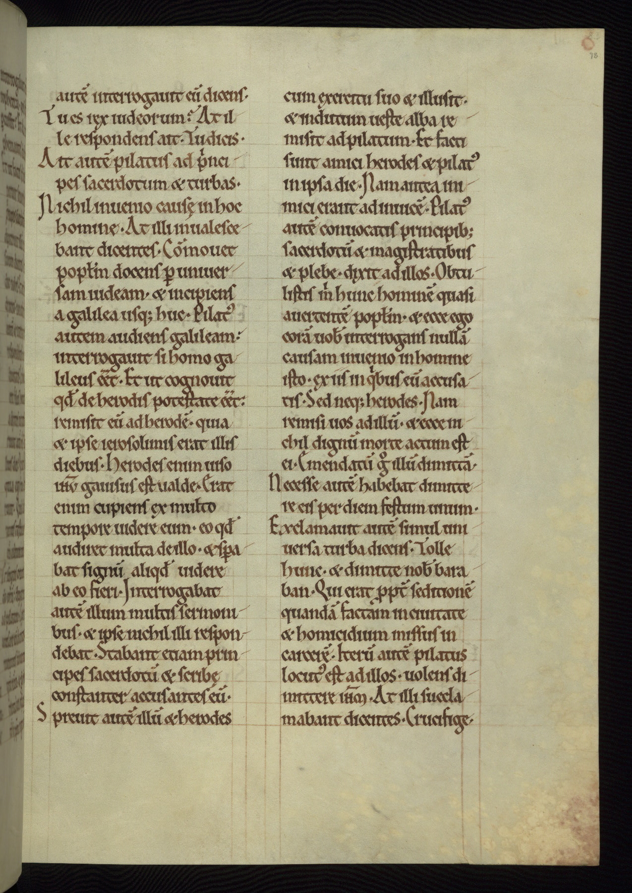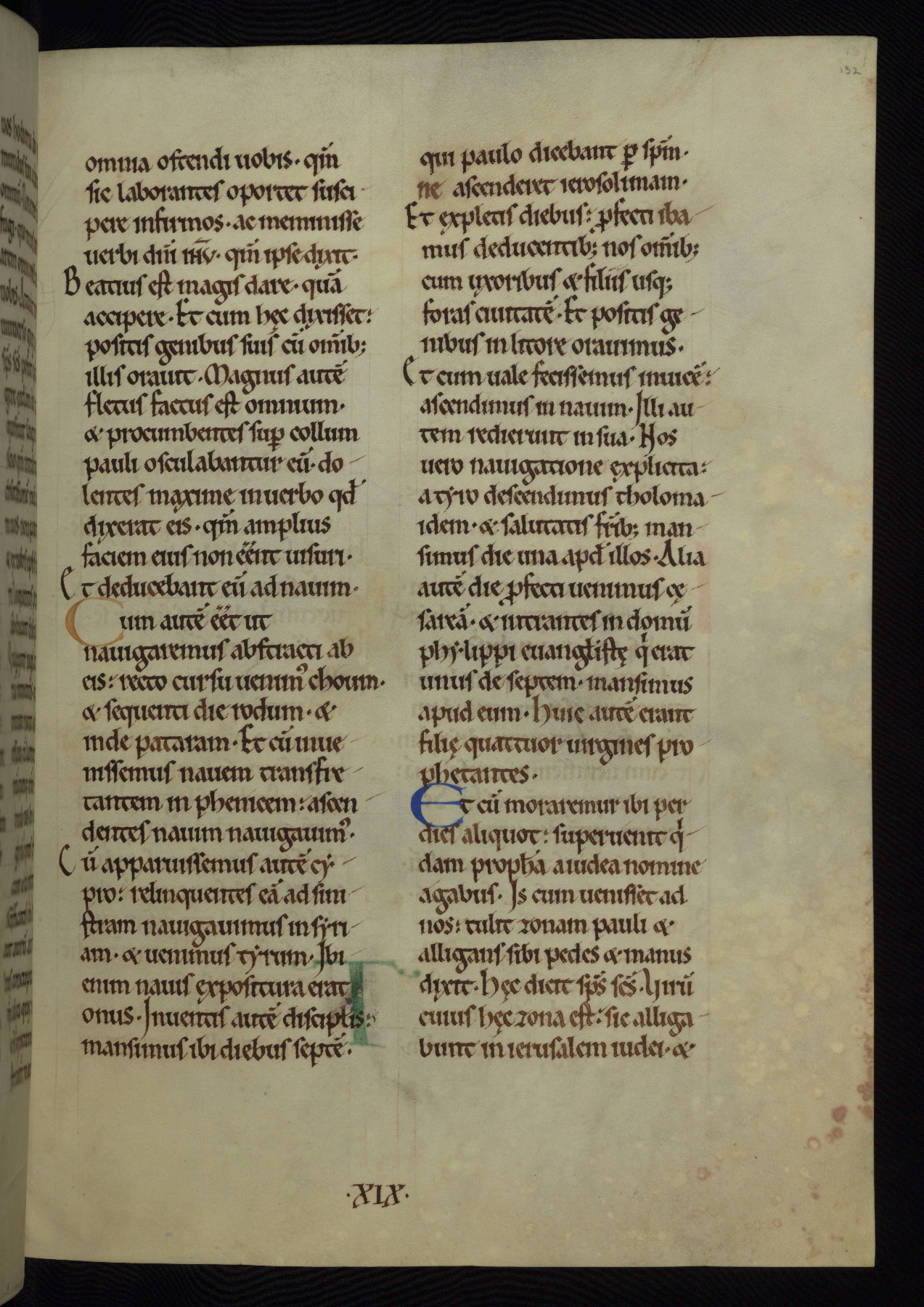 This large-format copy of the New Testament was almost certainly created at Rochester Cathedral Priory, England, in the first half of the twelfth century. It was part of a five-volume Bible, only one other volume of which, London, British Library Ms. Royal I.C.VII, has survived. The decorated initials in these manuscripts compare closely with those in other books securely attributed to Rochester. Textually these books are closely related to the Gundulph Bible (San Marino, Huntington Library Ms. HM 62), known to have been produced at Rochester in the second half of the eleventh century. Although neither the Walters' nor the British Library's volume includes an inscription associating this Bible with Rochester, the two medieval catalogs of the Rochester Cathedral library, produced around 1130 and in 1202, contain references to manuscripts that correspond well with them. The book’s large size indicates it that was designed to be read aloud, either during services or at meals in the refectory. Large, fanciful initials filled with succulent foliage, fruit, dragons, animals, and human faces begin each section of the text. Executed in a vibrant palette of red, blue, green, ochre (in place of gold), and yellow, the intricate, dynamic designs capture the essence of Romanesque manuscript illumination. Royal I.C.VII also includes four historiated initials (for the books of Joshua, I Samuel, 2 Samuel, and 2 Kings). Although the Bible was made at Rochester, the pre-Gothic script of W.18 in particular is extremely close to that practiced at nearby Canterbury at the time.