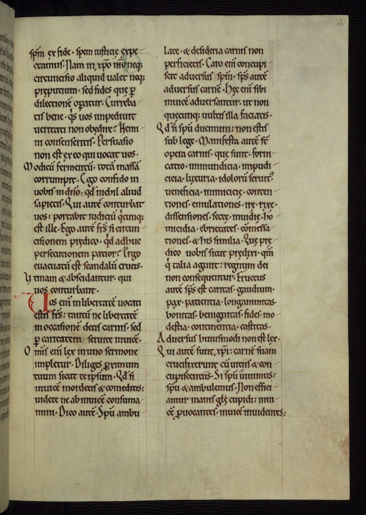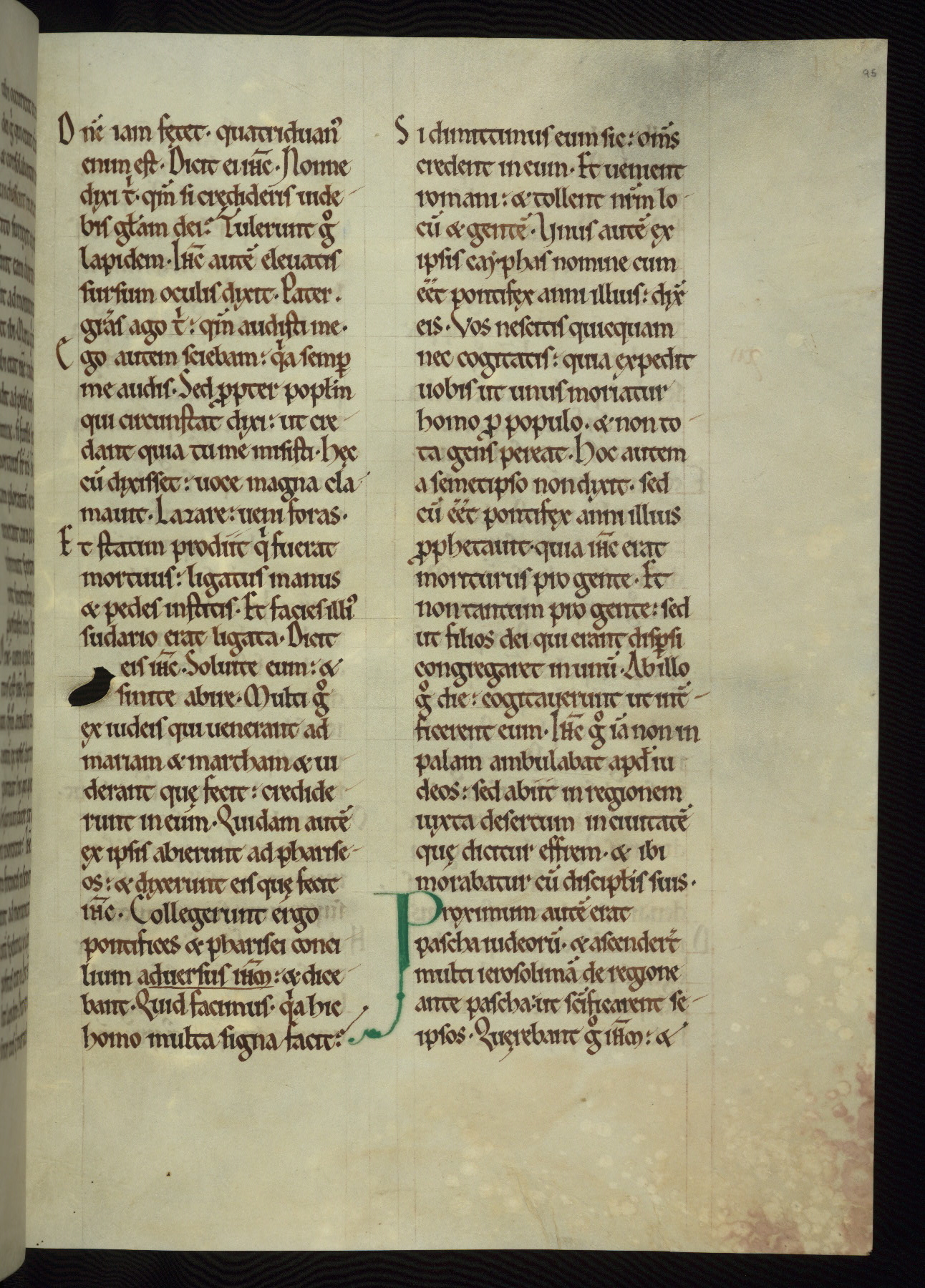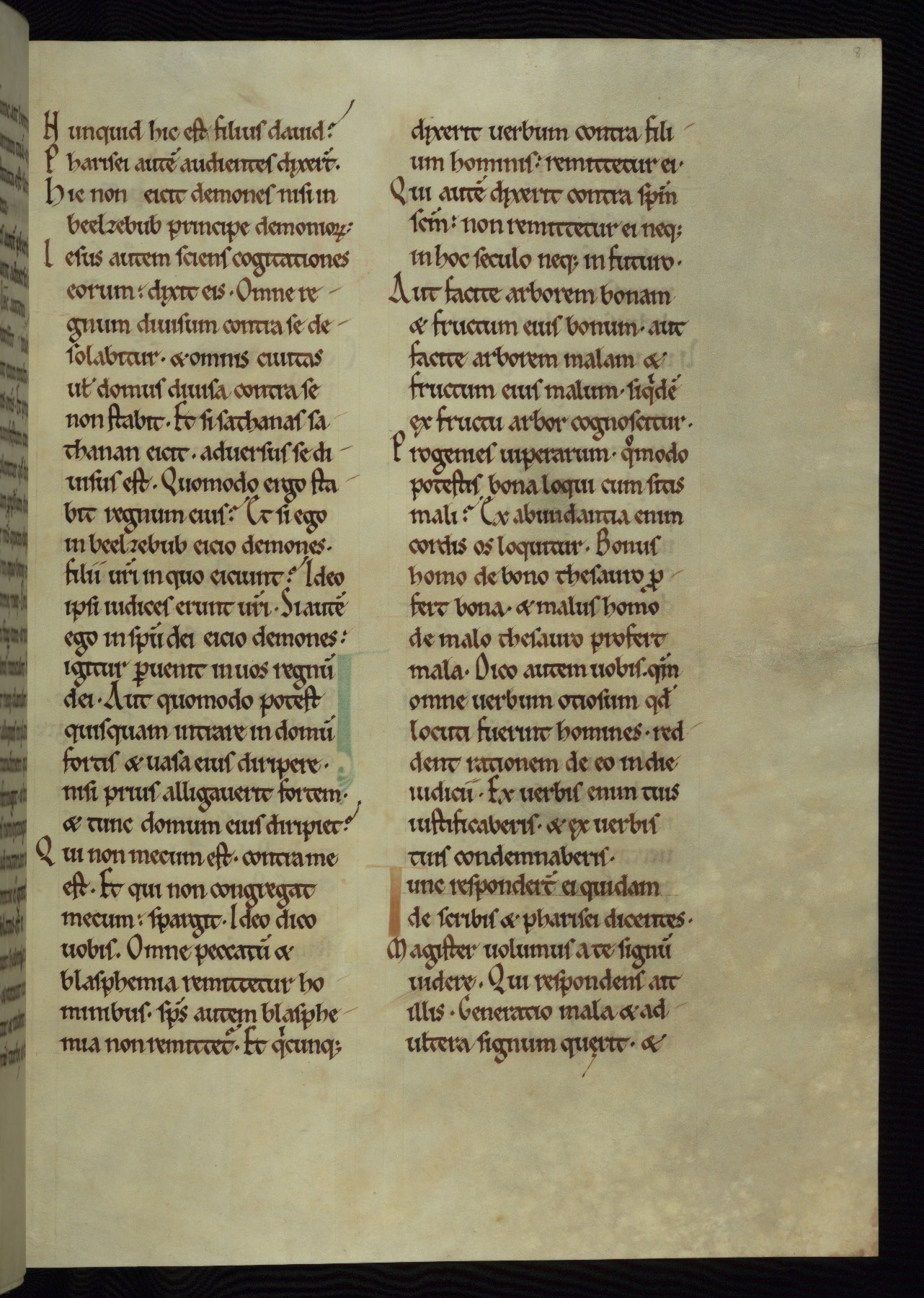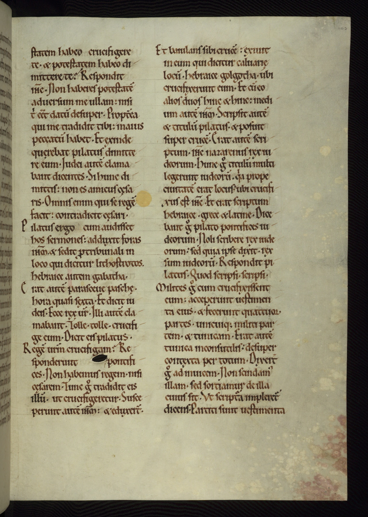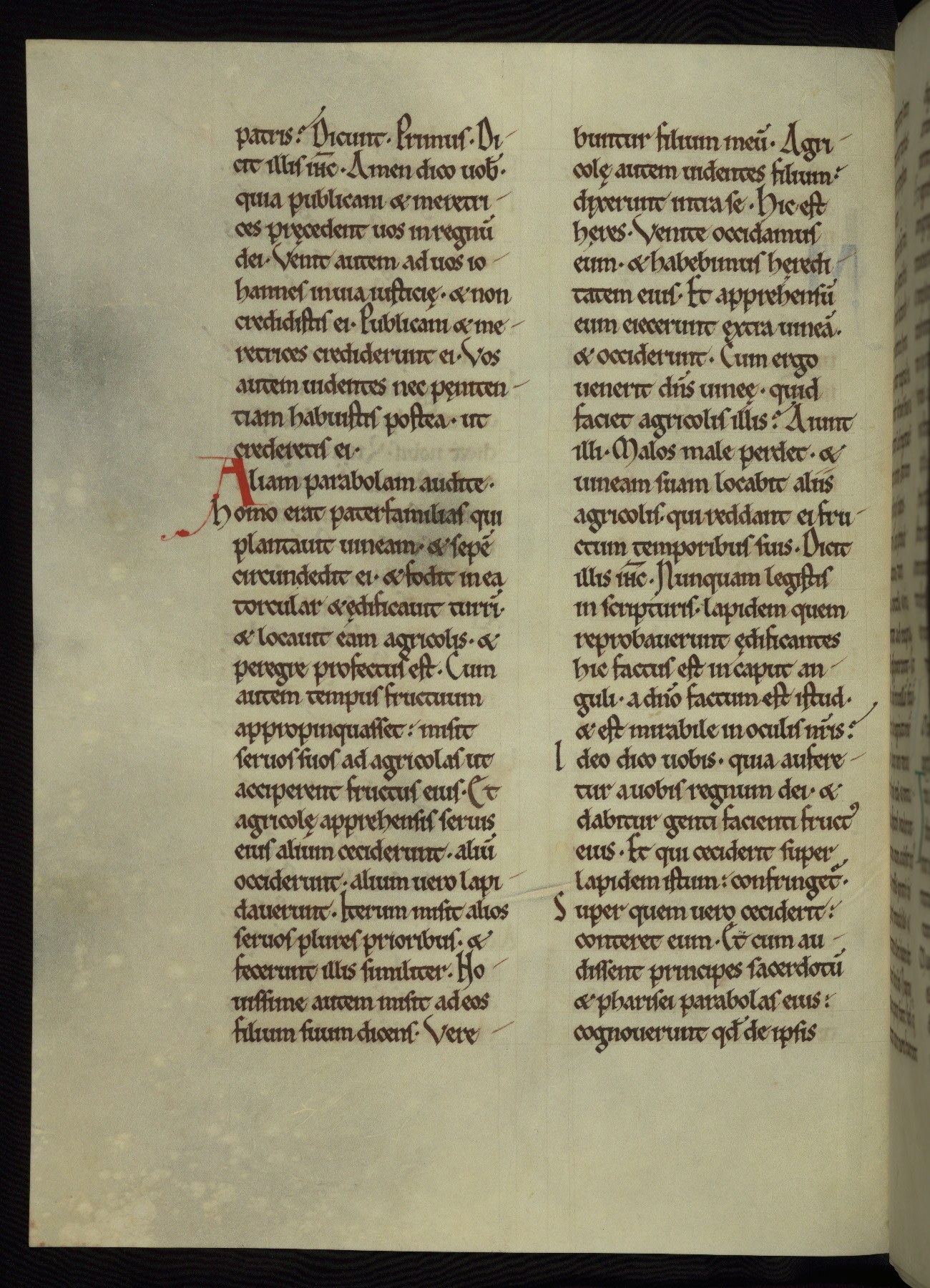 This large-format copy of the New Testament was almost certainly created at Rochester Cathedral Priory, England, in the first half of the twelfth century. It was part of a five-volume Bible, only one other volume of which, London, British Library Ms. Royal I.C.VII, has survived. The decorated initials in these manuscripts compare closely with those in other books securely attributed to Rochester. Textually these books are closely related to the Gundulph Bible (San Marino, Huntington Library Ms. HM 62), known to have been produced at Rochester in the second half of the eleventh century. Although neither the Walters' nor the British Library's volume includes an inscription associating this Bible with Rochester, the two medieval catalogs of the Rochester Cathedral library, produced around 1130 and in 1202, contain references to manuscripts that correspond well with them. The book’s large size indicates it that was designed to be read aloud, either during services or at meals in the refectory. Large, fanciful initials filled with succulent foliage, fruit, dragons, animals, and human faces begin each section of the text. Executed in a vibrant palette of red, blue, green, ochre (in place of gold), and yellow, the intricate, dynamic designs capture the essence of Romanesque manuscript illumination. Royal I.C.VII also includes four historiated initials (for the books of Joshua, I Samuel, 2 Samuel, and 2 Kings). Although the Bible was made at Rochester, the pre-Gothic script of W.18 in particular is extremely close to that practiced at nearby Canterbury at the time.
