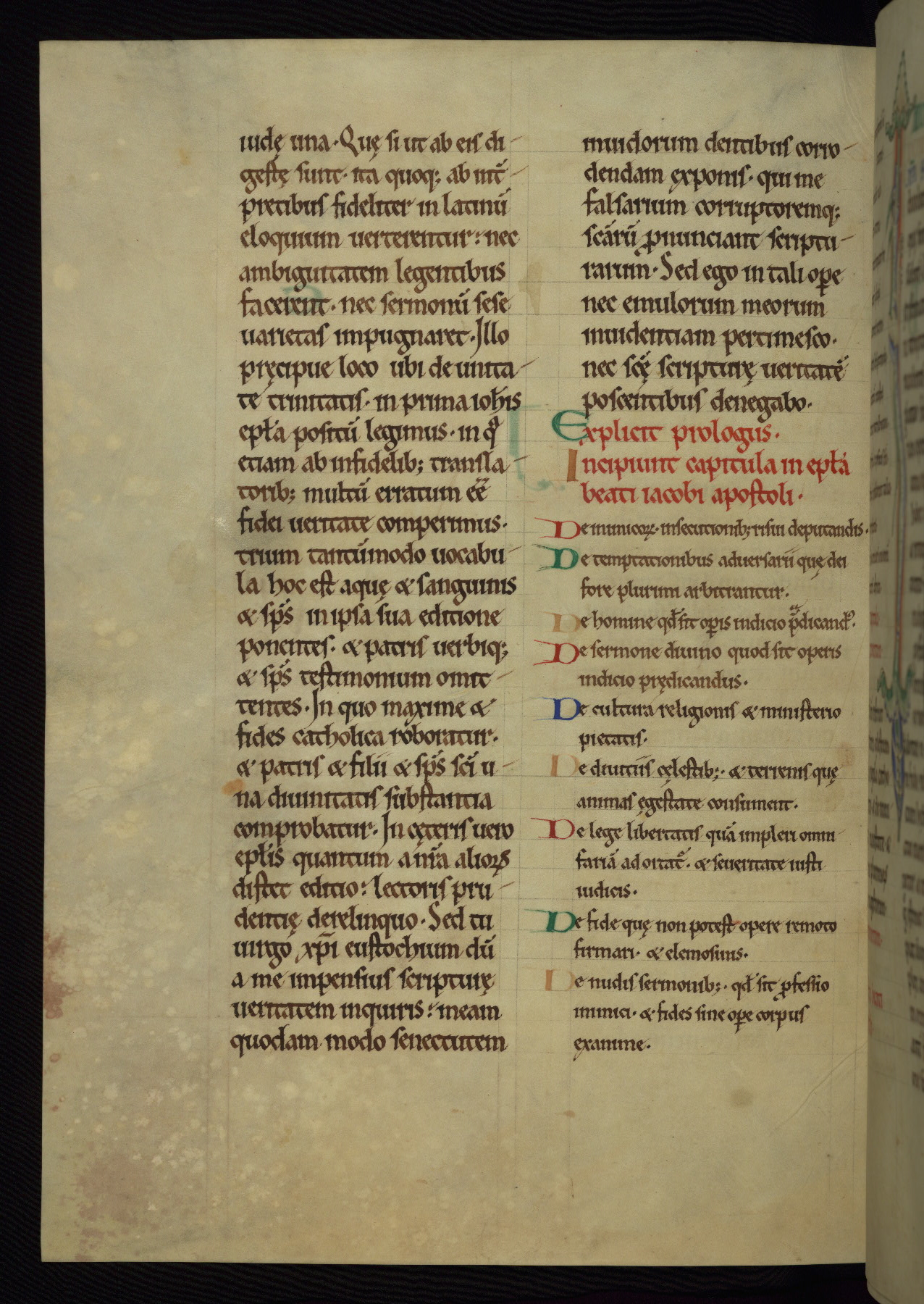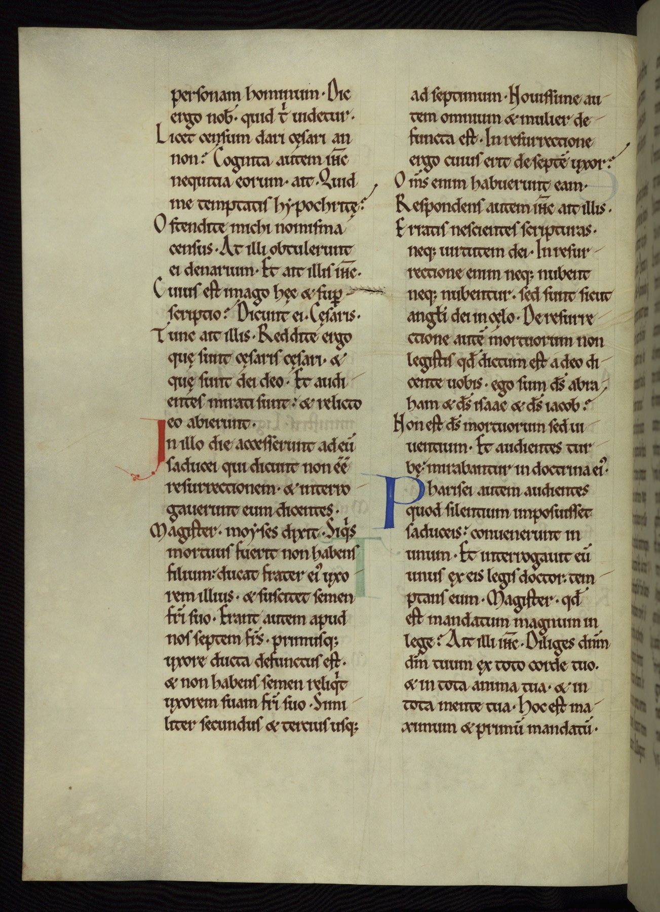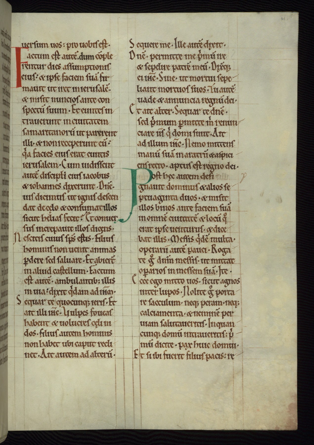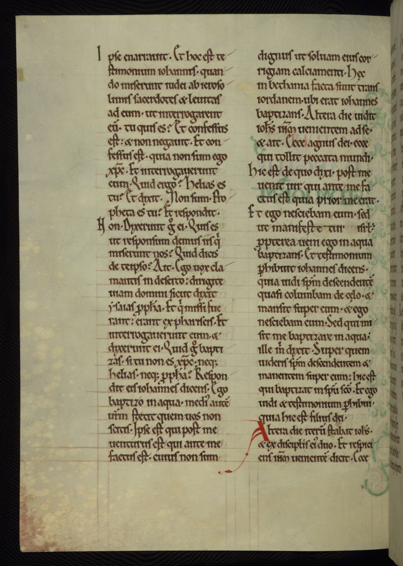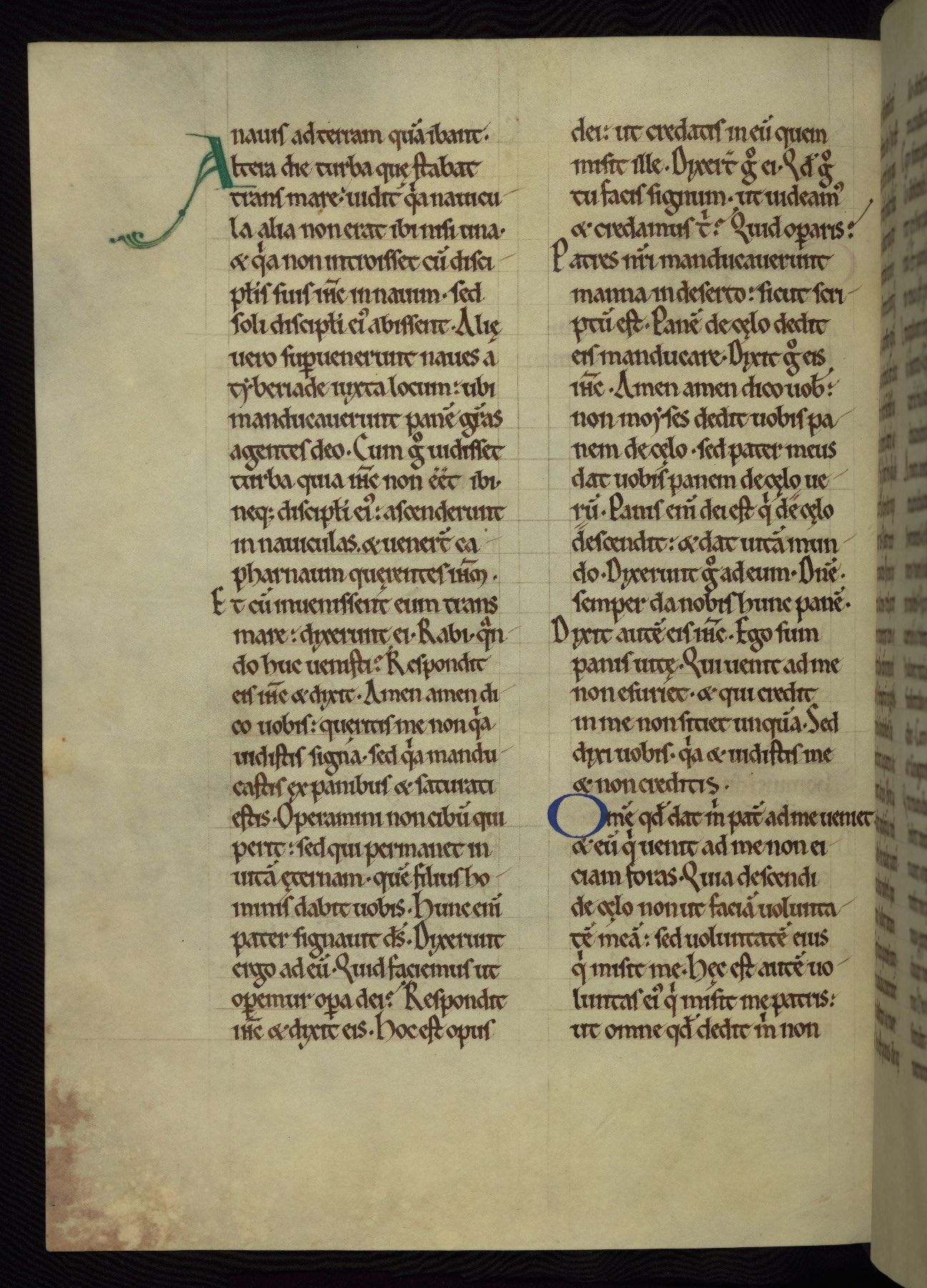 This large-format copy of the New Testament was almost certainly created at Rochester Cathedral Priory, England, in the first half of the twelfth century. It was part of a five-volume Bible, only one other volume of which, London, British Library Ms. Royal I.C.VII, has survived. The decorated initials in these manuscripts compare closely with those in other books securely attributed to Rochester. Textually these books are closely related to the Gundulph Bible (San Marino, Huntington Library Ms. HM 62), known to have been produced at Rochester in the second half of the eleventh century. Although neither the Walters' nor the British Library's volume includes an inscription associating this Bible with Rochester, the two medieval catalogs of the Rochester Cathedral library, produced around 1130 and in 1202, contain references to manuscripts that correspond well with them. The book’s large size indicates it that was designed to be read aloud, either during services or at meals in the refectory. Large, fanciful initials filled with succulent foliage, fruit, dragons, animals, and human faces begin each section of the text. Executed in a vibrant palette of red, blue, green, ochre (in place of gold), and yellow, the intricate, dynamic designs capture the essence of Romanesque manuscript illumination. Royal I.C.VII also includes four historiated initials (for the books of Joshua, I Samuel, 2 Samuel, and 2 Kings). Although the Bible was made at Rochester, the pre-Gothic script of W.18 in particular is extremely close to that practiced at nearby Canterbury at the time.