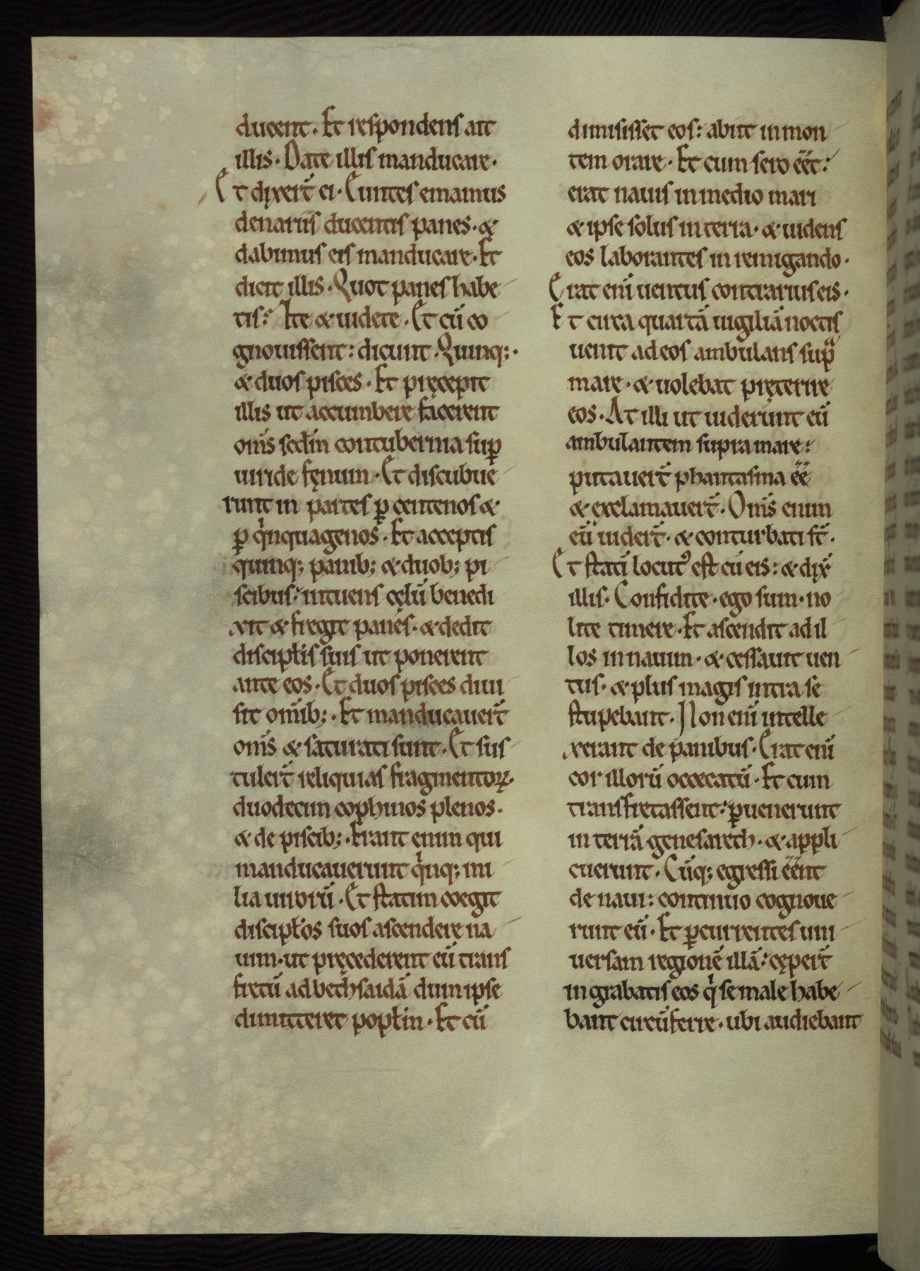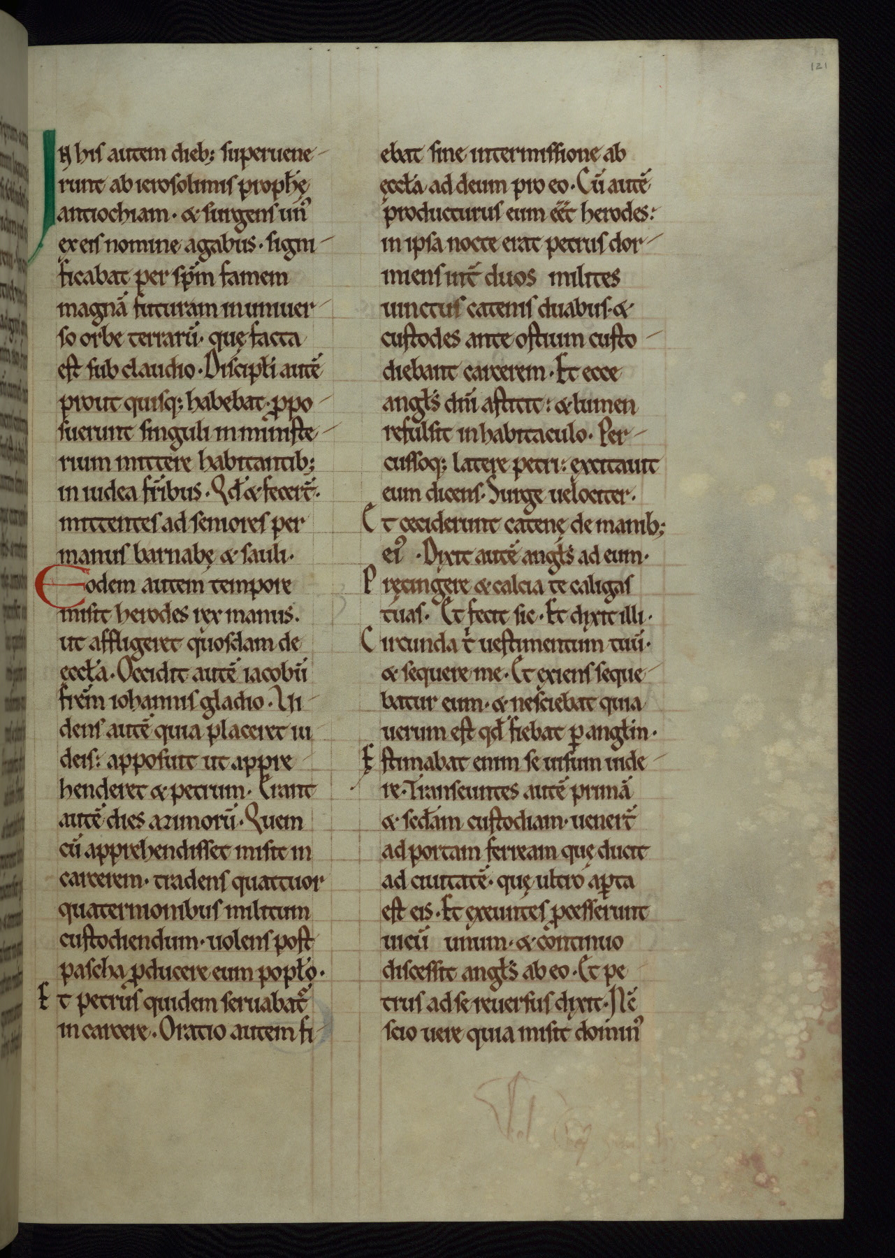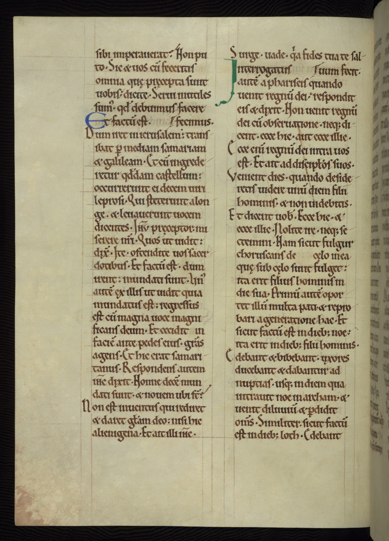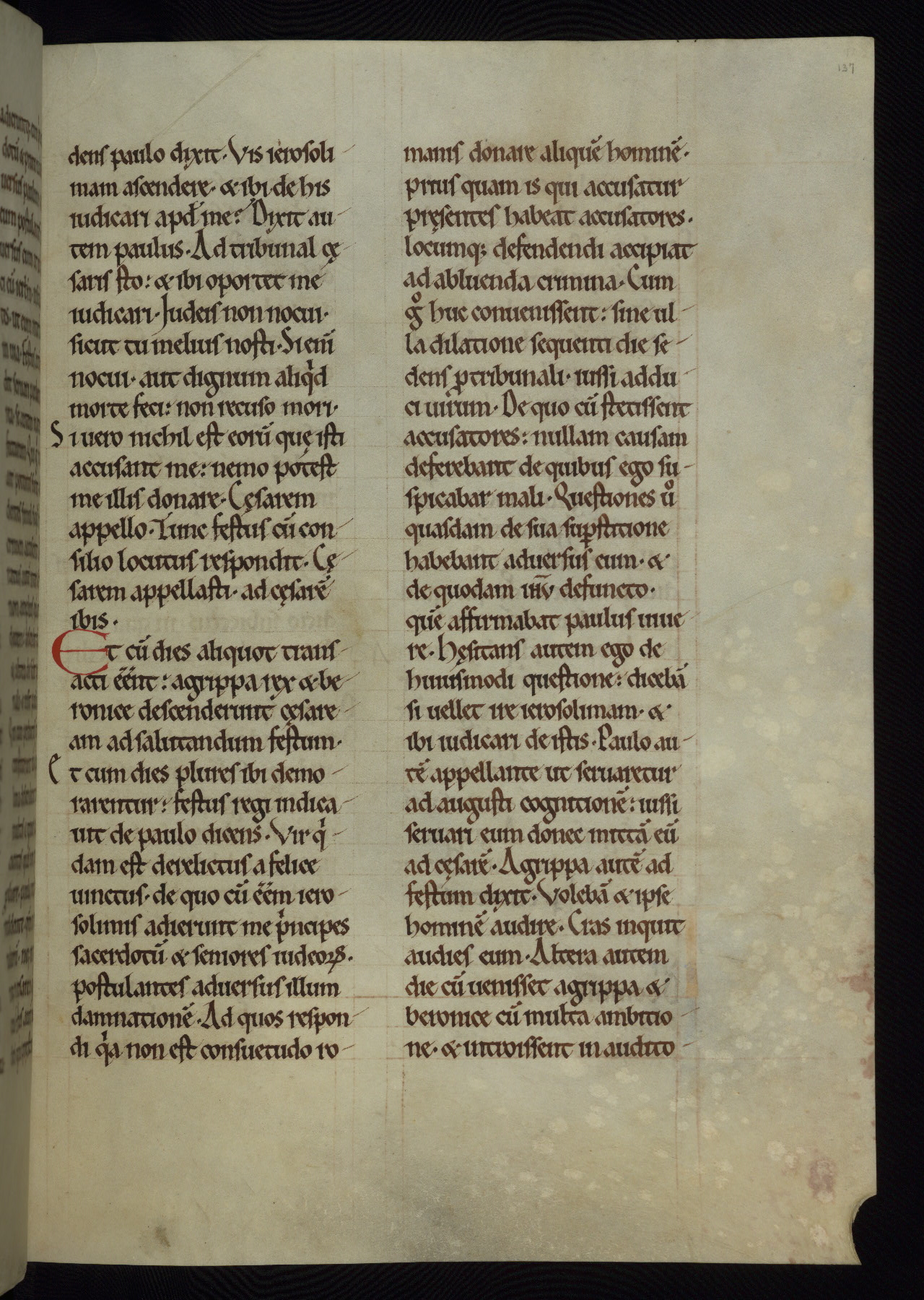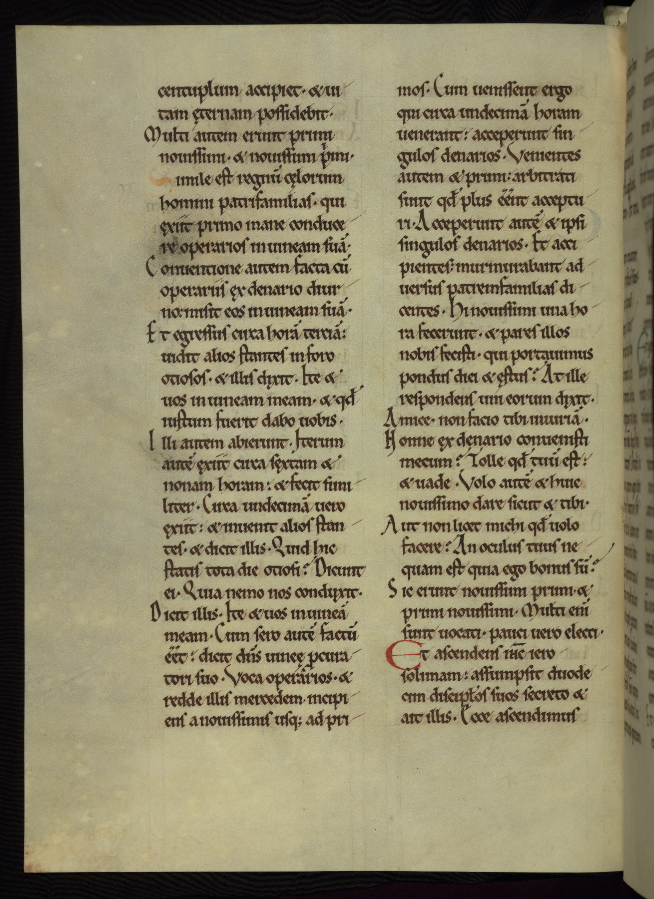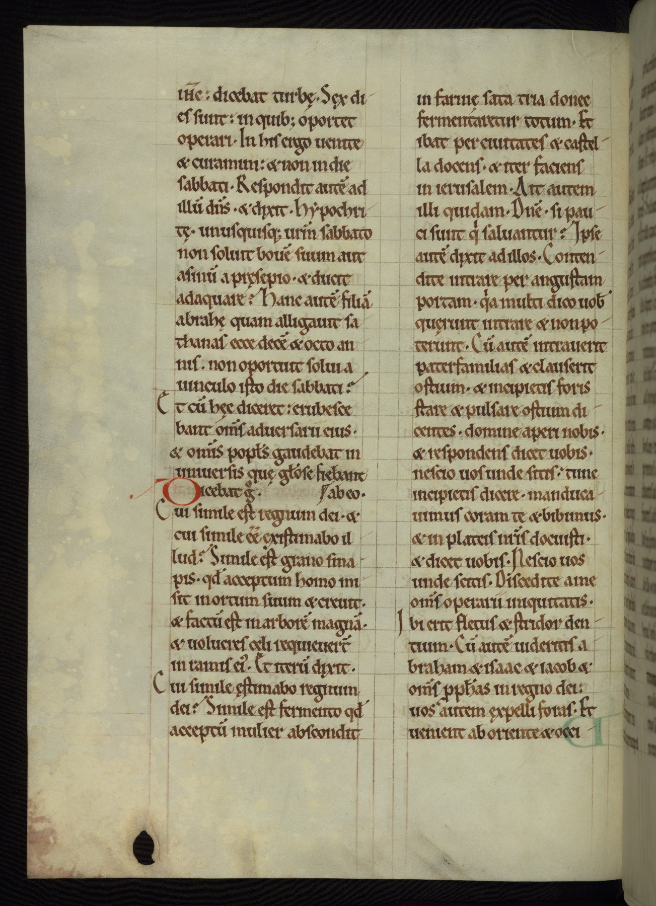 This large-format copy of the New Testament was almost certainly created at Rochester Cathedral Priory, England, in the first half of the twelfth century. It was part of a five-volume Bible, only one other volume of which, London, British Library Ms. Royal I.C.VII, has survived. The decorated initials in these manuscripts compare closely with those in other books securely attributed to Rochester. Textually these books are closely related to the Gundulph Bible (San Marino, Huntington Library Ms. HM 62), known to have been produced at Rochester in the second half of the eleventh century. Although neither the Walters' nor the British Library's volume includes an inscription associating this Bible with Rochester, the two medieval catalogs of the Rochester Cathedral library, produced around 1130 and in 1202, contain references to manuscripts that correspond well with them. The book’s large size indicates it that was designed to be read aloud, either during services or at meals in the refectory. Large, fanciful initials filled with succulent foliage, fruit, dragons, animals, and human faces begin each section of the text. Executed in a vibrant palette of red, blue, green, ochre (in place of gold), and yellow, the intricate, dynamic designs capture the essence of Romanesque manuscript illumination. Royal I.C.VII also includes four historiated initials (for the books of Joshua, I Samuel, 2 Samuel, and 2 Kings). Although the Bible was made at Rochester, the pre-Gothic script of W.18 in particular is extremely close to that practiced at nearby Canterbury at the time.