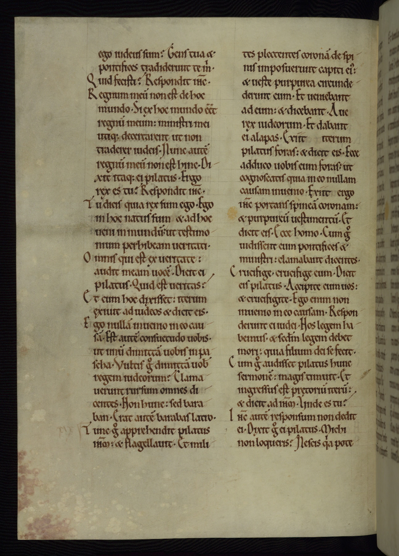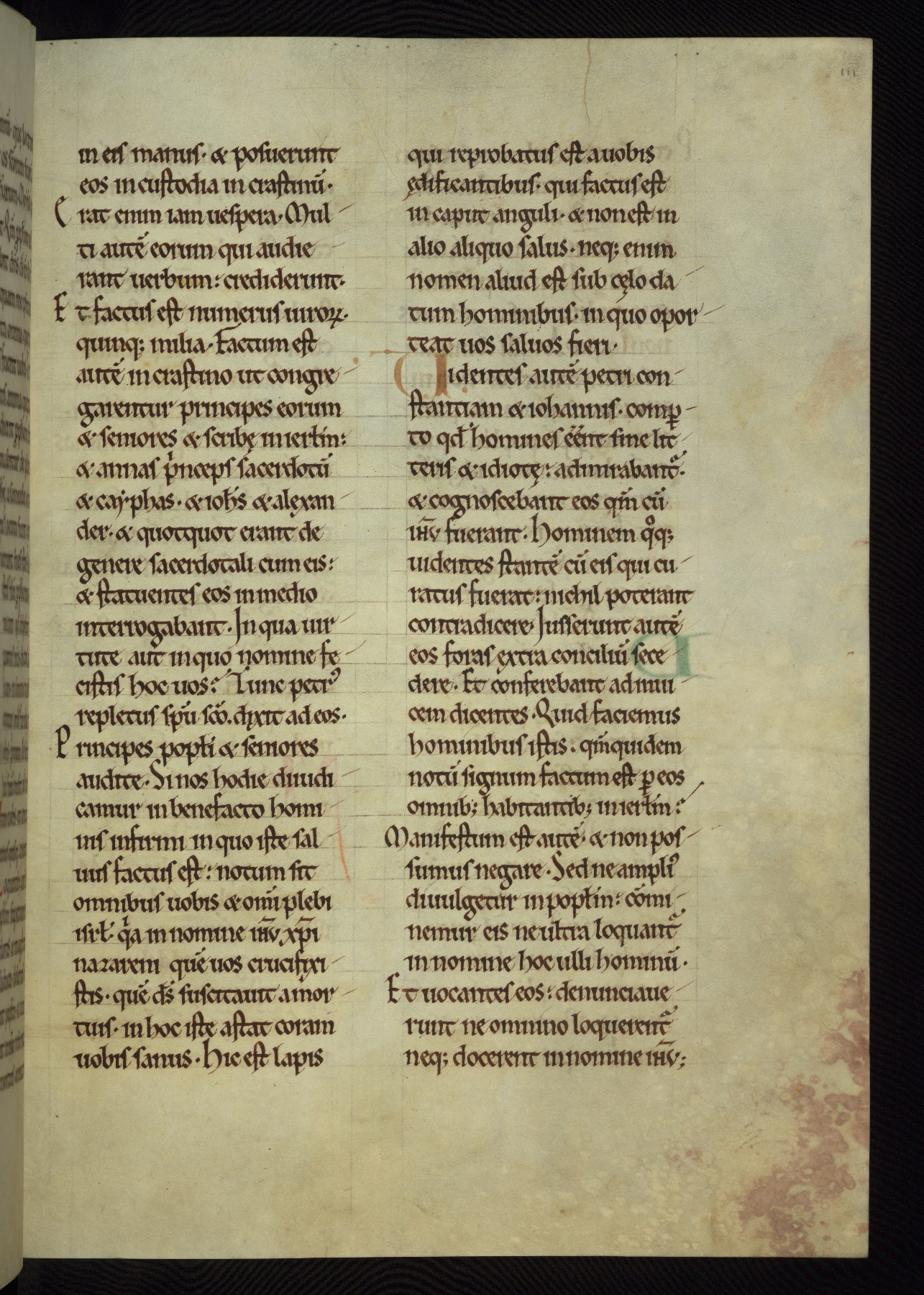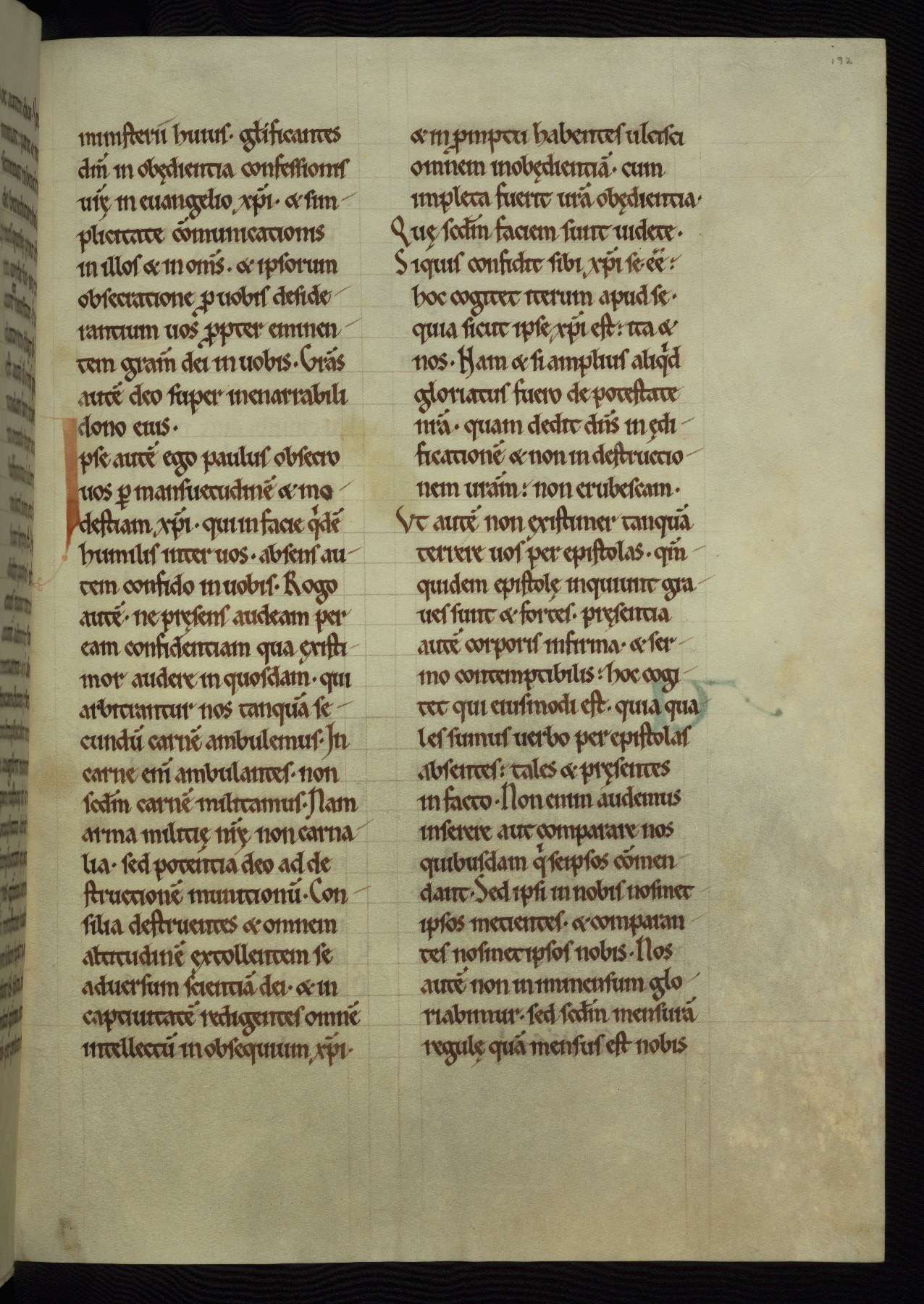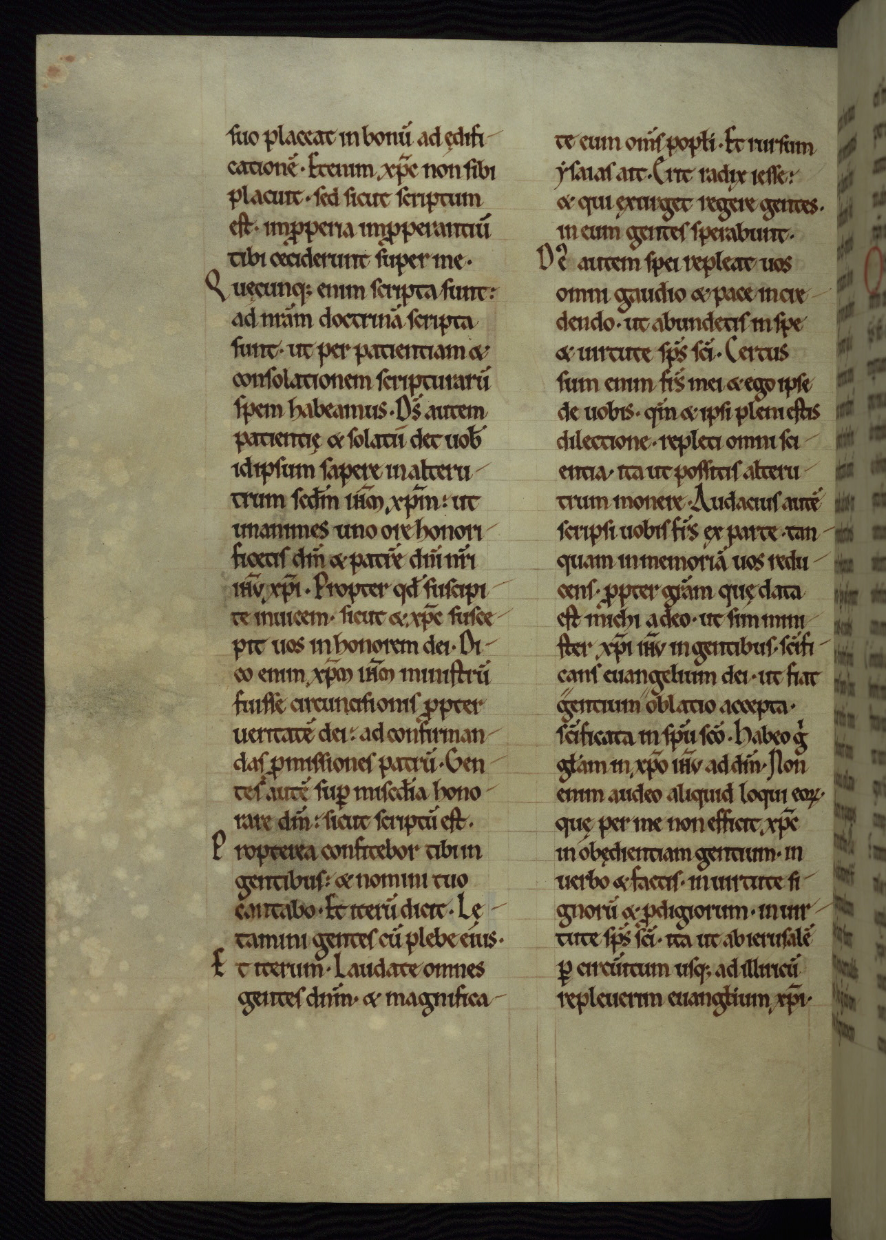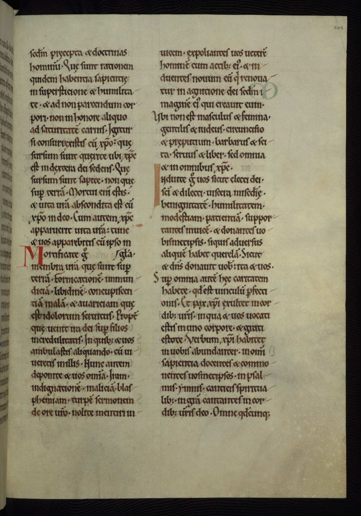This large-format copy of the New Testament was almost certainly created at Rochester Cathedral Priory, England, in the first half of the twelfth century. It was part of a five-volume Bible, only one other volume of which, London, British Library Ms. Royal I.C.VII, has survived. The decorated initials in these manuscripts compare closely with those in other books securely attributed to Rochester. Textually these books are closely related to the Gundulph Bible (San Marino, Huntington Library Ms. HM 62), known to have been produced at Rochester in the second half of the eleventh century. Although neither the Walters' nor the British Library's volume includes an inscription associating this Bible with Rochester, the two medieval catalogs of the Rochester Cathedral library, produced around 1130 and in 1202, contain references to manuscripts that correspond well with them. The book’s large size indicates it that was designed to be read aloud, either during services or at meals in the refectory. Large, fanciful initials filled with succulent foliage, fruit, dragons, animals, and human faces begin each section of the text. Executed in a vibrant palette of red, blue, green, ochre (in place of gold), and yellow, the intricate, dynamic designs capture the essence of Romanesque manuscript illumination. Royal I.C.VII also includes four historiated initials (for the books of Joshua, I Samuel, 2 Samuel, and 2 Kings). Although the Bible was made at Rochester, the pre-Gothic script of W.18 in particular is extremely close to that practiced at nearby Canterbury at the time.
