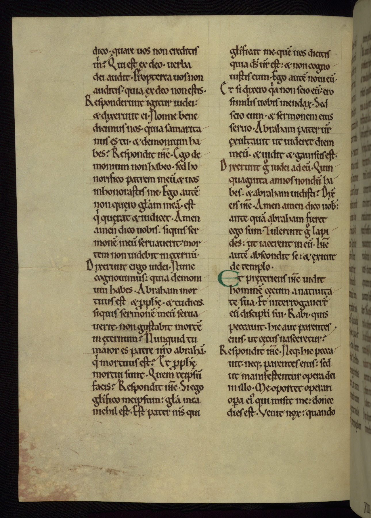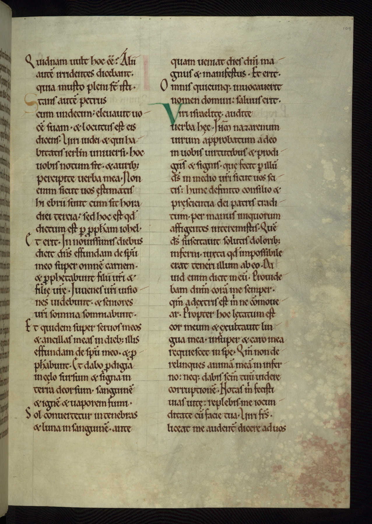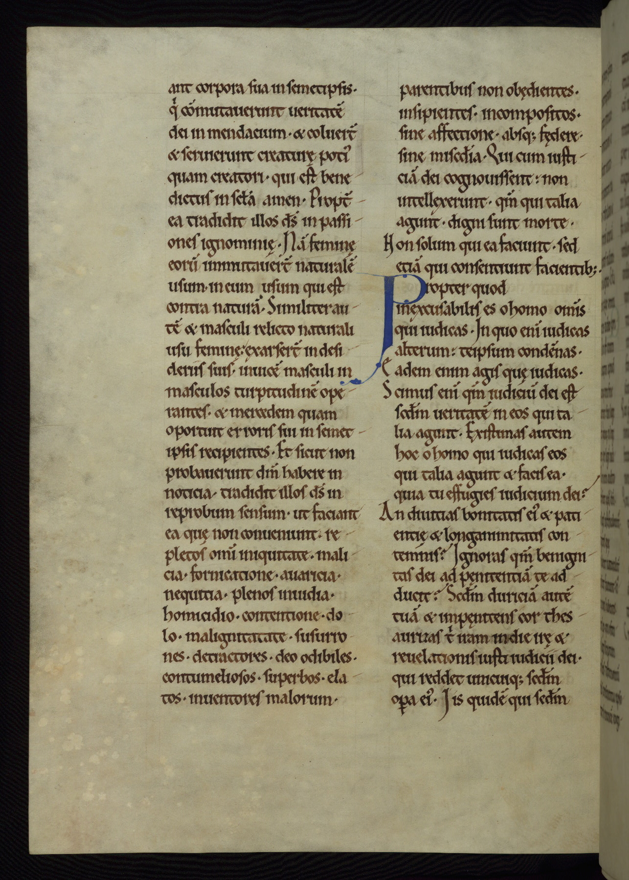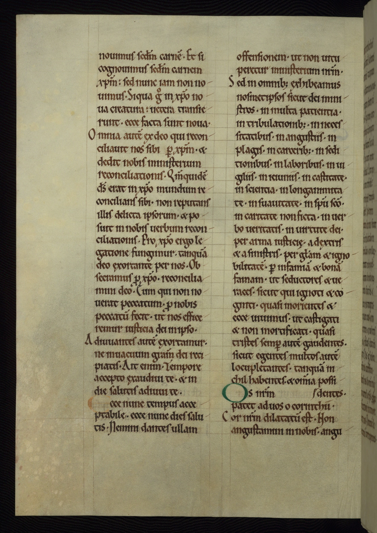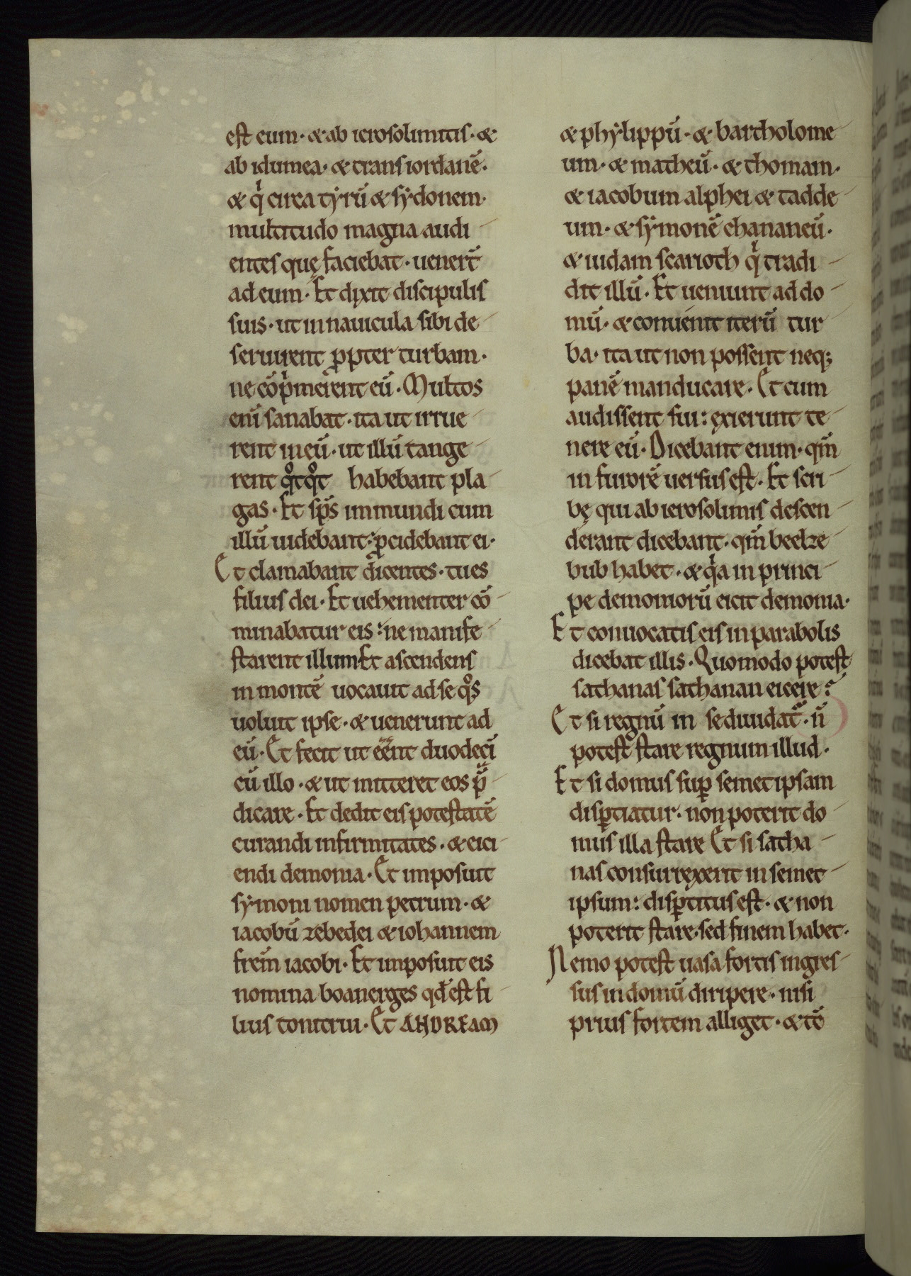 This large-format copy of the New Testament was almost certainly created at Rochester Cathedral Priory, England, in the first half of the twelfth century. It was part of a five-volume Bible, only one other volume of which, London, British Library Ms. Royal I.C.VII, has survived. The decorated initials in these manuscripts compare closely with those in other books securely attributed to Rochester. Textually these books are closely related to the Gundulph Bible (San Marino, Huntington Library Ms. HM 62), known to have been produced at Rochester in the second half of the eleventh century. Although neither the Walters' nor the British Library's volume includes an inscription associating this Bible with Rochester, the two medieval catalogs of the Rochester Cathedral library, produced around 1130 and in 1202, contain references to manuscripts that correspond well with them. The book’s large size indicates it that was designed to be read aloud, either during services or at meals in the refectory. Large, fanciful initials filled with succulent foliage, fruit, dragons, animals, and human faces begin each section of the text. Executed in a vibrant palette of red, blue, green, ochre (in place of gold), and yellow, the intricate, dynamic designs capture the essence of Romanesque manuscript illumination. Royal I.C.VII also includes four historiated initials (for the books of Joshua, I Samuel, 2 Samuel, and 2 Kings). Although the Bible was made at Rochester, the pre-Gothic script of W.18 in particular is extremely close to that practiced at nearby Canterbury at the time.