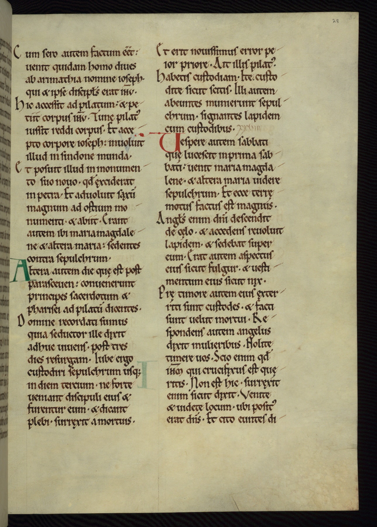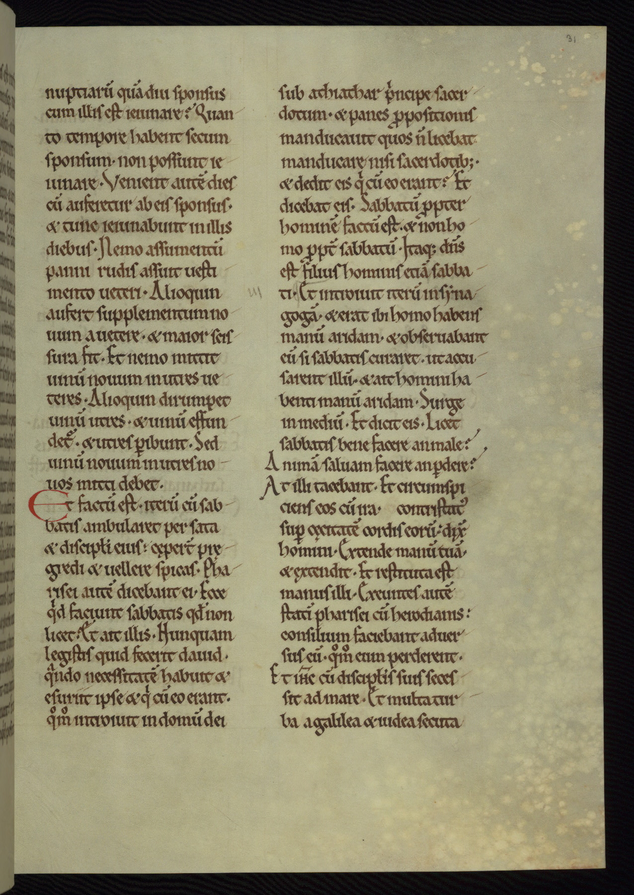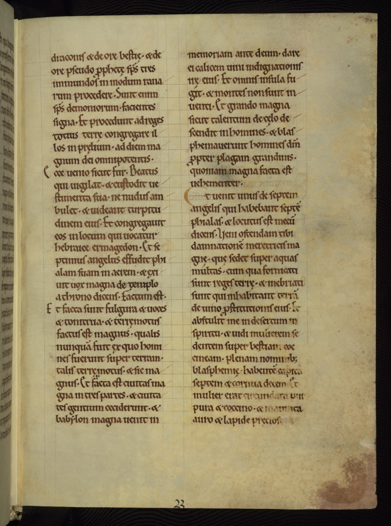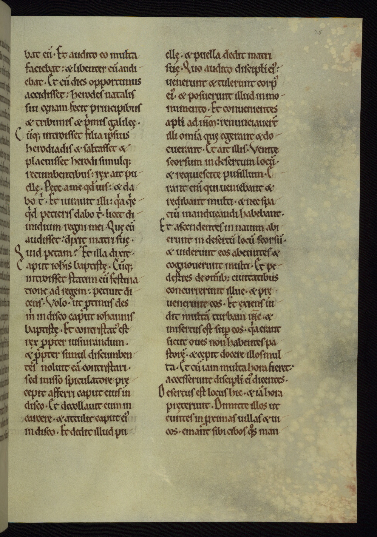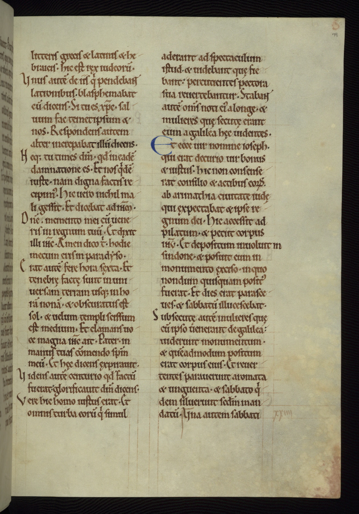 This large-format copy of the New Testament was almost certainly created at Rochester Cathedral Priory, England, in the first half of the twelfth century. It was part of a five-volume Bible, only one other volume of which, London, British Library Ms. Royal I.C.VII, has survived. The decorated initials in these manuscripts compare closely with those in other books securely attributed to Rochester. Textually these books are closely related to the Gundulph Bible (San Marino, Huntington Library Ms. HM 62), known to have been produced at Rochester in the second half of the eleventh century. Although neither the Walters' nor the British Library's volume includes an inscription associating this Bible with Rochester, the two medieval catalogs of the Rochester Cathedral library, produced around 1130 and in 1202, contain references to manuscripts that correspond well with them. The book’s large size indicates it that was designed to be read aloud, either during services or at meals in the refectory. Large, fanciful initials filled with succulent foliage, fruit, dragons, animals, and human faces begin each section of the text. Executed in a vibrant palette of red, blue, green, ochre (in place of gold), and yellow, the intricate, dynamic designs capture the essence of Romanesque manuscript illumination. Royal I.C.VII also includes four historiated initials (for the books of Joshua, I Samuel, 2 Samuel, and 2 Kings). Although the Bible was made at Rochester, the pre-Gothic script of W.18 in particular is extremely close to that practiced at nearby Canterbury at the time.