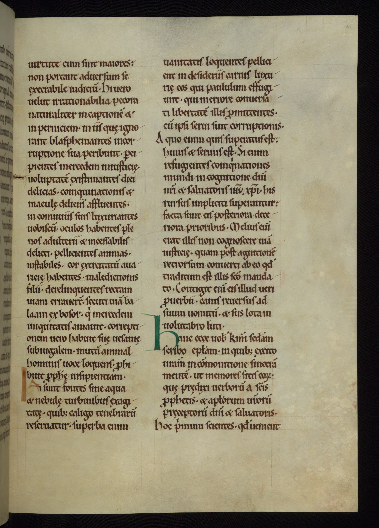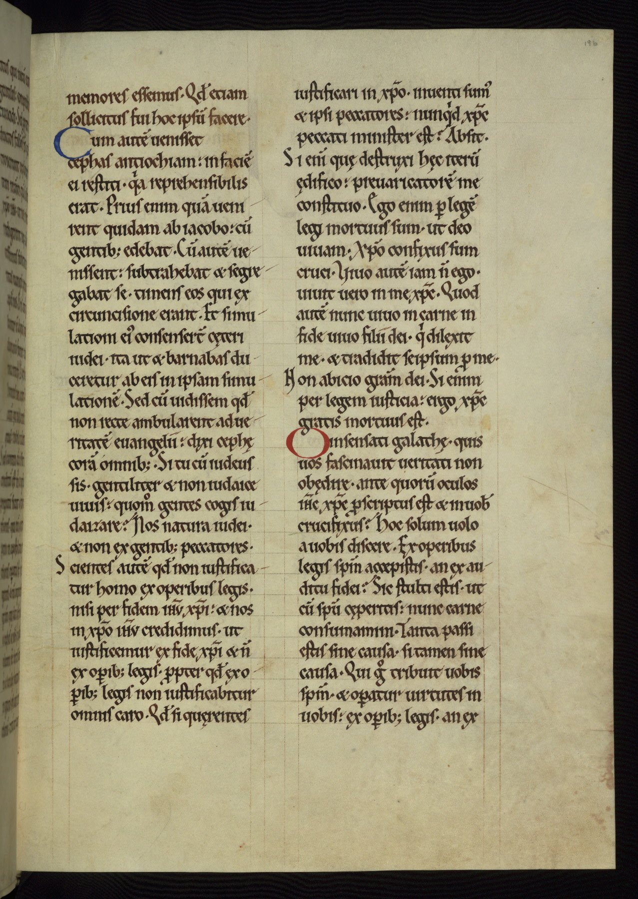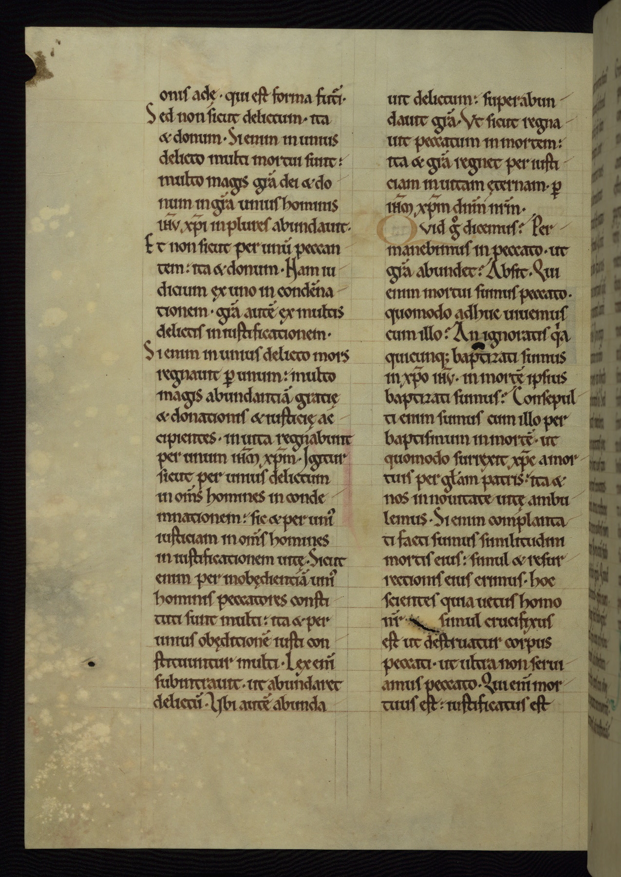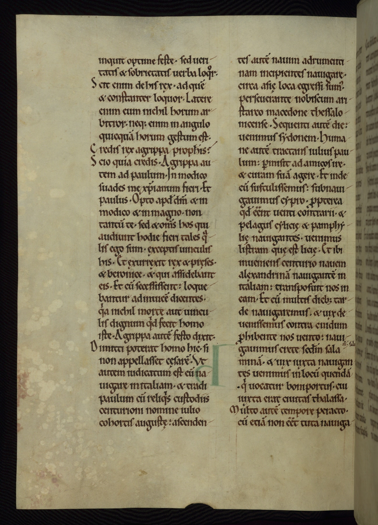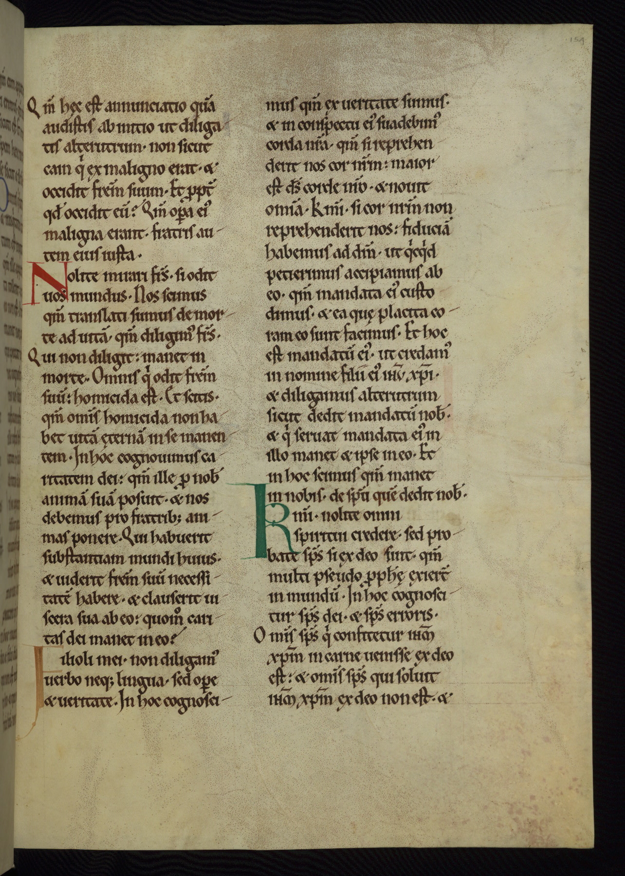 This large-format copy of the New Testament was almost certainly created at Rochester Cathedral Priory, England, in the first half of the twelfth century. It was part of a five-volume Bible, only one other volume of which, London, British Library Ms. Royal I.C.VII, has survived. The decorated initials in these manuscripts compare closely with those in other books securely attributed to Rochester. Textually these books are closely related to the Gundulph Bible (San Marino, Huntington Library Ms. HM 62), known to have been produced at Rochester in the second half of the eleventh century. Although neither the Walters' nor the British Library's volume includes an inscription associating this Bible with Rochester, the two medieval catalogs of the Rochester Cathedral library, produced around 1130 and in 1202, contain references to manuscripts that correspond well with them. The book’s large size indicates it that was designed to be read aloud, either during services or at meals in the refectory. Large, fanciful initials filled with succulent foliage, fruit, dragons, animals, and human faces begin each section of the text. Executed in a vibrant palette of red, blue, green, ochre (in place of gold), and yellow, the intricate, dynamic designs capture the essence of Romanesque manuscript illumination. Royal I.C.VII also includes four historiated initials (for the books of Joshua, I Samuel, 2 Samuel, and 2 Kings). Although the Bible was made at Rochester, the pre-Gothic script of W.18 in particular is extremely close to that practiced at nearby Canterbury at the time.