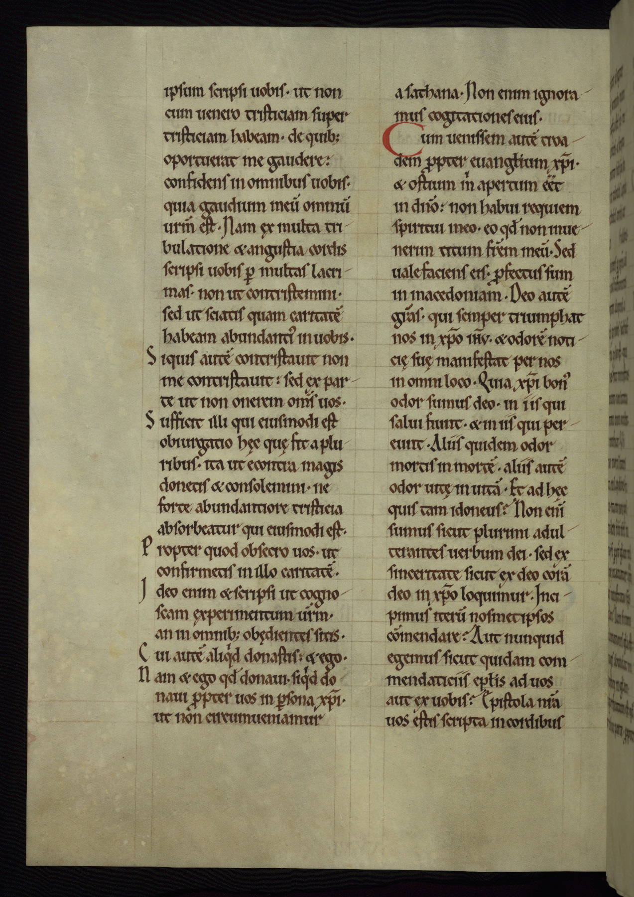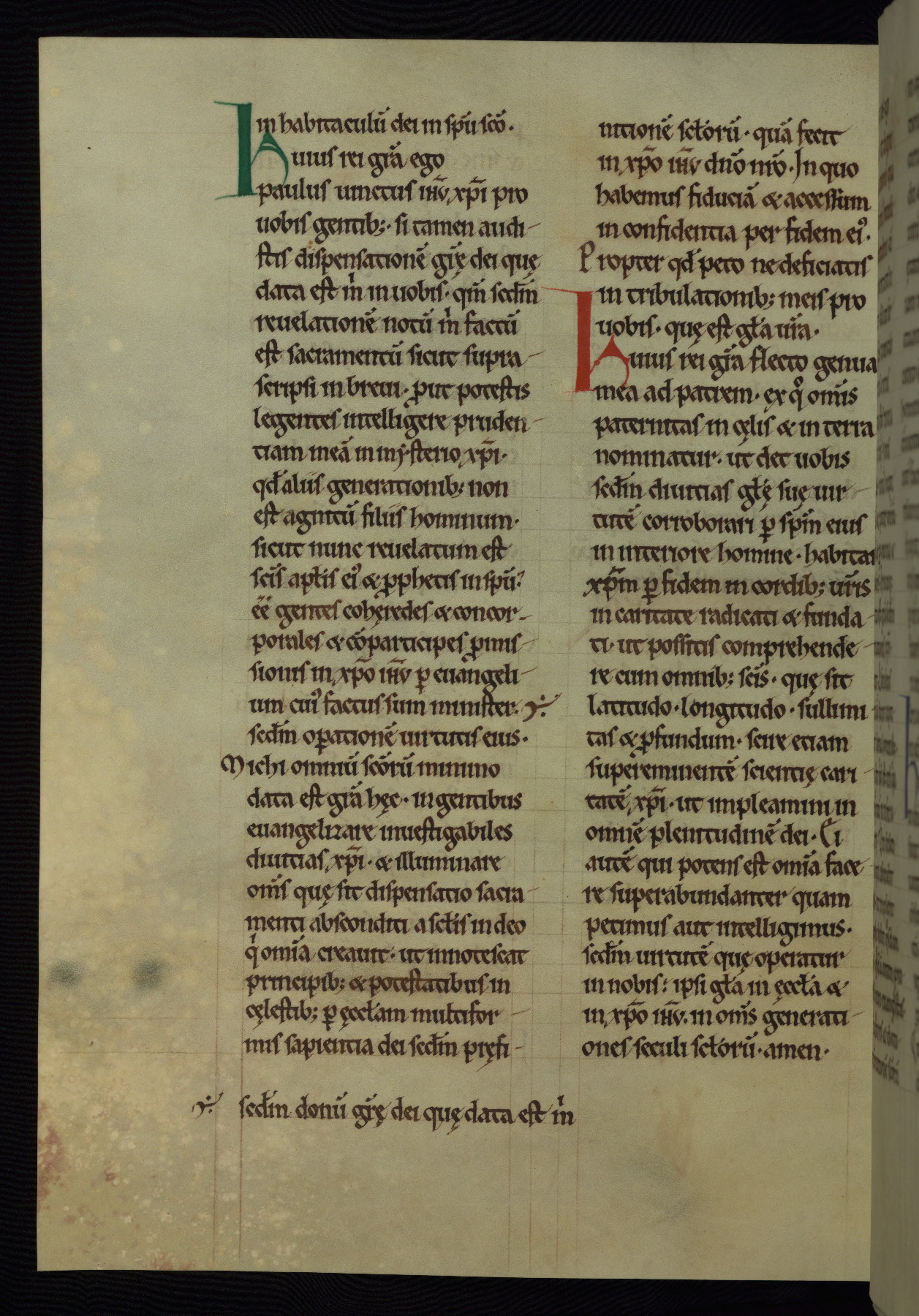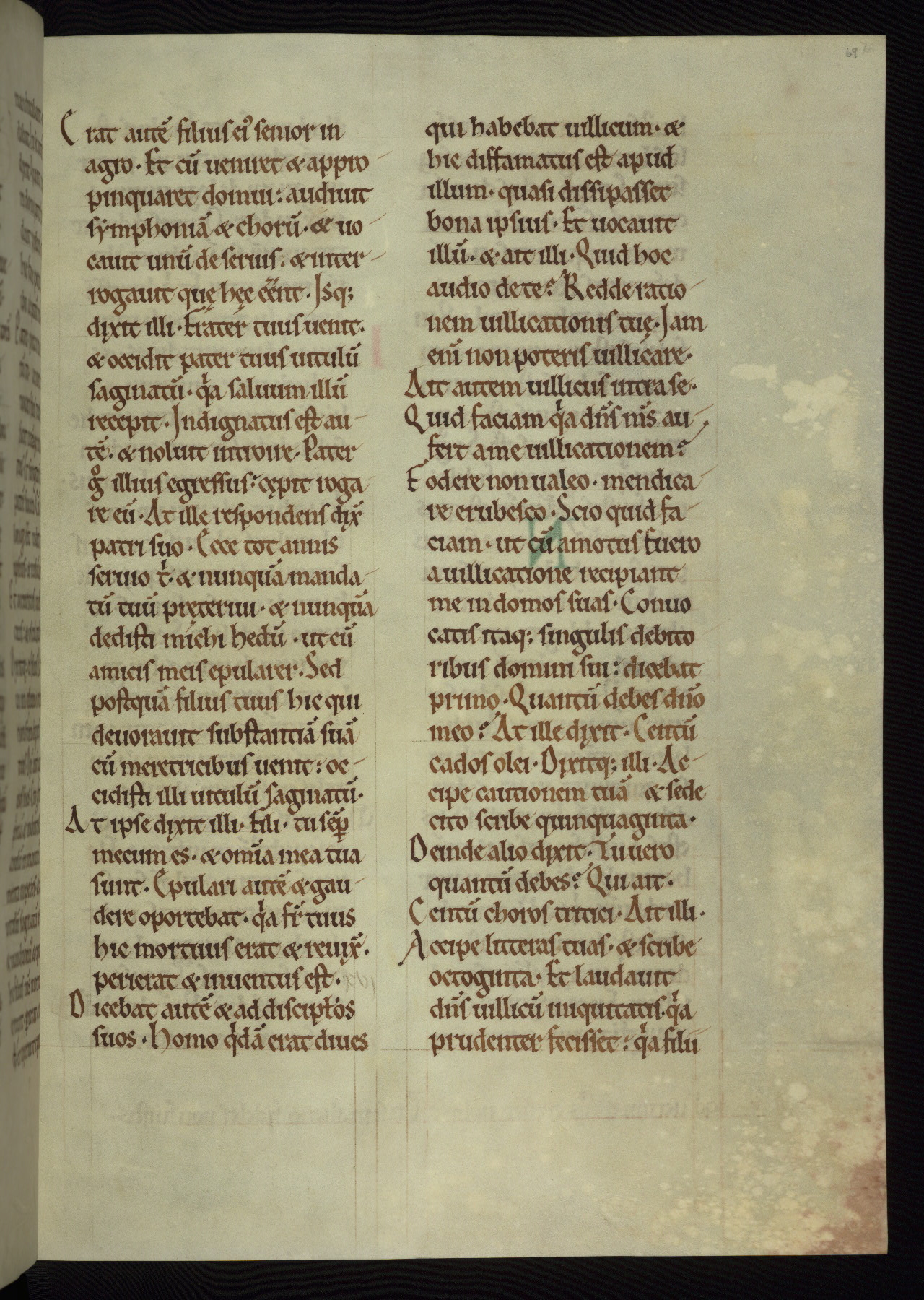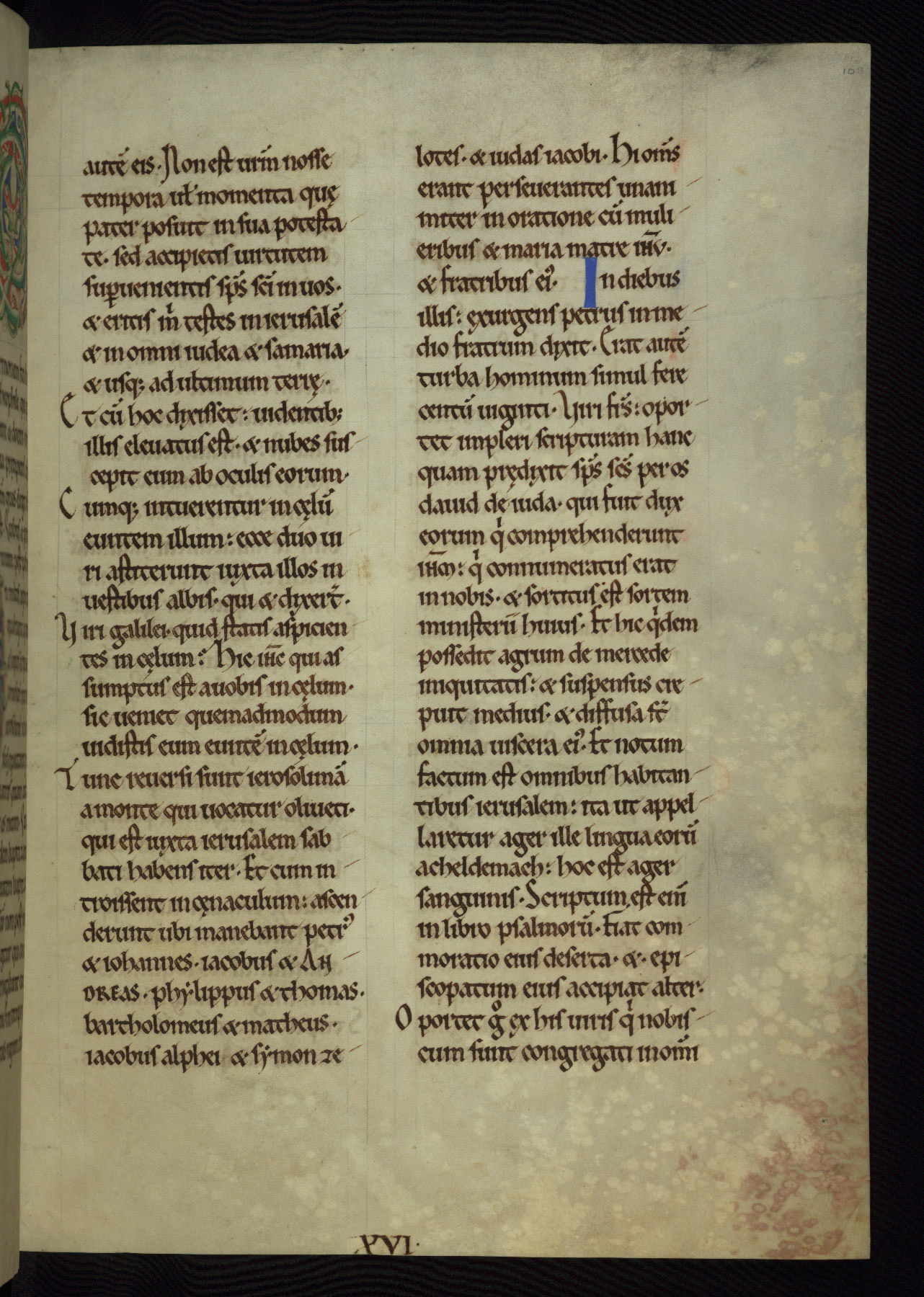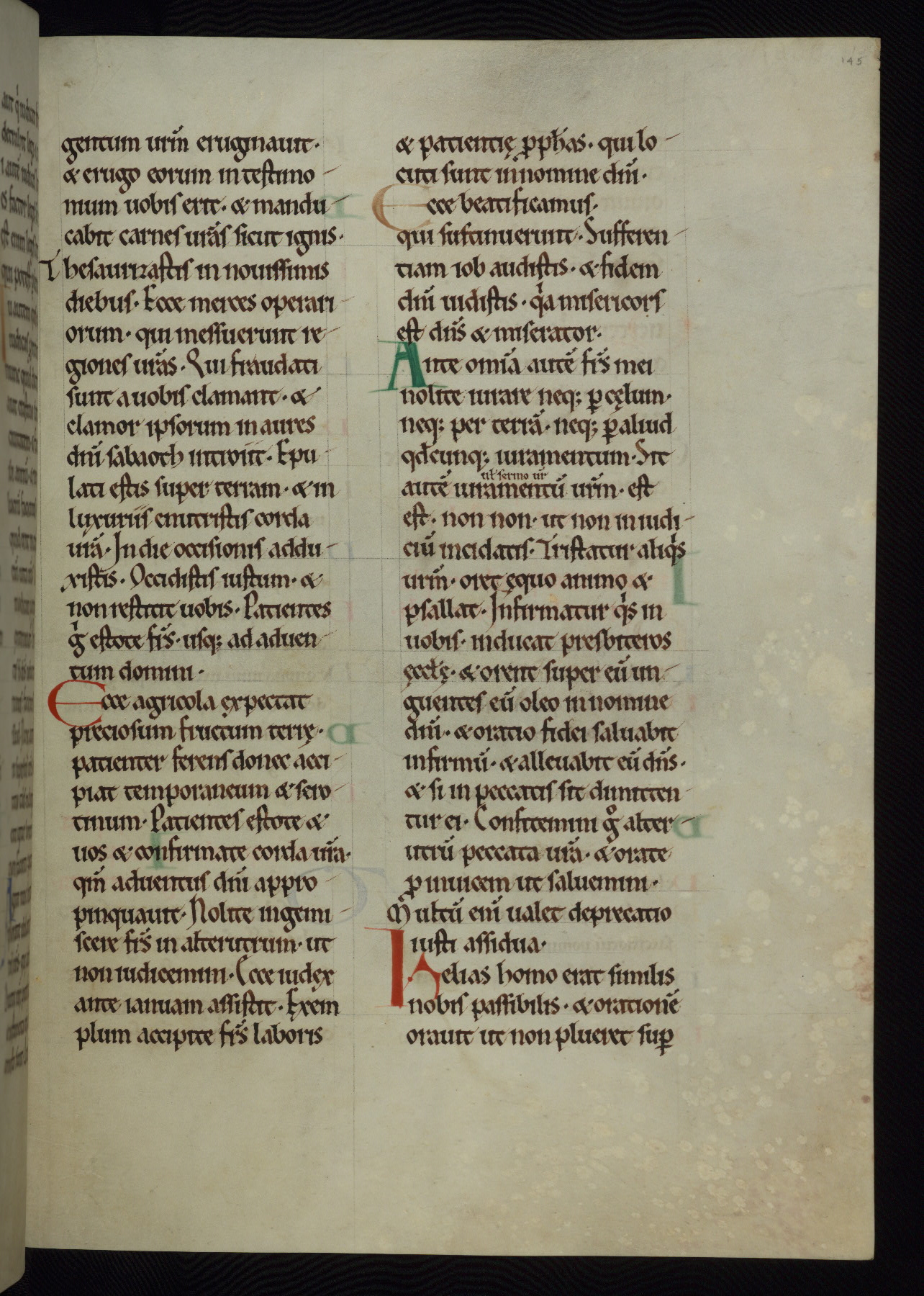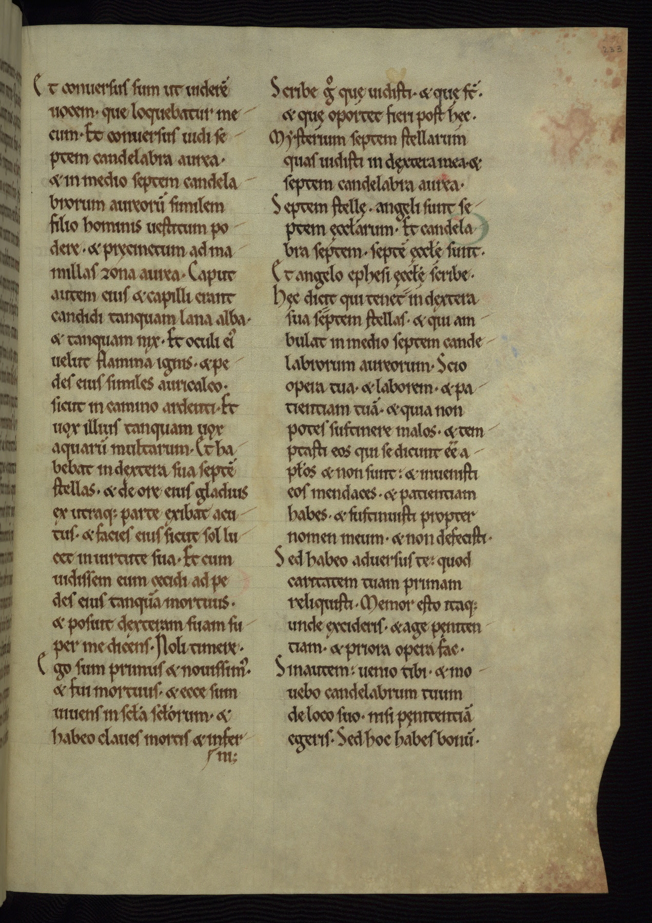 This large-format copy of the New Testament was almost certainly created at Rochester Cathedral Priory, England, in the first half of the twelfth century. It was part of a five-volume Bible, only one other volume of which, London, British Library Ms. Royal I.C.VII, has survived. The decorated initials in these manuscripts compare closely with those in other books securely attributed to Rochester. Textually these books are closely related to the Gundulph Bible (San Marino, Huntington Library Ms. HM 62), known to have been produced at Rochester in the second half of the eleventh century. Although neither the Walters' nor the British Library's volume includes an inscription associating this Bible with Rochester, the two medieval catalogs of the Rochester Cathedral library, produced around 1130 and in 1202, contain references to manuscripts that correspond well with them. The book’s large size indicates it that was designed to be read aloud, either during services or at meals in the refectory. Large, fanciful initials filled with succulent foliage, fruit, dragons, animals, and human faces begin each section of the text. Executed in a vibrant palette of red, blue, green, ochre (in place of gold), and yellow, the intricate, dynamic designs capture the essence of Romanesque manuscript illumination. Royal I.C.VII also includes four historiated initials (for the books of Joshua, I Samuel, 2 Samuel, and 2 Kings). Although the Bible was made at Rochester, the pre-Gothic script of W.18 in particular is extremely close to that practiced at nearby Canterbury at the time.