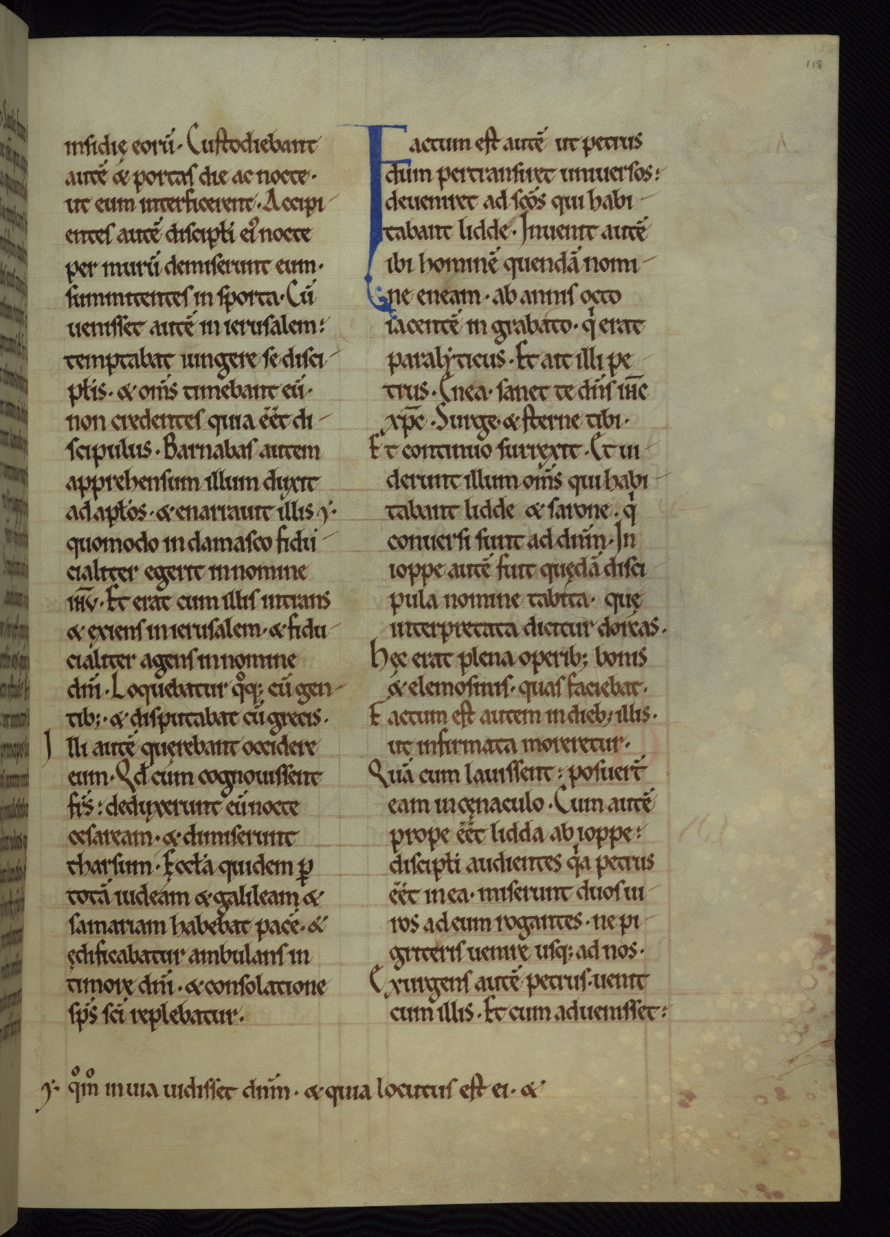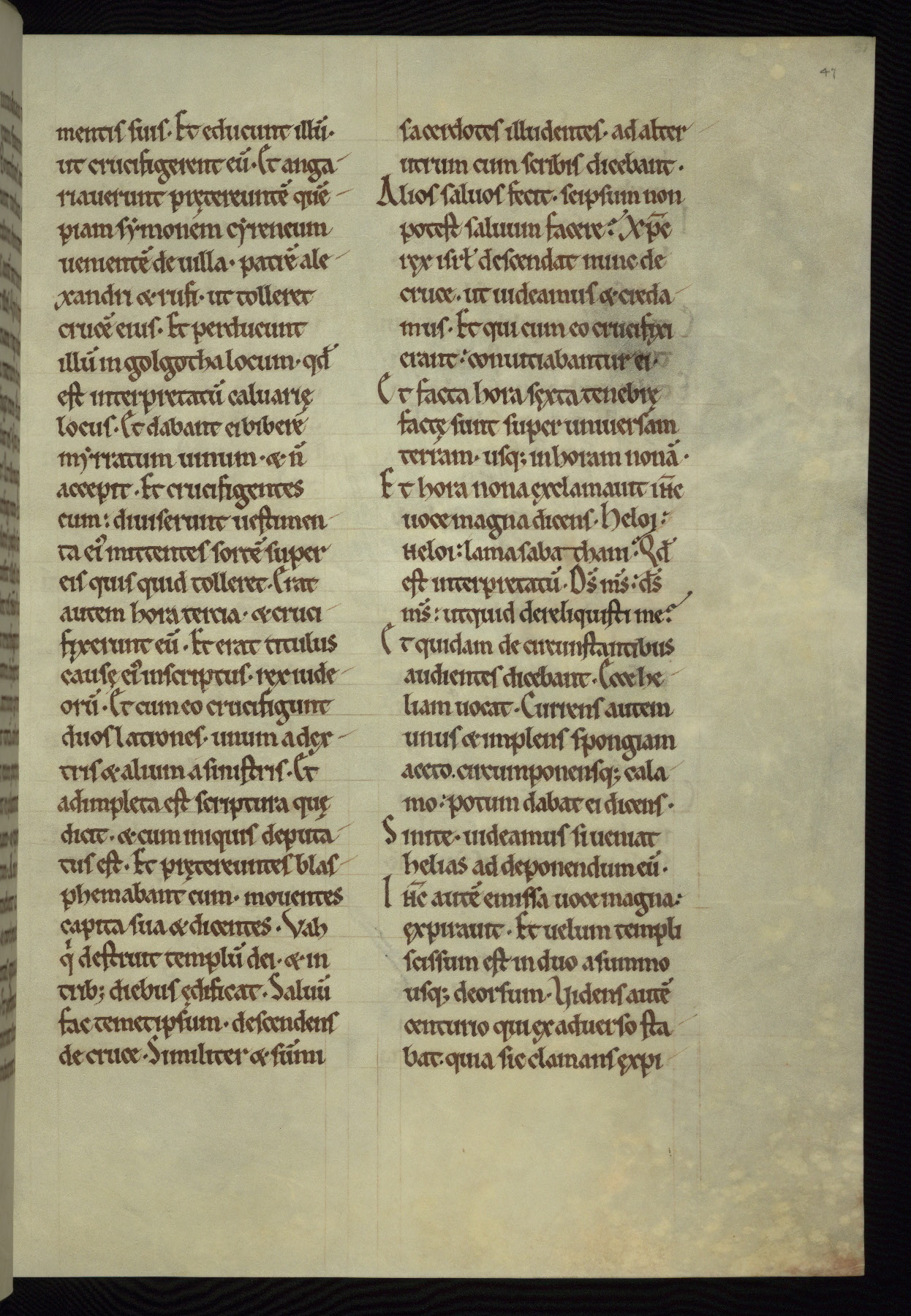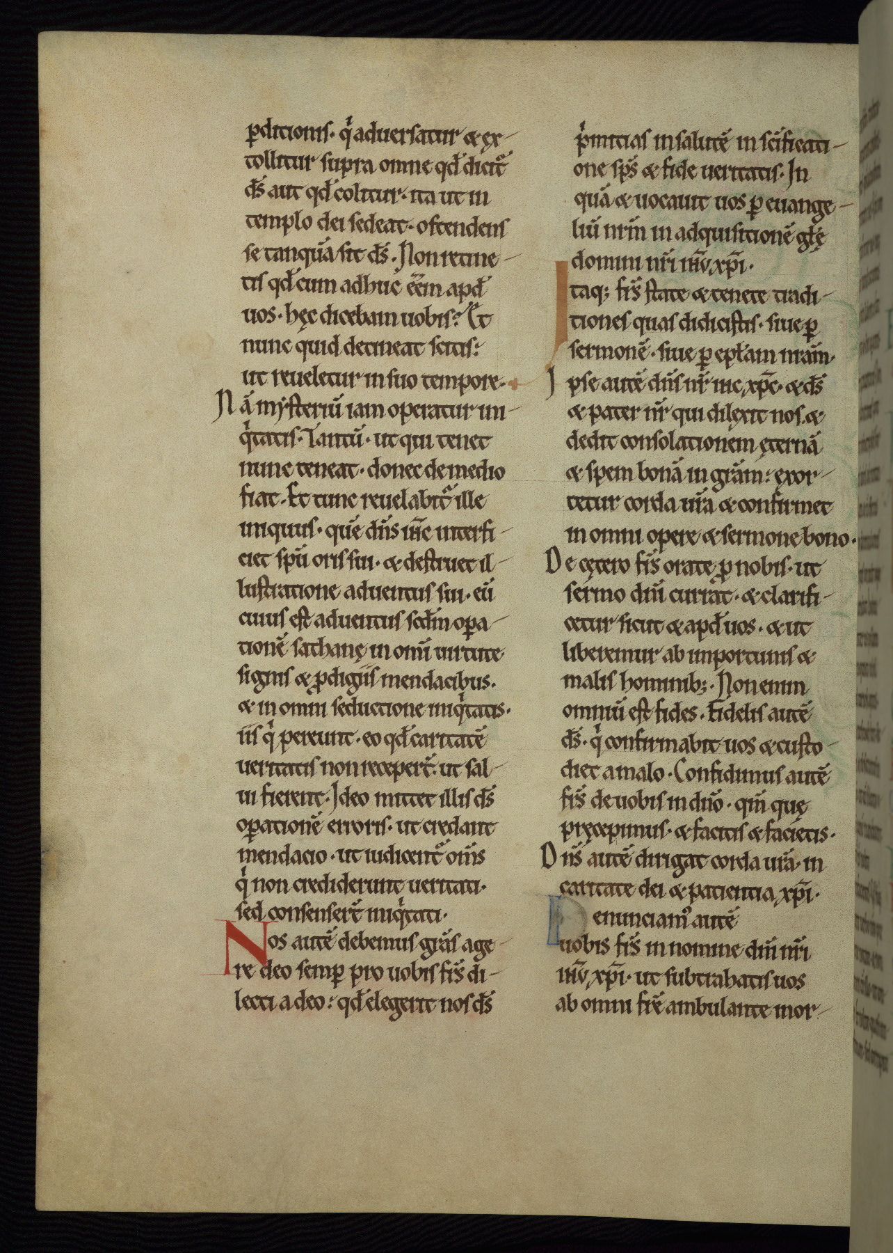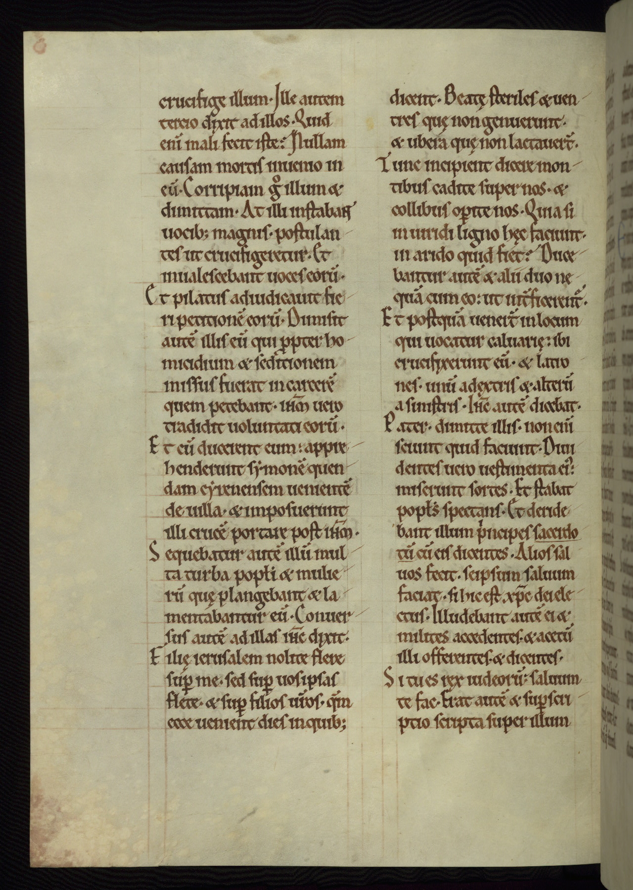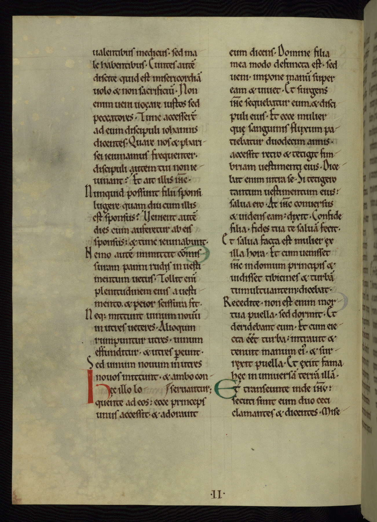 This large-format copy of the New Testament was almost certainly created at Rochester Cathedral Priory, England, in the first half of the twelfth century. It was part of a five-volume Bible, only one other volume of which, London, British Library Ms. Royal I.C.VII, has survived. The decorated initials in these manuscripts compare closely with those in other books securely attributed to Rochester. Textually these books are closely related to the Gundulph Bible (San Marino, Huntington Library Ms. HM 62), known to have been produced at Rochester in the second half of the eleventh century. Although neither the Walters' nor the British Library's volume includes an inscription associating this Bible with Rochester, the two medieval catalogs of the Rochester Cathedral library, produced around 1130 and in 1202, contain references to manuscripts that correspond well with them. The book’s large size indicates it that was designed to be read aloud, either during services or at meals in the refectory. Large, fanciful initials filled with succulent foliage, fruit, dragons, animals, and human faces begin each section of the text. Executed in a vibrant palette of red, blue, green, ochre (in place of gold), and yellow, the intricate, dynamic designs capture the essence of Romanesque manuscript illumination. Royal I.C.VII also includes four historiated initials (for the books of Joshua, I Samuel, 2 Samuel, and 2 Kings). Although the Bible was made at Rochester, the pre-Gothic script of W.18 in particular is extremely close to that practiced at nearby Canterbury at the time.