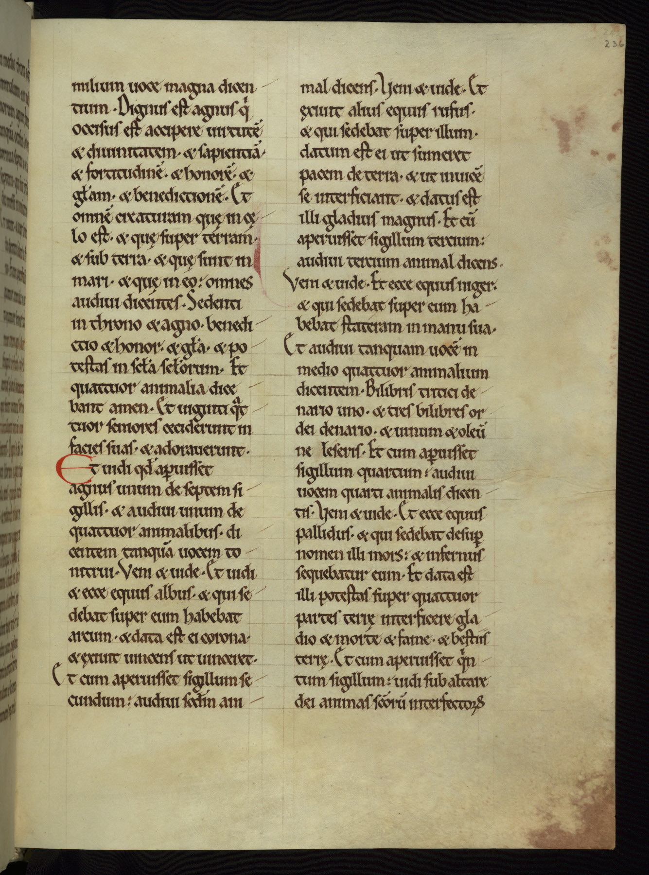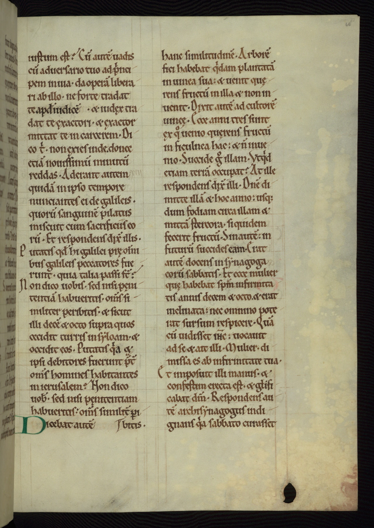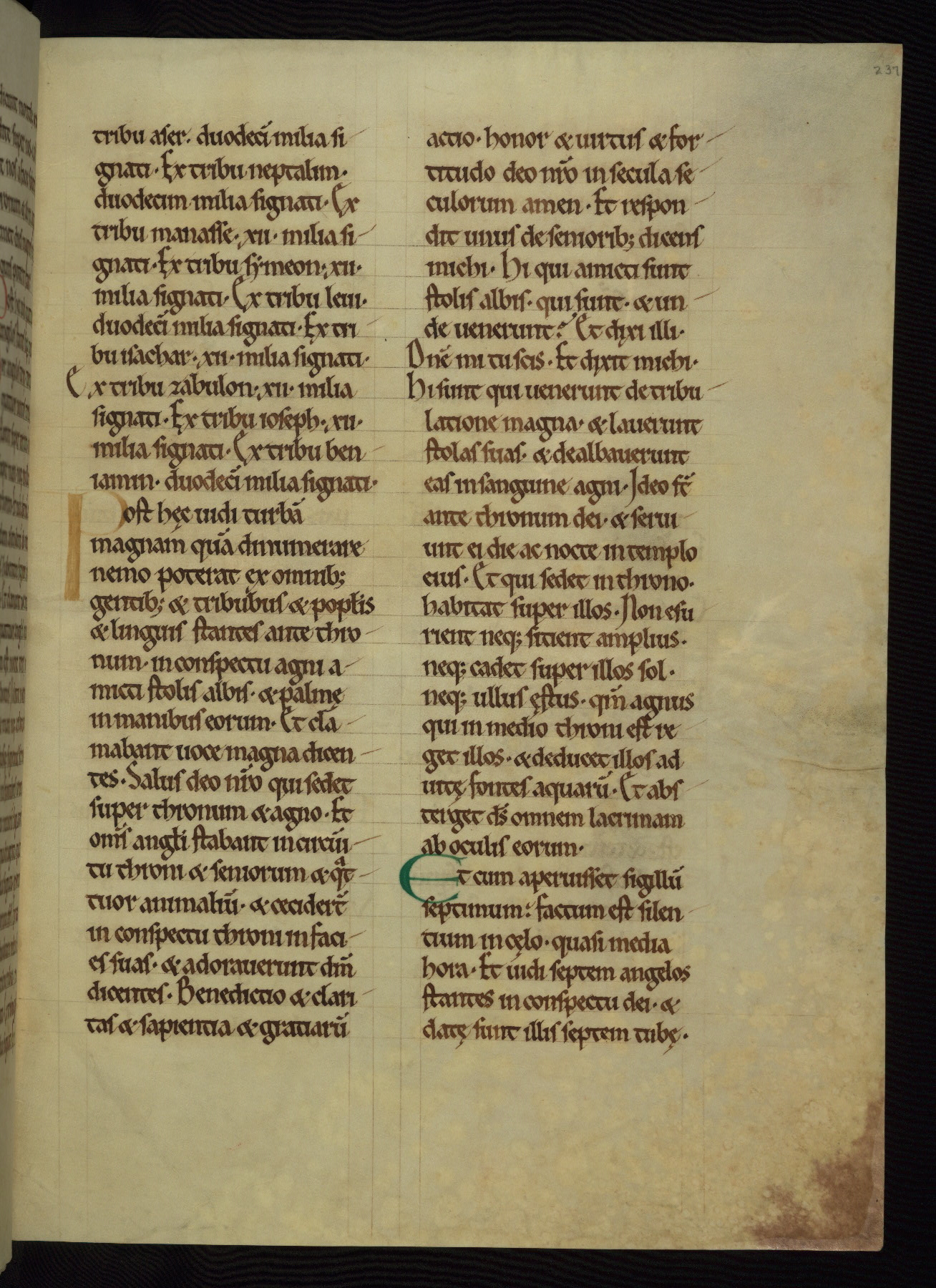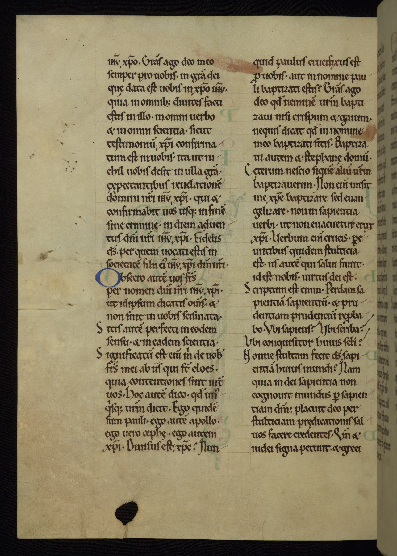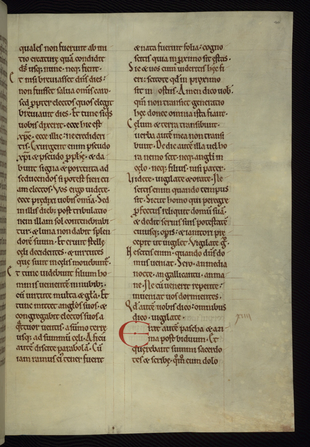 This large-format copy of the New Testament was almost certainly created at Rochester Cathedral Priory, England, in the first half of the twelfth century. It was part of a five-volume Bible, only one other volume of which, London, British Library Ms. Royal I.C.VII, has survived. The decorated initials in these manuscripts compare closely with those in other books securely attributed to Rochester. Textually these books are closely related to the Gundulph Bible (San Marino, Huntington Library Ms. HM 62), known to have been produced at Rochester in the second half of the eleventh century. Although neither the Walters' nor the British Library's volume includes an inscription associating this Bible with Rochester, the two medieval catalogs of the Rochester Cathedral library, produced around 1130 and in 1202, contain references to manuscripts that correspond well with them. The book’s large size indicates it that was designed to be read aloud, either during services or at meals in the refectory. Large, fanciful initials filled with succulent foliage, fruit, dragons, animals, and human faces begin each section of the text. Executed in a vibrant palette of red, blue, green, ochre (in place of gold), and yellow, the intricate, dynamic designs capture the essence of Romanesque manuscript illumination. Royal I.C.VII also includes four historiated initials (for the books of Joshua, I Samuel, 2 Samuel, and 2 Kings). Although the Bible was made at Rochester, the pre-Gothic script of W.18 in particular is extremely close to that practiced at nearby Canterbury at the time.