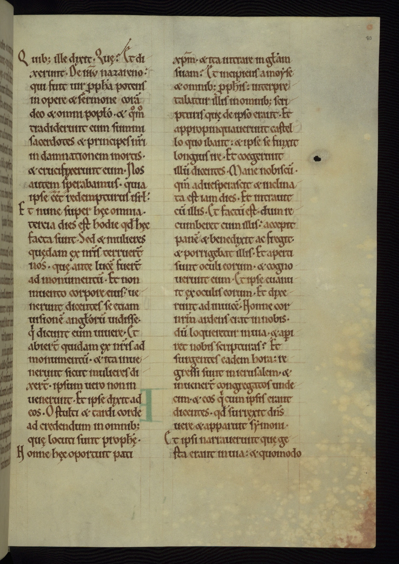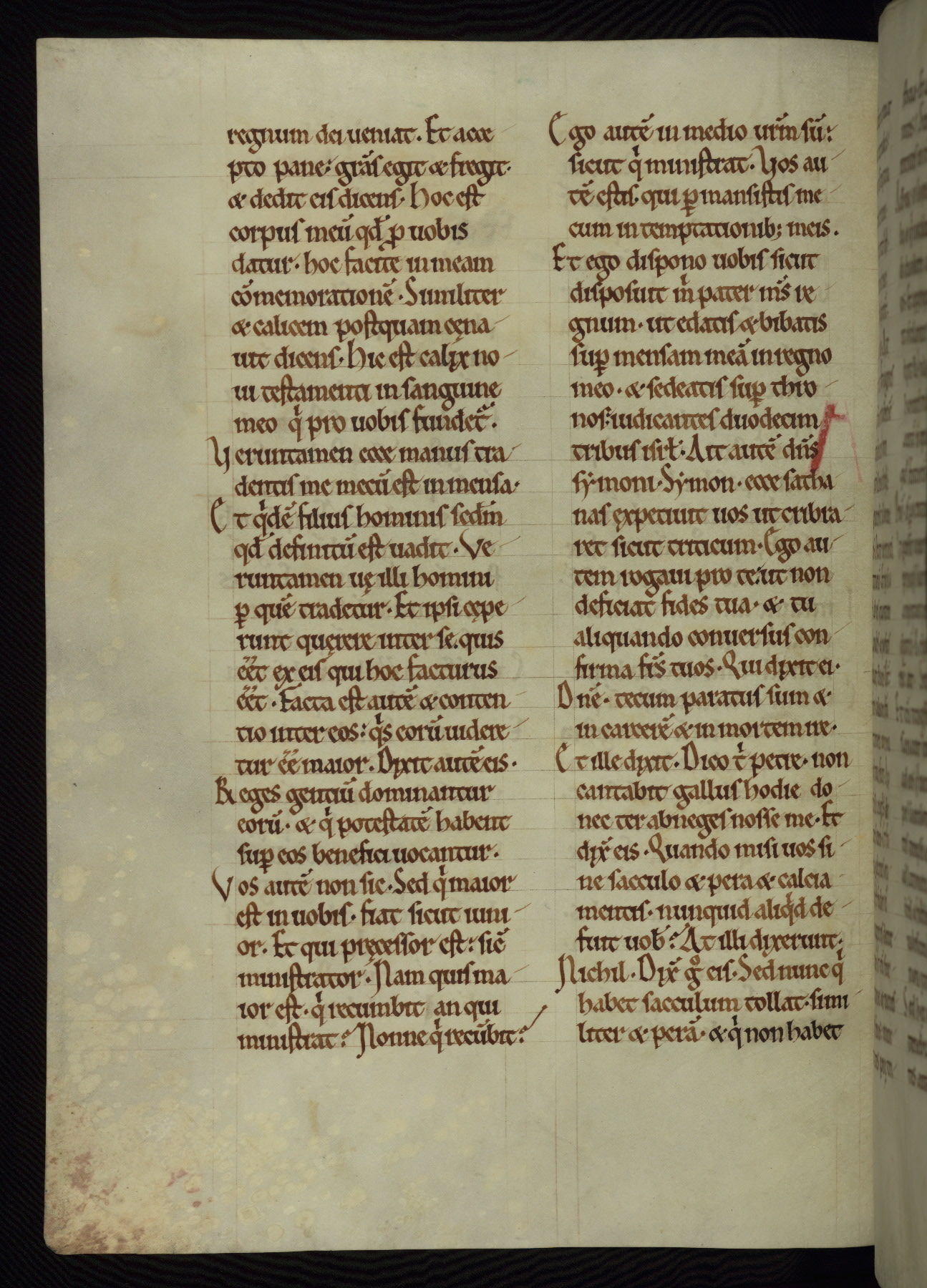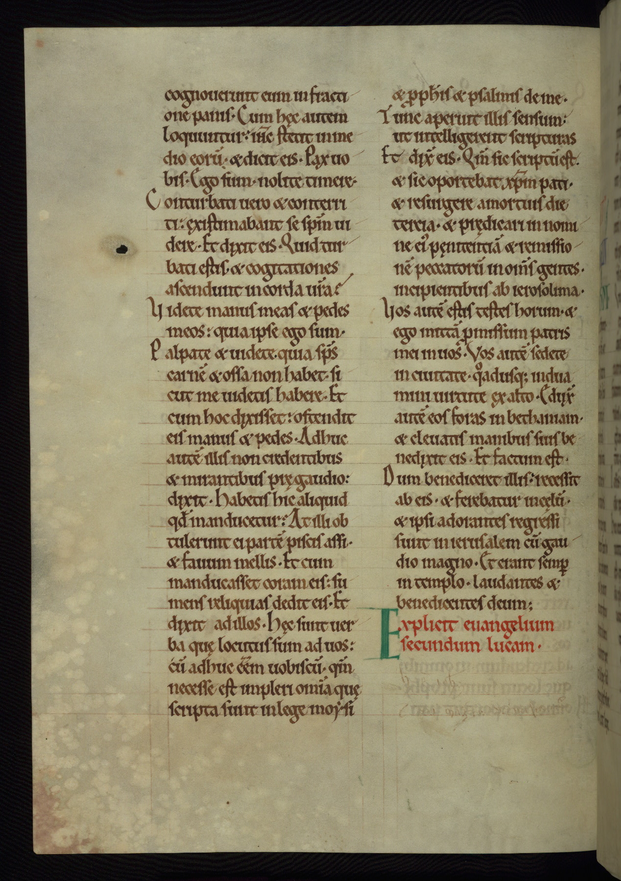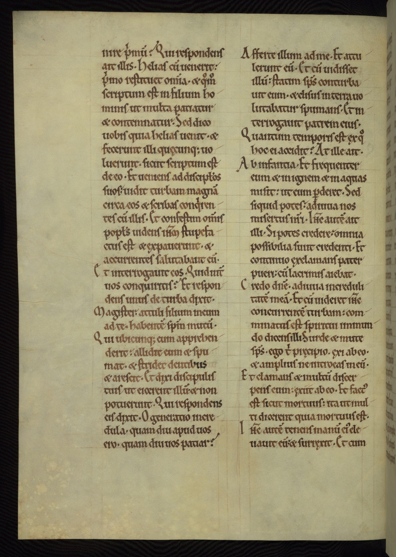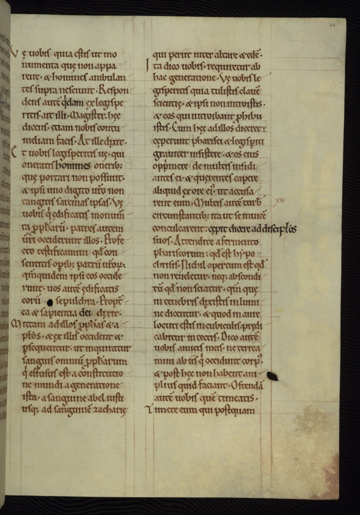 This large-format copy of the New Testament was almost certainly created at Rochester Cathedral Priory, England, in the first half of the twelfth century. It was part of a five-volume Bible, only one other volume of which, London, British Library Ms. Royal I.C.VII, has survived. The decorated initials in these manuscripts compare closely with those in other books securely attributed to Rochester. Textually these books are closely related to the Gundulph Bible (San Marino, Huntington Library Ms. HM 62), known to have been produced at Rochester in the second half of the eleventh century. Although neither the Walters' nor the British Library's volume includes an inscription associating this Bible with Rochester, the two medieval catalogs of the Rochester Cathedral library, produced around 1130 and in 1202, contain references to manuscripts that correspond well with them. The book’s large size indicates it that was designed to be read aloud, either during services or at meals in the refectory. Large, fanciful initials filled with succulent foliage, fruit, dragons, animals, and human faces begin each section of the text. Executed in a vibrant palette of red, blue, green, ochre (in place of gold), and yellow, the intricate, dynamic designs capture the essence of Romanesque manuscript illumination. Royal I.C.VII also includes four historiated initials (for the books of Joshua, I Samuel, 2 Samuel, and 2 Kings). Although the Bible was made at Rochester, the pre-Gothic script of W.18 in particular is extremely close to that practiced at nearby Canterbury at the time.