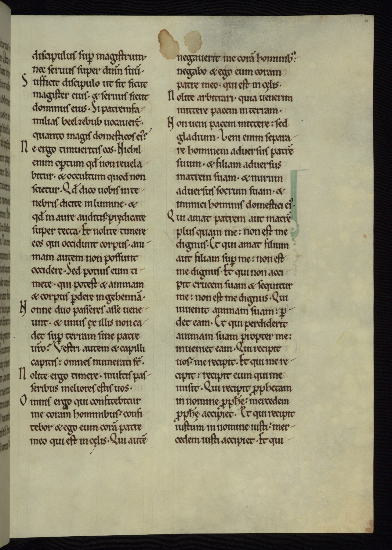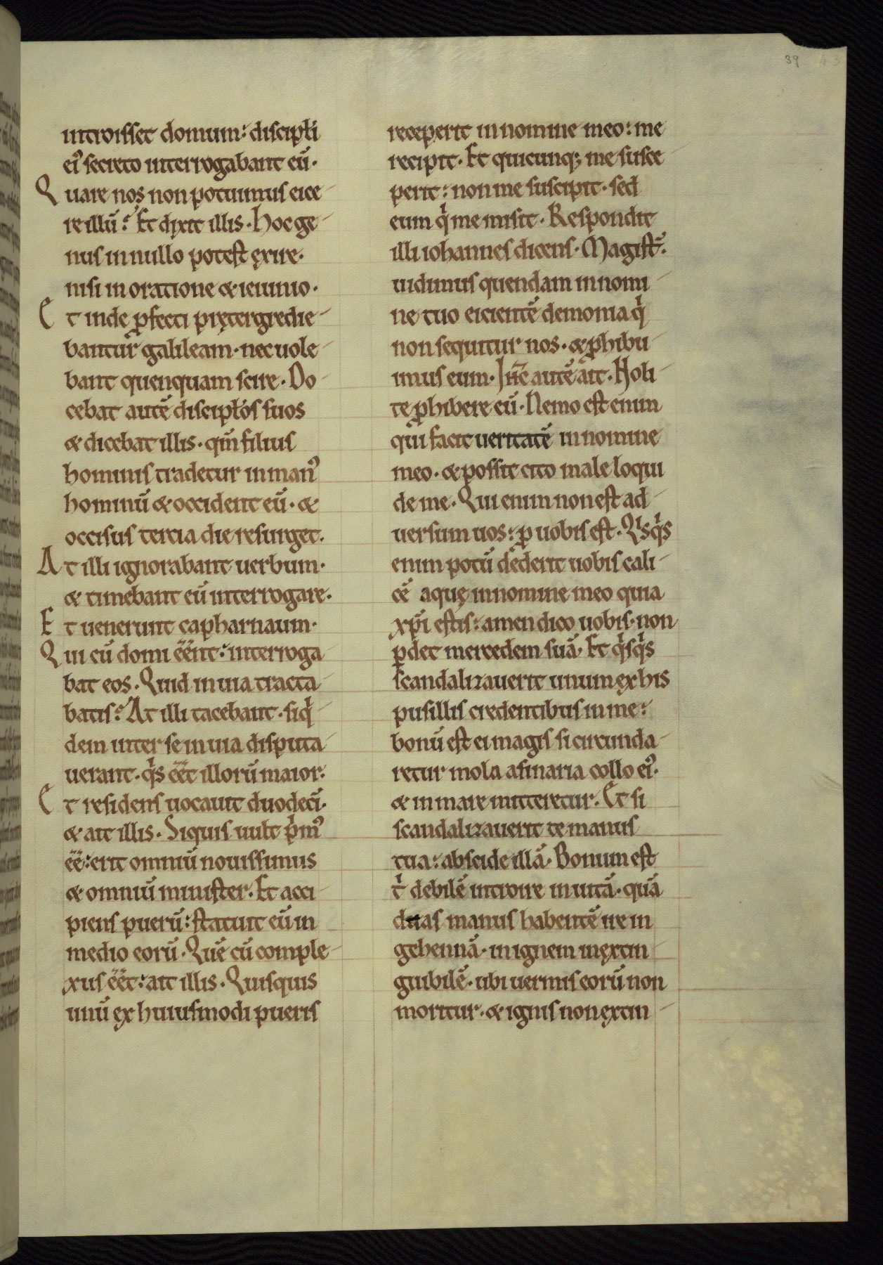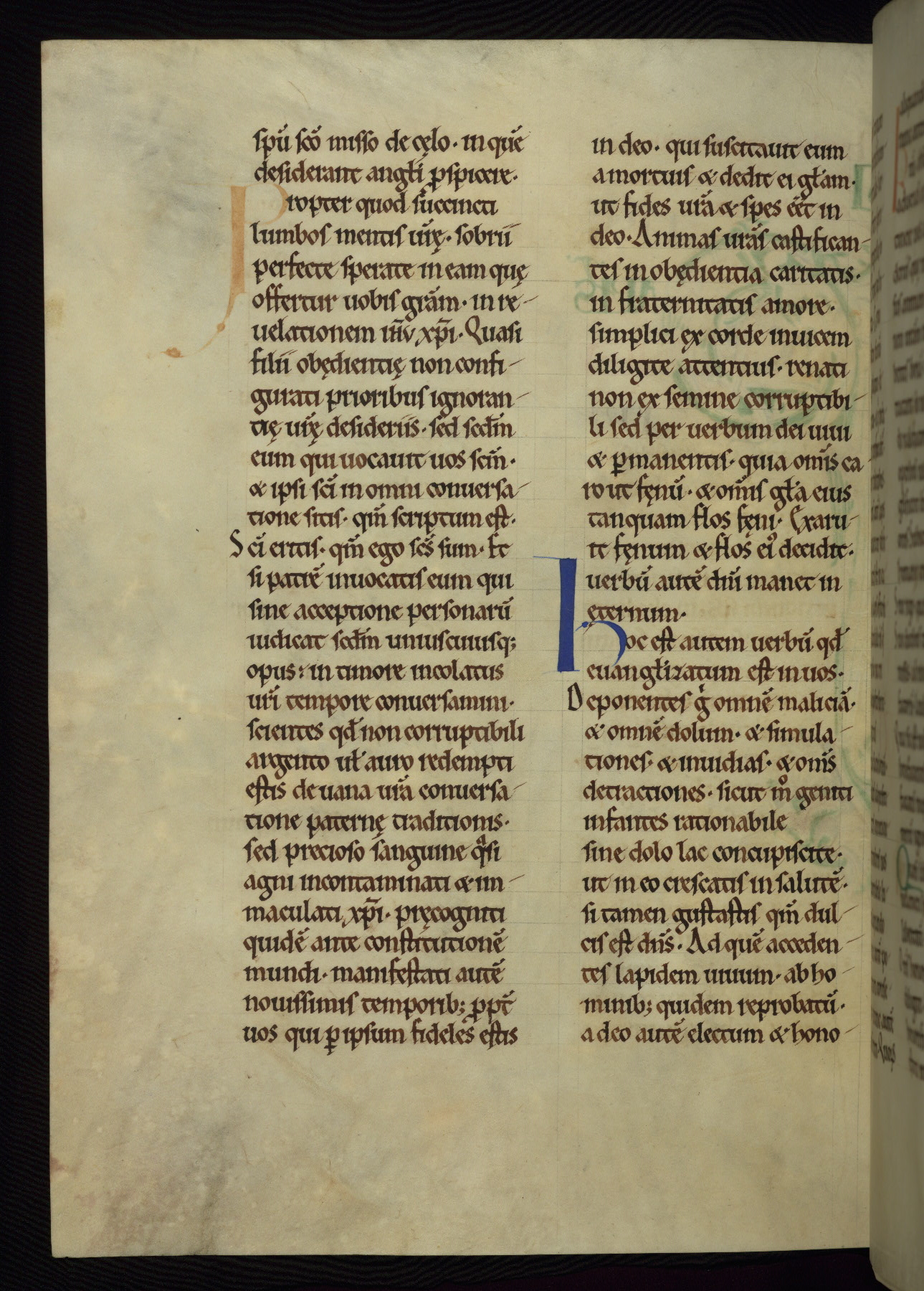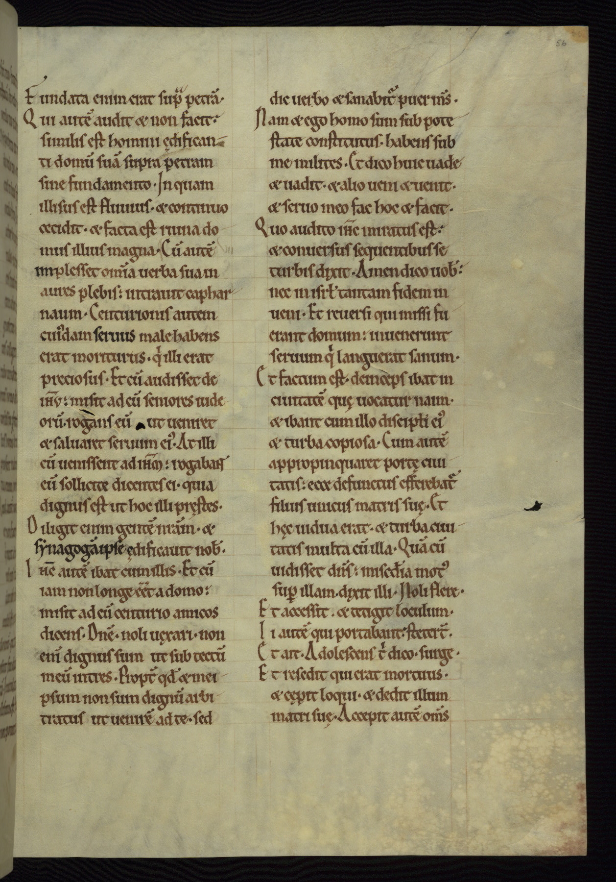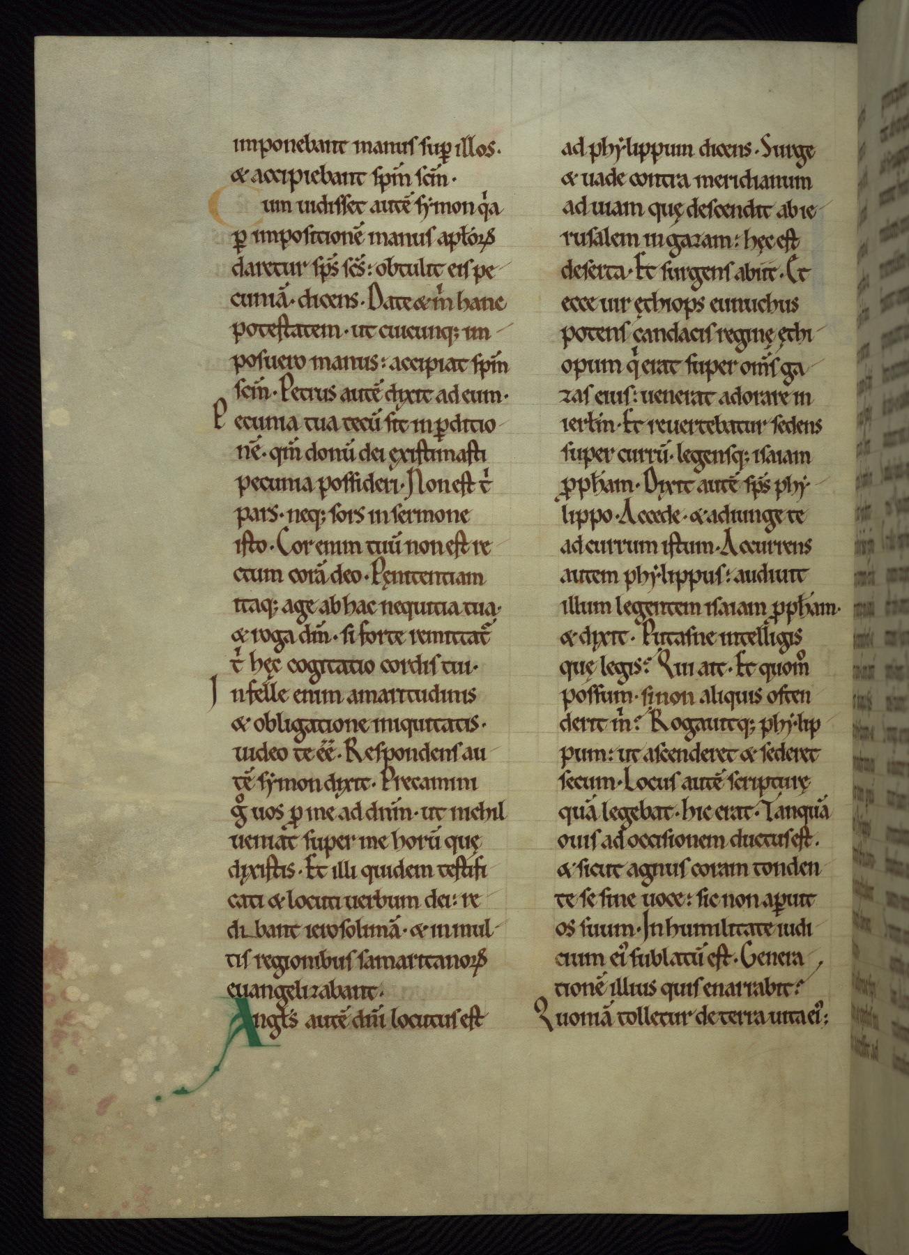 This large-format copy of the New Testament was almost certainly created at Rochester Cathedral Priory, England, in the first half of the twelfth century. It was part of a five-volume Bible, only one other volume of which, London, British Library Ms. Royal I.C.VII, has survived. The decorated initials in these manuscripts compare closely with those in other books securely attributed to Rochester. Textually these books are closely related to the Gundulph Bible (San Marino, Huntington Library Ms. HM 62), known to have been produced at Rochester in the second half of the eleventh century. Although neither the Walters' nor the British Library's volume includes an inscription associating this Bible with Rochester, the two medieval catalogs of the Rochester Cathedral library, produced around 1130 and in 1202, contain references to manuscripts that correspond well with them. The book’s large size indicates it that was designed to be read aloud, either during services or at meals in the refectory. Large, fanciful initials filled with succulent foliage, fruit, dragons, animals, and human faces begin each section of the text. Executed in a vibrant palette of red, blue, green, ochre (in place of gold), and yellow, the intricate, dynamic designs capture the essence of Romanesque manuscript illumination. Royal I.C.VII also includes four historiated initials (for the books of Joshua, I Samuel, 2 Samuel, and 2 Kings). Although the Bible was made at Rochester, the pre-Gothic script of W.18 in particular is extremely close to that practiced at nearby Canterbury at the time.
