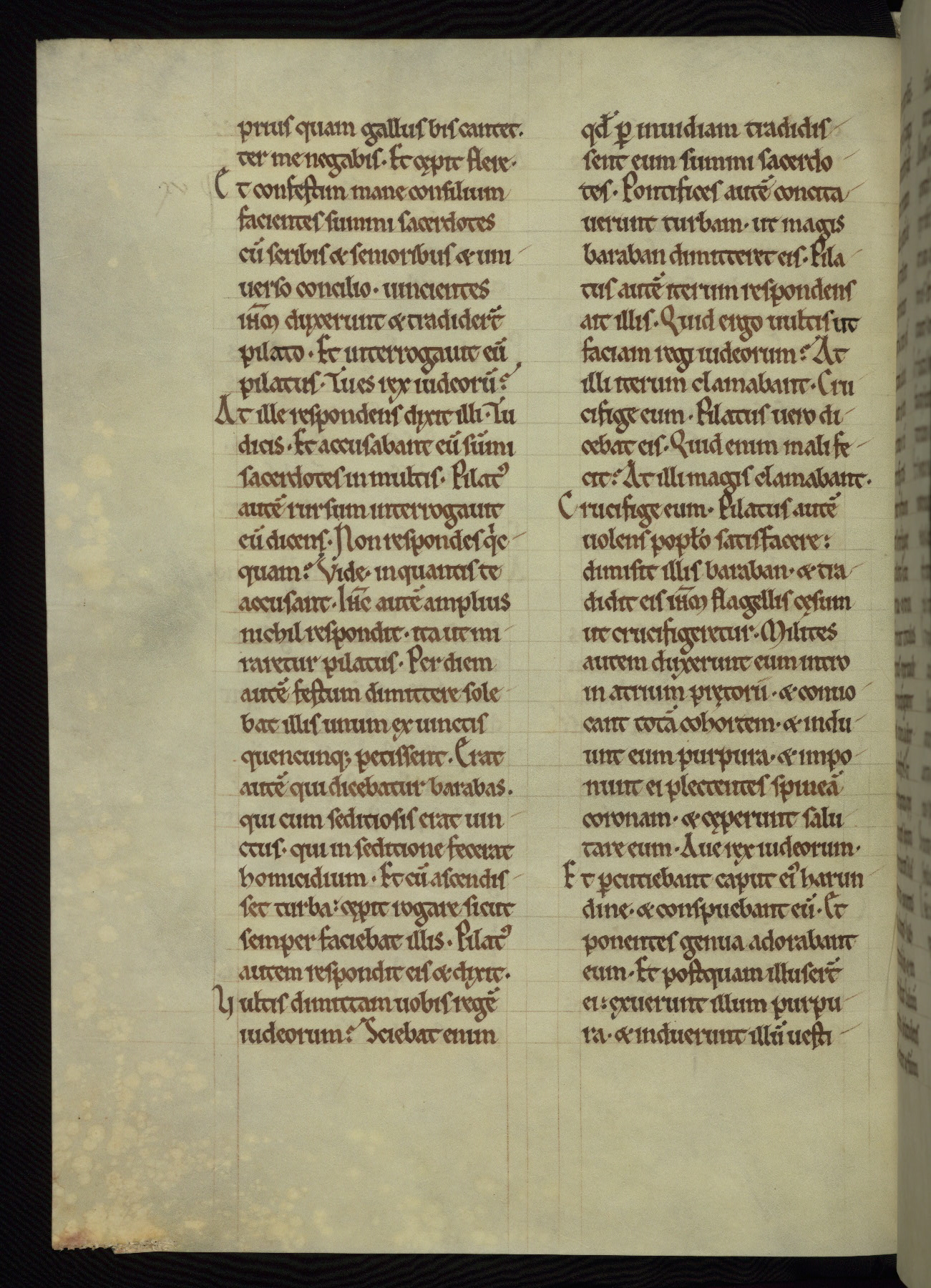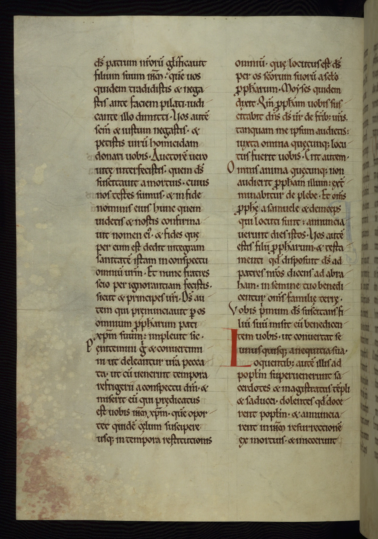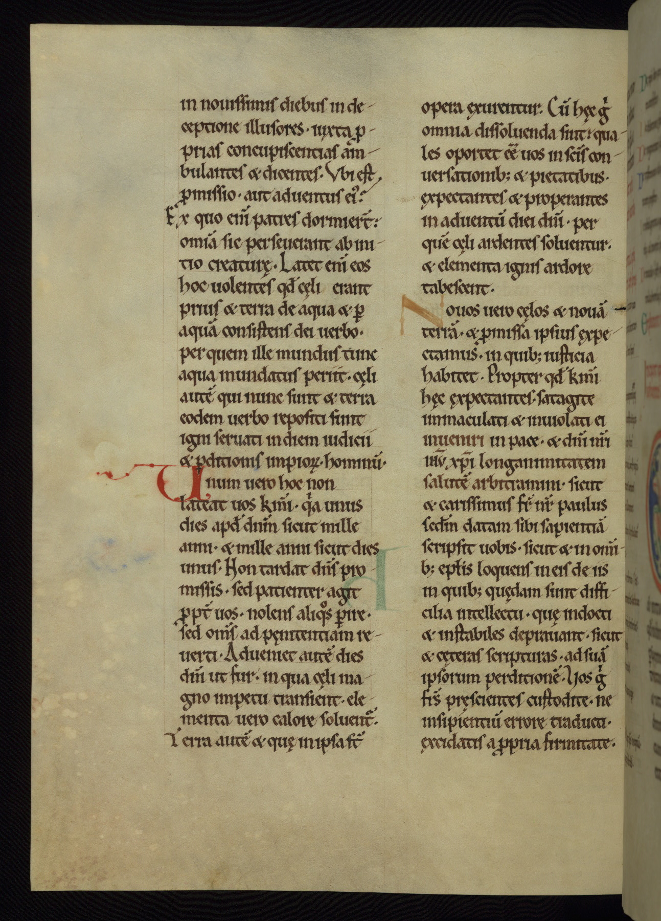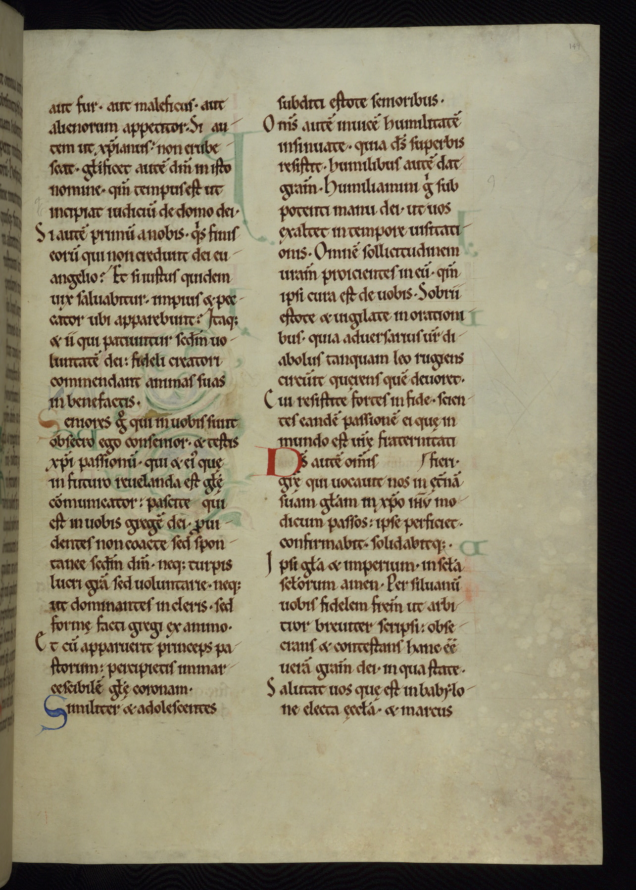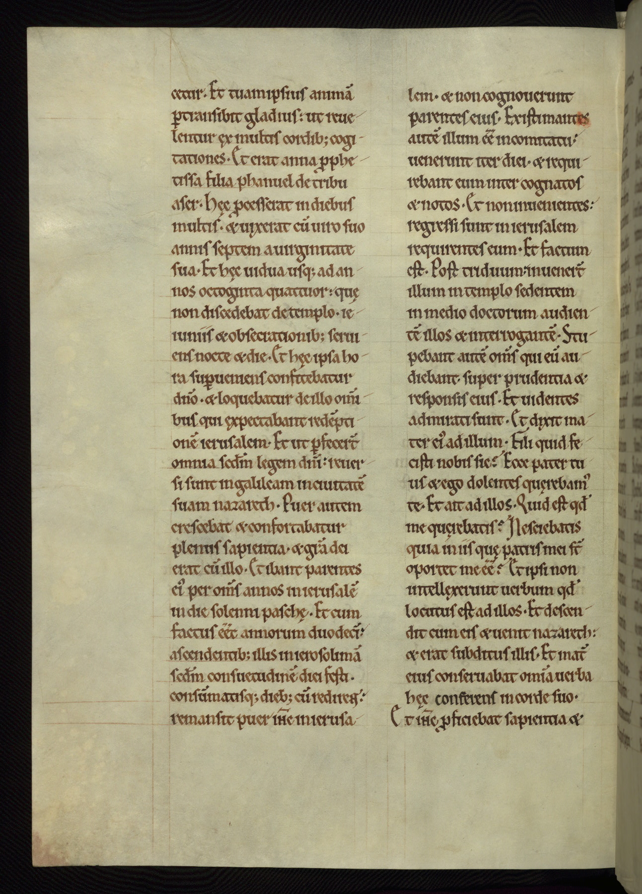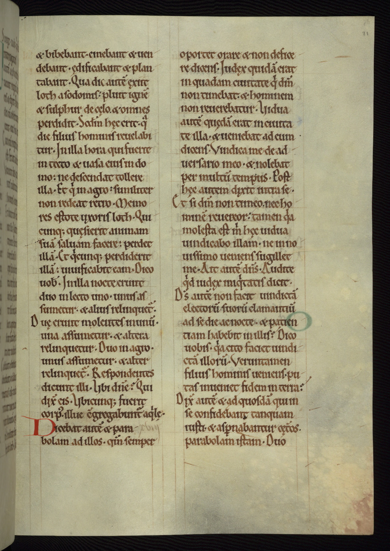 This large-format copy of the New Testament was almost certainly created at Rochester Cathedral Priory, England, in the first half of the twelfth century. It was part of a five-volume Bible, only one other volume of which, London, British Library Ms. Royal I.C.VII, has survived. The decorated initials in these manuscripts compare closely with those in other books securely attributed to Rochester. Textually these books are closely related to the Gundulph Bible (San Marino, Huntington Library Ms. HM 62), known to have been produced at Rochester in the second half of the eleventh century. Although neither the Walters' nor the British Library's volume includes an inscription associating this Bible with Rochester, the two medieval catalogs of the Rochester Cathedral library, produced around 1130 and in 1202, contain references to manuscripts that correspond well with them. The book’s large size indicates it that was designed to be read aloud, either during services or at meals in the refectory. Large, fanciful initials filled with succulent foliage, fruit, dragons, animals, and human faces begin each section of the text. Executed in a vibrant palette of red, blue, green, ochre (in place of gold), and yellow, the intricate, dynamic designs capture the essence of Romanesque manuscript illumination. Royal I.C.VII also includes four historiated initials (for the books of Joshua, I Samuel, 2 Samuel, and 2 Kings). Although the Bible was made at Rochester, the pre-Gothic script of W.18 in particular is extremely close to that practiced at nearby Canterbury at the time.