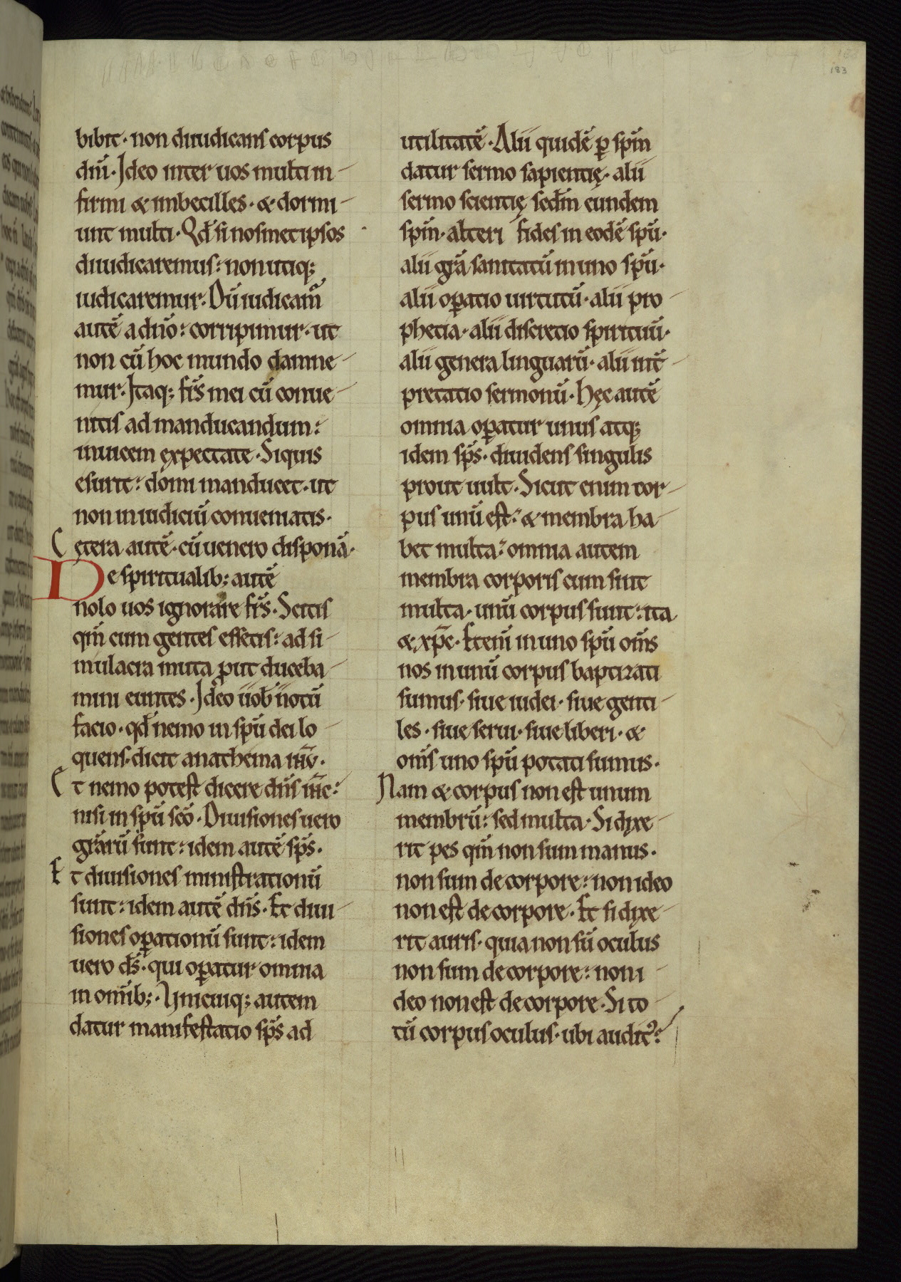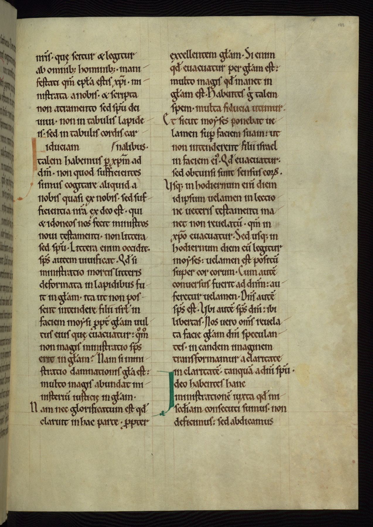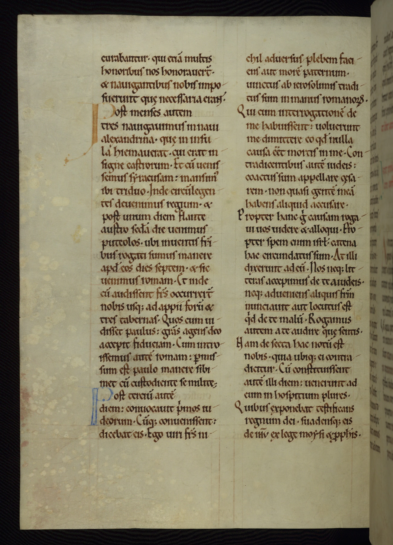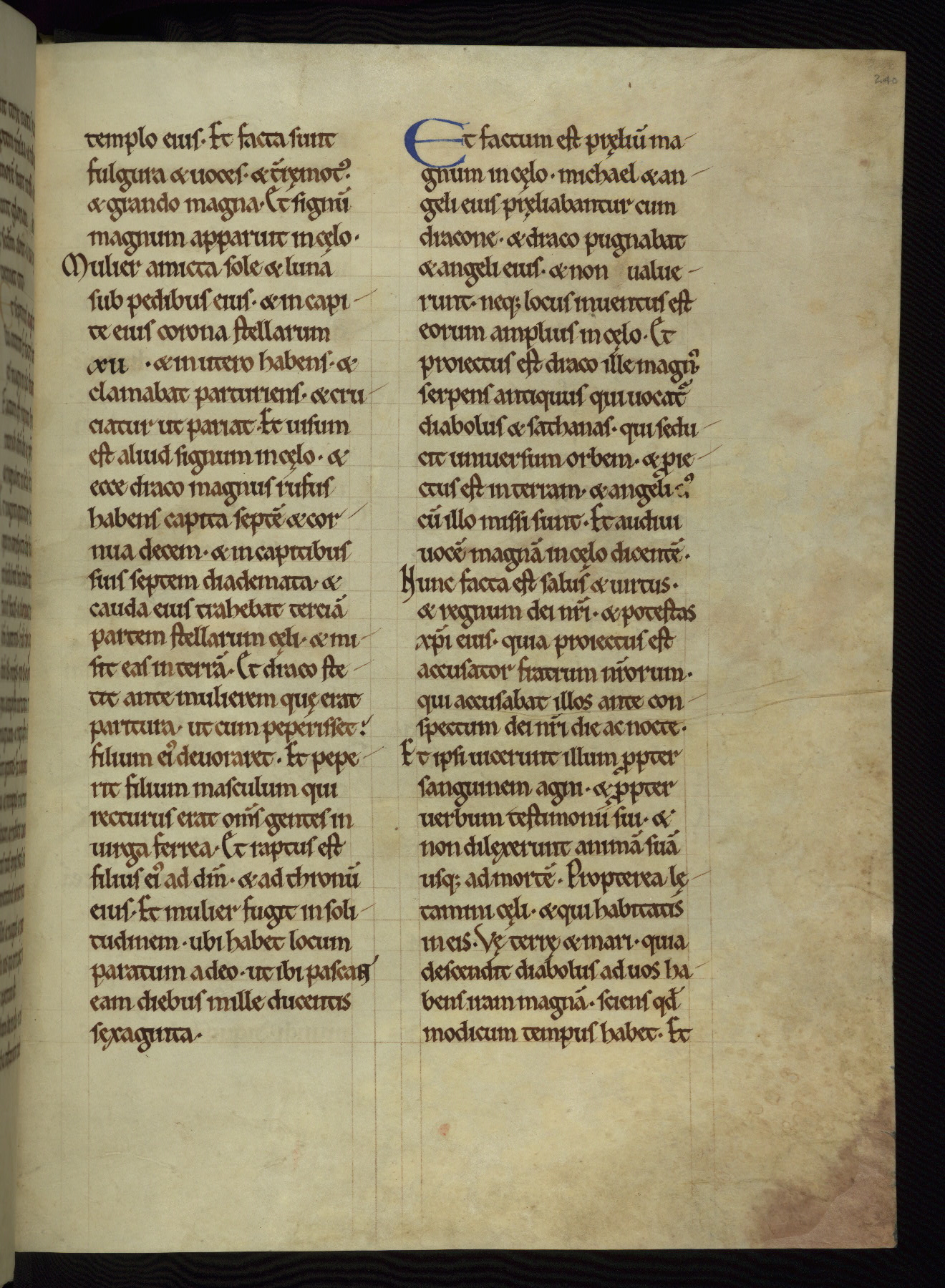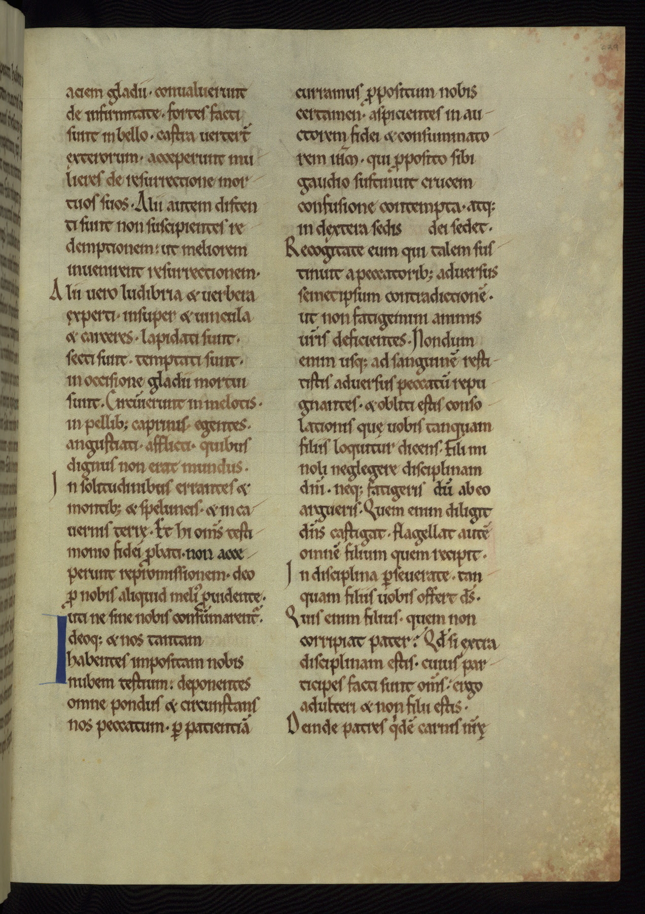 This large-format copy of the New Testament was almost certainly created at Rochester Cathedral Priory, England, in the first half of the twelfth century. It was part of a five-volume Bible, only one other volume of which, London, British Library Ms. Royal I.C.VII, has survived. The decorated initials in these manuscripts compare closely with those in other books securely attributed to Rochester. Textually these books are closely related to the Gundulph Bible (San Marino, Huntington Library Ms. HM 62), known to have been produced at Rochester in the second half of the eleventh century. Although neither the Walters' nor the British Library's volume includes an inscription associating this Bible with Rochester, the two medieval catalogs of the Rochester Cathedral library, produced around 1130 and in 1202, contain references to manuscripts that correspond well with them. The book’s large size indicates it that was designed to be read aloud, either during services or at meals in the refectory. Large, fanciful initials filled with succulent foliage, fruit, dragons, animals, and human faces begin each section of the text. Executed in a vibrant palette of red, blue, green, ochre (in place of gold), and yellow, the intricate, dynamic designs capture the essence of Romanesque manuscript illumination. Royal I.C.VII also includes four historiated initials (for the books of Joshua, I Samuel, 2 Samuel, and 2 Kings). Although the Bible was made at Rochester, the pre-Gothic script of W.18 in particular is extremely close to that practiced at nearby Canterbury at the time.