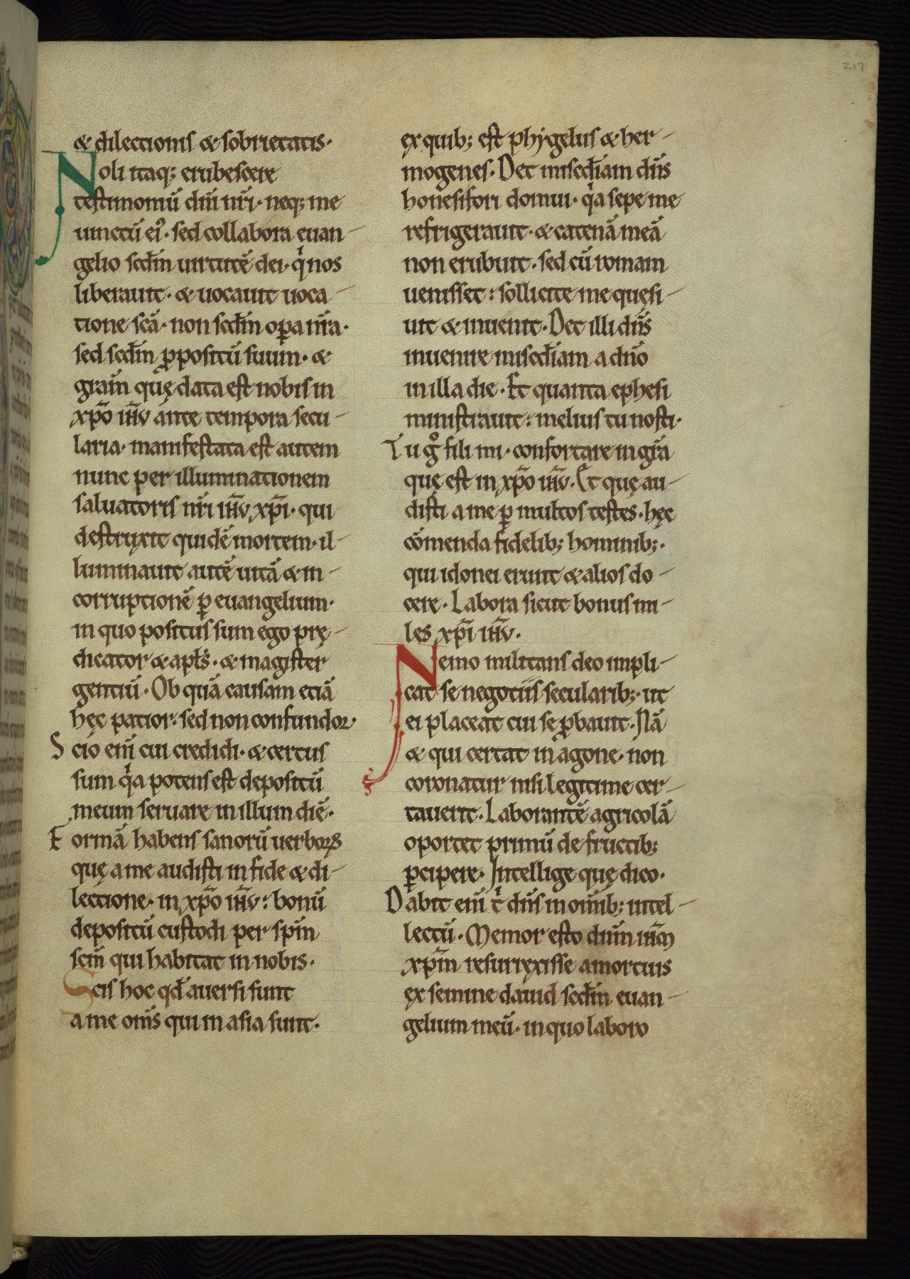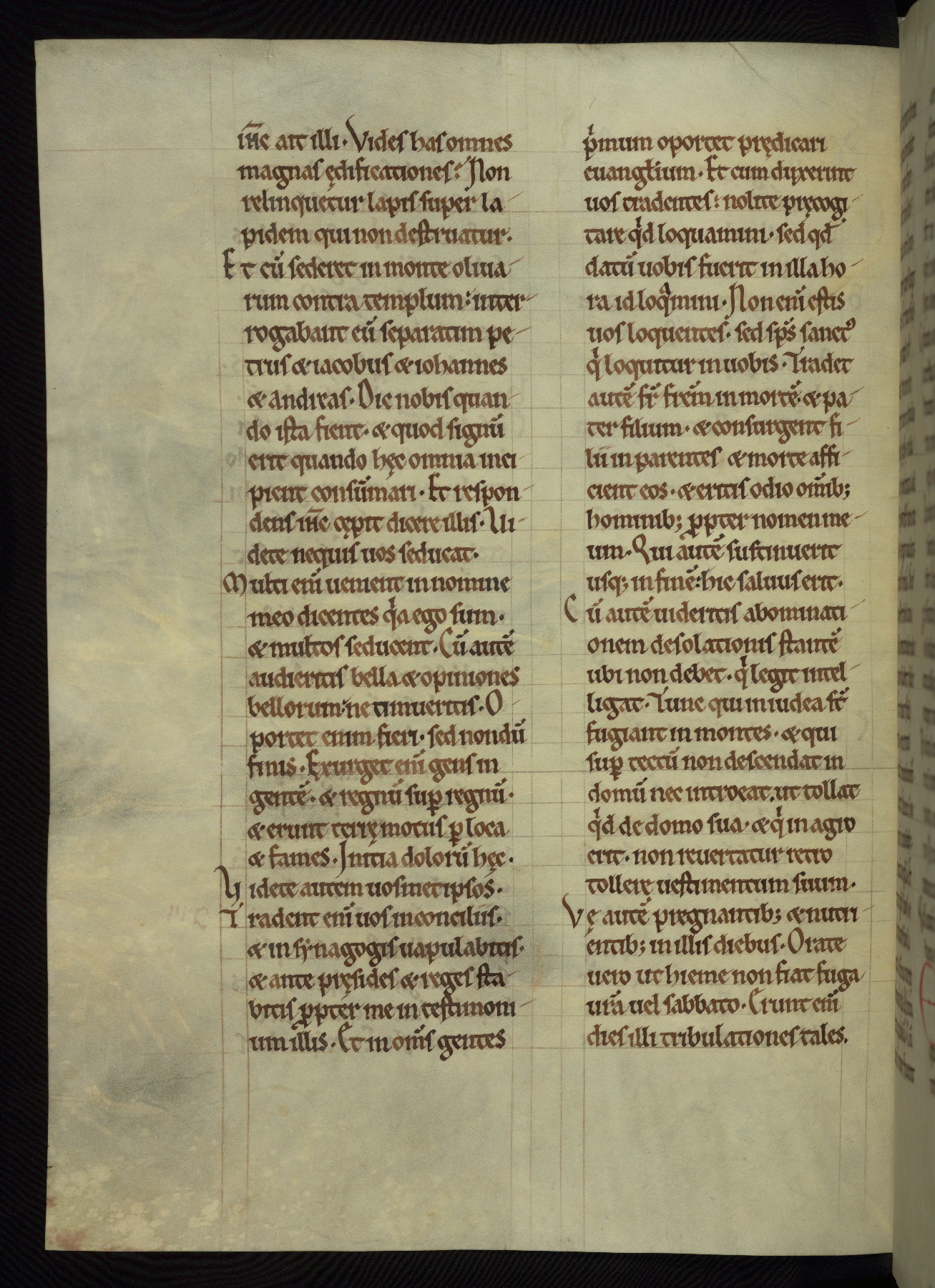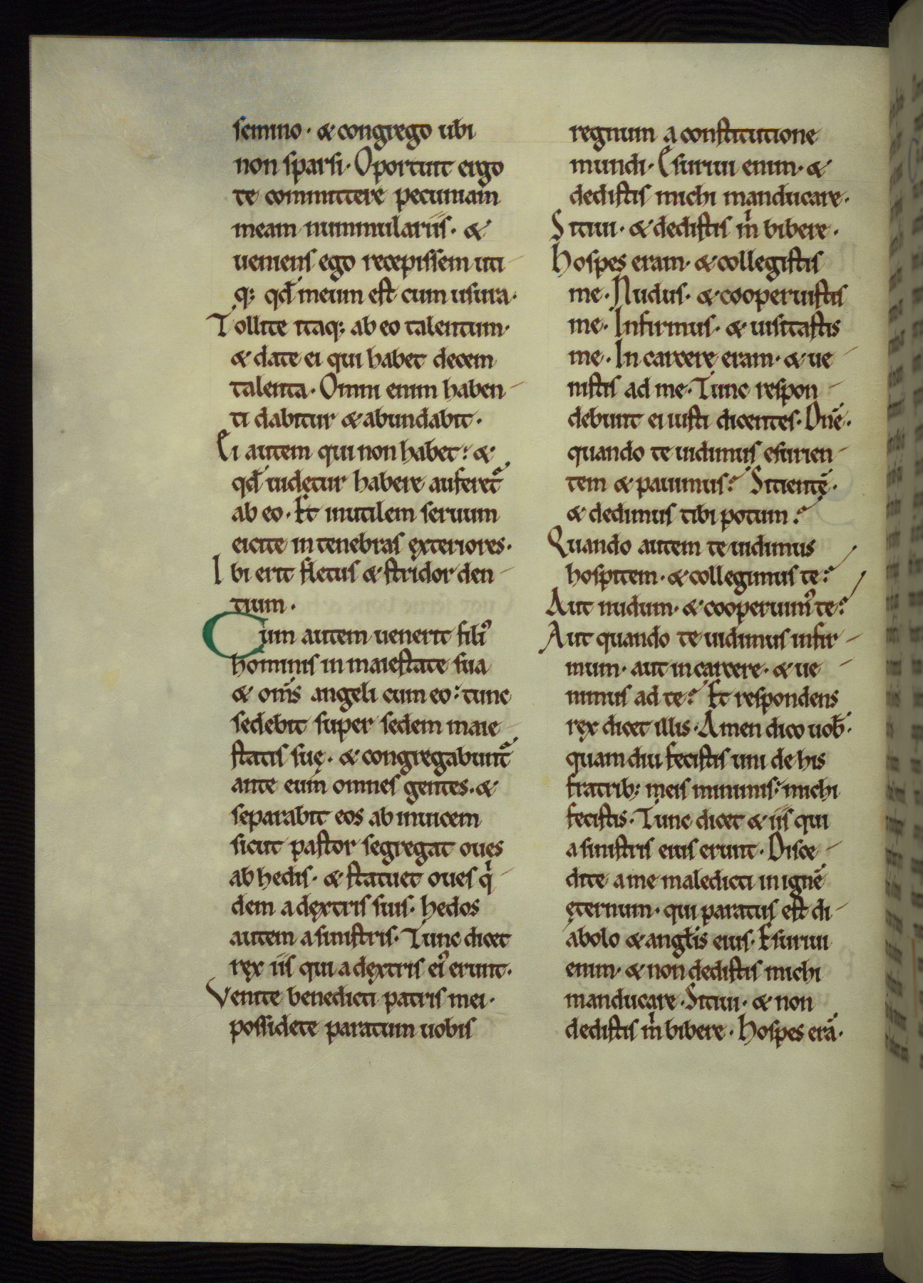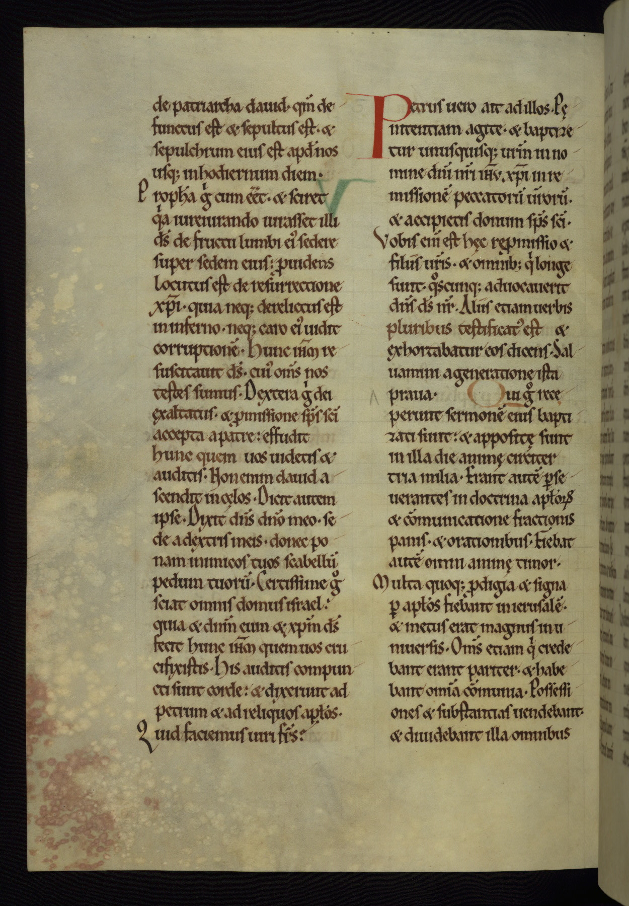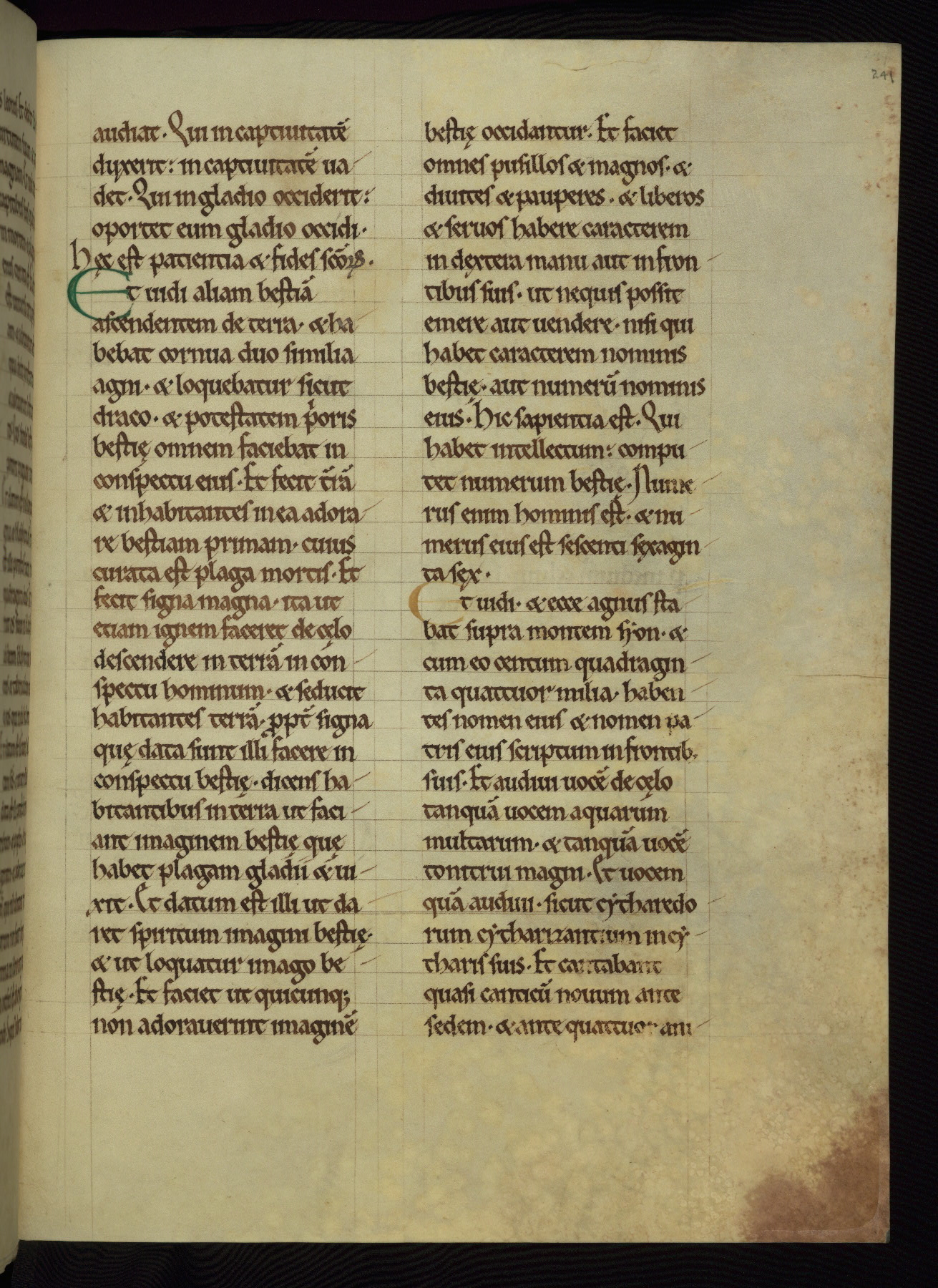 This large-format copy of the New Testament was almost certainly created at Rochester Cathedral Priory, England, in the first half of the twelfth century. It was part of a five-volume Bible, only one other volume of which, London, British Library Ms. Royal I.C.VII, has survived. The decorated initials in these manuscripts compare closely with those in other books securely attributed to Rochester. Textually these books are closely related to the Gundulph Bible (San Marino, Huntington Library Ms. HM 62), known to have been produced at Rochester in the second half of the eleventh century. Although neither the Walters' nor the British Library's volume includes an inscription associating this Bible with Rochester, the two medieval catalogs of the Rochester Cathedral library, produced around 1130 and in 1202, contain references to manuscripts that correspond well with them. The book’s large size indicates it that was designed to be read aloud, either during services or at meals in the refectory. Large, fanciful initials filled with succulent foliage, fruit, dragons, animals, and human faces begin each section of the text. Executed in a vibrant palette of red, blue, green, ochre (in place of gold), and yellow, the intricate, dynamic designs capture the essence of Romanesque manuscript illumination. Royal I.C.VII also includes four historiated initials (for the books of Joshua, I Samuel, 2 Samuel, and 2 Kings). Although the Bible was made at Rochester, the pre-Gothic script of W.18 in particular is extremely close to that practiced at nearby Canterbury at the time.