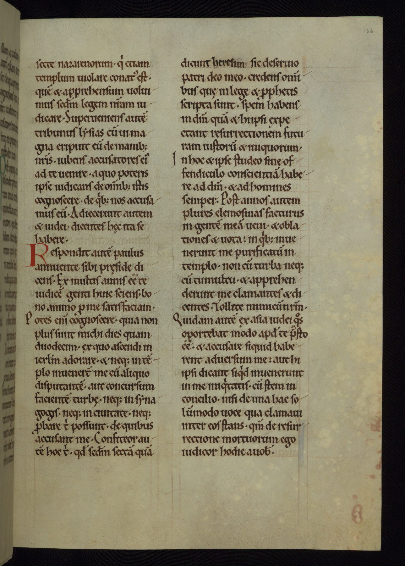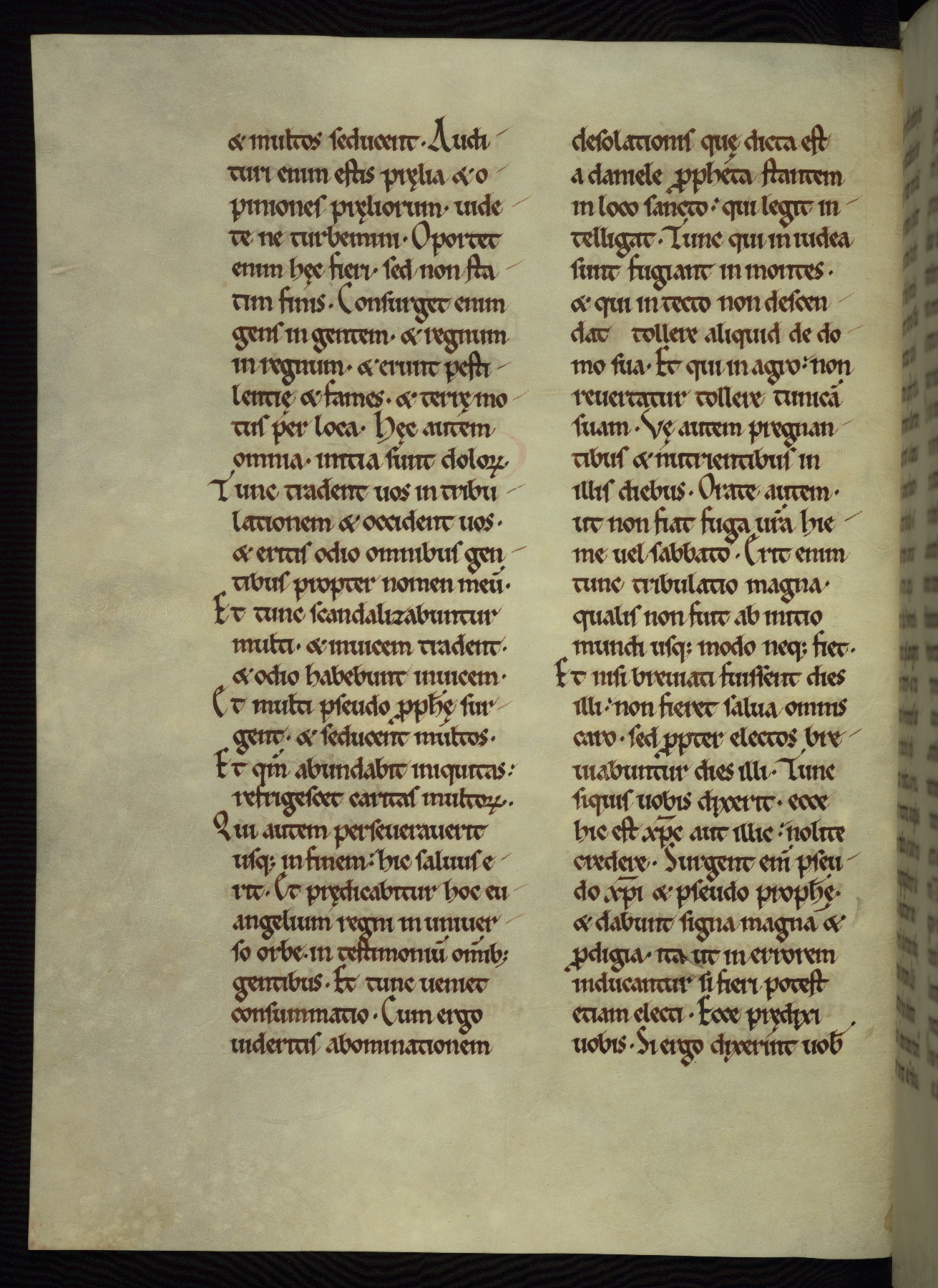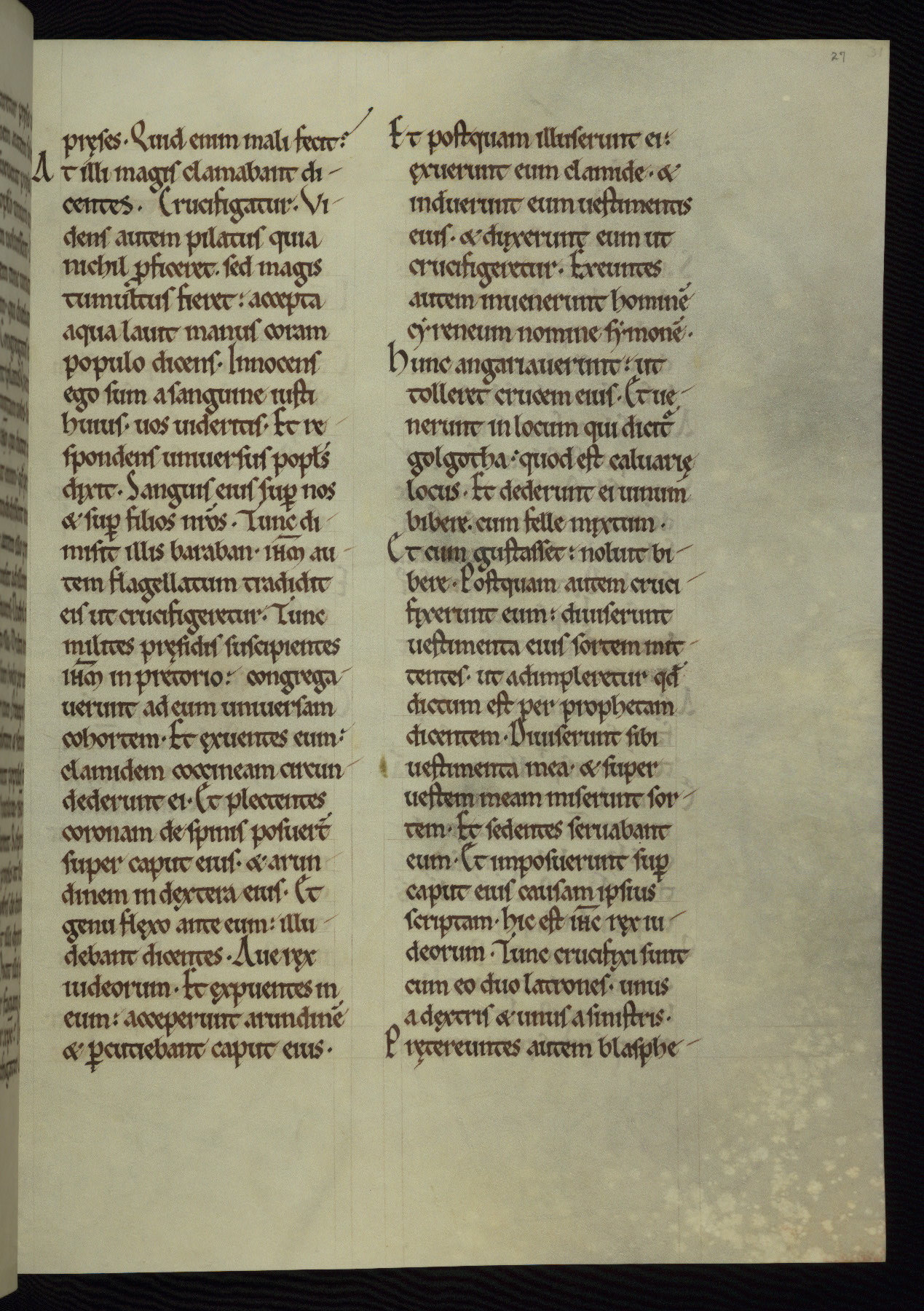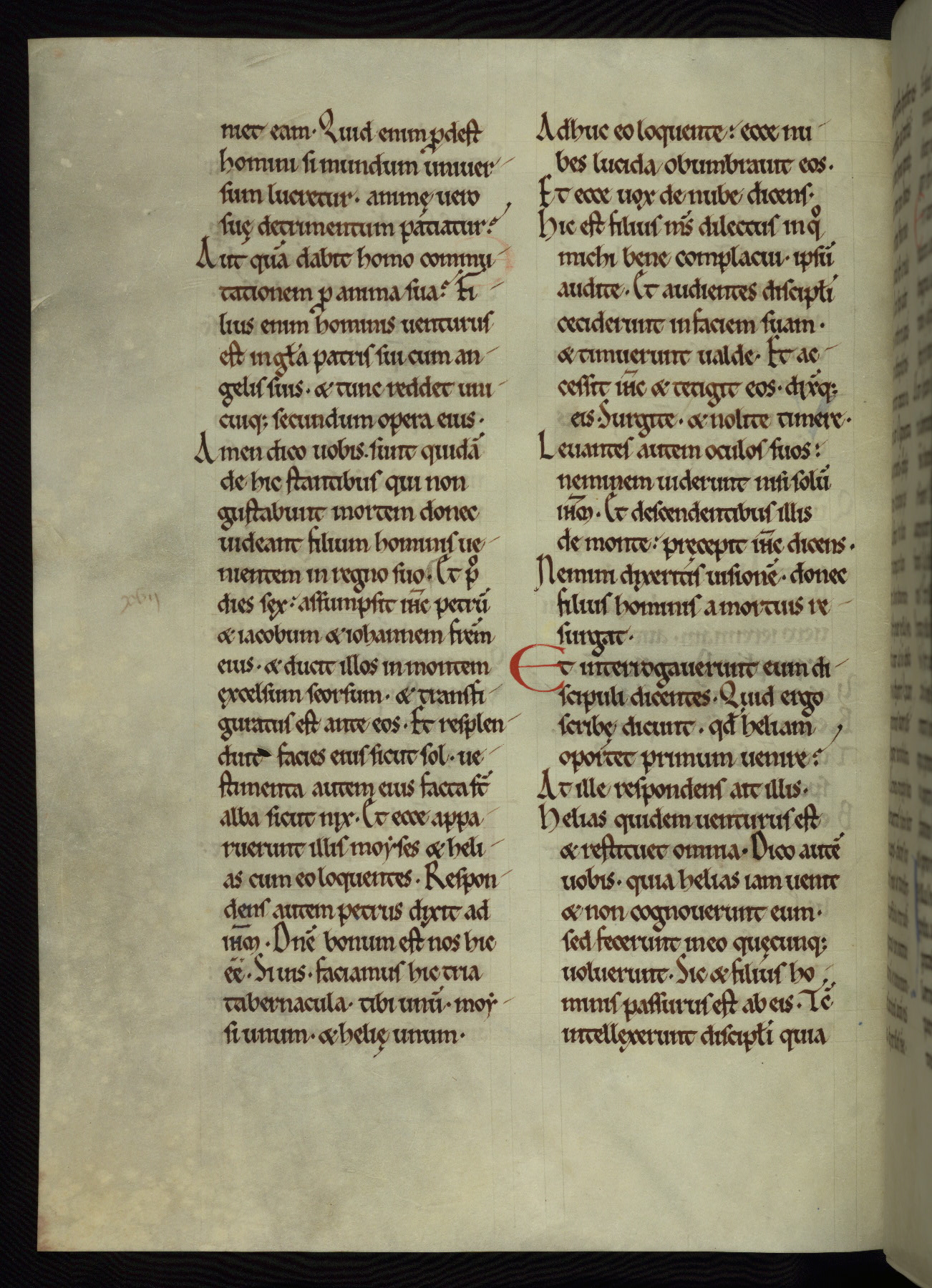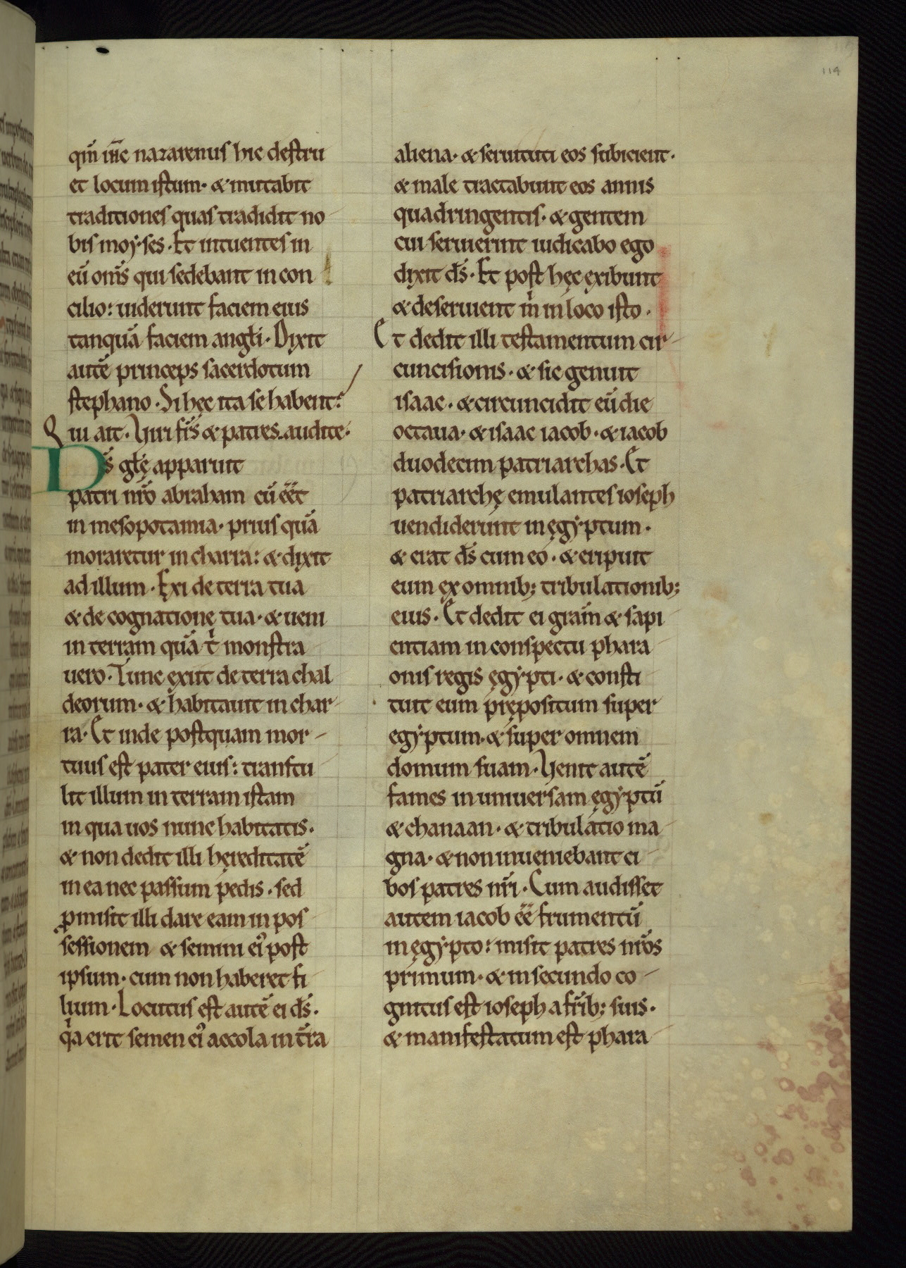 This large-format copy of the New Testament was almost certainly created at Rochester Cathedral Priory, England, in the first half of the twelfth century. It was part of a five-volume Bible, only one other volume of which, London, British Library Ms. Royal I.C.VII, has survived. The decorated initials in these manuscripts compare closely with those in other books securely attributed to Rochester. Textually these books are closely related to the Gundulph Bible (San Marino, Huntington Library Ms. HM 62), known to have been produced at Rochester in the second half of the eleventh century. Although neither the Walters' nor the British Library's volume includes an inscription associating this Bible with Rochester, the two medieval catalogs of the Rochester Cathedral library, produced around 1130 and in 1202, contain references to manuscripts that correspond well with them. The book’s large size indicates it that was designed to be read aloud, either during services or at meals in the refectory. Large, fanciful initials filled with succulent foliage, fruit, dragons, animals, and human faces begin each section of the text. Executed in a vibrant palette of red, blue, green, ochre (in place of gold), and yellow, the intricate, dynamic designs capture the essence of Romanesque manuscript illumination. Royal I.C.VII also includes four historiated initials (for the books of Joshua, I Samuel, 2 Samuel, and 2 Kings). Although the Bible was made at Rochester, the pre-Gothic script of W.18 in particular is extremely close to that practiced at nearby Canterbury at the time.