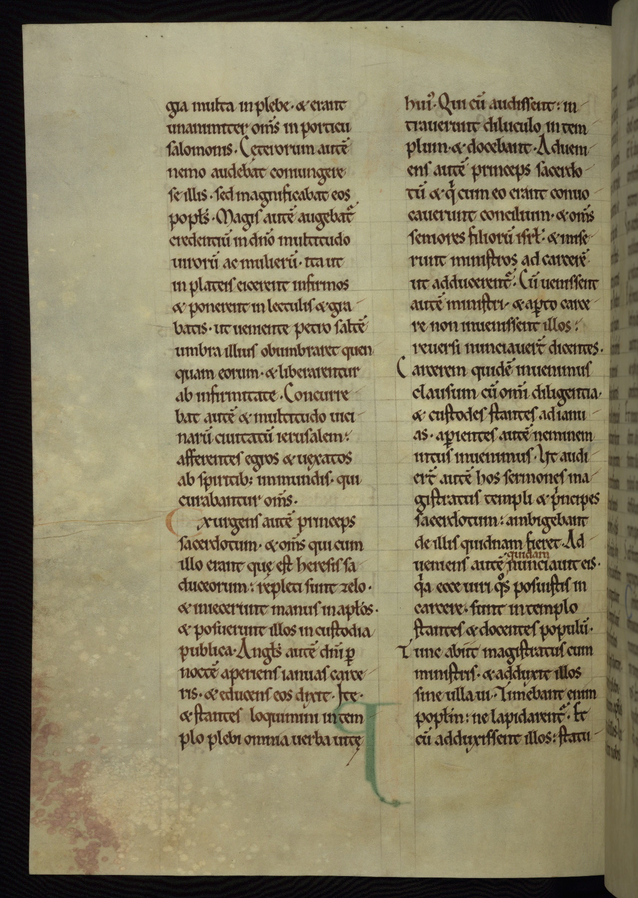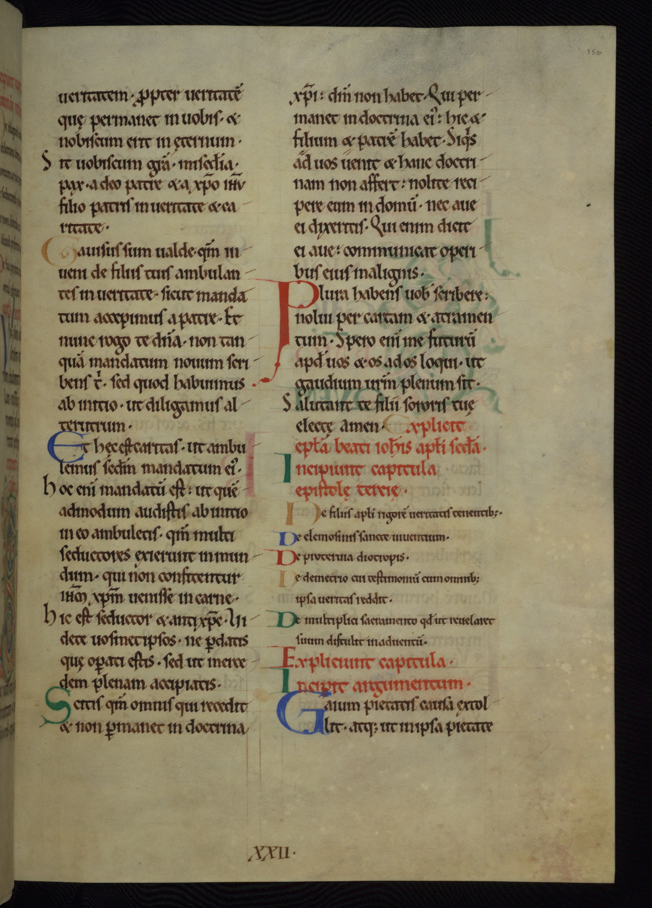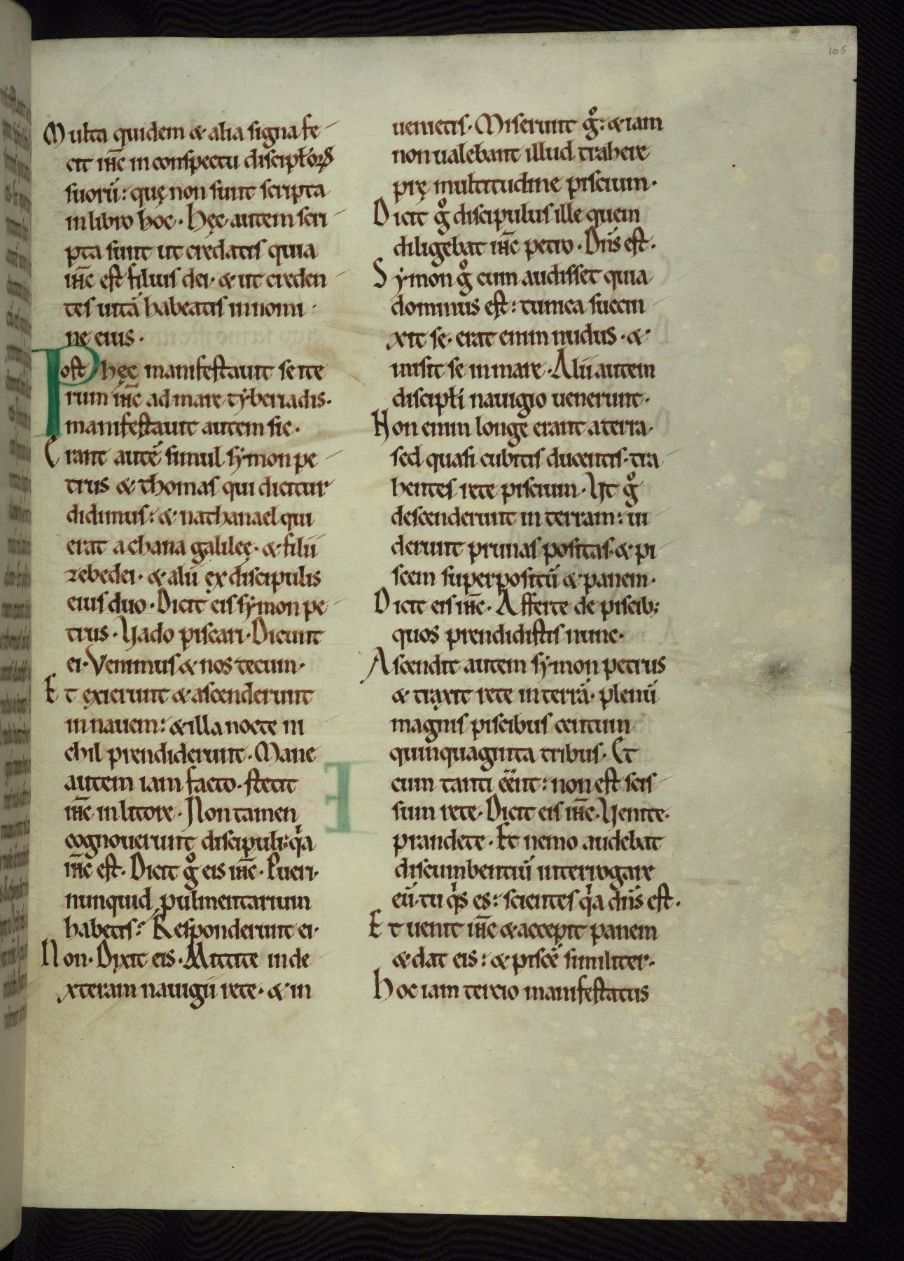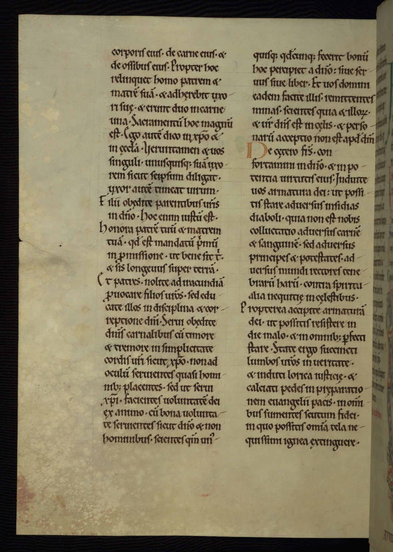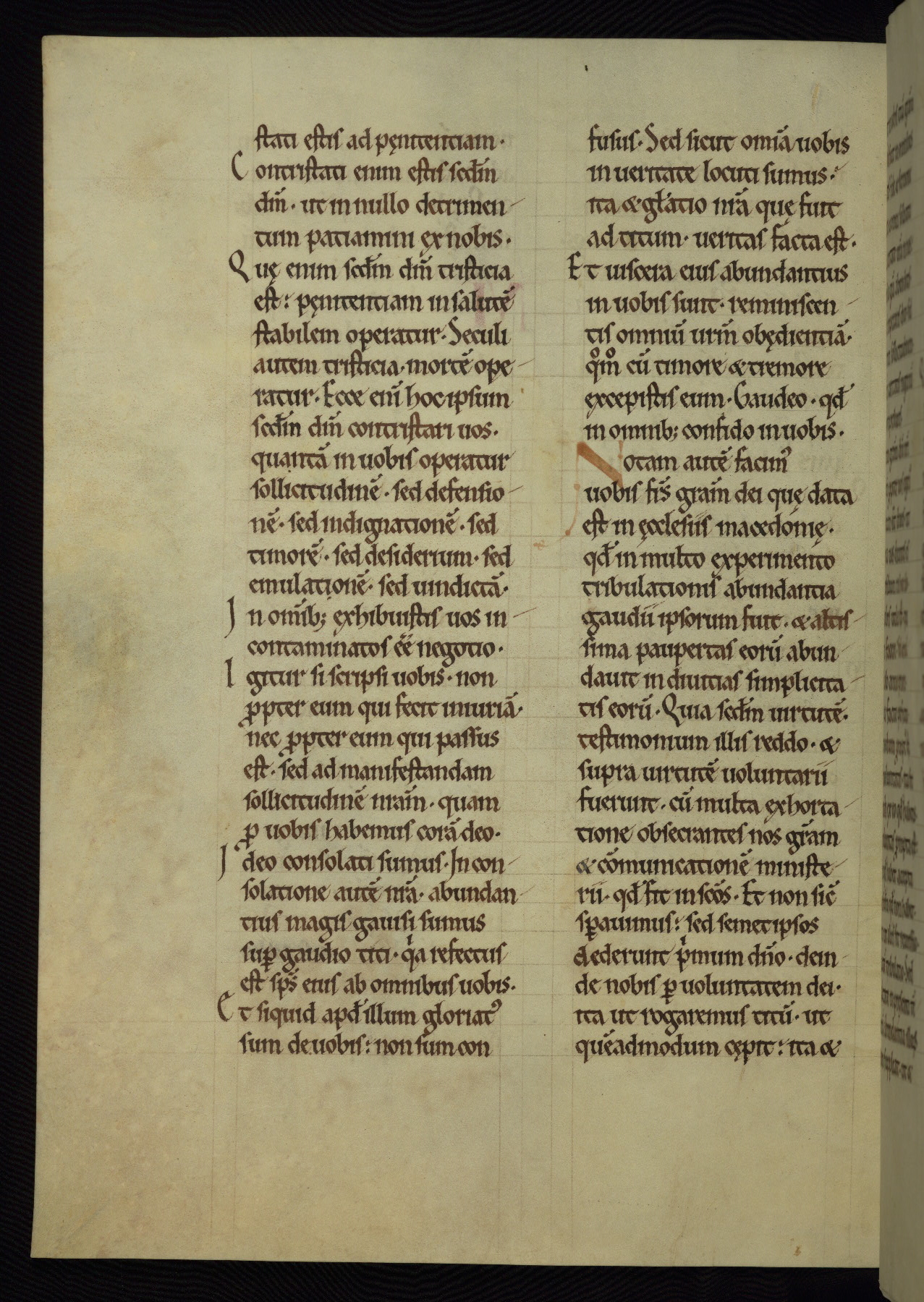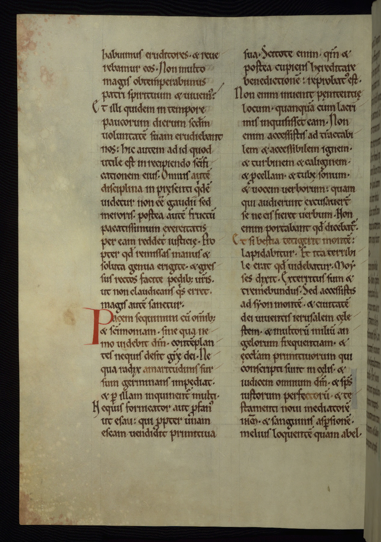This large-format copy of the New Testament was almost certainly created at Rochester Cathedral Priory, England, in the first half of the twelfth century. It was part of a five-volume Bible, only one other volume of which, London, British Library Ms. Royal I.C.VII, has survived. The decorated initials in these manuscripts compare closely with those in other books securely attributed to Rochester. Textually these books are closely related to the Gundulph Bible (San Marino, Huntington Library Ms. HM 62), known to have been produced at Rochester in the second half of the eleventh century. Although neither the Walters' nor the British Library's volume includes an inscription associating this Bible with Rochester, the two medieval catalogs of the Rochester Cathedral library, produced around 1130 and in 1202, contain references to manuscripts that correspond well with them. The book’s large size indicates it that was designed to be read aloud, either during services or at meals in the refectory. Large, fanciful initials filled with succulent foliage, fruit, dragons, animals, and human faces begin each section of the text. Executed in a vibrant palette of red, blue, green, ochre (in place of gold), and yellow, the intricate, dynamic designs capture the essence of Romanesque manuscript illumination. Royal I.C.VII also includes four historiated initials (for the books of Joshua, I Samuel, 2 Samuel, and 2 Kings). Although the Bible was made at Rochester, the pre-Gothic script of W.18 in particular is extremely close to that practiced at nearby Canterbury at the time.