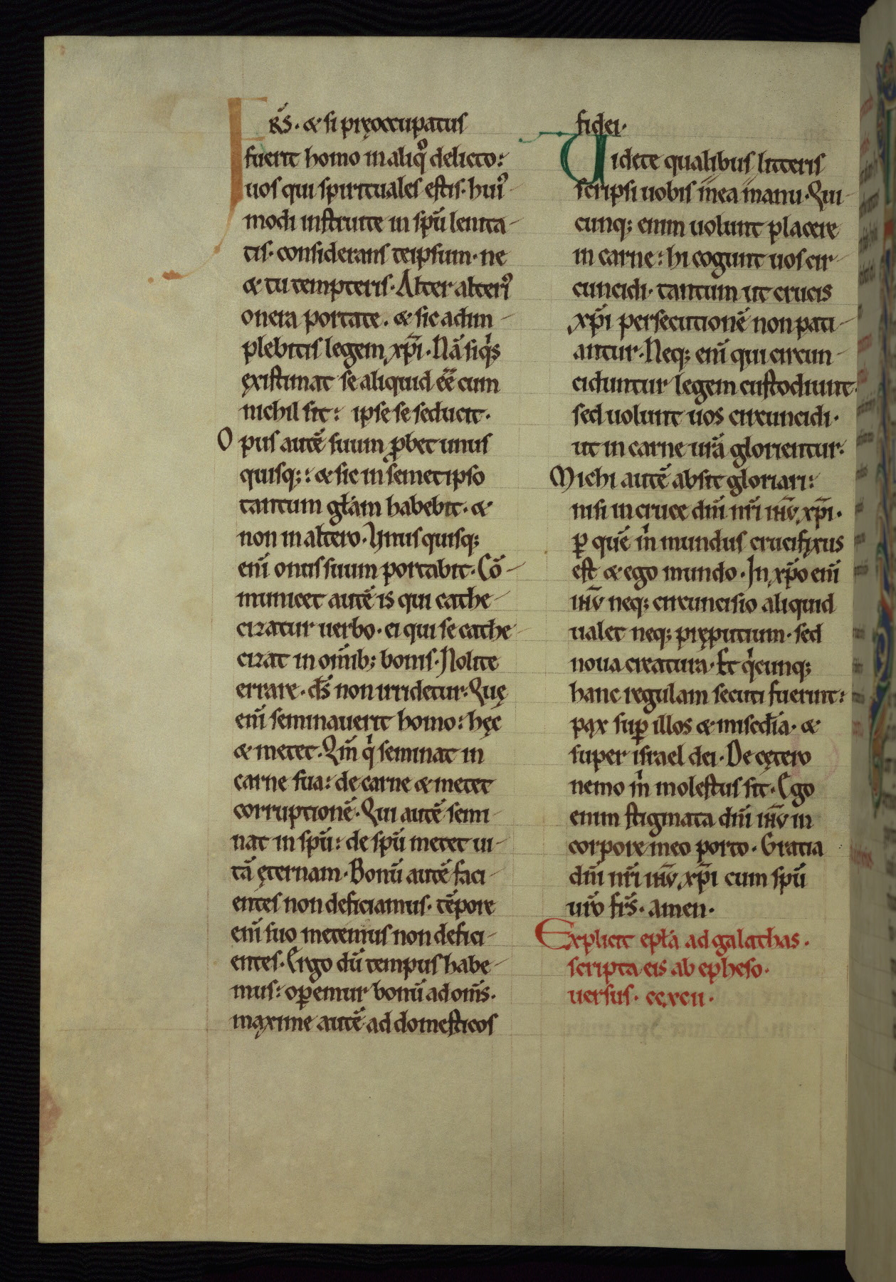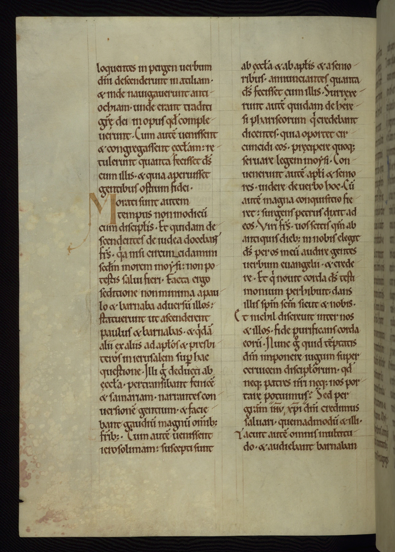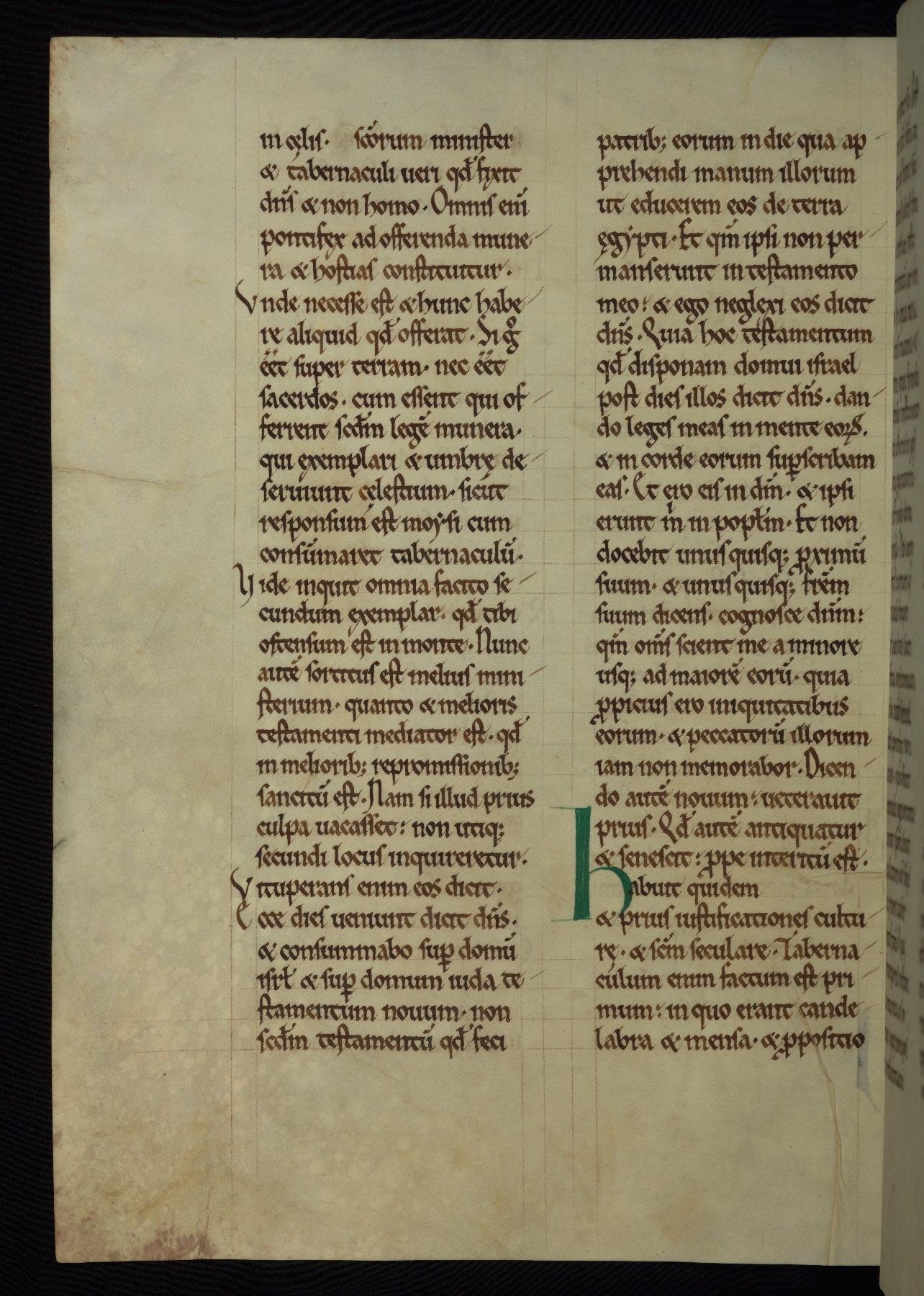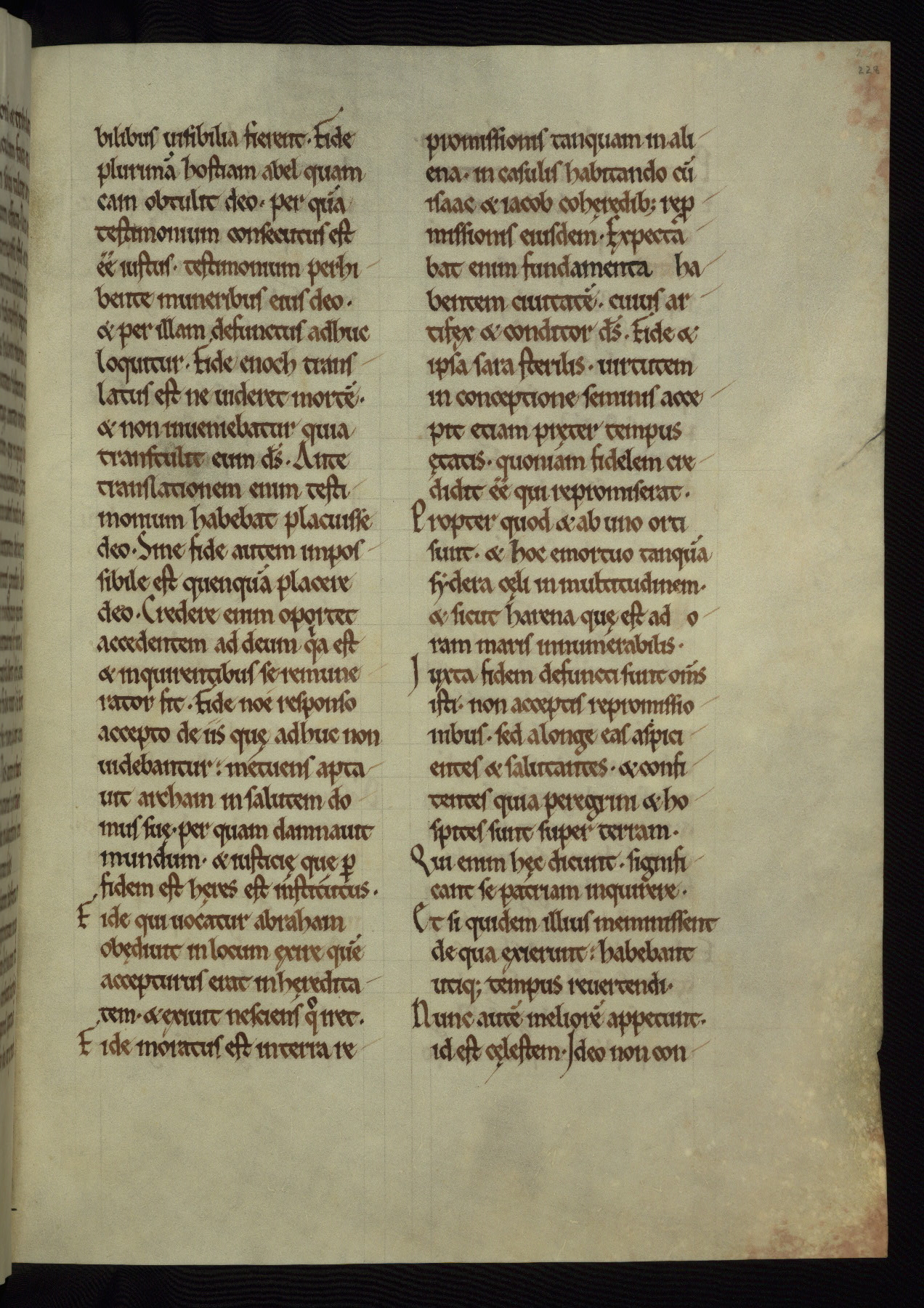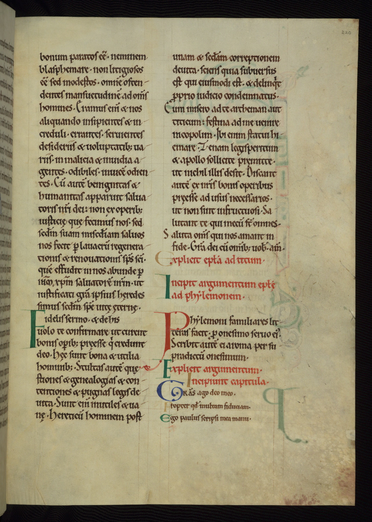 This large-format copy of the New Testament was almost certainly created at Rochester Cathedral Priory, England, in the first half of the twelfth century. It was part of a five-volume Bible, only one other volume of which, London, British Library Ms. Royal I.C.VII, has survived. The decorated initials in these manuscripts compare closely with those in other books securely attributed to Rochester. Textually these books are closely related to the Gundulph Bible (San Marino, Huntington Library Ms. HM 62), known to have been produced at Rochester in the second half of the eleventh century. Although neither the Walters' nor the British Library's volume includes an inscription associating this Bible with Rochester, the two medieval catalogs of the Rochester Cathedral library, produced around 1130 and in 1202, contain references to manuscripts that correspond well with them. The book’s large size indicates it that was designed to be read aloud, either during services or at meals in the refectory. Large, fanciful initials filled with succulent foliage, fruit, dragons, animals, and human faces begin each section of the text. Executed in a vibrant palette of red, blue, green, ochre (in place of gold), and yellow, the intricate, dynamic designs capture the essence of Romanesque manuscript illumination. Royal I.C.VII also includes four historiated initials (for the books of Joshua, I Samuel, 2 Samuel, and 2 Kings). Although the Bible was made at Rochester, the pre-Gothic script of W.18 in particular is extremely close to that practiced at nearby Canterbury at the time.