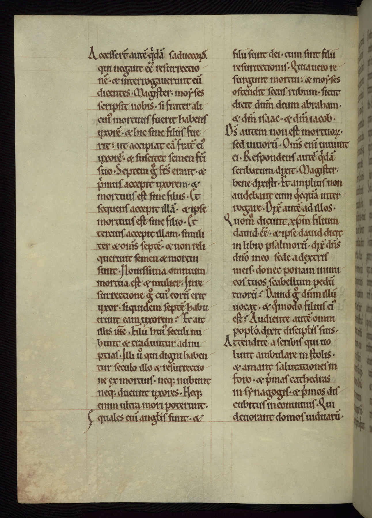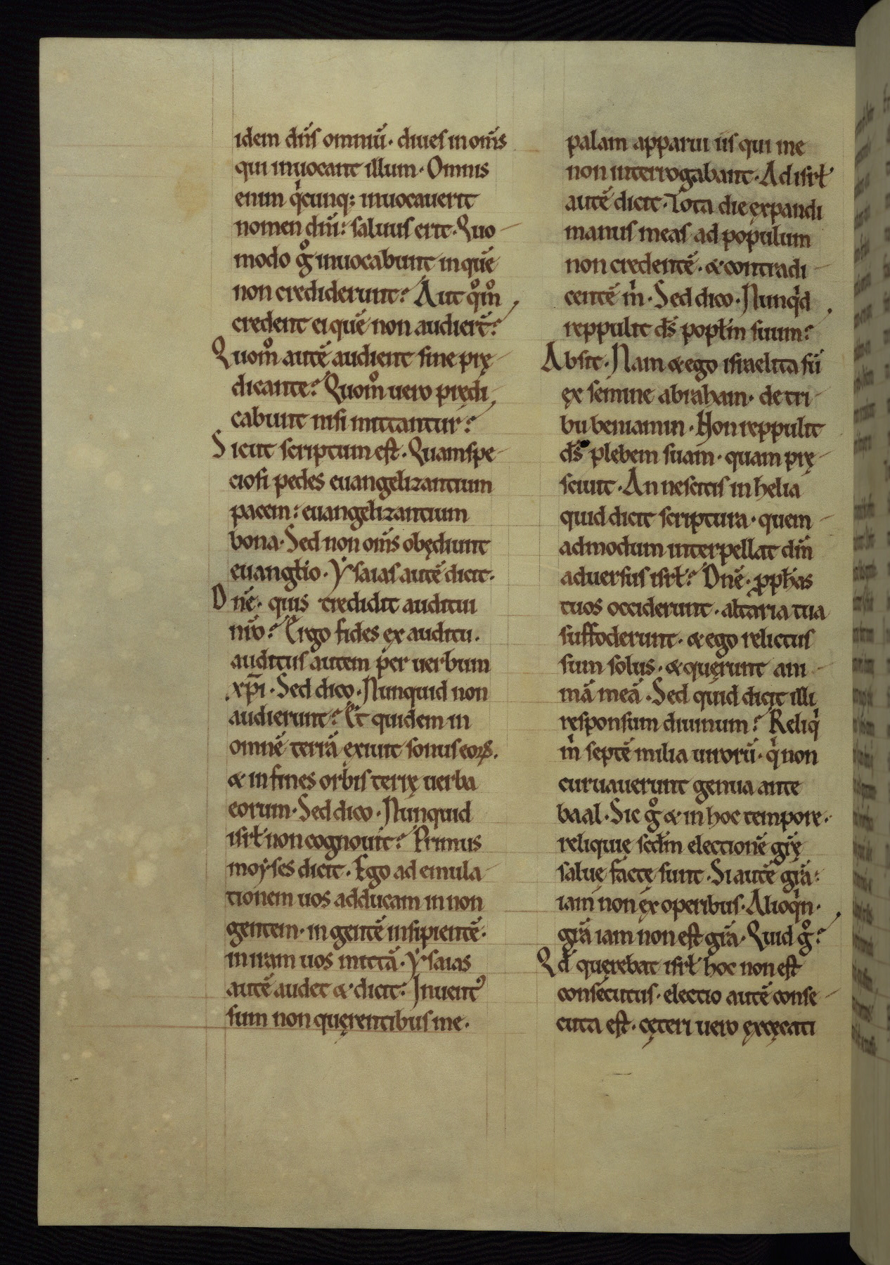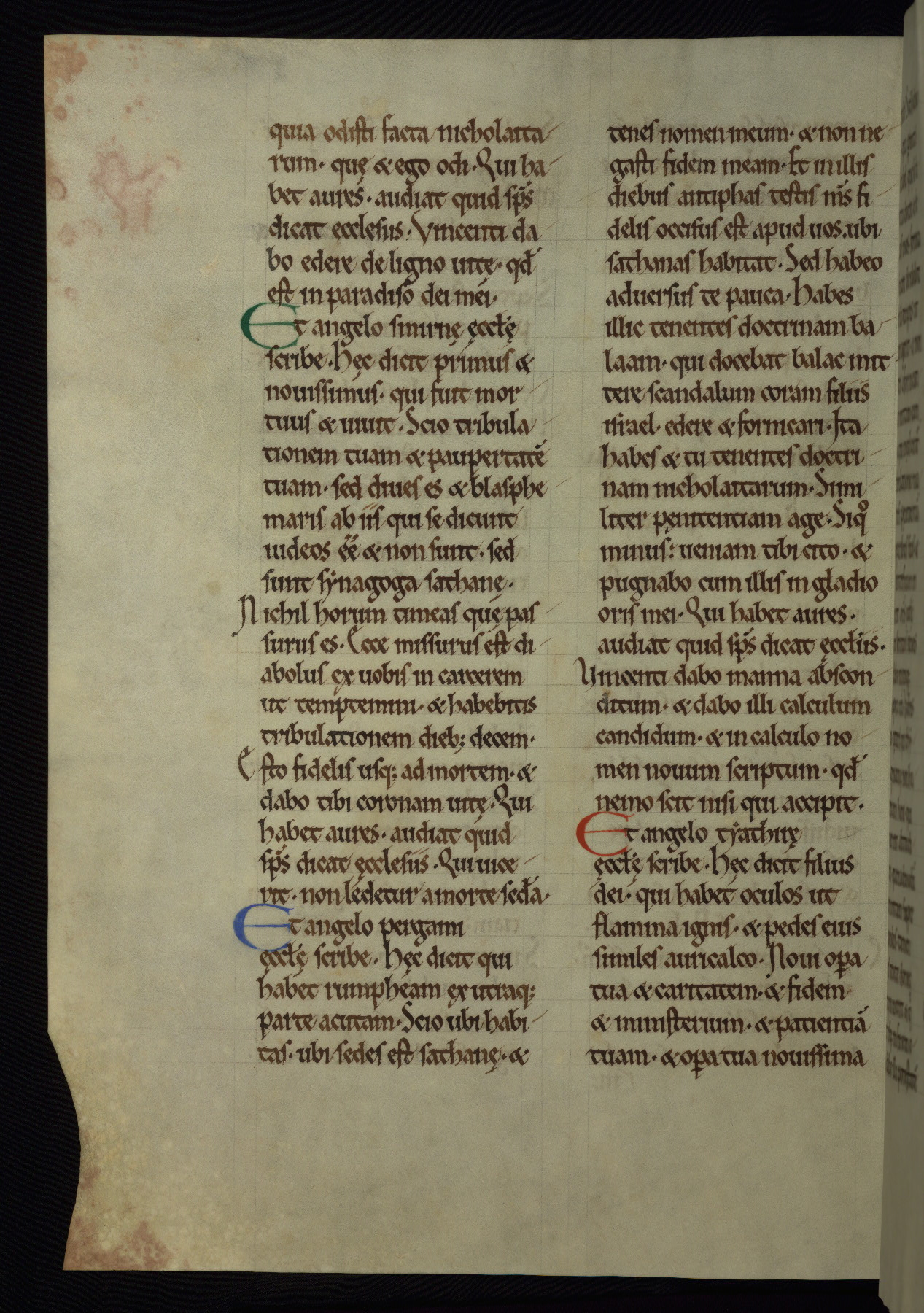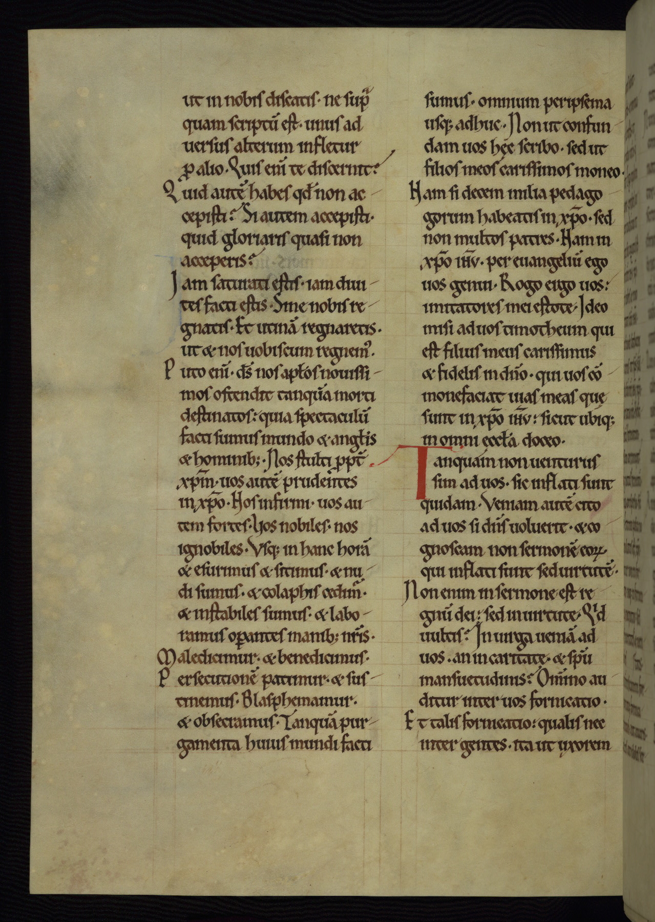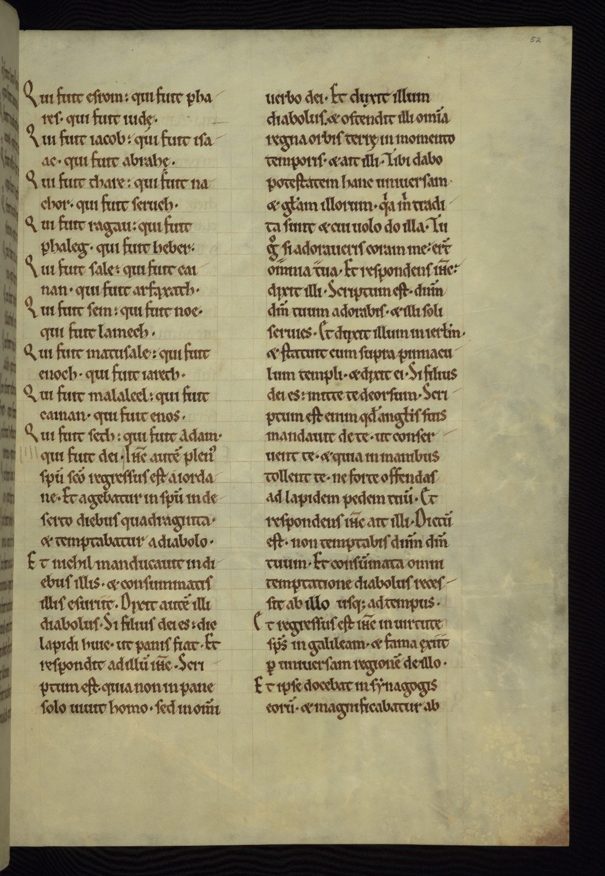 This large-format copy of the New Testament was almost certainly created at Rochester Cathedral Priory, England, in the first half of the twelfth century. It was part of a five-volume Bible, only one other volume of which, London, British Library Ms. Royal I.C.VII, has survived. The decorated initials in these manuscripts compare closely with those in other books securely attributed to Rochester. Textually these books are closely related to the Gundulph Bible (San Marino, Huntington Library Ms. HM 62), known to have been produced at Rochester in the second half of the eleventh century. Although neither the Walters' nor the British Library's volume includes an inscription associating this Bible with Rochester, the two medieval catalogs of the Rochester Cathedral library, produced around 1130 and in 1202, contain references to manuscripts that correspond well with them. The book’s large size indicates it that was designed to be read aloud, either during services or at meals in the refectory. Large, fanciful initials filled with succulent foliage, fruit, dragons, animals, and human faces begin each section of the text. Executed in a vibrant palette of red, blue, green, ochre (in place of gold), and yellow, the intricate, dynamic designs capture the essence of Romanesque manuscript illumination. Royal I.C.VII also includes four historiated initials (for the books of Joshua, I Samuel, 2 Samuel, and 2 Kings). Although the Bible was made at Rochester, the pre-Gothic script of W.18 in particular is extremely close to that practiced at nearby Canterbury at the time.