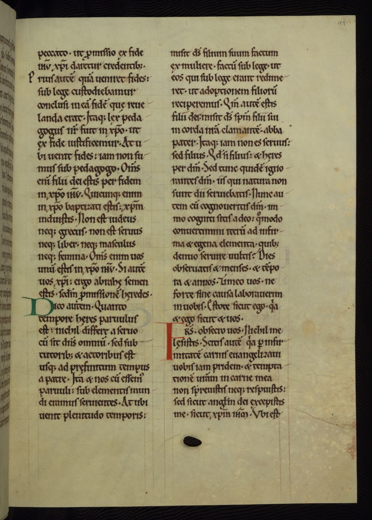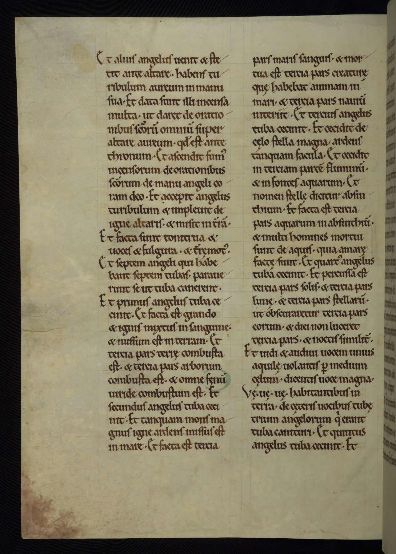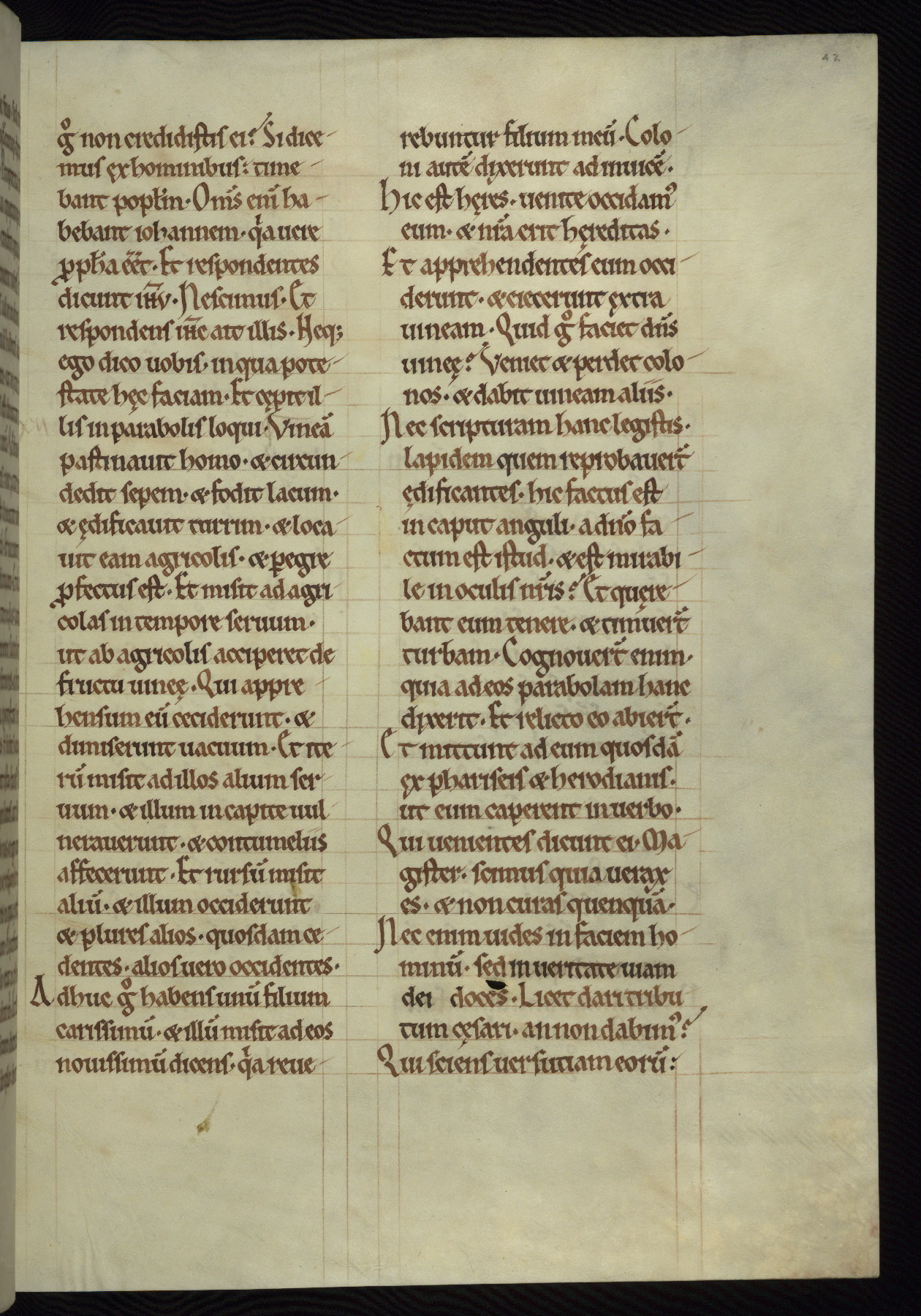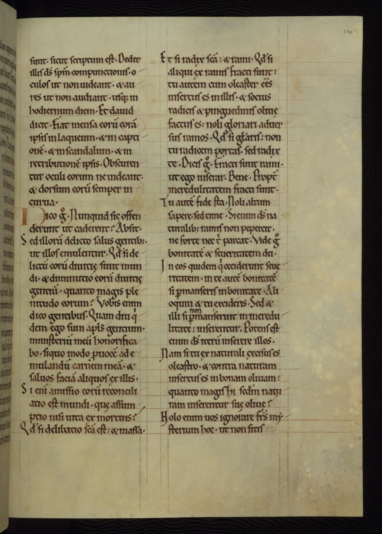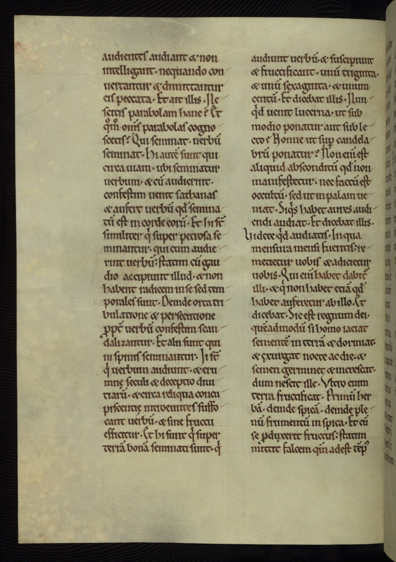 This large-format copy of the New Testament was almost certainly created at Rochester Cathedral Priory, England, in the first half of the twelfth century. It was part of a five-volume Bible, only one other volume of which, London, British Library Ms. Royal I.C.VII, has survived. The decorated initials in these manuscripts compare closely with those in other books securely attributed to Rochester. Textually these books are closely related to the Gundulph Bible (San Marino, Huntington Library Ms. HM 62), known to have been produced at Rochester in the second half of the eleventh century. Although neither the Walters' nor the British Library's volume includes an inscription associating this Bible with Rochester, the two medieval catalogs of the Rochester Cathedral library, produced around 1130 and in 1202, contain references to manuscripts that correspond well with them. The book’s large size indicates it that was designed to be read aloud, either during services or at meals in the refectory. Large, fanciful initials filled with succulent foliage, fruit, dragons, animals, and human faces begin each section of the text. Executed in a vibrant palette of red, blue, green, ochre (in place of gold), and yellow, the intricate, dynamic designs capture the essence of Romanesque manuscript illumination. Royal I.C.VII also includes four historiated initials (for the books of Joshua, I Samuel, 2 Samuel, and 2 Kings). Although the Bible was made at Rochester, the pre-Gothic script of W.18 in particular is extremely close to that practiced at nearby Canterbury at the time.