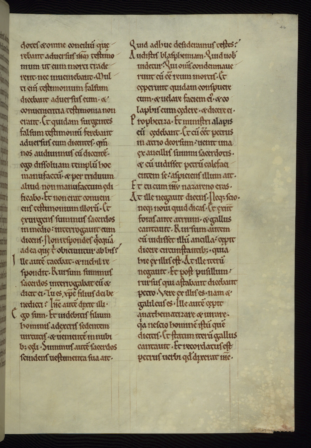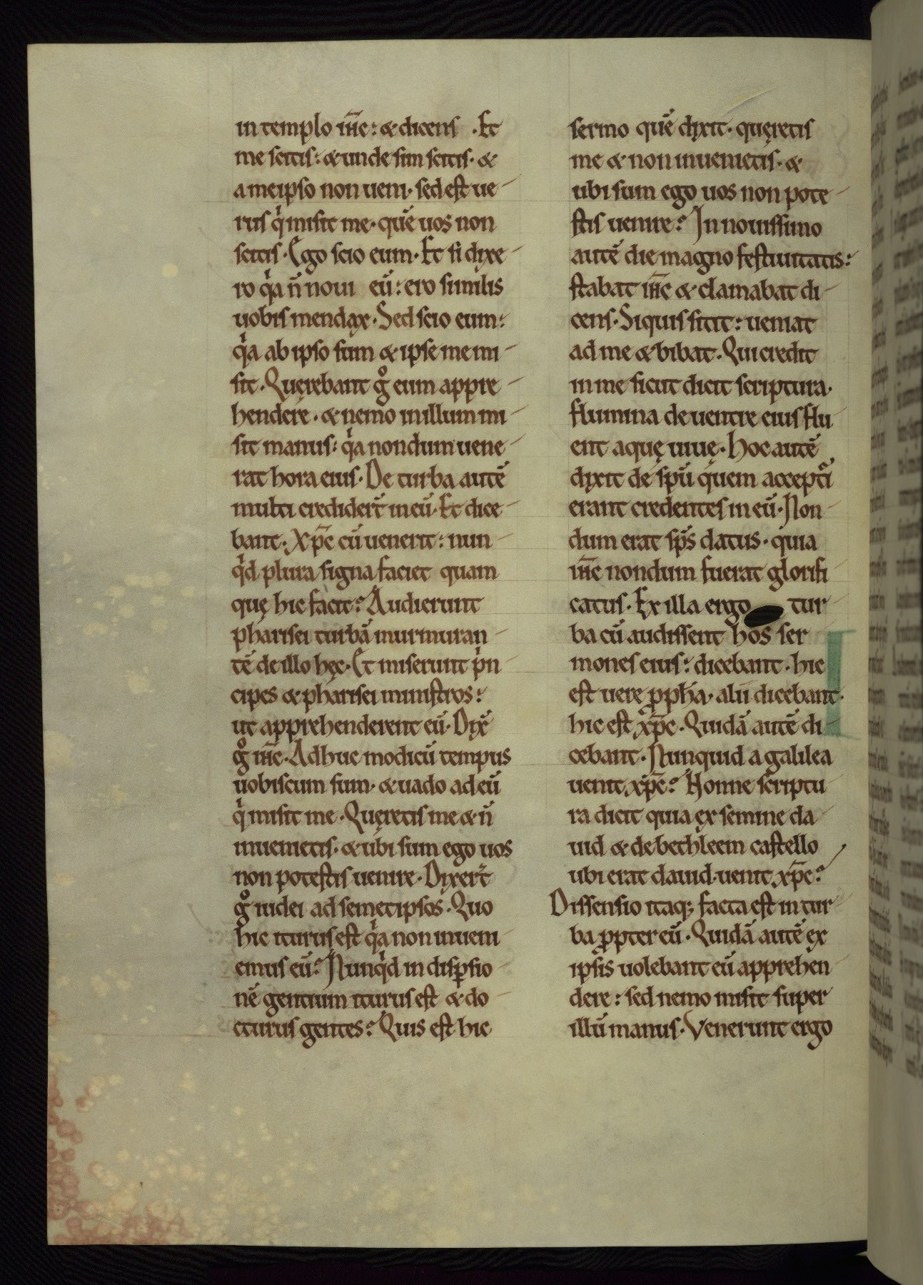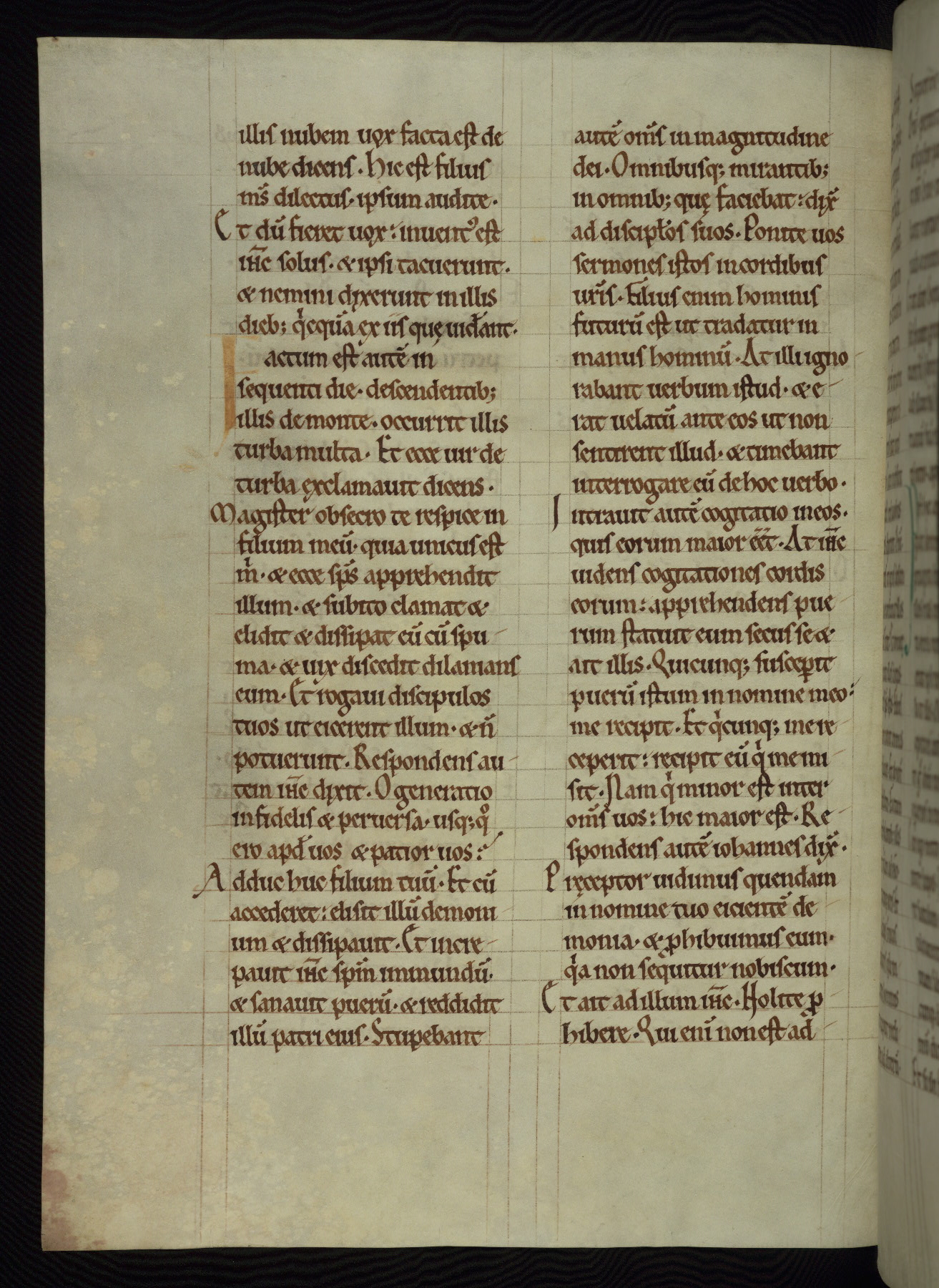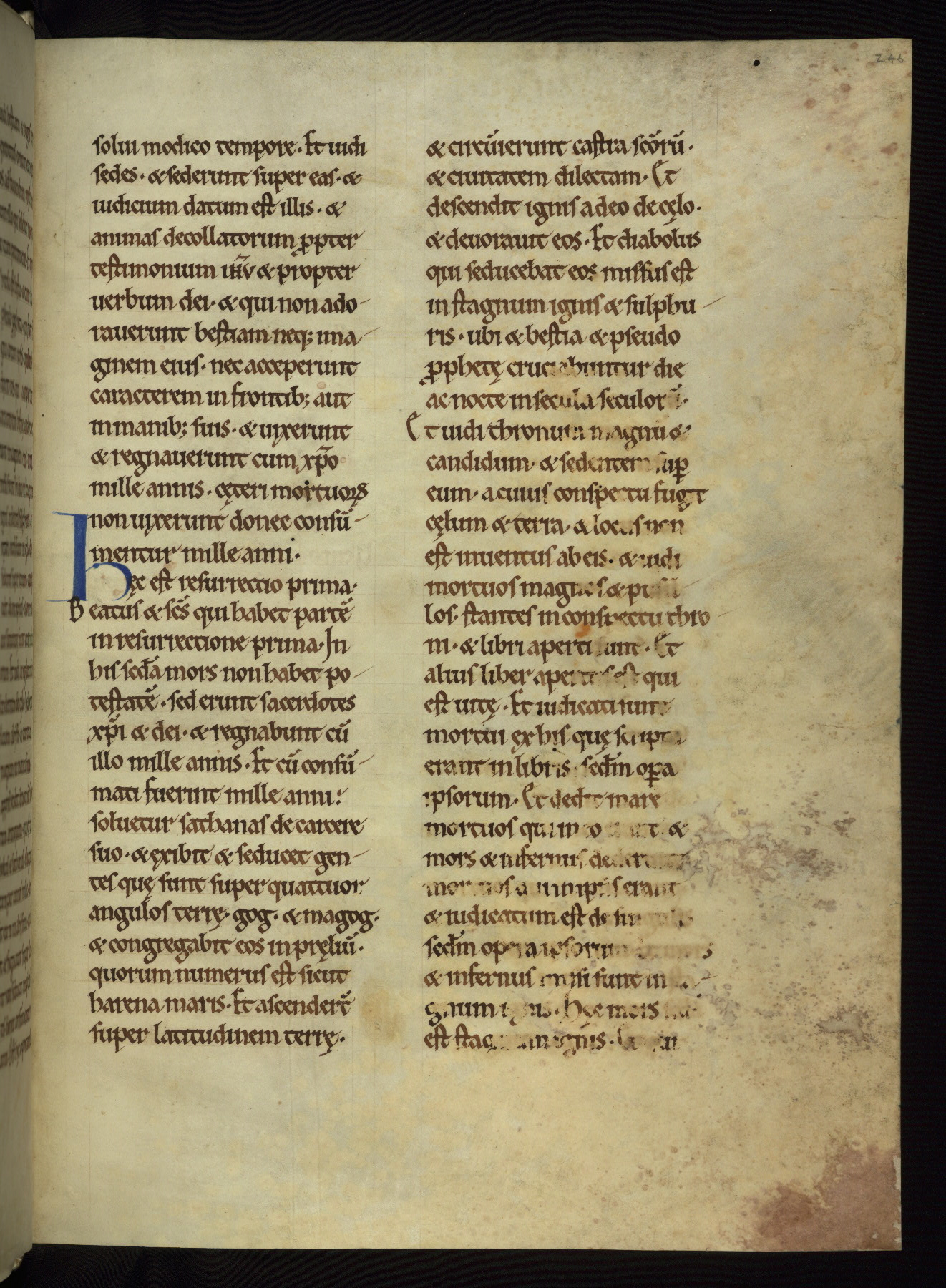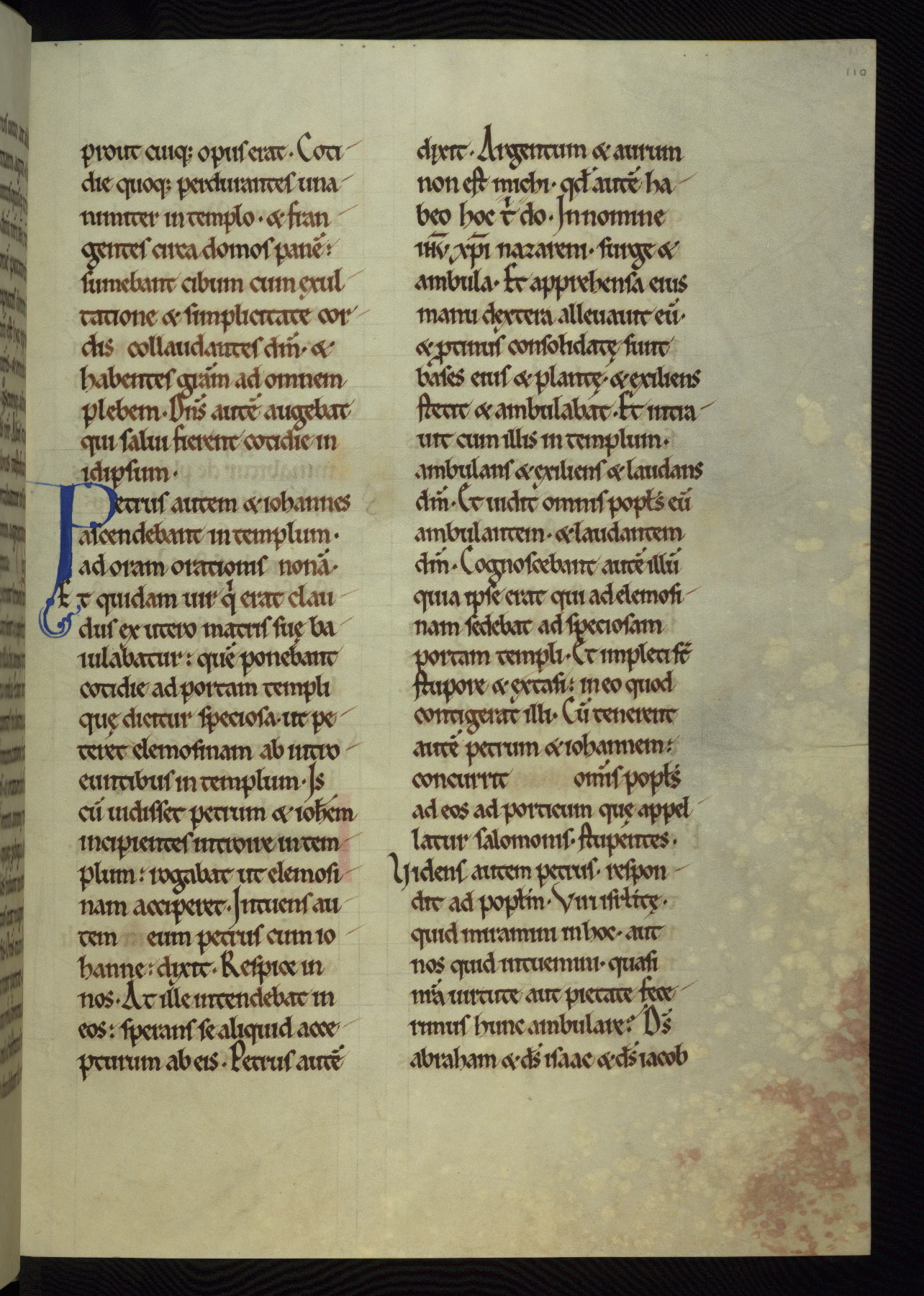 This large-format copy of the New Testament was almost certainly created at Rochester Cathedral Priory, England, in the first half of the twelfth century. It was part of a five-volume Bible, only one other volume of which, London, British Library Ms. Royal I.C.VII, has survived. The decorated initials in these manuscripts compare closely with those in other books securely attributed to Rochester. Textually these books are closely related to the Gundulph Bible (San Marino, Huntington Library Ms. HM 62), known to have been produced at Rochester in the second half of the eleventh century. Although neither the Walters' nor the British Library's volume includes an inscription associating this Bible with Rochester, the two medieval catalogs of the Rochester Cathedral library, produced around 1130 and in 1202, contain references to manuscripts that correspond well with them. The book’s large size indicates it that was designed to be read aloud, either during services or at meals in the refectory. Large, fanciful initials filled with succulent foliage, fruit, dragons, animals, and human faces begin each section of the text. Executed in a vibrant palette of red, blue, green, ochre (in place of gold), and yellow, the intricate, dynamic designs capture the essence of Romanesque manuscript illumination. Royal I.C.VII also includes four historiated initials (for the books of Joshua, I Samuel, 2 Samuel, and 2 Kings). Although the Bible was made at Rochester, the pre-Gothic script of W.18 in particular is extremely close to that practiced at nearby Canterbury at the time.