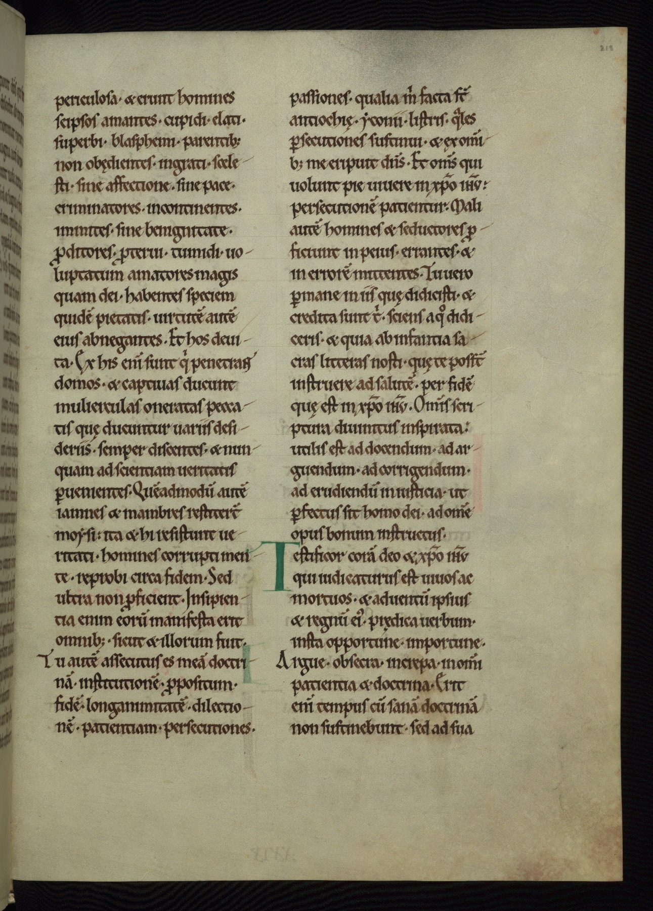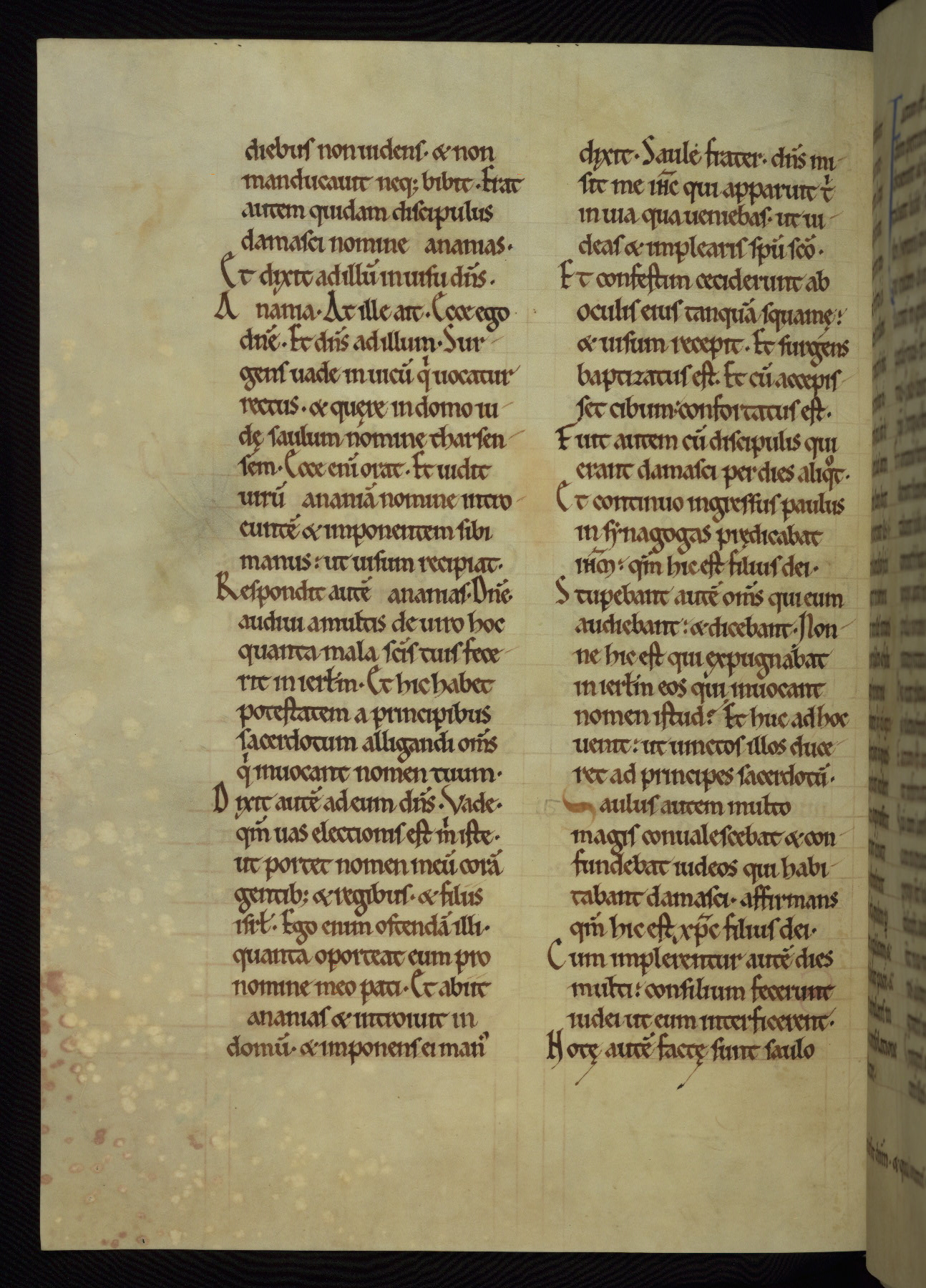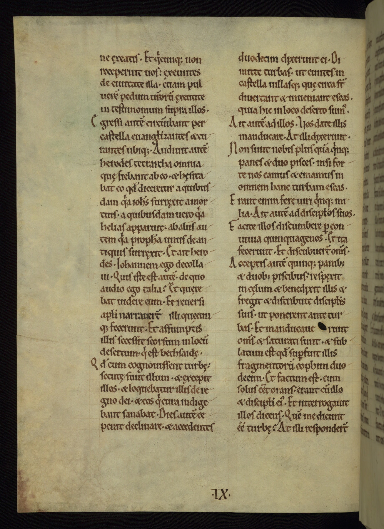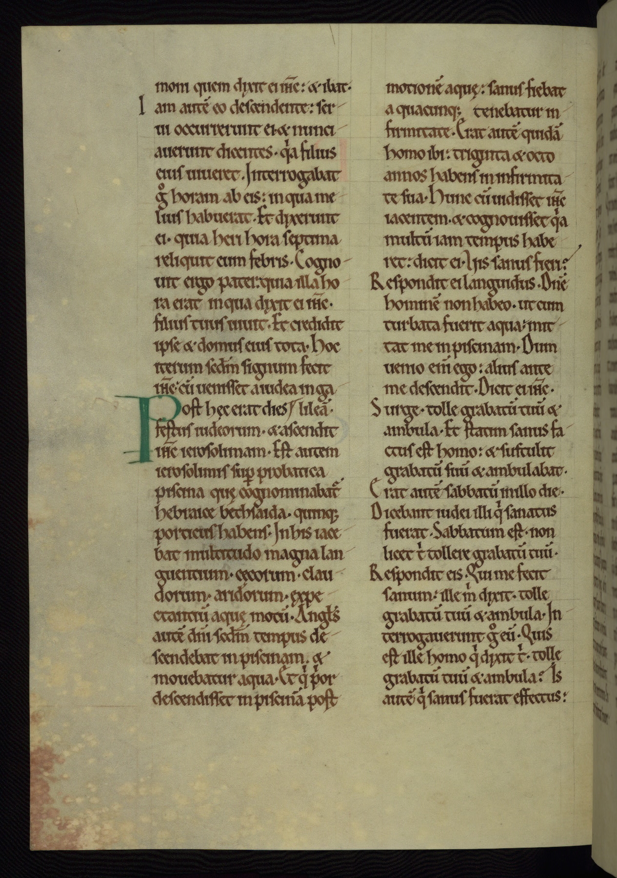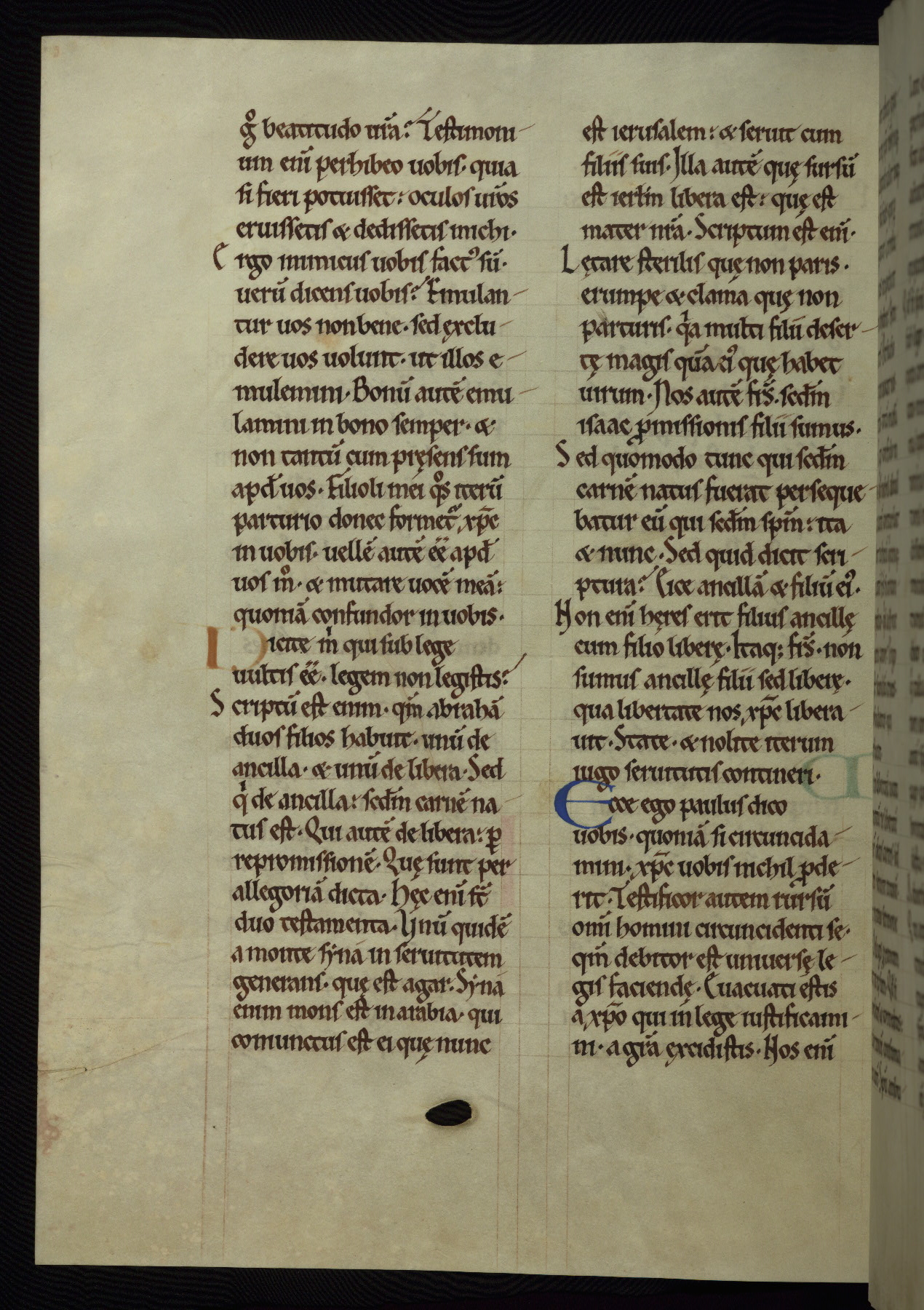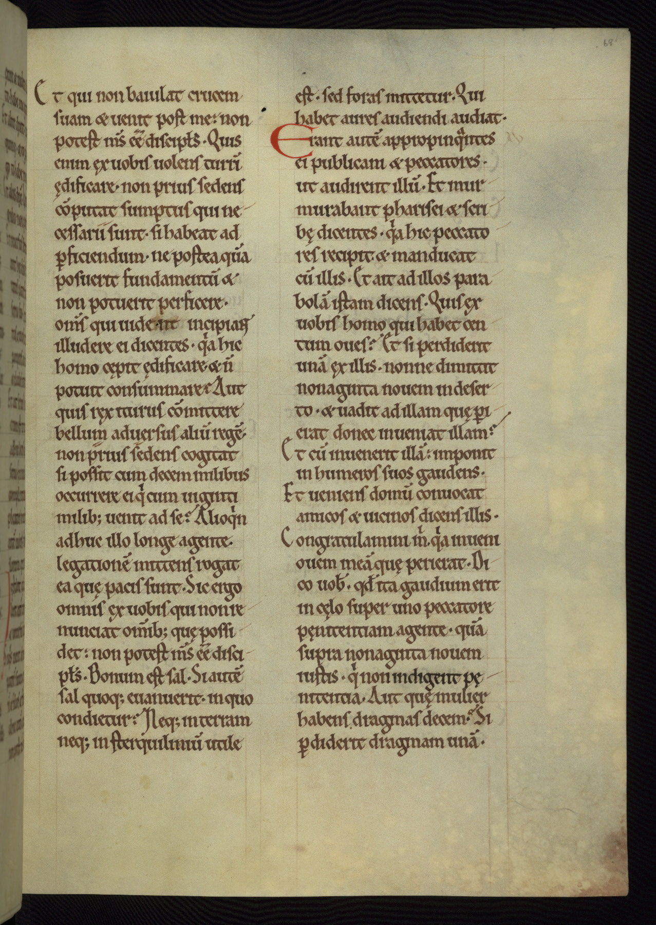 This large-format copy of the New Testament was almost certainly created at Rochester Cathedral Priory, England, in the first half of the twelfth century. It was part of a five-volume Bible, only one other volume of which, London, British Library Ms. Royal I.C.VII, has survived. The decorated initials in these manuscripts compare closely with those in other books securely attributed to Rochester. Textually these books are closely related to the Gundulph Bible (San Marino, Huntington Library Ms. HM 62), known to have been produced at Rochester in the second half of the eleventh century. Although neither the Walters' nor the British Library's volume includes an inscription associating this Bible with Rochester, the two medieval catalogs of the Rochester Cathedral library, produced around 1130 and in 1202, contain references to manuscripts that correspond well with them. The book’s large size indicates it that was designed to be read aloud, either during services or at meals in the refectory. Large, fanciful initials filled with succulent foliage, fruit, dragons, animals, and human faces begin each section of the text. Executed in a vibrant palette of red, blue, green, ochre (in place of gold), and yellow, the intricate, dynamic designs capture the essence of Romanesque manuscript illumination. Royal I.C.VII also includes four historiated initials (for the books of Joshua, I Samuel, 2 Samuel, and 2 Kings). Although the Bible was made at Rochester, the pre-Gothic script of W.18 in particular is extremely close to that practiced at nearby Canterbury at the time.