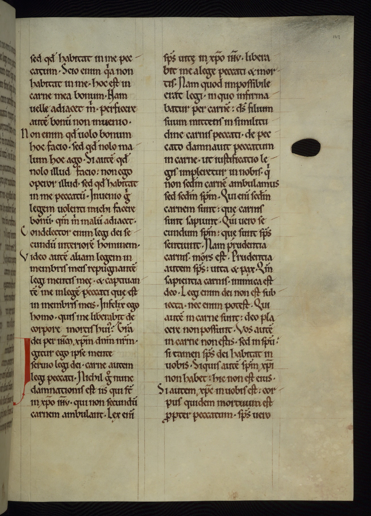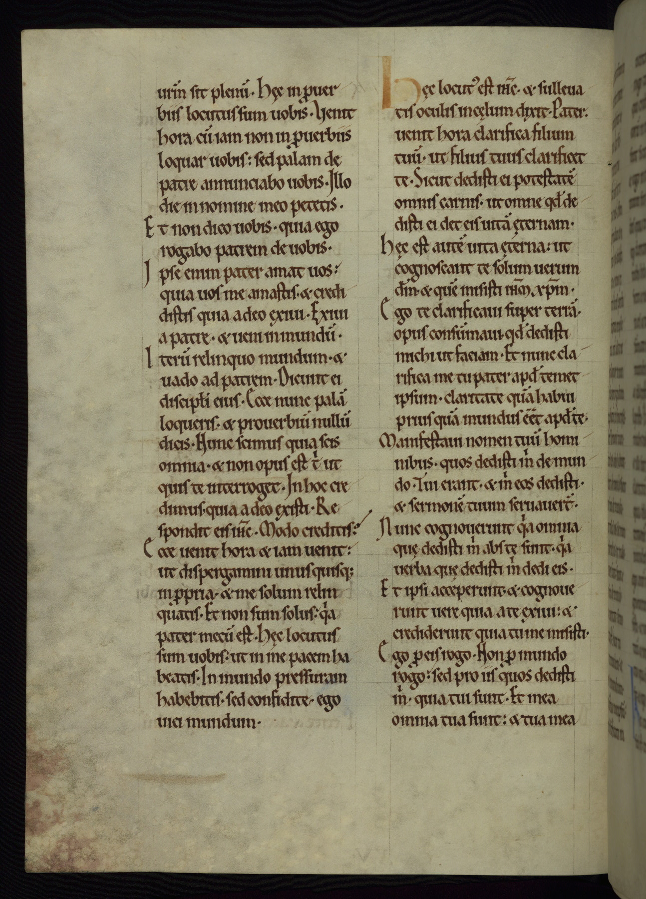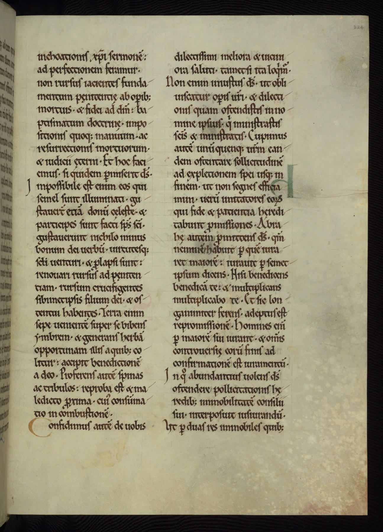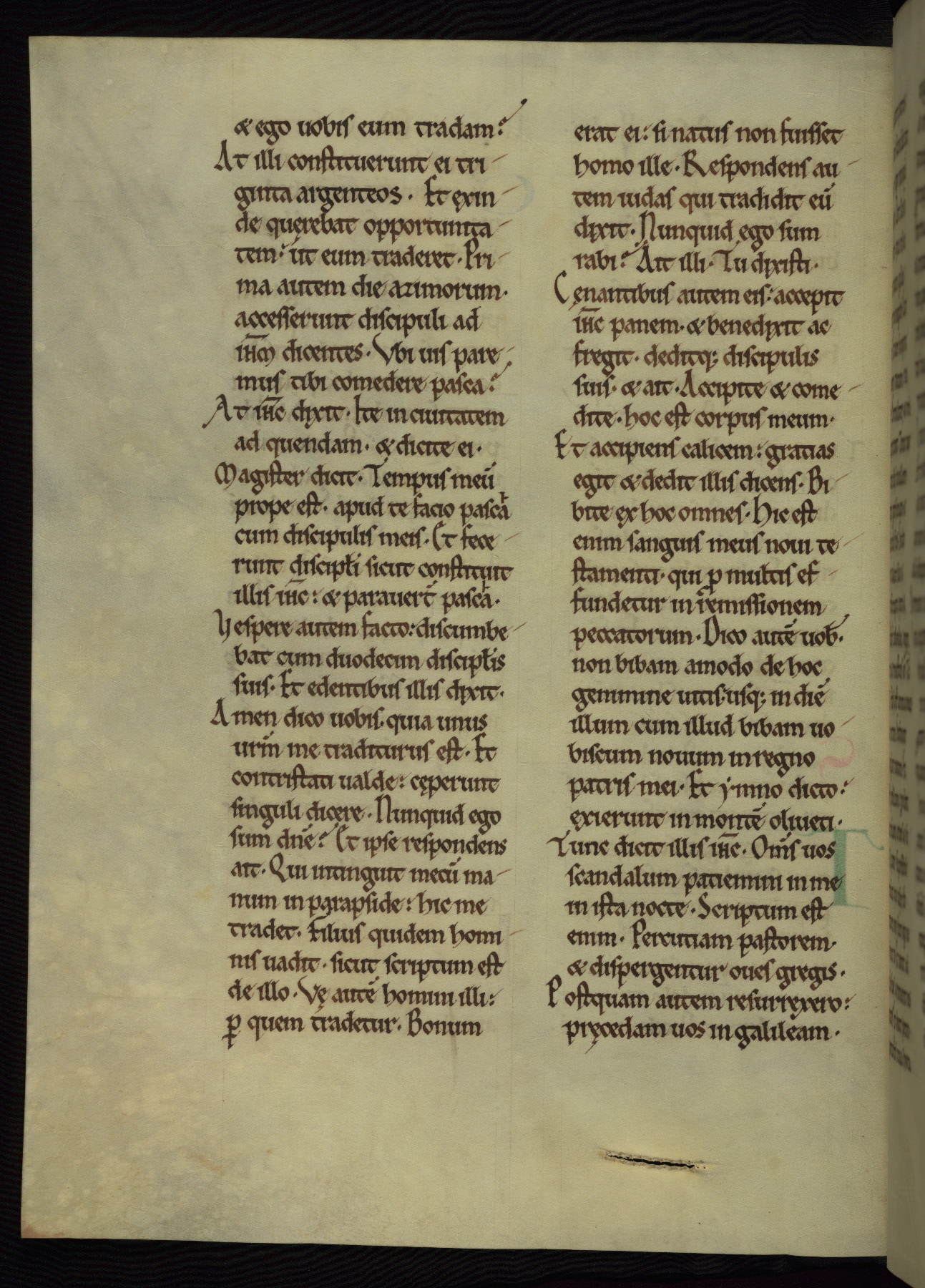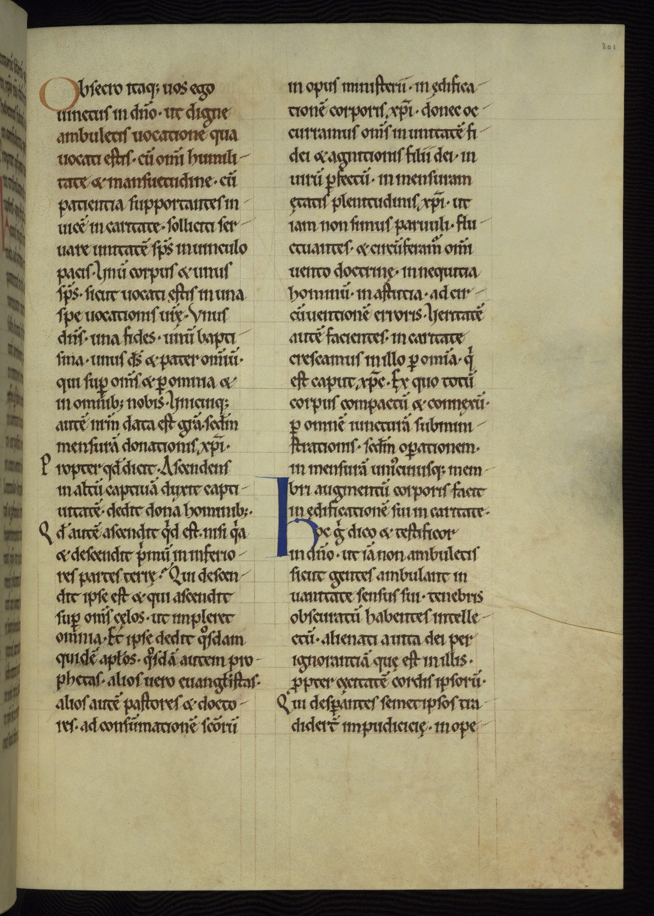 This large-format copy of the New Testament was almost certainly created at Rochester Cathedral Priory, England, in the first half of the twelfth century. It was part of a five-volume Bible, only one other volume of which, London, British Library Ms. Royal I.C.VII, has survived. The decorated initials in these manuscripts compare closely with those in other books securely attributed to Rochester. Textually these books are closely related to the Gundulph Bible (San Marino, Huntington Library Ms. HM 62), known to have been produced at Rochester in the second half of the eleventh century. Although neither the Walters' nor the British Library's volume includes an inscription associating this Bible with Rochester, the two medieval catalogs of the Rochester Cathedral library, produced around 1130 and in 1202, contain references to manuscripts that correspond well with them. The book’s large size indicates it that was designed to be read aloud, either during services or at meals in the refectory. Large, fanciful initials filled with succulent foliage, fruit, dragons, animals, and human faces begin each section of the text. Executed in a vibrant palette of red, blue, green, ochre (in place of gold), and yellow, the intricate, dynamic designs capture the essence of Romanesque manuscript illumination. Royal I.C.VII also includes four historiated initials (for the books of Joshua, I Samuel, 2 Samuel, and 2 Kings). Although the Bible was made at Rochester, the pre-Gothic script of W.18 in particular is extremely close to that practiced at nearby Canterbury at the time.