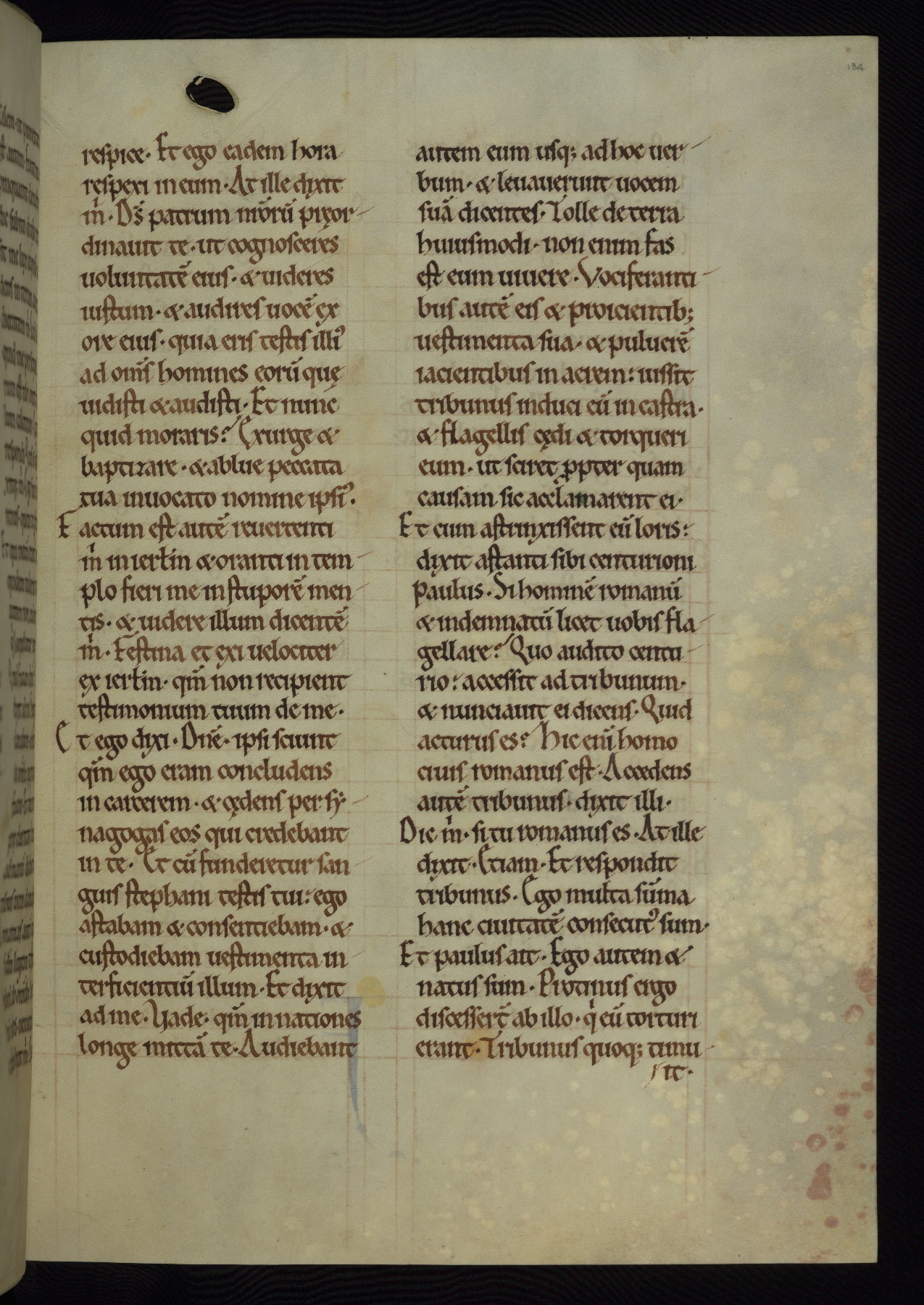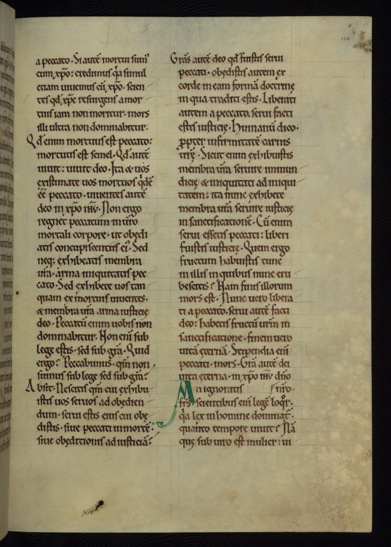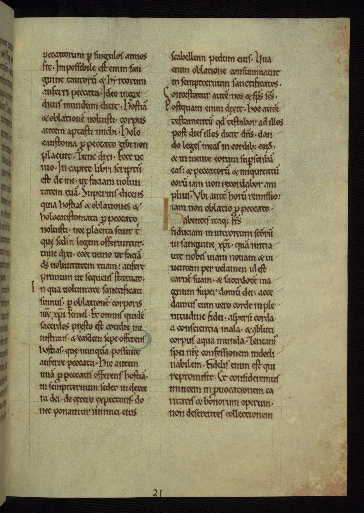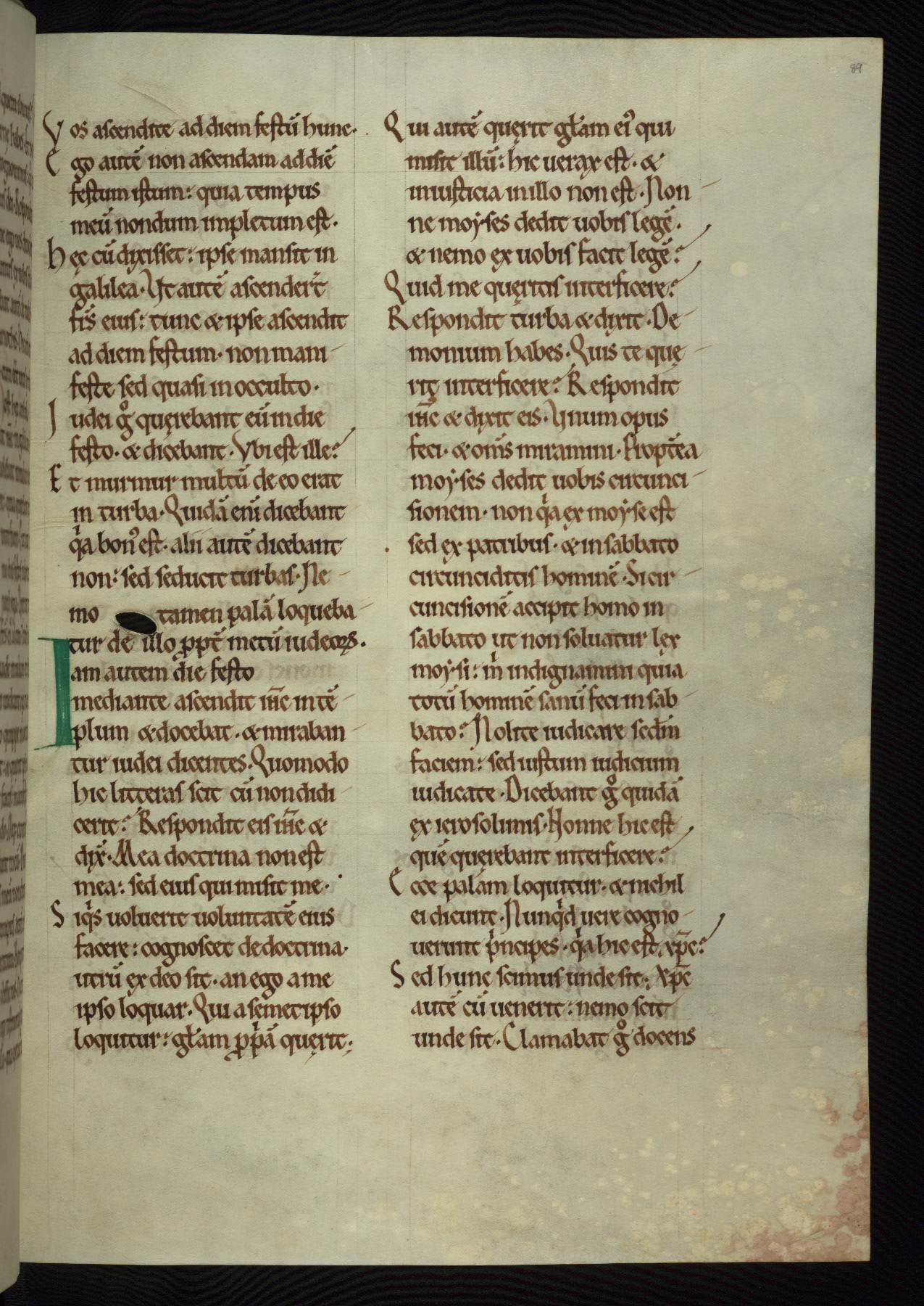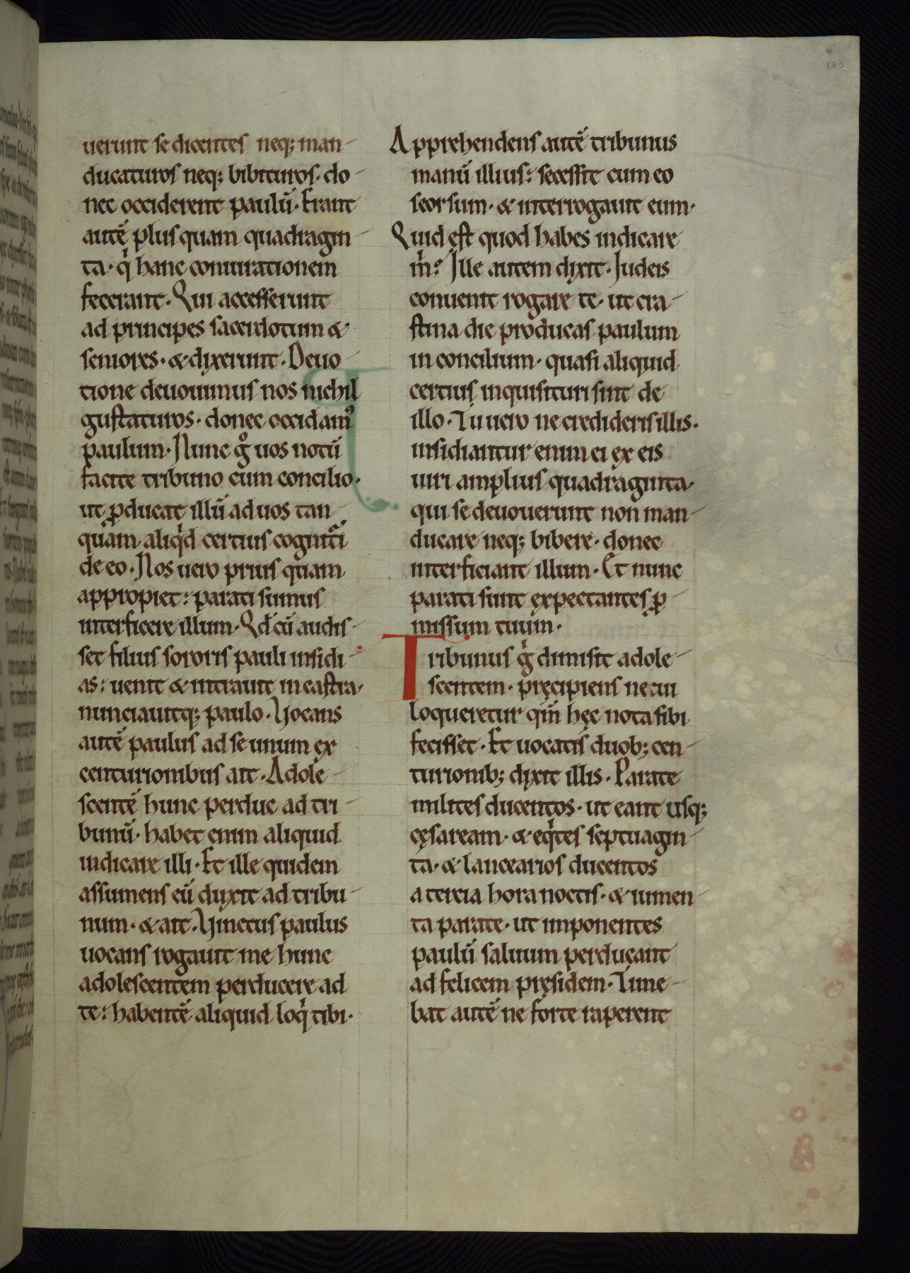This large-format copy of the New Testament was almost certainly created at Rochester Cathedral Priory, England, in the first half of the twelfth century. It was part of a five-volume Bible, only one other volume of which, London, British Library Ms. Royal I.C.VII, has survived. The decorated initials in these manuscripts compare closely with those in other books securely attributed to Rochester. Textually these books are closely related to the Gundulph Bible (San Marino, Huntington Library Ms. HM 62), known to have been produced at Rochester in the second half of the eleventh century. Although neither the Walters' nor the British Library's volume includes an inscription associating this Bible with Rochester, the two medieval catalogs of the Rochester Cathedral library, produced around 1130 and in 1202, contain references to manuscripts that correspond well with them. The book’s large size indicates it that was designed to be read aloud, either during services or at meals in the refectory. Large, fanciful initials filled with succulent foliage, fruit, dragons, animals, and human faces begin each section of the text. Executed in a vibrant palette of red, blue, green, ochre (in place of gold), and yellow, the intricate, dynamic designs capture the essence of Romanesque manuscript illumination. Royal I.C.VII also includes four historiated initials (for the books of Joshua, I Samuel, 2 Samuel, and 2 Kings). Although the Bible was made at Rochester, the pre-Gothic script of W.18 in particular is extremely close to that practiced at nearby Canterbury at the time.