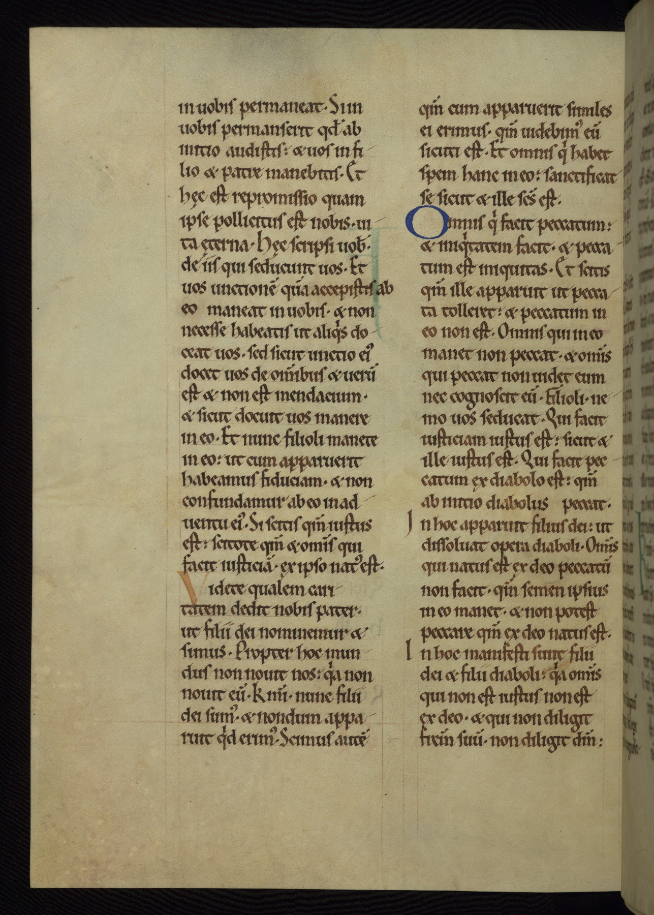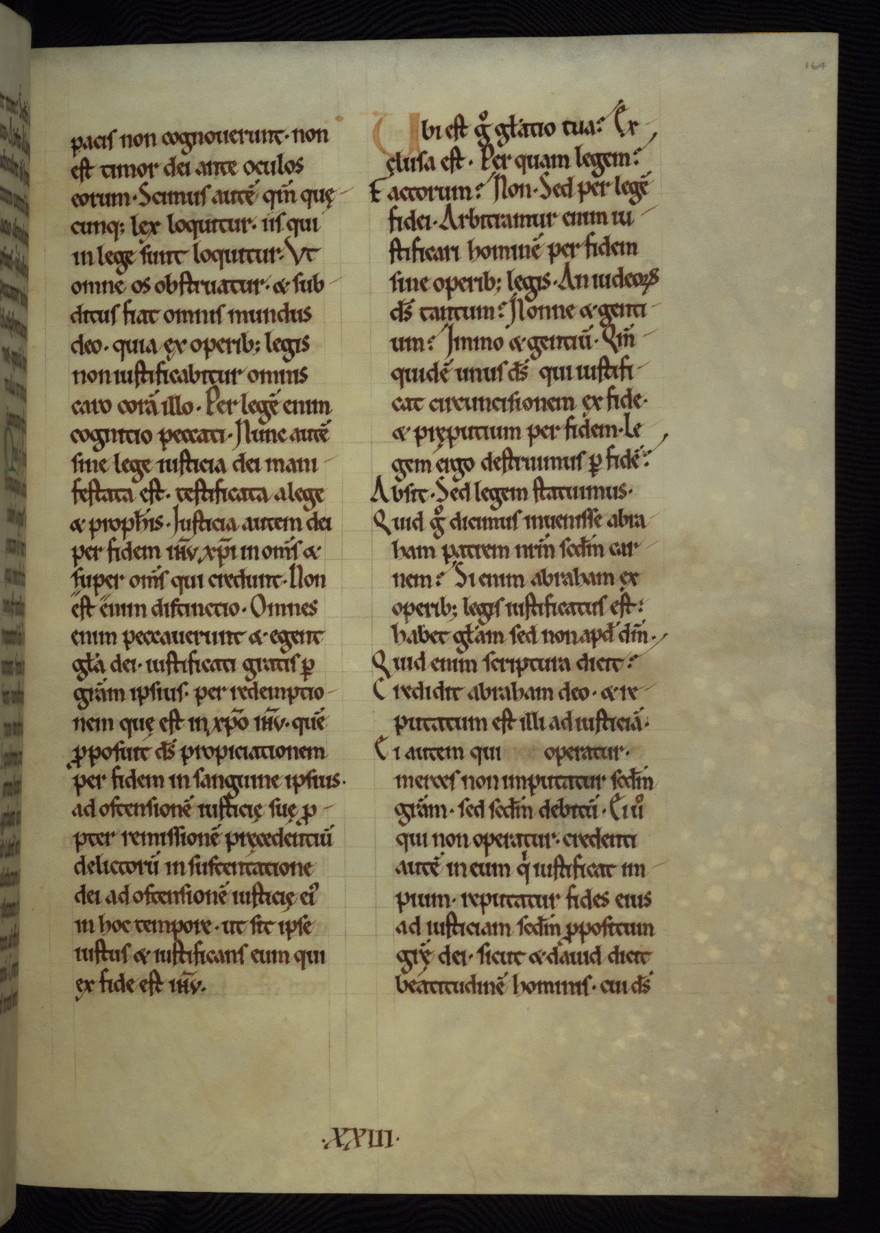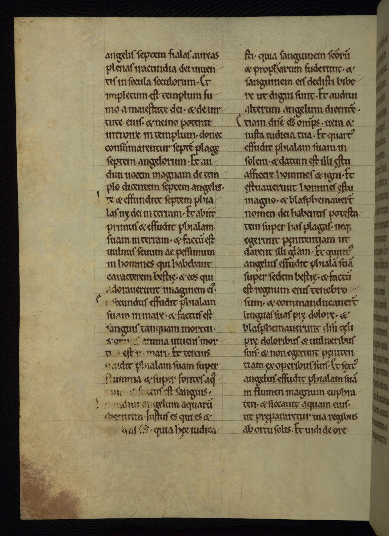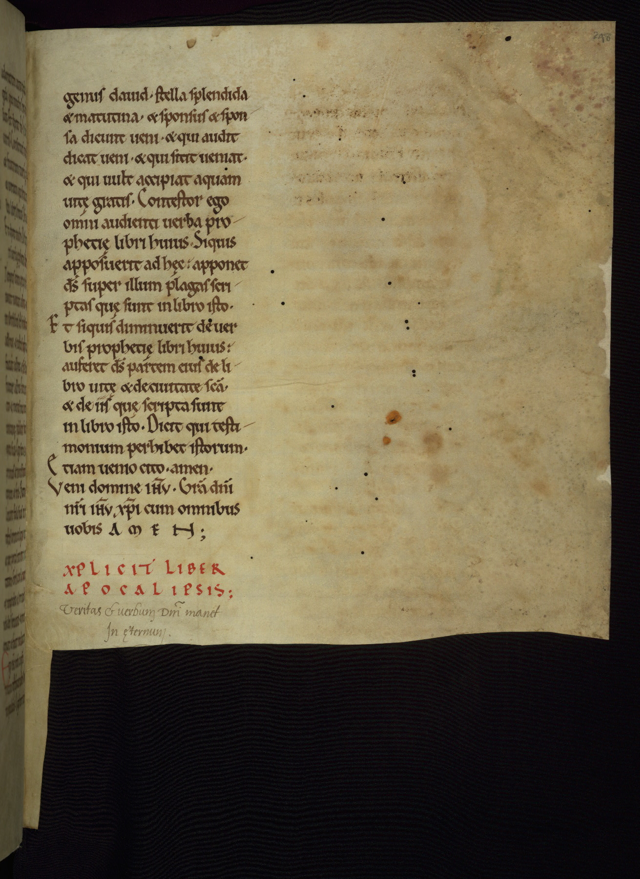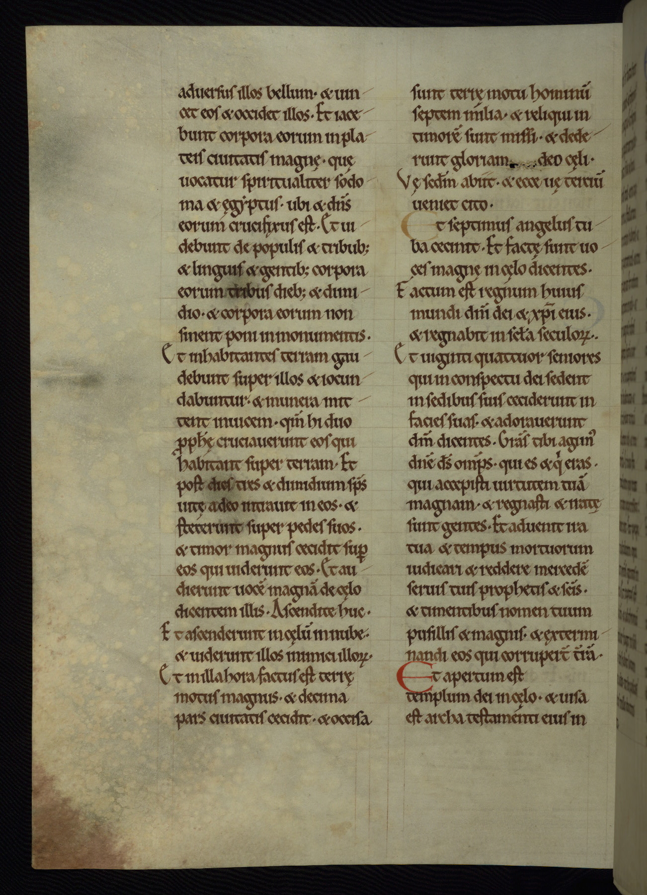 This large-format copy of the New Testament was almost certainly created at Rochester Cathedral Priory, England, in the first half of the twelfth century. It was part of a five-volume Bible, only one other volume of which, London, British Library Ms. Royal I.C.VII, has survived. The decorated initials in these manuscripts compare closely with those in other books securely attributed to Rochester. Textually these books are closely related to the Gundulph Bible (San Marino, Huntington Library Ms. HM 62), known to have been produced at Rochester in the second half of the eleventh century. Although neither the Walters' nor the British Library's volume includes an inscription associating this Bible with Rochester, the two medieval catalogs of the Rochester Cathedral library, produced around 1130 and in 1202, contain references to manuscripts that correspond well with them. The book’s large size indicates it that was designed to be read aloud, either during services or at meals in the refectory. Large, fanciful initials filled with succulent foliage, fruit, dragons, animals, and human faces begin each section of the text. Executed in a vibrant palette of red, blue, green, ochre (in place of gold), and yellow, the intricate, dynamic designs capture the essence of Romanesque manuscript illumination. Royal I.C.VII also includes four historiated initials (for the books of Joshua, I Samuel, 2 Samuel, and 2 Kings). Although the Bible was made at Rochester, the pre-Gothic script of W.18 in particular is extremely close to that practiced at nearby Canterbury at the time.