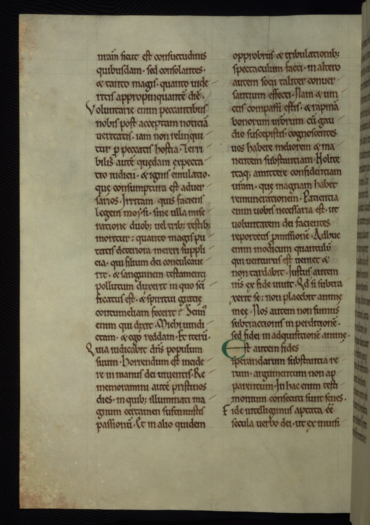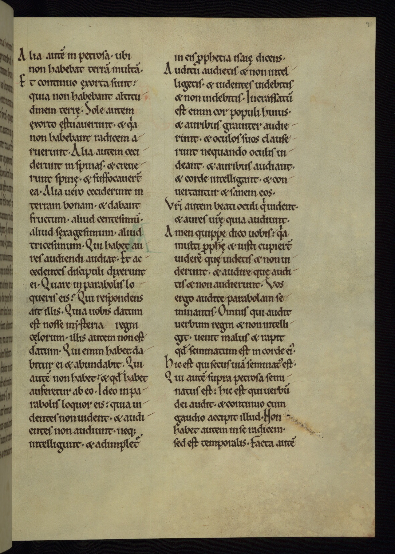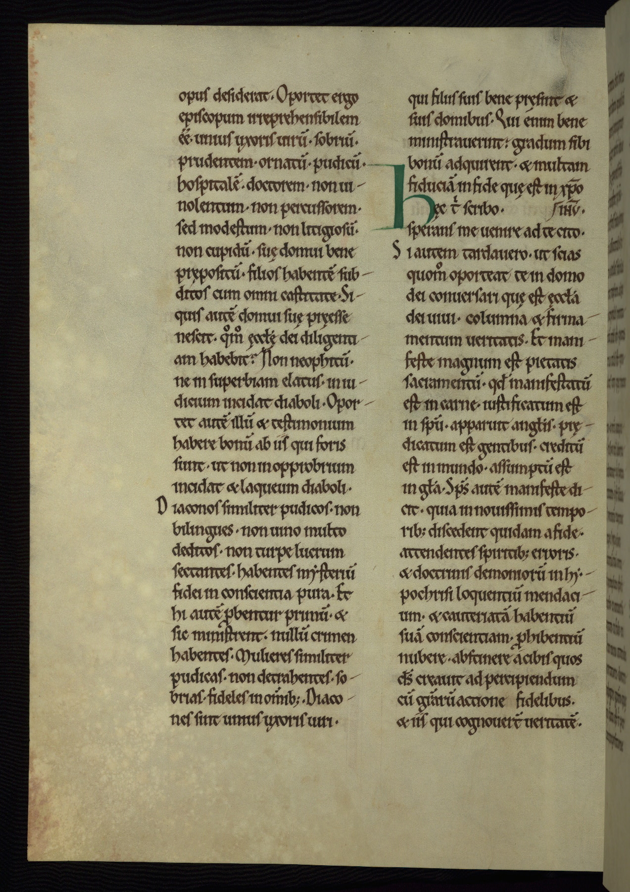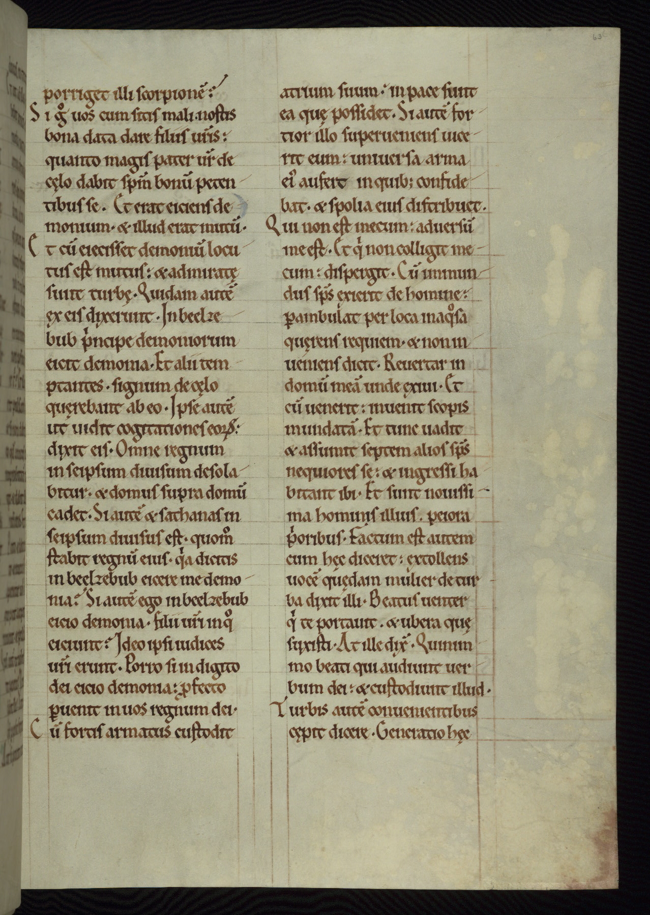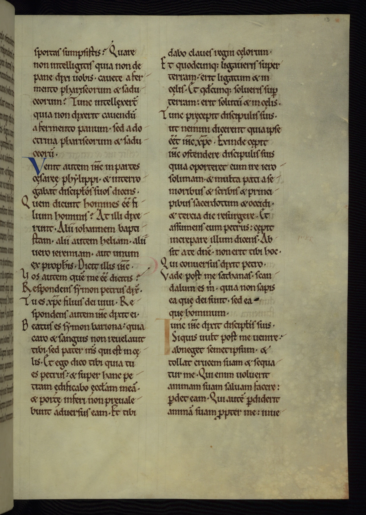 This large-format copy of the New Testament was almost certainly created at Rochester Cathedral Priory, England, in the first half of the twelfth century. It was part of a five-volume Bible, only one other volume of which, London, British Library Ms. Royal I.C.VII, has survived. The decorated initials in these manuscripts compare closely with those in other books securely attributed to Rochester. Textually these books are closely related to the Gundulph Bible (San Marino, Huntington Library Ms. HM 62), known to have been produced at Rochester in the second half of the eleventh century. Although neither the Walters' nor the British Library's volume includes an inscription associating this Bible with Rochester, the two medieval catalogs of the Rochester Cathedral library, produced around 1130 and in 1202, contain references to manuscripts that correspond well with them. The book’s large size indicates it that was designed to be read aloud, either during services or at meals in the refectory. Large, fanciful initials filled with succulent foliage, fruit, dragons, animals, and human faces begin each section of the text. Executed in a vibrant palette of red, blue, green, ochre (in place of gold), and yellow, the intricate, dynamic designs capture the essence of Romanesque manuscript illumination. Royal I.C.VII also includes four historiated initials (for the books of Joshua, I Samuel, 2 Samuel, and 2 Kings). Although the Bible was made at Rochester, the pre-Gothic script of W.18 in particular is extremely close to that practiced at nearby Canterbury at the time.