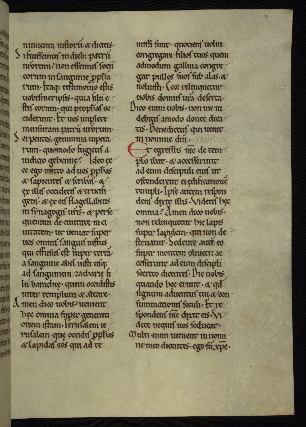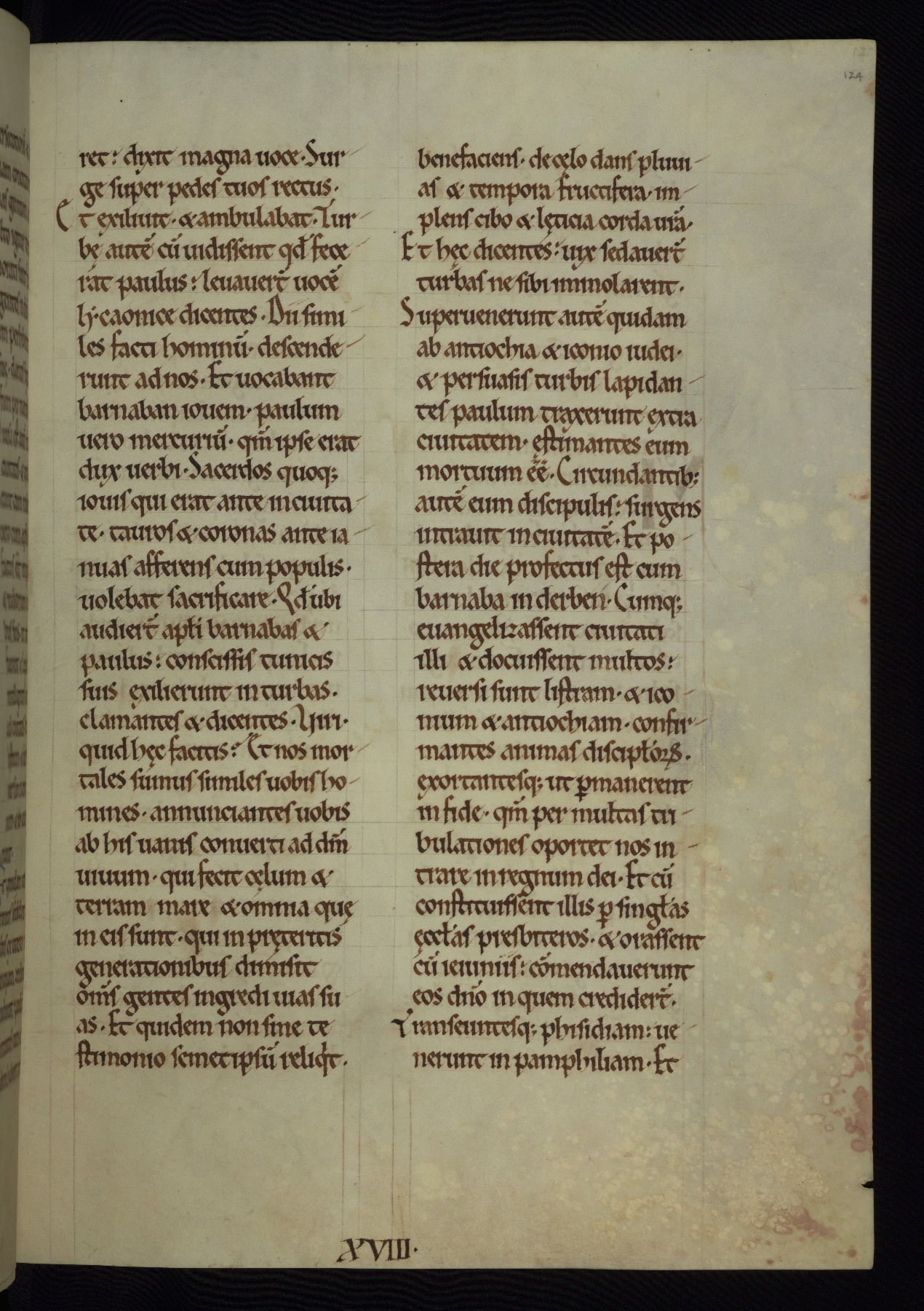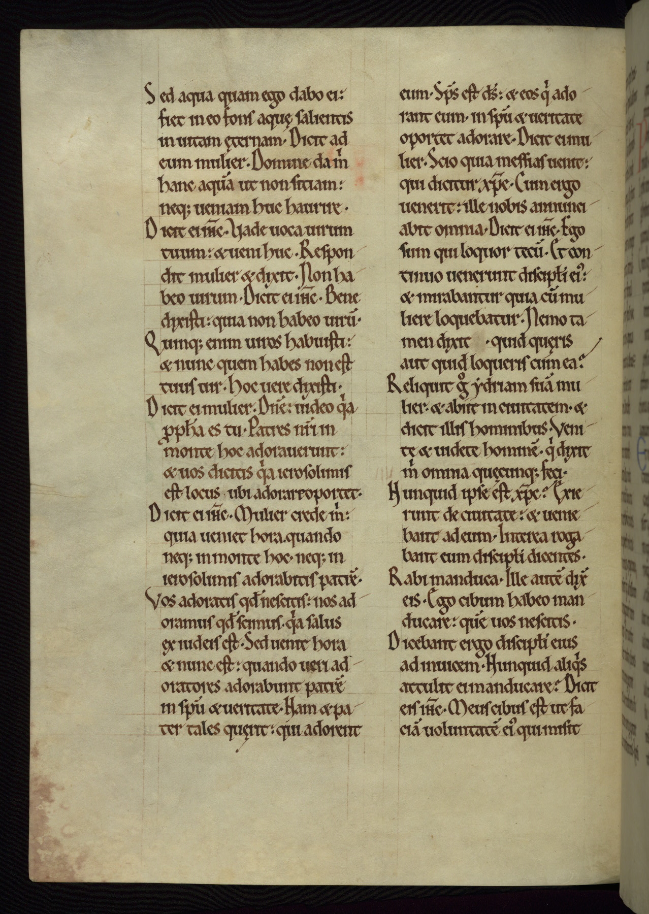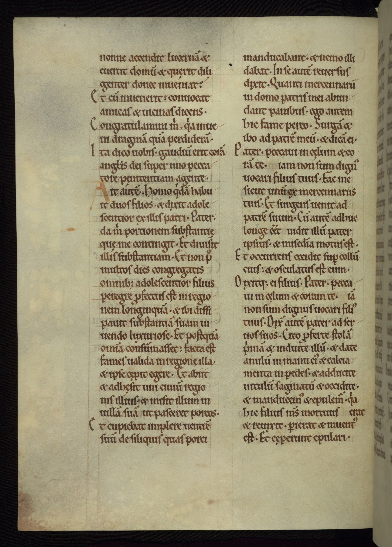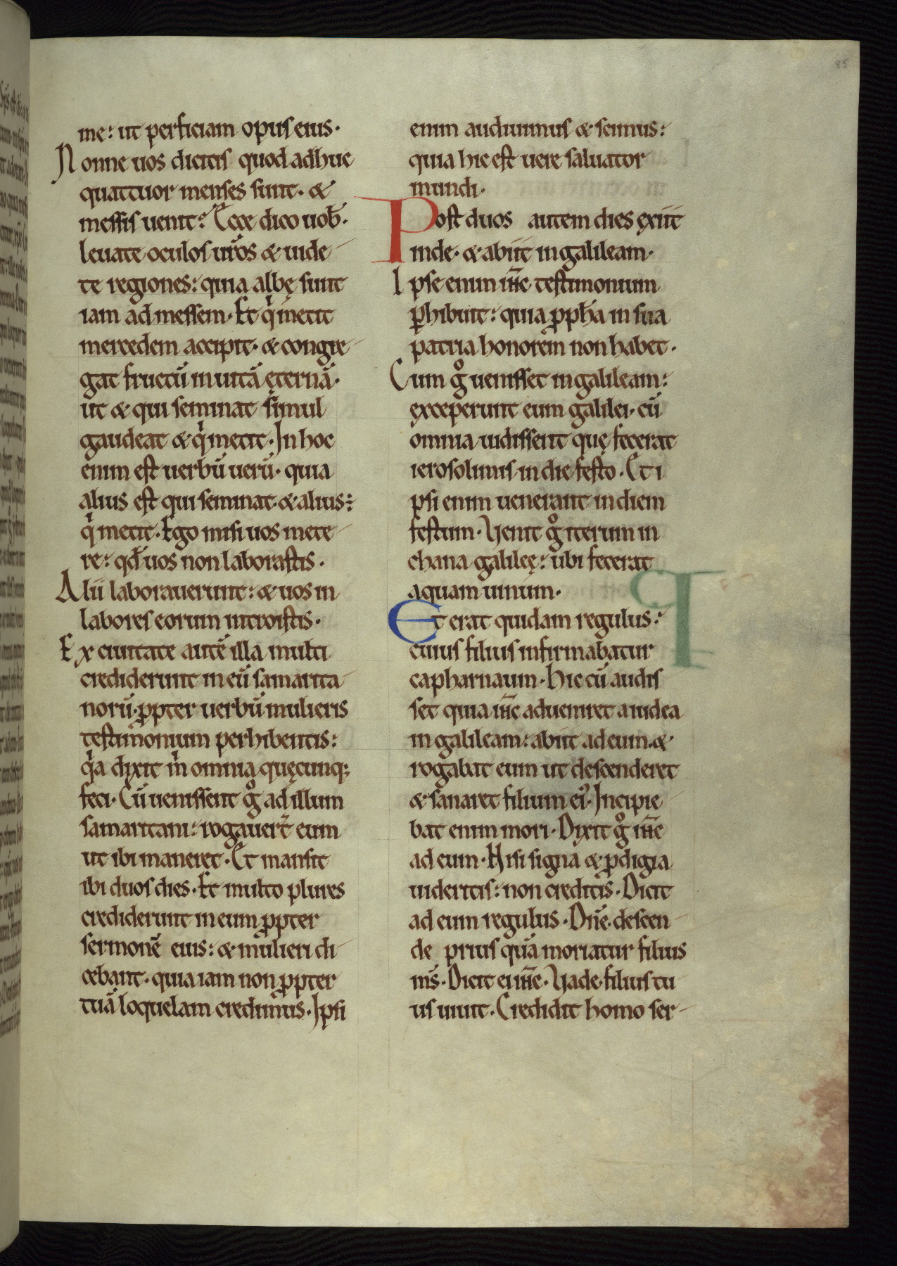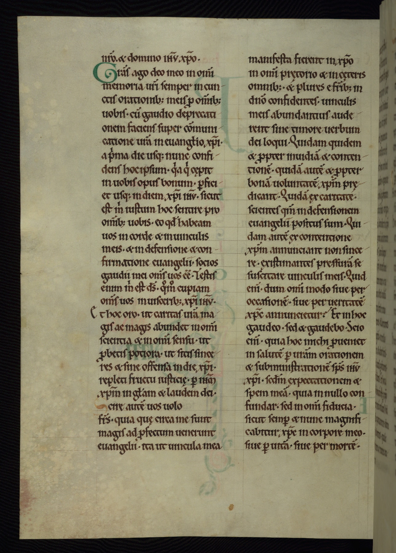 This large-format copy of the New Testament was almost certainly created at Rochester Cathedral Priory, England, in the first half of the twelfth century. It was part of a five-volume Bible, only one other volume of which, London, British Library Ms. Royal I.C.VII, has survived. The decorated initials in these manuscripts compare closely with those in other books securely attributed to Rochester. Textually these books are closely related to the Gundulph Bible (San Marino, Huntington Library Ms. HM 62), known to have been produced at Rochester in the second half of the eleventh century. Although neither the Walters' nor the British Library's volume includes an inscription associating this Bible with Rochester, the two medieval catalogs of the Rochester Cathedral library, produced around 1130 and in 1202, contain references to manuscripts that correspond well with them. The book’s large size indicates it that was designed to be read aloud, either during services or at meals in the refectory. Large, fanciful initials filled with succulent foliage, fruit, dragons, animals, and human faces begin each section of the text. Executed in a vibrant palette of red, blue, green, ochre (in place of gold), and yellow, the intricate, dynamic designs capture the essence of Romanesque manuscript illumination. Royal I.C.VII also includes four historiated initials (for the books of Joshua, I Samuel, 2 Samuel, and 2 Kings). Although the Bible was made at Rochester, the pre-Gothic script of W.18 in particular is extremely close to that practiced at nearby Canterbury at the time.