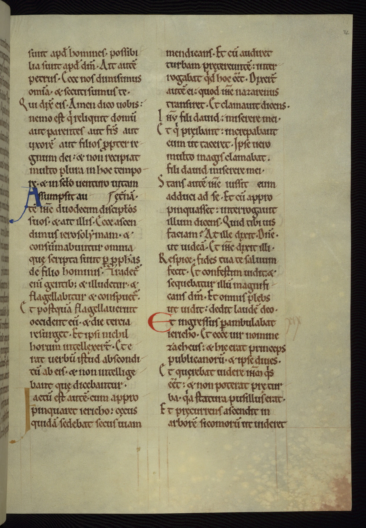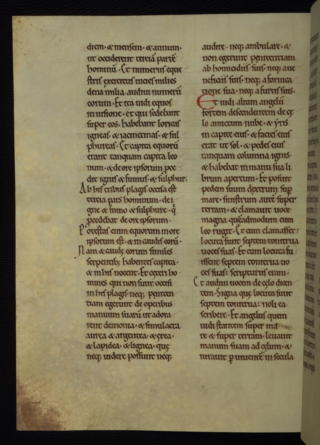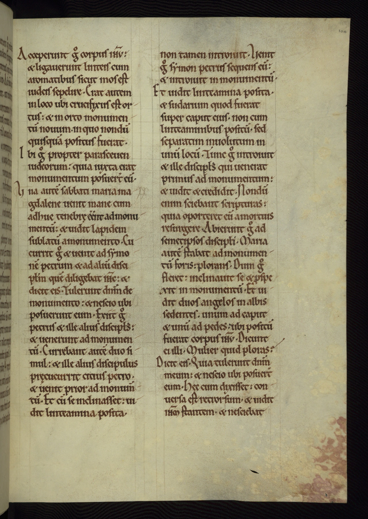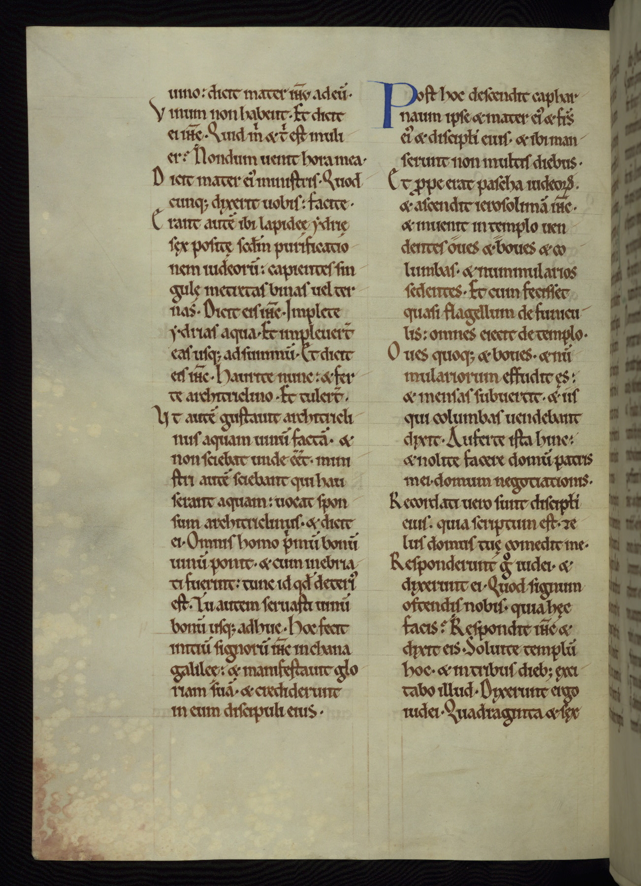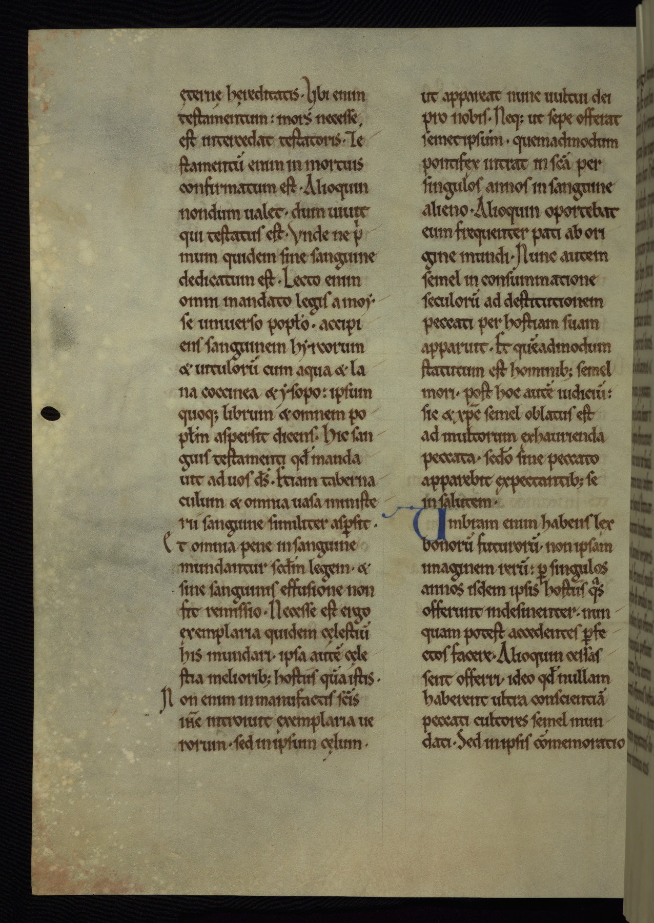 This large-format copy of the New Testament was almost certainly created at Rochester Cathedral Priory, England, in the first half of the twelfth century. It was part of a five-volume Bible, only one other volume of which, London, British Library Ms. Royal I.C.VII, has survived. The decorated initials in these manuscripts compare closely with those in other books securely attributed to Rochester. Textually these books are closely related to the Gundulph Bible (San Marino, Huntington Library Ms. HM 62), known to have been produced at Rochester in the second half of the eleventh century. Although neither the Walters' nor the British Library's volume includes an inscription associating this Bible with Rochester, the two medieval catalogs of the Rochester Cathedral library, produced around 1130 and in 1202, contain references to manuscripts that correspond well with them. The book’s large size indicates it that was designed to be read aloud, either during services or at meals in the refectory. Large, fanciful initials filled with succulent foliage, fruit, dragons, animals, and human faces begin each section of the text. Executed in a vibrant palette of red, blue, green, ochre (in place of gold), and yellow, the intricate, dynamic designs capture the essence of Romanesque manuscript illumination. Royal I.C.VII also includes four historiated initials (for the books of Joshua, I Samuel, 2 Samuel, and 2 Kings). Although the Bible was made at Rochester, the pre-Gothic script of W.18 in particular is extremely close to that practiced at nearby Canterbury at the time.