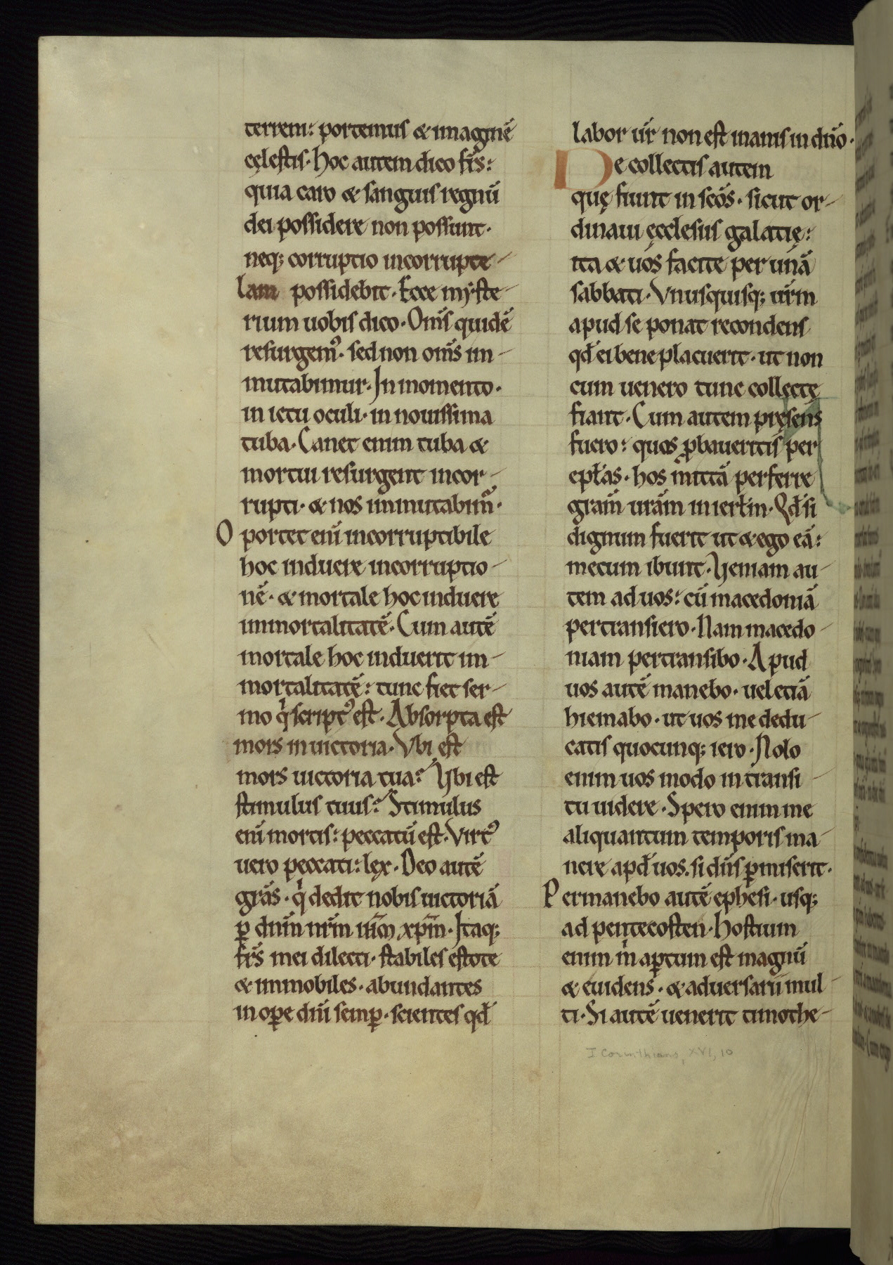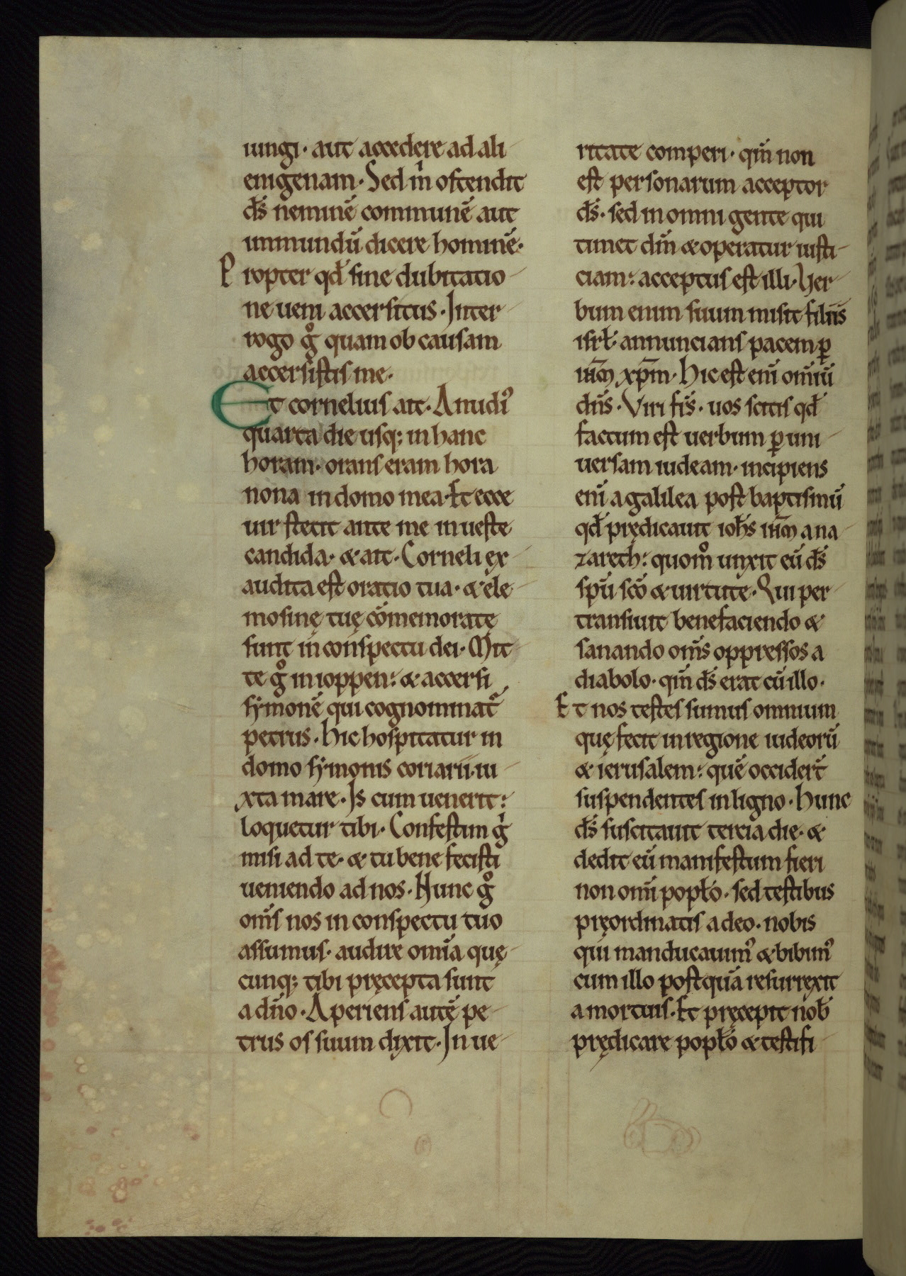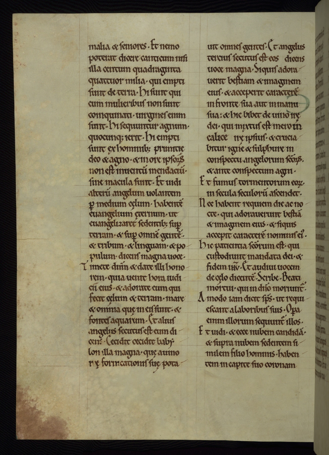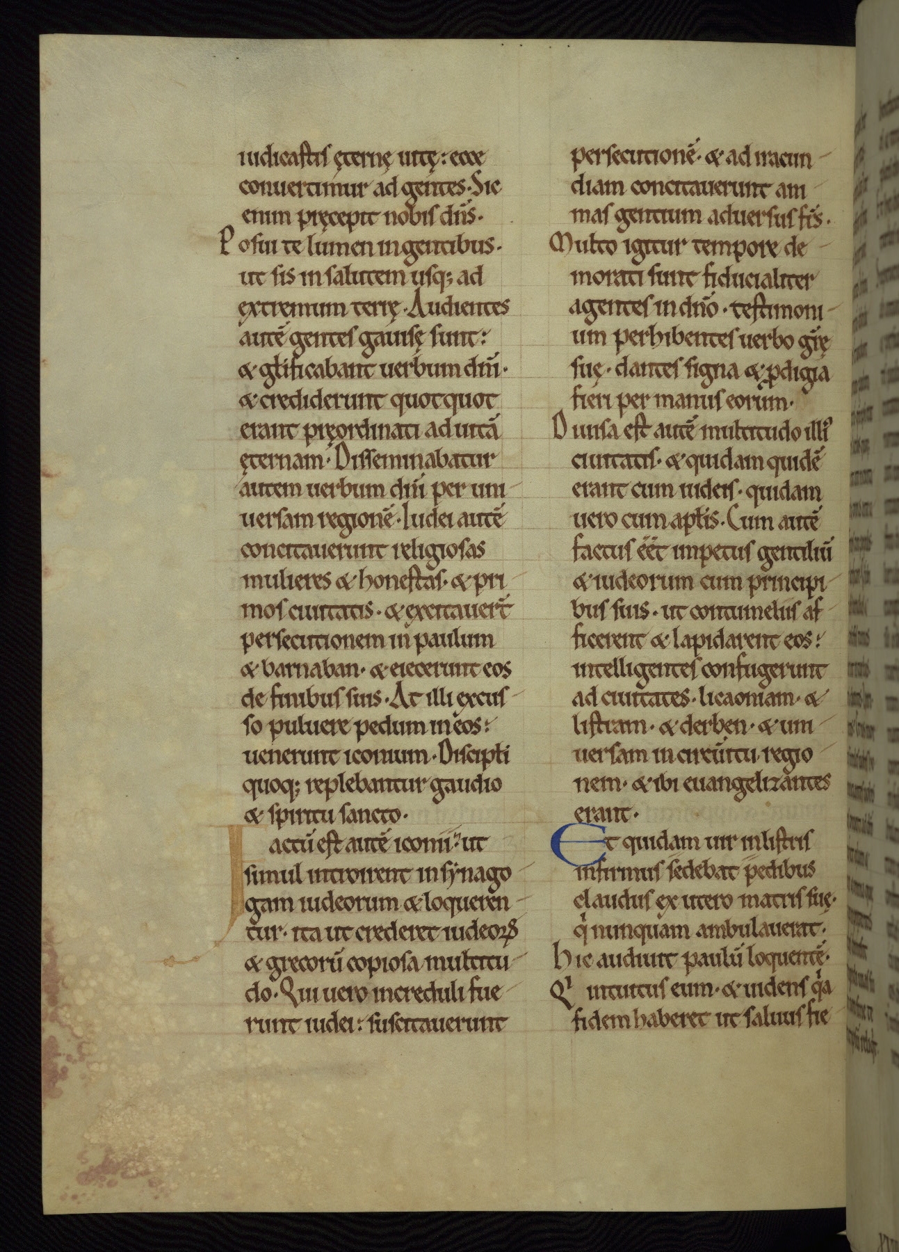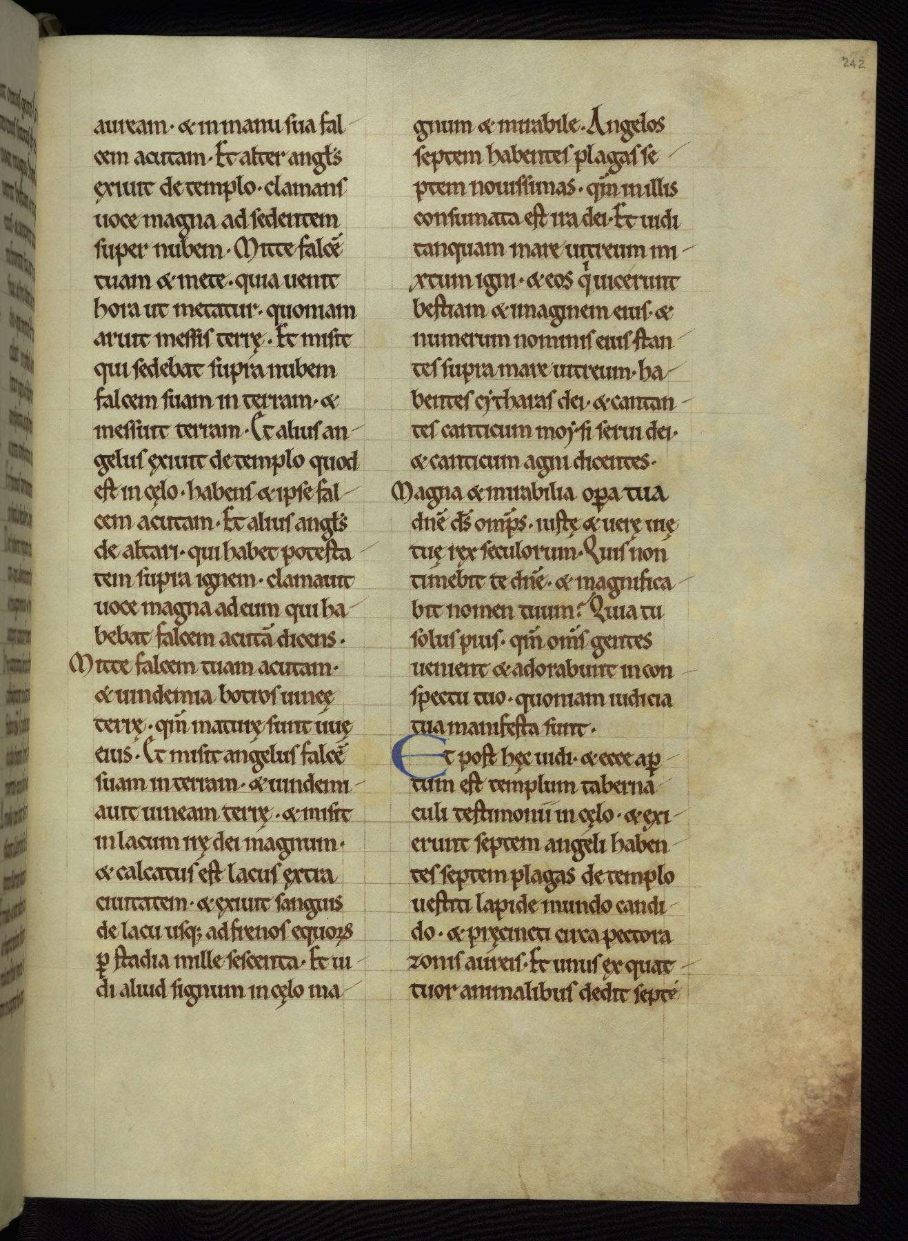 This large-format copy of the New Testament was almost certainly created at Rochester Cathedral Priory, England, in the first half of the twelfth century. It was part of a five-volume Bible, only one other volume of which, London, British Library Ms. Royal I.C.VII, has survived. The decorated initials in these manuscripts compare closely with those in other books securely attributed to Rochester. Textually these books are closely related to the Gundulph Bible (San Marino, Huntington Library Ms. HM 62), known to have been produced at Rochester in the second half of the eleventh century. Although neither the Walters' nor the British Library's volume includes an inscription associating this Bible with Rochester, the two medieval catalogs of the Rochester Cathedral library, produced around 1130 and in 1202, contain references to manuscripts that correspond well with them. The book’s large size indicates it that was designed to be read aloud, either during services or at meals in the refectory. Large, fanciful initials filled with succulent foliage, fruit, dragons, animals, and human faces begin each section of the text. Executed in a vibrant palette of red, blue, green, ochre (in place of gold), and yellow, the intricate, dynamic designs capture the essence of Romanesque manuscript illumination. Royal I.C.VII also includes four historiated initials (for the books of Joshua, I Samuel, 2 Samuel, and 2 Kings). Although the Bible was made at Rochester, the pre-Gothic script of W.18 in particular is extremely close to that practiced at nearby Canterbury at the time.