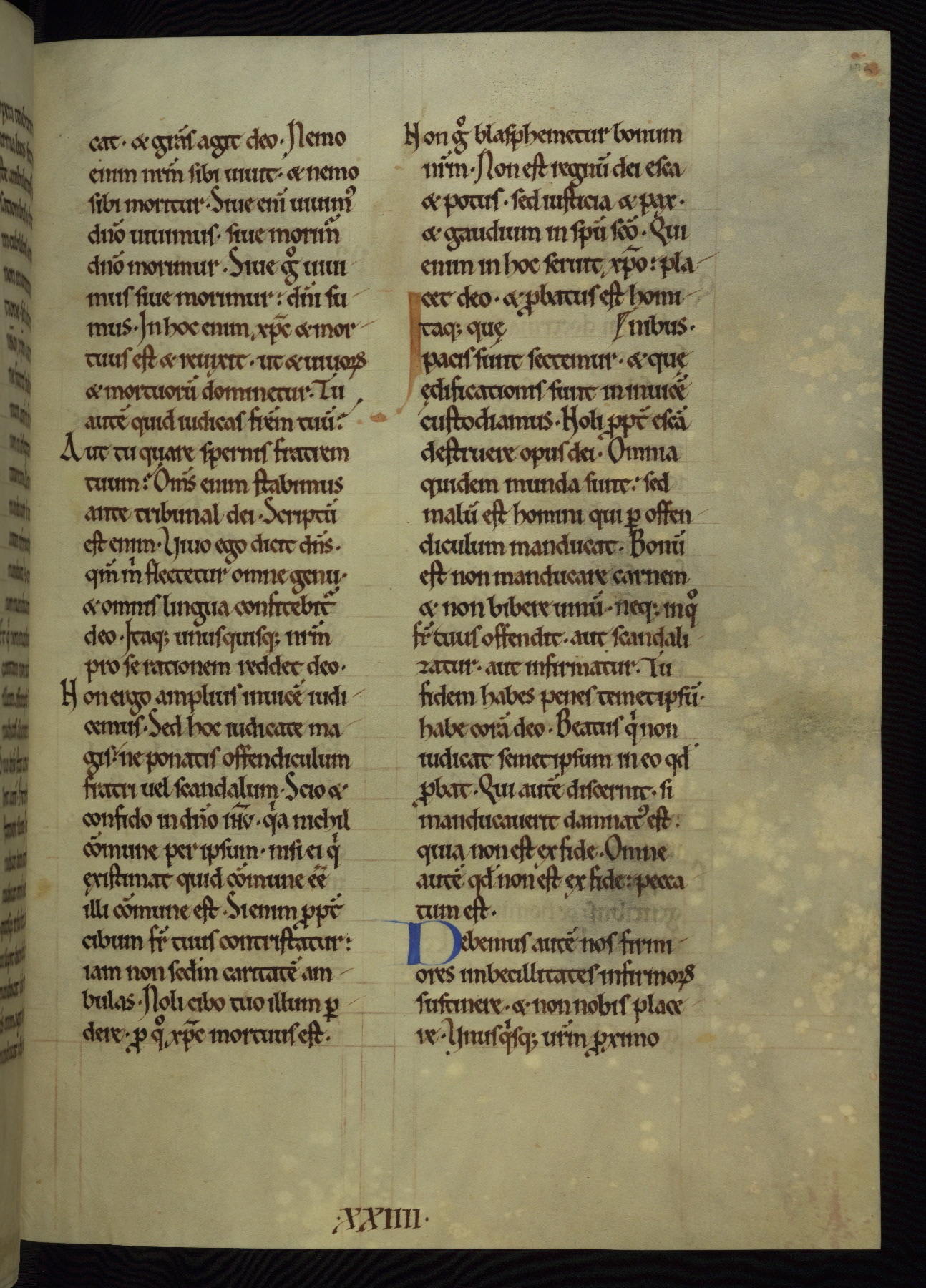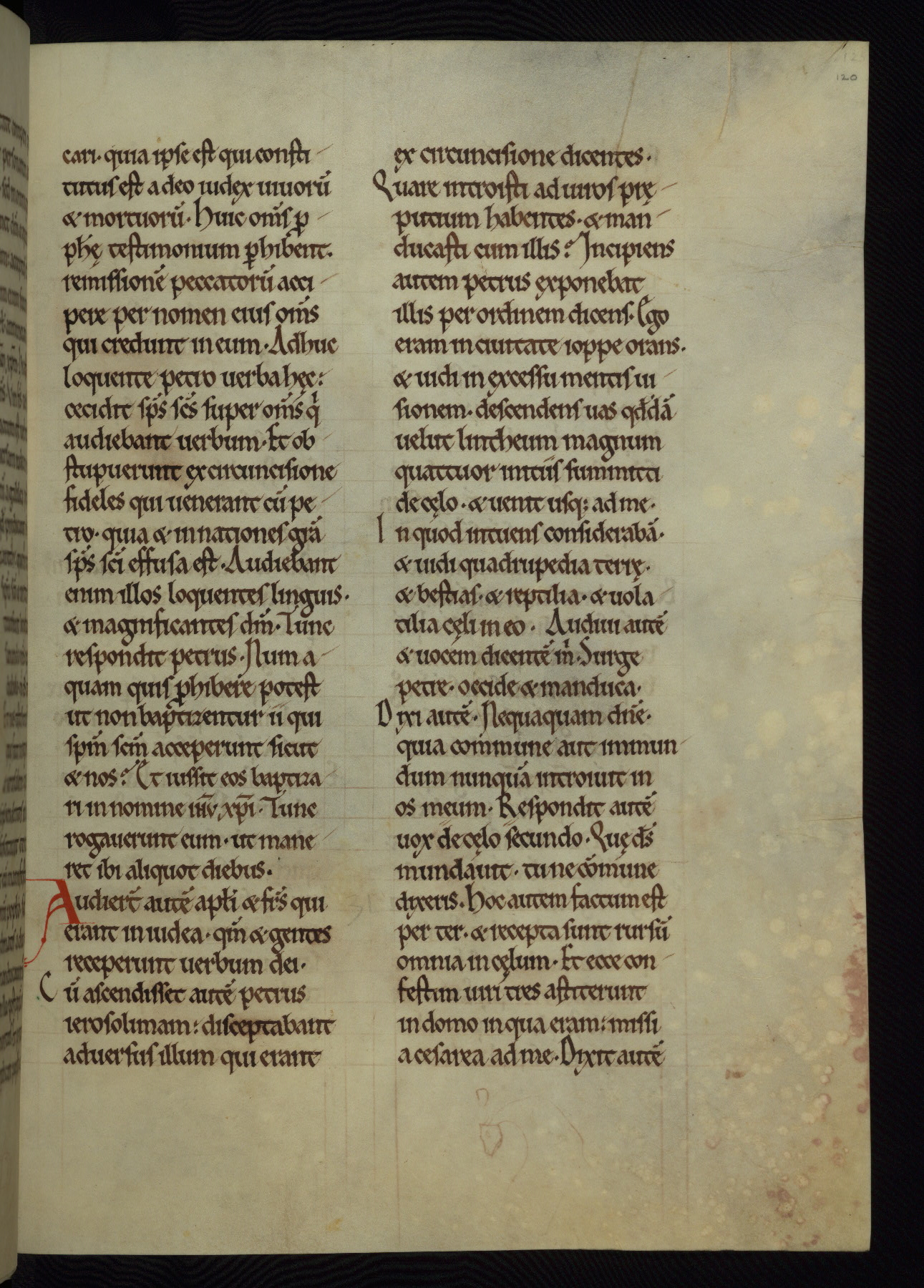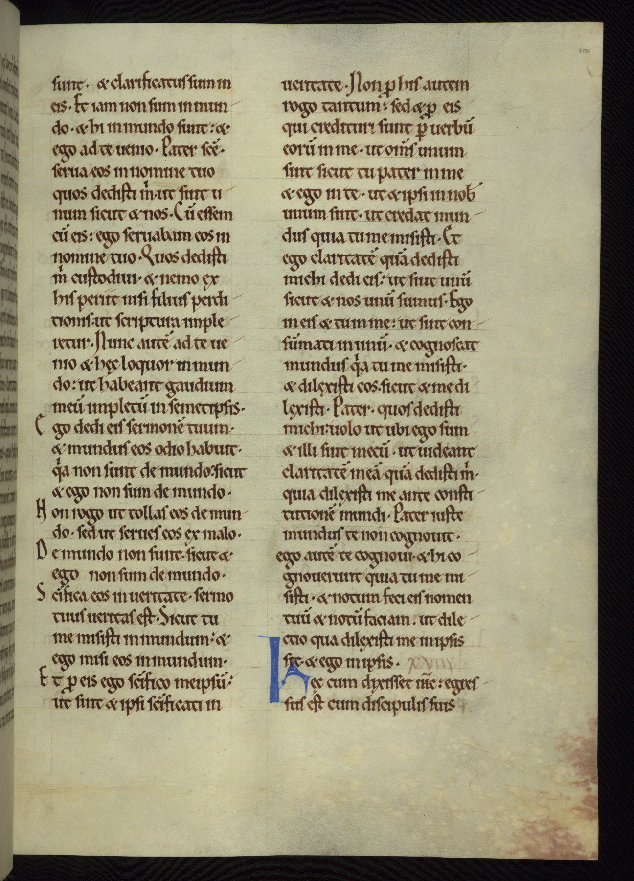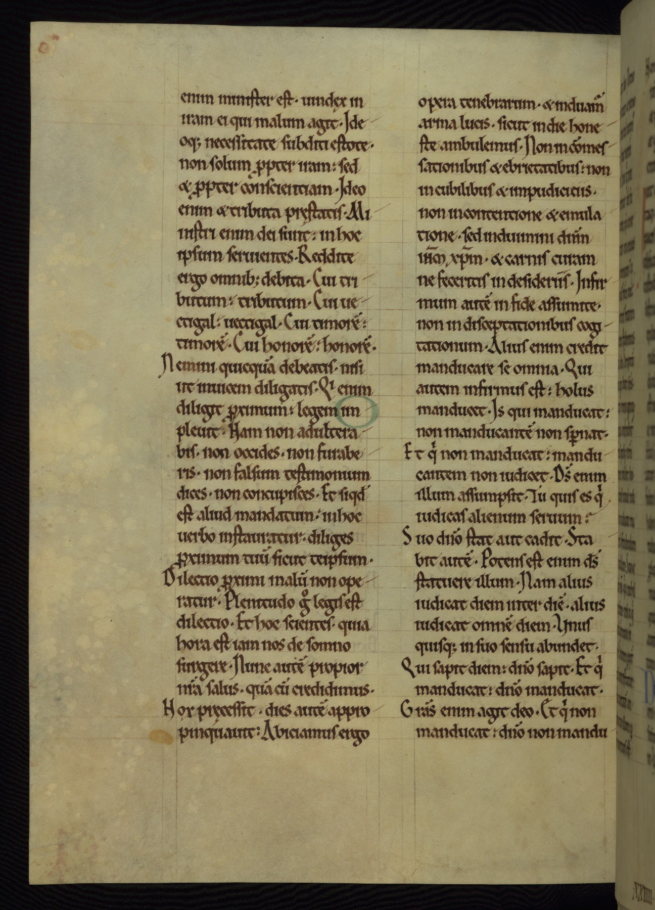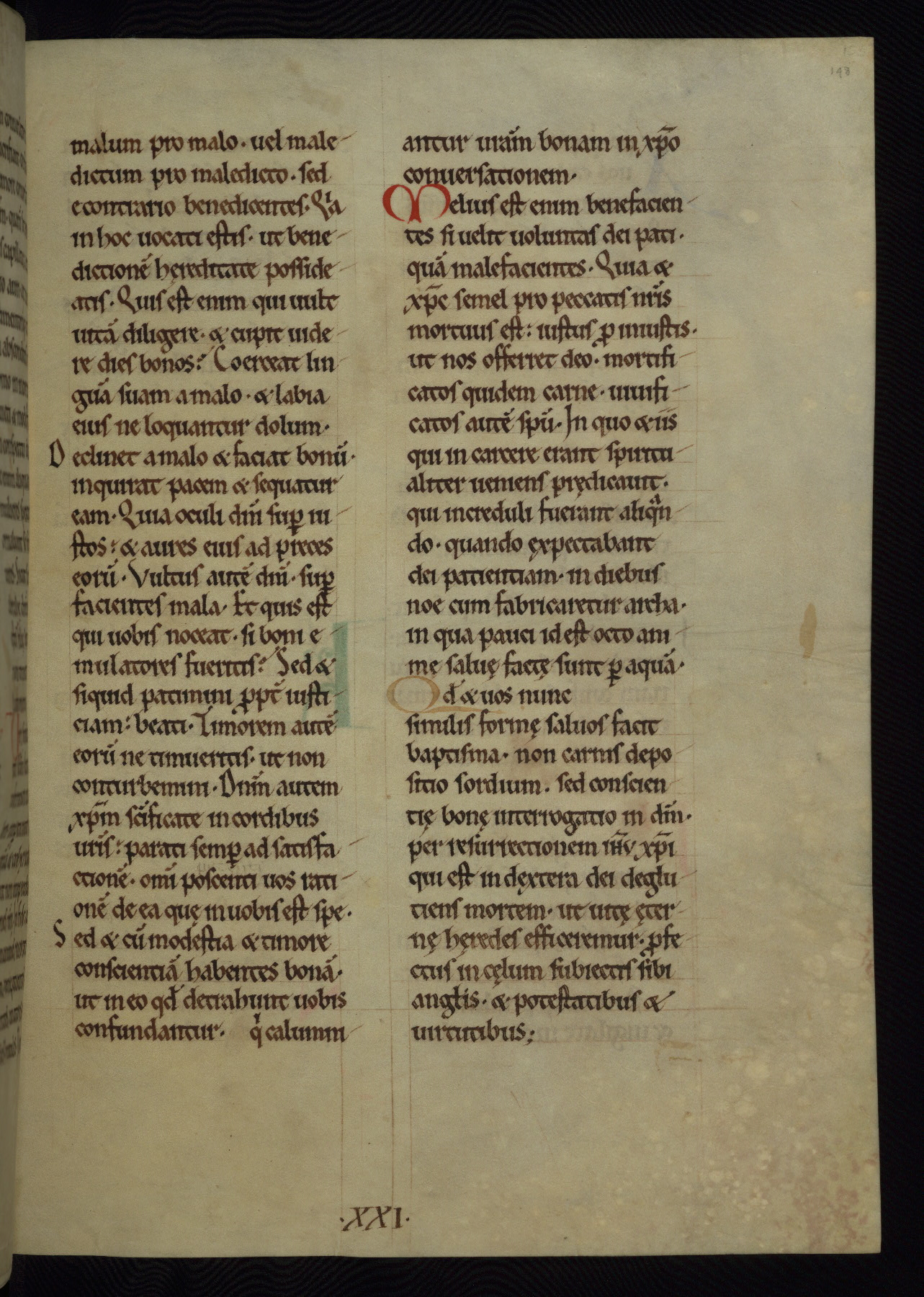 This large-format copy of the New Testament was almost certainly created at Rochester Cathedral Priory, England, in the first half of the twelfth century. It was part of a five-volume Bible, only one other volume of which, London, British Library Ms. Royal I.C.VII, has survived. The decorated initials in these manuscripts compare closely with those in other books securely attributed to Rochester. Textually these books are closely related to the Gundulph Bible (San Marino, Huntington Library Ms. HM 62), known to have been produced at Rochester in the second half of the eleventh century. Although neither the Walters' nor the British Library's volume includes an inscription associating this Bible with Rochester, the two medieval catalogs of the Rochester Cathedral library, produced around 1130 and in 1202, contain references to manuscripts that correspond well with them. The book’s large size indicates it that was designed to be read aloud, either during services or at meals in the refectory. Large, fanciful initials filled with succulent foliage, fruit, dragons, animals, and human faces begin each section of the text. Executed in a vibrant palette of red, blue, green, ochre (in place of gold), and yellow, the intricate, dynamic designs capture the essence of Romanesque manuscript illumination. Royal I.C.VII also includes four historiated initials (for the books of Joshua, I Samuel, 2 Samuel, and 2 Kings). Although the Bible was made at Rochester, the pre-Gothic script of W.18 in particular is extremely close to that practiced at nearby Canterbury at the time.