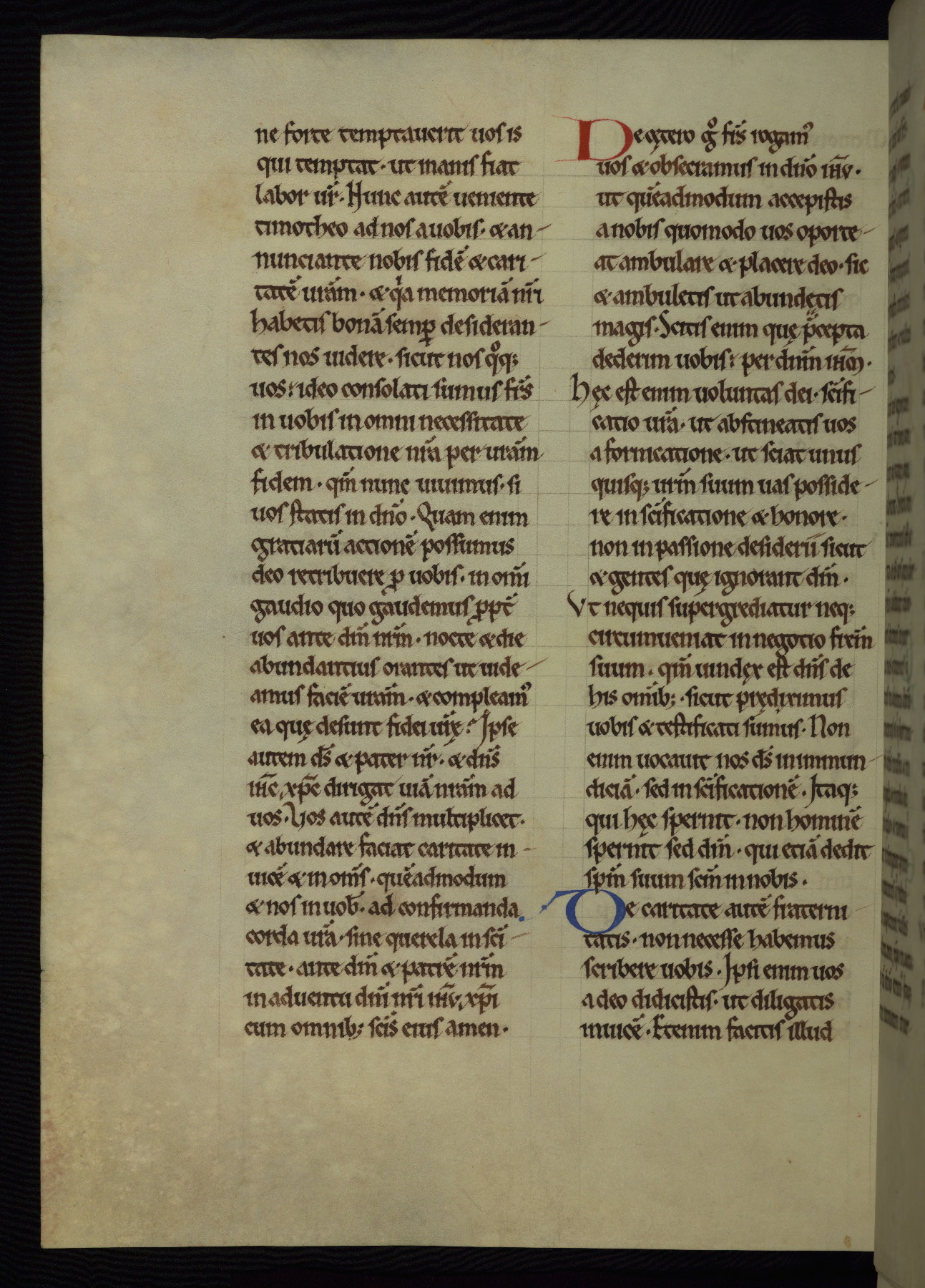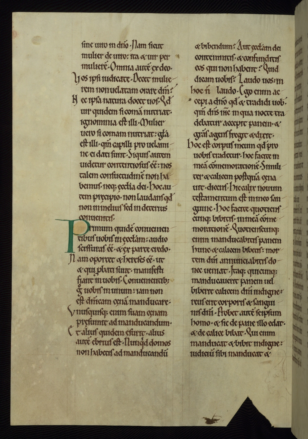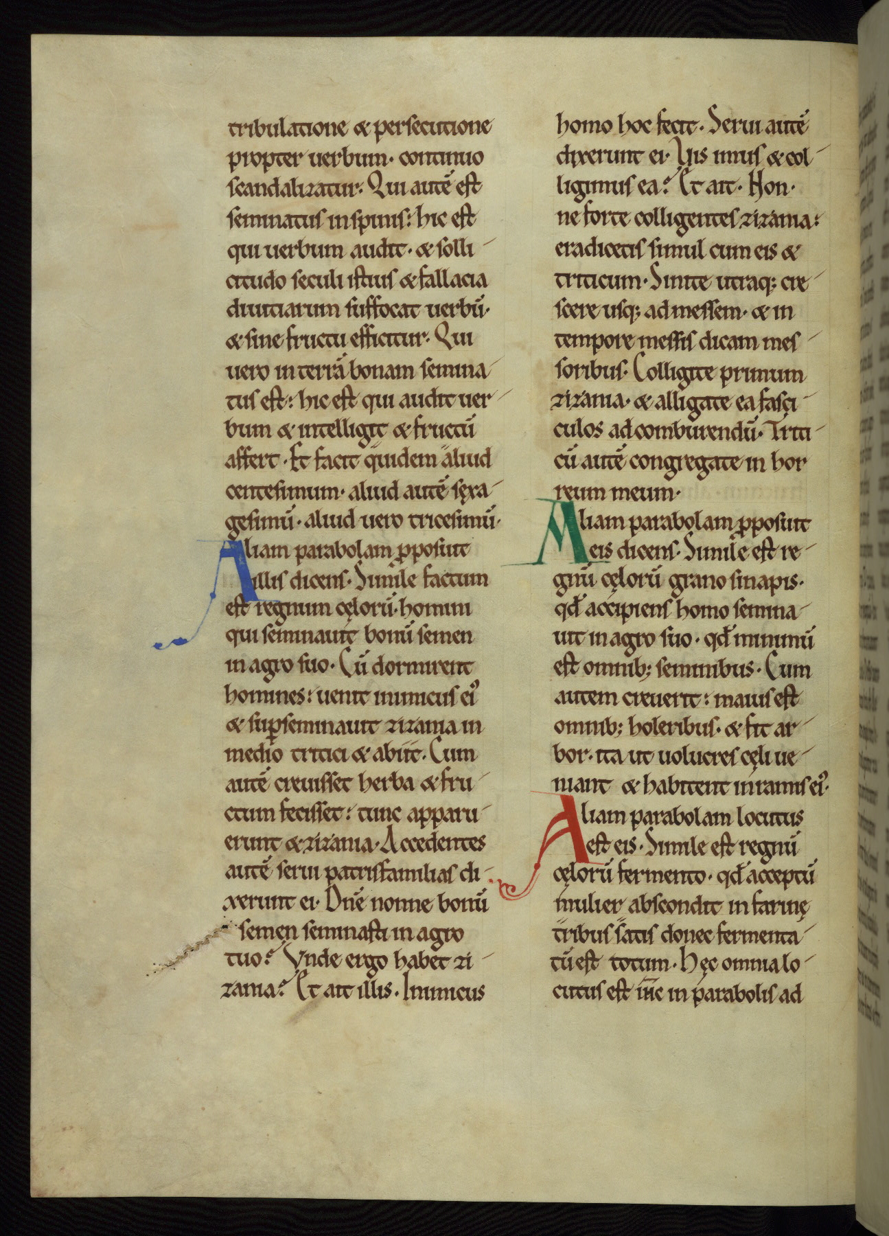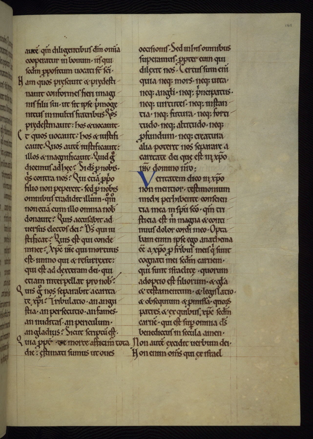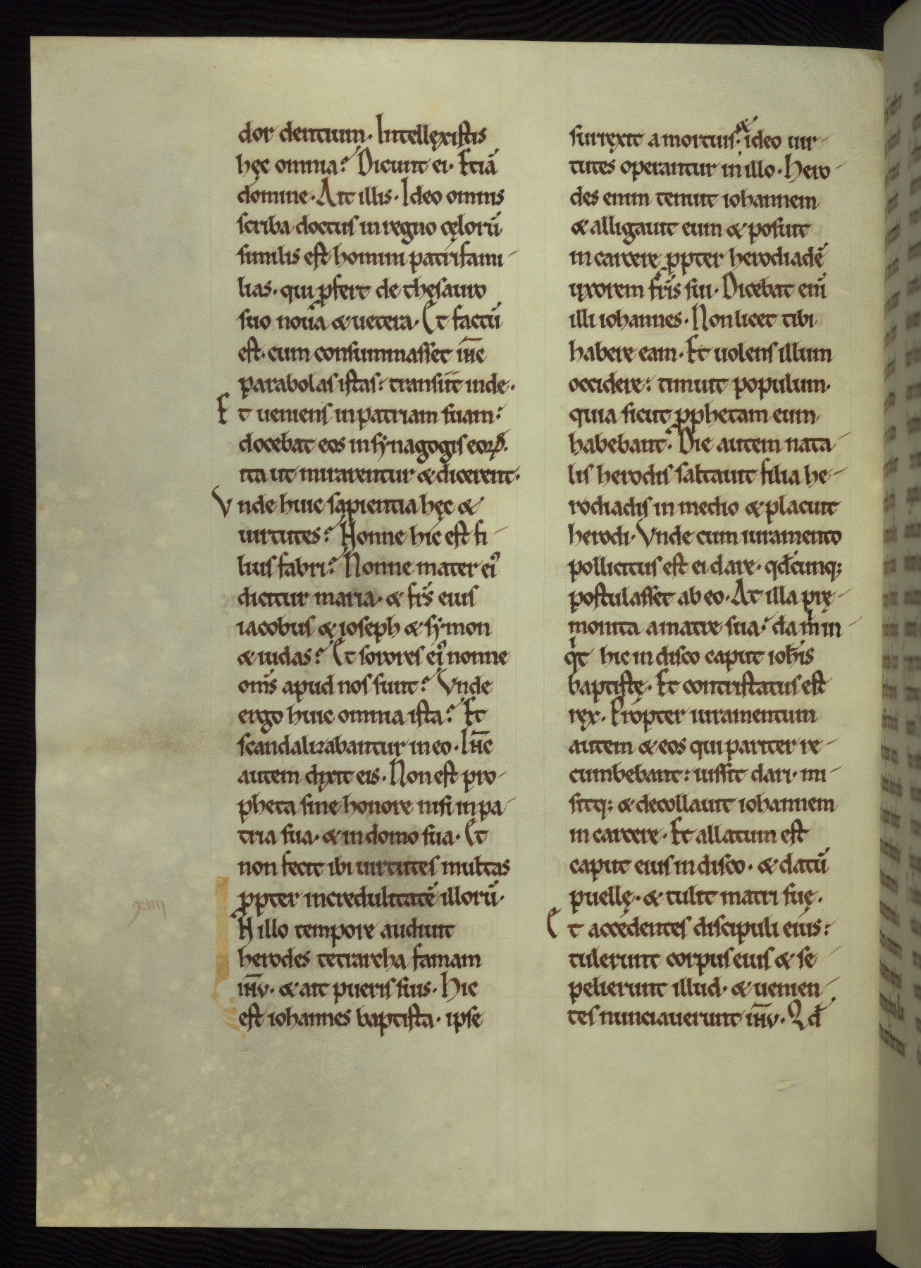 This large-format copy of the New Testament was almost certainly created at Rochester Cathedral Priory, England, in the first half of the twelfth century. It was part of a five-volume Bible, only one other volume of which, London, British Library Ms. Royal I.C.VII, has survived. The decorated initials in these manuscripts compare closely with those in other books securely attributed to Rochester. Textually these books are closely related to the Gundulph Bible (San Marino, Huntington Library Ms. HM 62), known to have been produced at Rochester in the second half of the eleventh century. Although neither the Walters' nor the British Library's volume includes an inscription associating this Bible with Rochester, the two medieval catalogs of the Rochester Cathedral library, produced around 1130 and in 1202, contain references to manuscripts that correspond well with them. The book’s large size indicates it that was designed to be read aloud, either during services or at meals in the refectory. Large, fanciful initials filled with succulent foliage, fruit, dragons, animals, and human faces begin each section of the text. Executed in a vibrant palette of red, blue, green, ochre (in place of gold), and yellow, the intricate, dynamic designs capture the essence of Romanesque manuscript illumination. Royal I.C.VII also includes four historiated initials (for the books of Joshua, I Samuel, 2 Samuel, and 2 Kings). Although the Bible was made at Rochester, the pre-Gothic script of W.18 in particular is extremely close to that practiced at nearby Canterbury at the time.