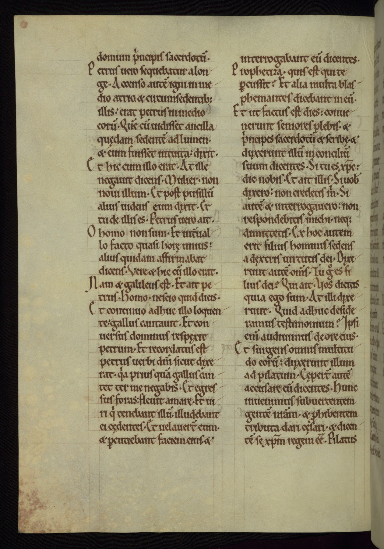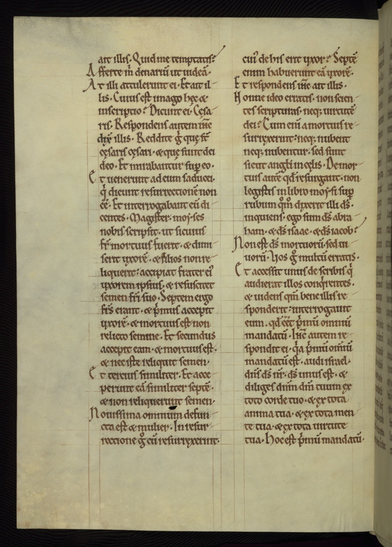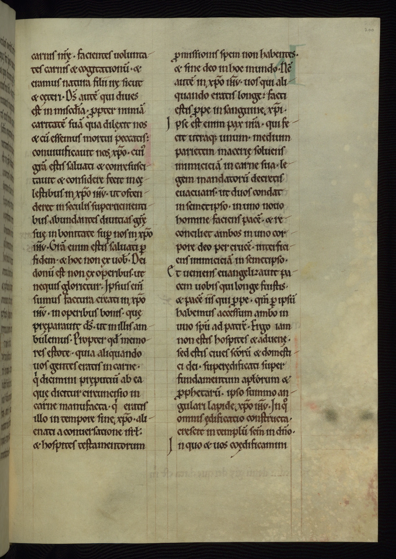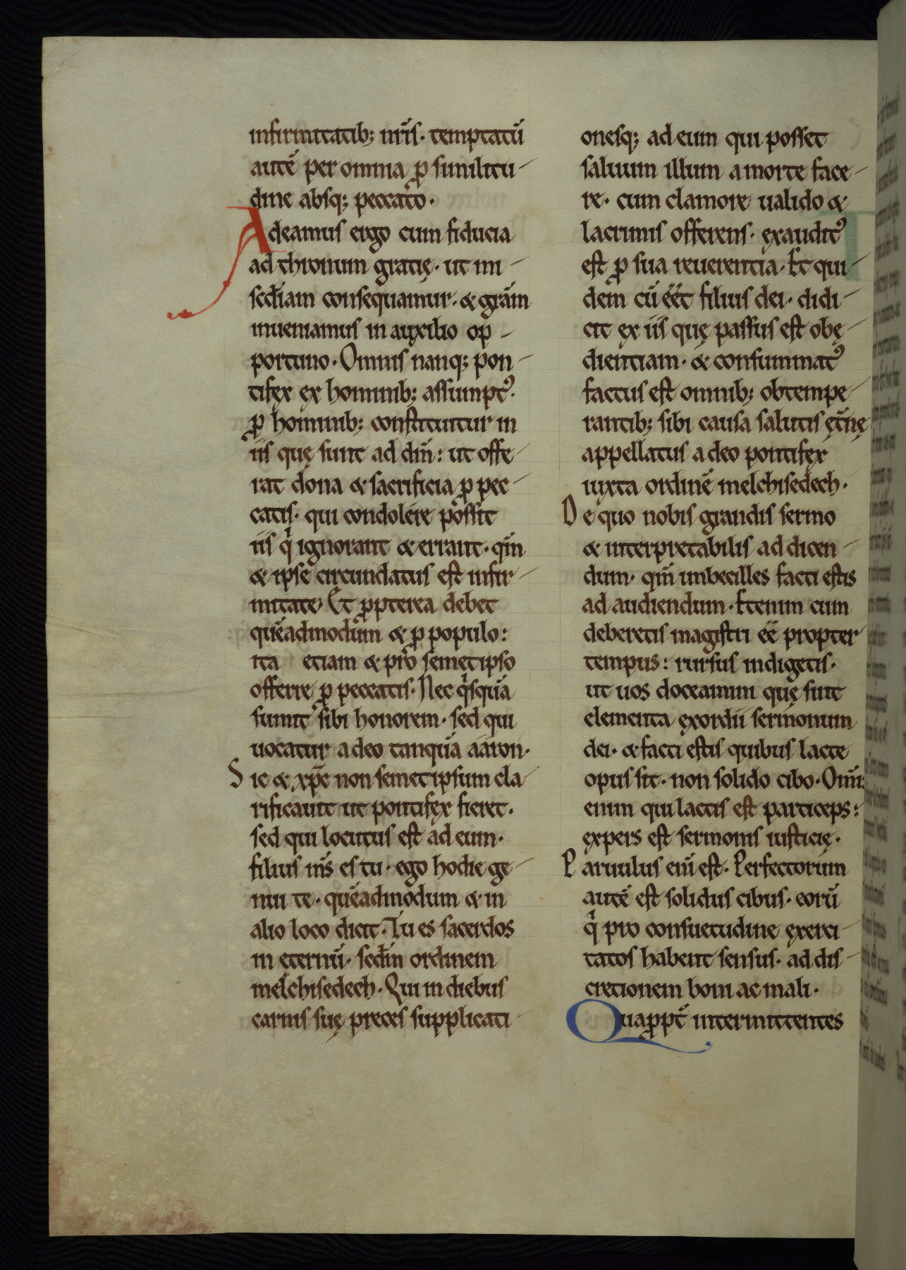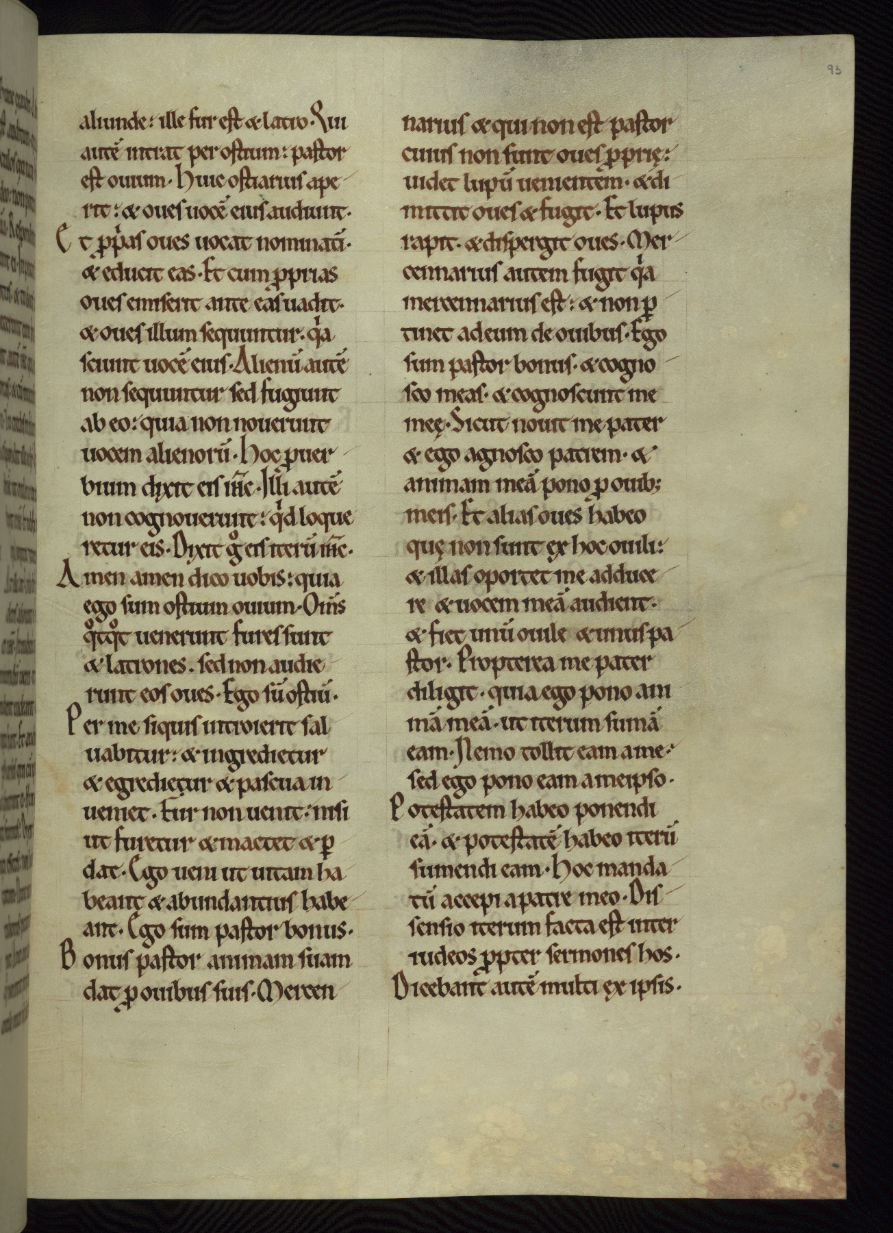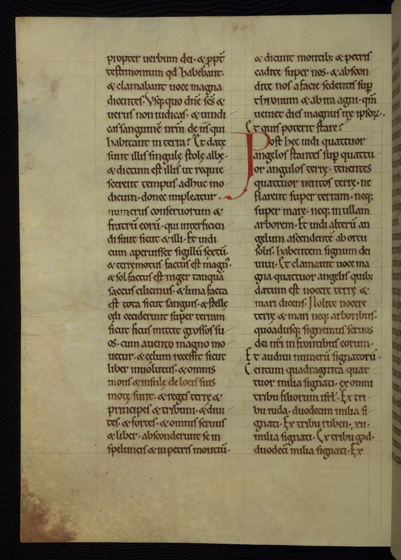This large-format copy of the New Testament was almost certainly created at Rochester Cathedral Priory, England, in the first half of the twelfth century. It was part of a five-volume Bible, only one other volume of which, London, British Library Ms. Royal I.C.VII, has survived. The decorated initials in these manuscripts compare closely with those in other books securely attributed to Rochester. Textually these books are closely related to the Gundulph Bible (San Marino, Huntington Library Ms. HM 62), known to have been produced at Rochester in the second half of the eleventh century. Although neither the Walters' nor the British Library's volume includes an inscription associating this Bible with Rochester, the two medieval catalogs of the Rochester Cathedral library, produced around 1130 and in 1202, contain references to manuscripts that correspond well with them. The book’s large size indicates it that was designed to be read aloud, either during services or at meals in the refectory. Large, fanciful initials filled with succulent foliage, fruit, dragons, animals, and human faces begin each section of the text. Executed in a vibrant palette of red, blue, green, ochre (in place of gold), and yellow, the intricate, dynamic designs capture the essence of Romanesque manuscript illumination. Royal I.C.VII also includes four historiated initials (for the books of Joshua, I Samuel, 2 Samuel, and 2 Kings). Although the Bible was made at Rochester, the pre-Gothic script of W.18 in particular is extremely close to that practiced at nearby Canterbury at the time.