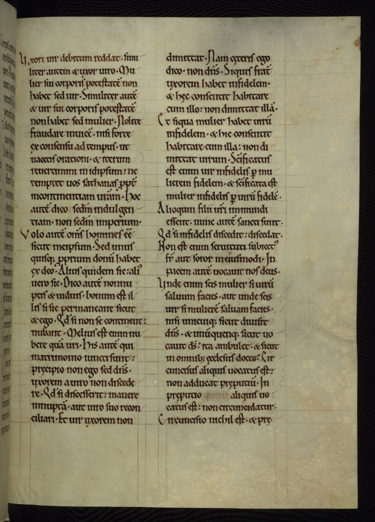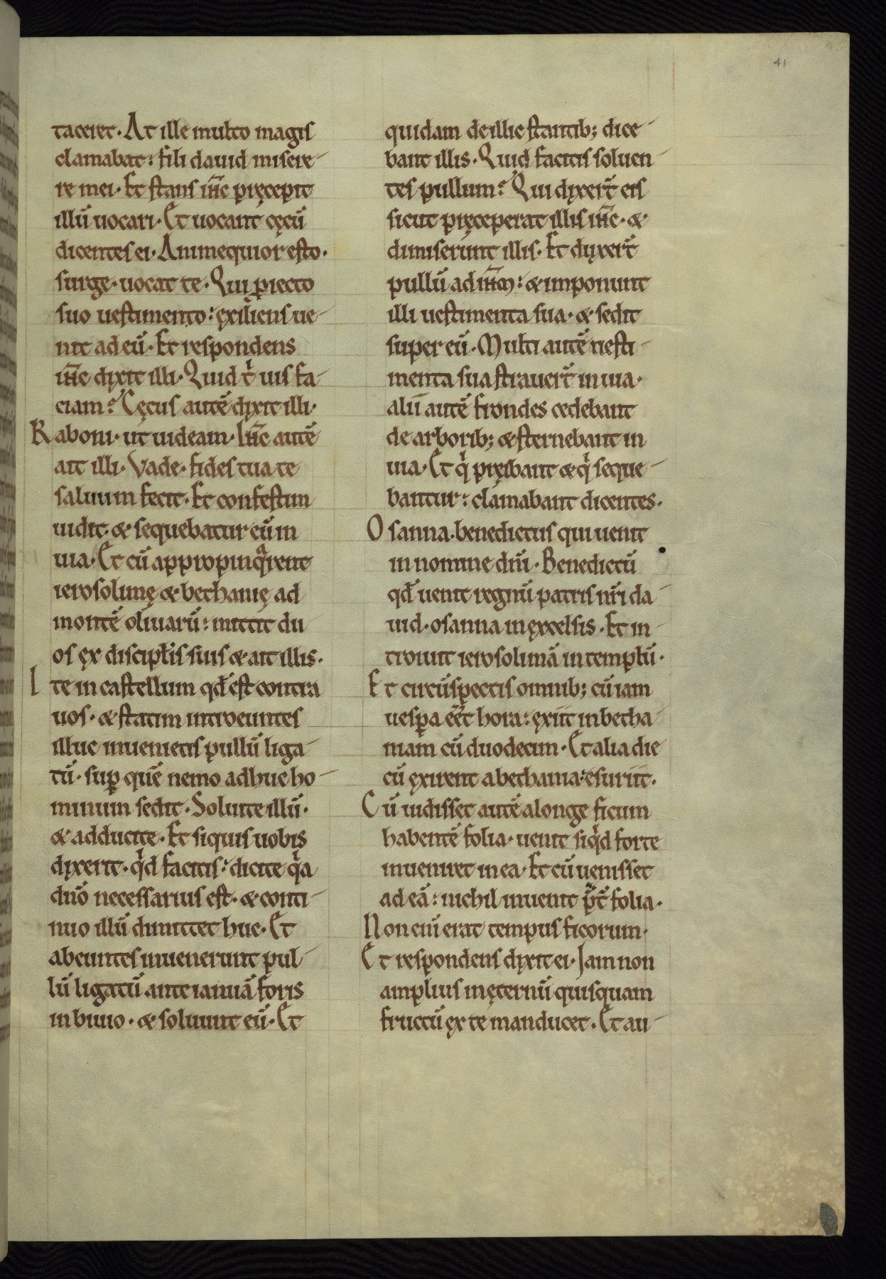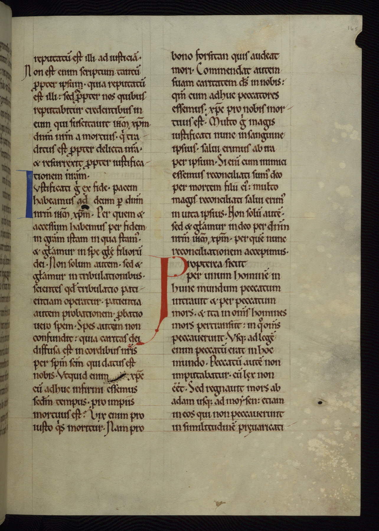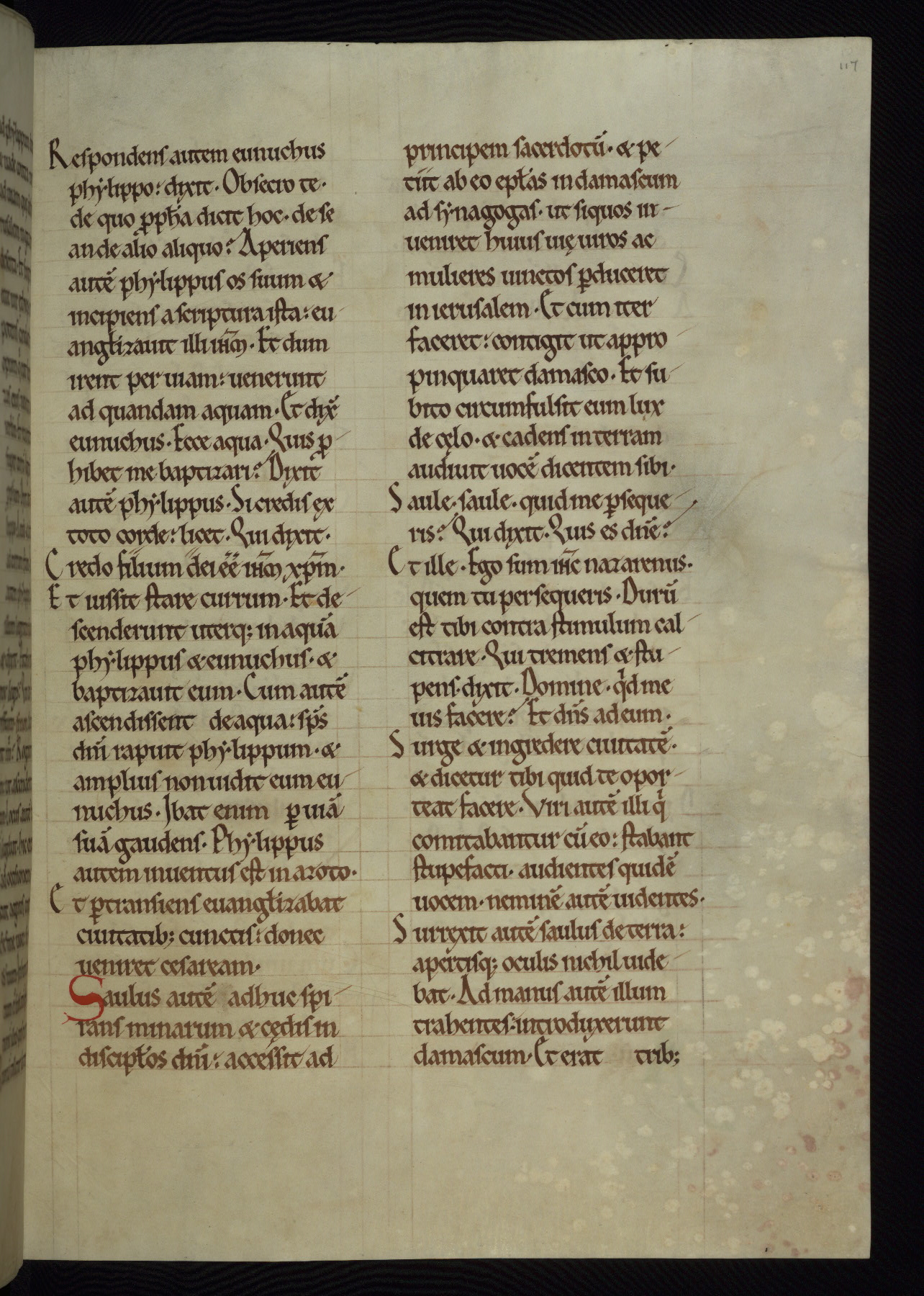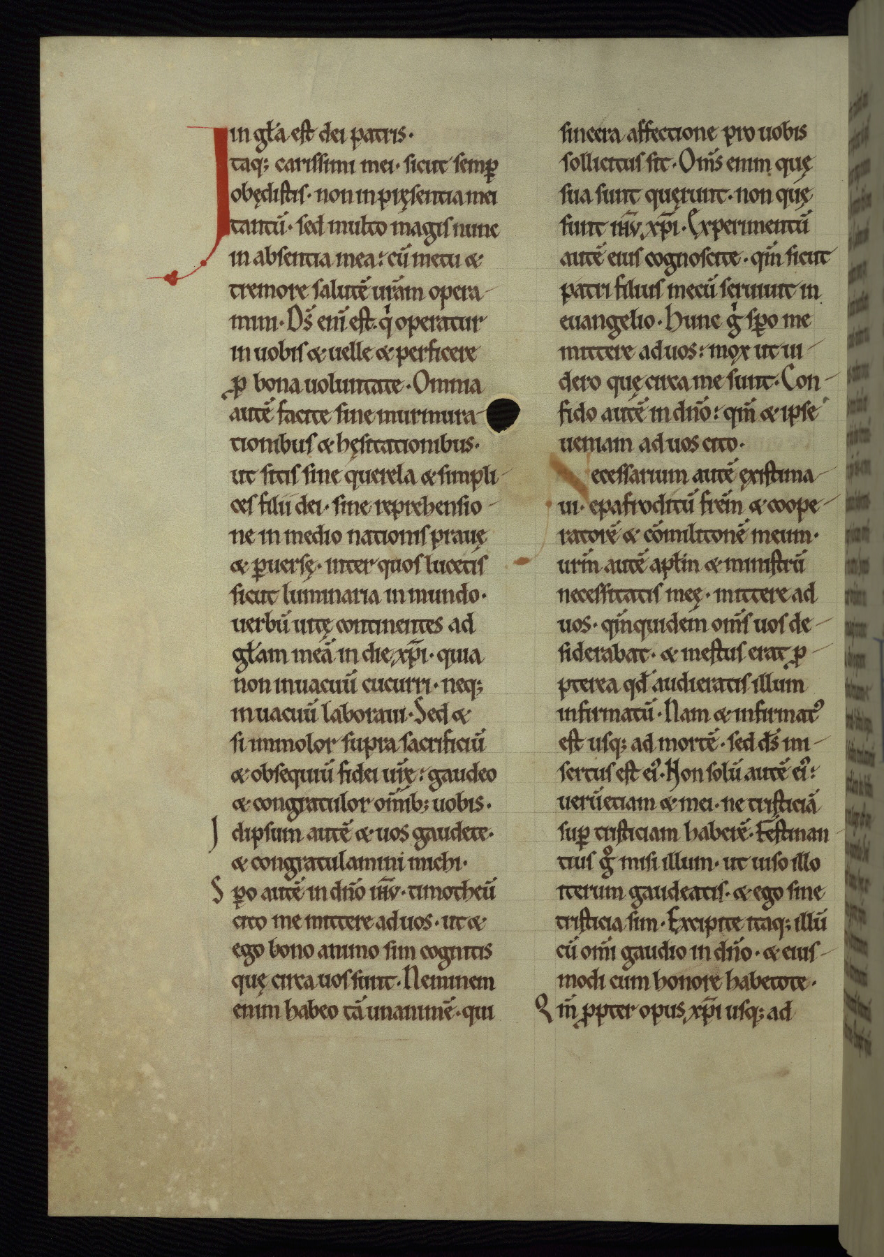 This large-format copy of the New Testament was almost certainly created at Rochester Cathedral Priory, England, in the first half of the twelfth century. It was part of a five-volume Bible, only one other volume of which, London, British Library Ms. Royal I.C.VII, has survived. The decorated initials in these manuscripts compare closely with those in other books securely attributed to Rochester. Textually these books are closely related to the Gundulph Bible (San Marino, Huntington Library Ms. HM 62), known to have been produced at Rochester in the second half of the eleventh century. Although neither the Walters' nor the British Library's volume includes an inscription associating this Bible with Rochester, the two medieval catalogs of the Rochester Cathedral library, produced around 1130 and in 1202, contain references to manuscripts that correspond well with them. The book’s large size indicates it that was designed to be read aloud, either during services or at meals in the refectory. Large, fanciful initials filled with succulent foliage, fruit, dragons, animals, and human faces begin each section of the text. Executed in a vibrant palette of red, blue, green, ochre (in place of gold), and yellow, the intricate, dynamic designs capture the essence of Romanesque manuscript illumination. Royal I.C.VII also includes four historiated initials (for the books of Joshua, I Samuel, 2 Samuel, and 2 Kings). Although the Bible was made at Rochester, the pre-Gothic script of W.18 in particular is extremely close to that practiced at nearby Canterbury at the time.