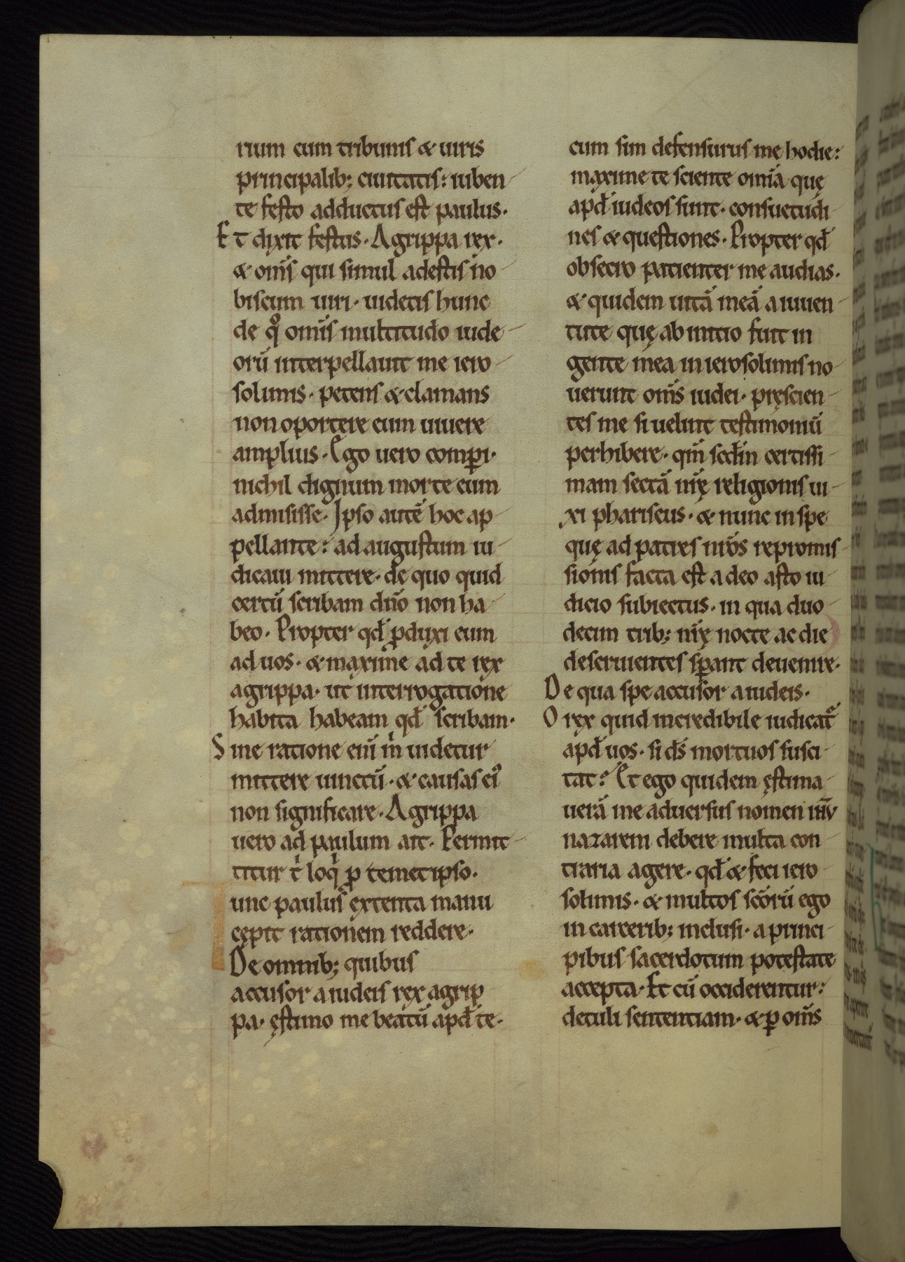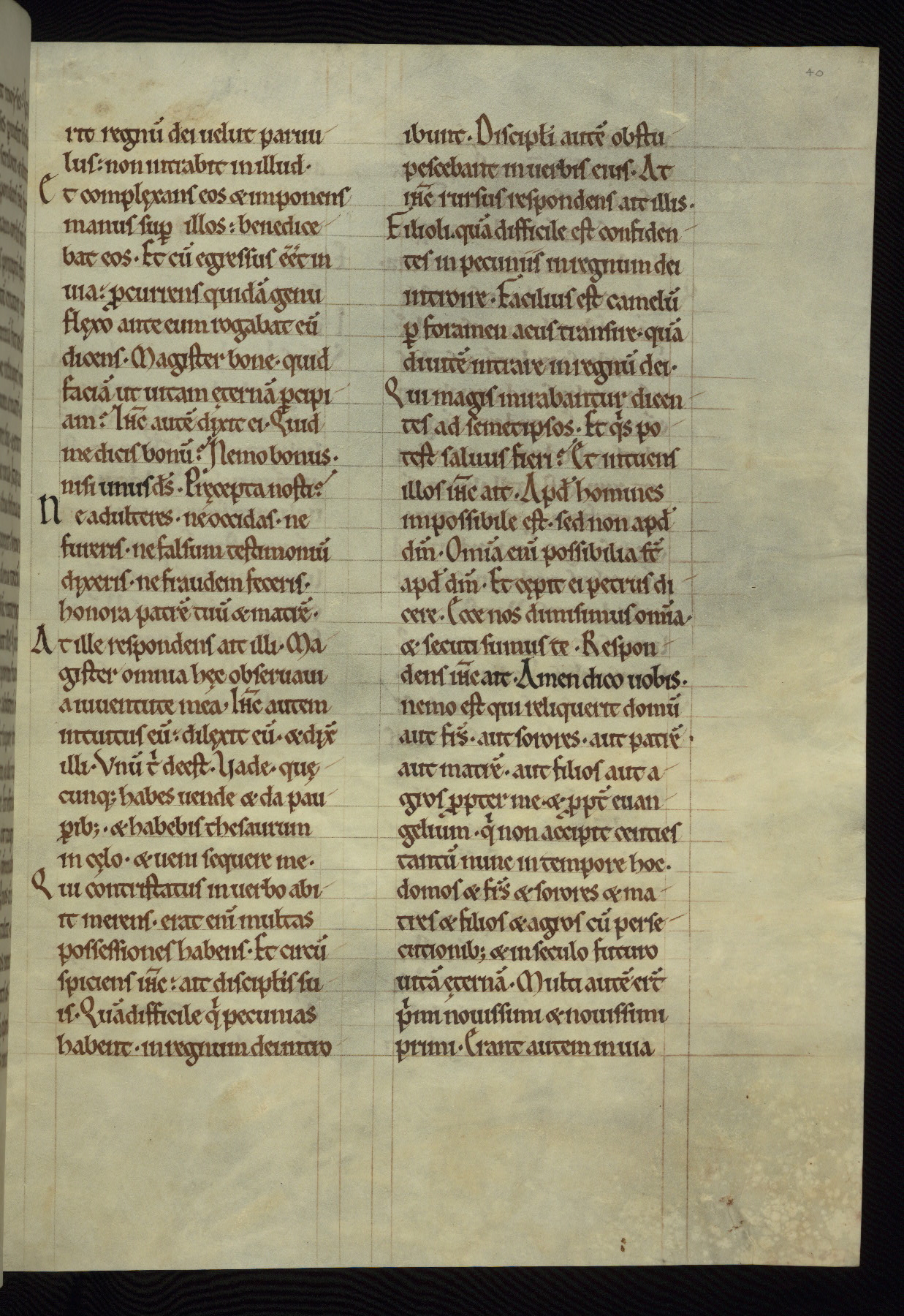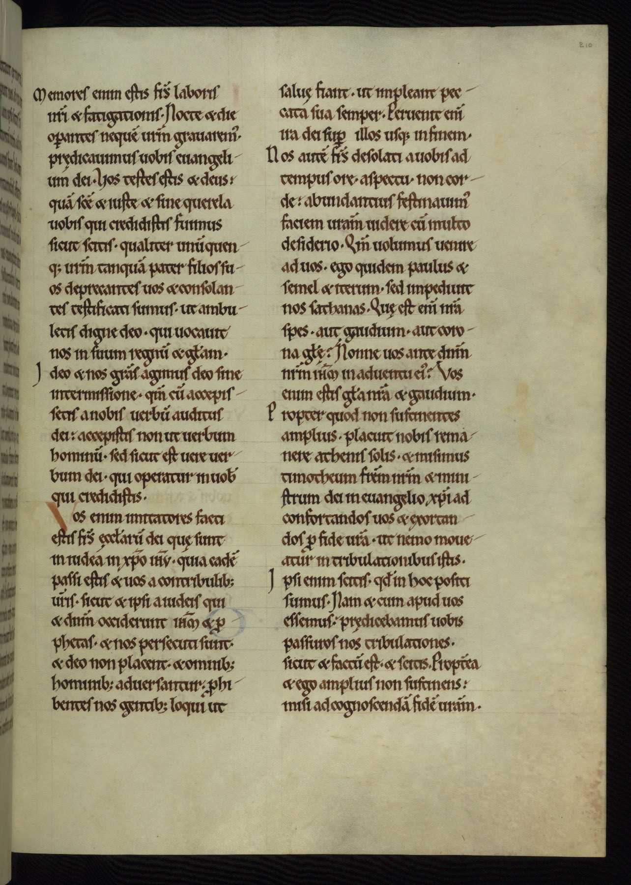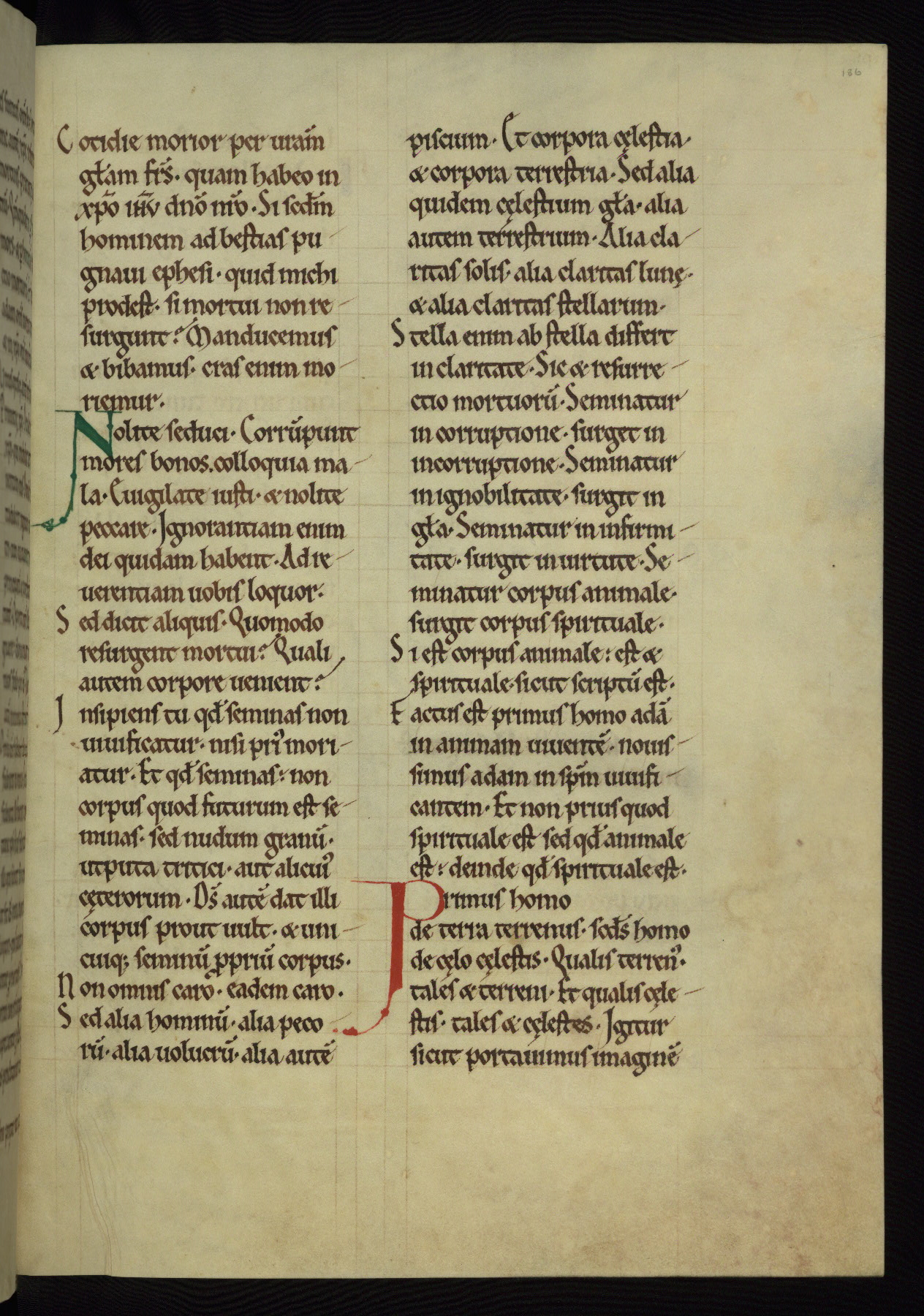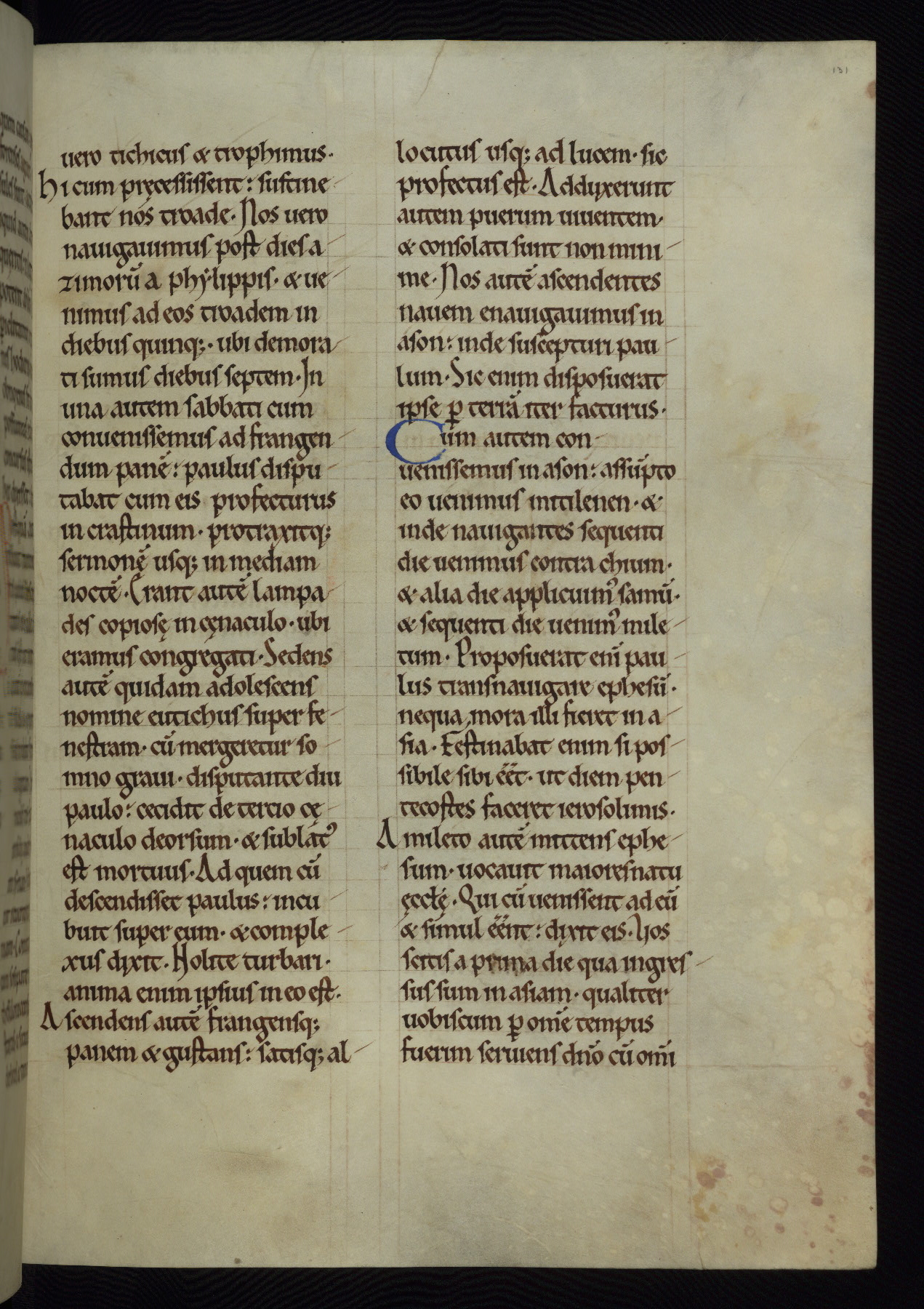 This large-format copy of the New Testament was almost certainly created at Rochester Cathedral Priory, England, in the first half of the twelfth century. It was part of a five-volume Bible, only one other volume of which, London, British Library Ms. Royal I.C.VII, has survived. The decorated initials in these manuscripts compare closely with those in other books securely attributed to Rochester. Textually these books are closely related to the Gundulph Bible (San Marino, Huntington Library Ms. HM 62), known to have been produced at Rochester in the second half of the eleventh century. Although neither the Walters' nor the British Library's volume includes an inscription associating this Bible with Rochester, the two medieval catalogs of the Rochester Cathedral library, produced around 1130 and in 1202, contain references to manuscripts that correspond well with them. The book’s large size indicates it that was designed to be read aloud, either during services or at meals in the refectory. Large, fanciful initials filled with succulent foliage, fruit, dragons, animals, and human faces begin each section of the text. Executed in a vibrant palette of red, blue, green, ochre (in place of gold), and yellow, the intricate, dynamic designs capture the essence of Romanesque manuscript illumination. Royal I.C.VII also includes four historiated initials (for the books of Joshua, I Samuel, 2 Samuel, and 2 Kings). Although the Bible was made at Rochester, the pre-Gothic script of W.18 in particular is extremely close to that practiced at nearby Canterbury at the time.