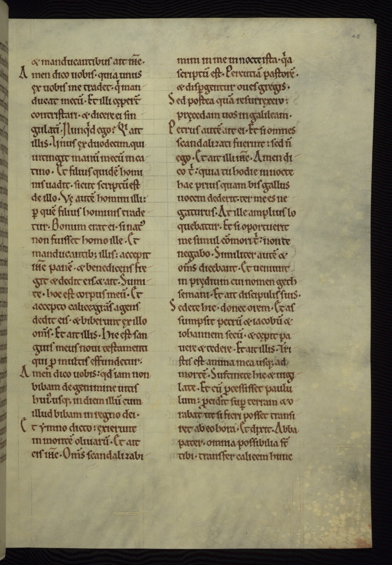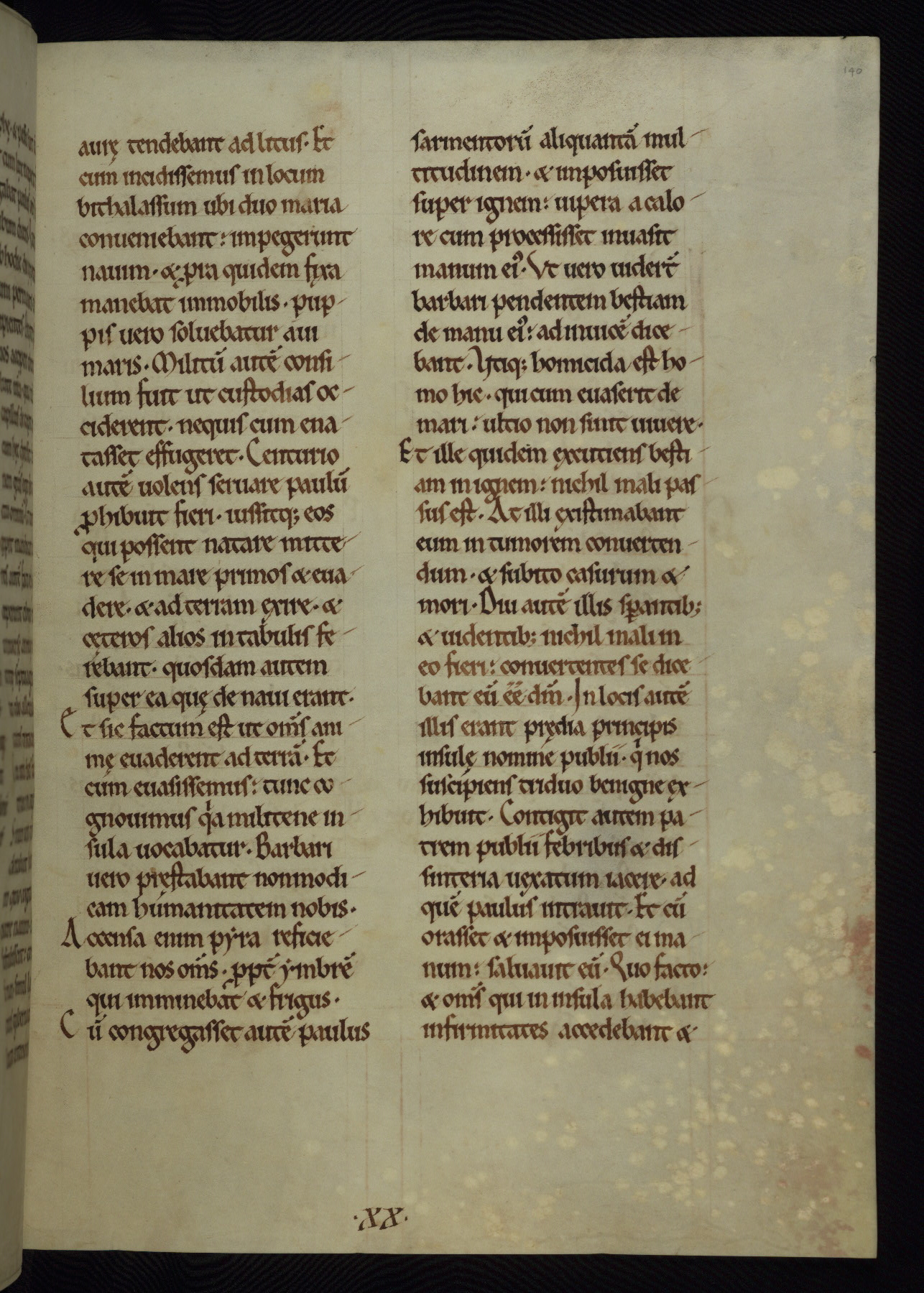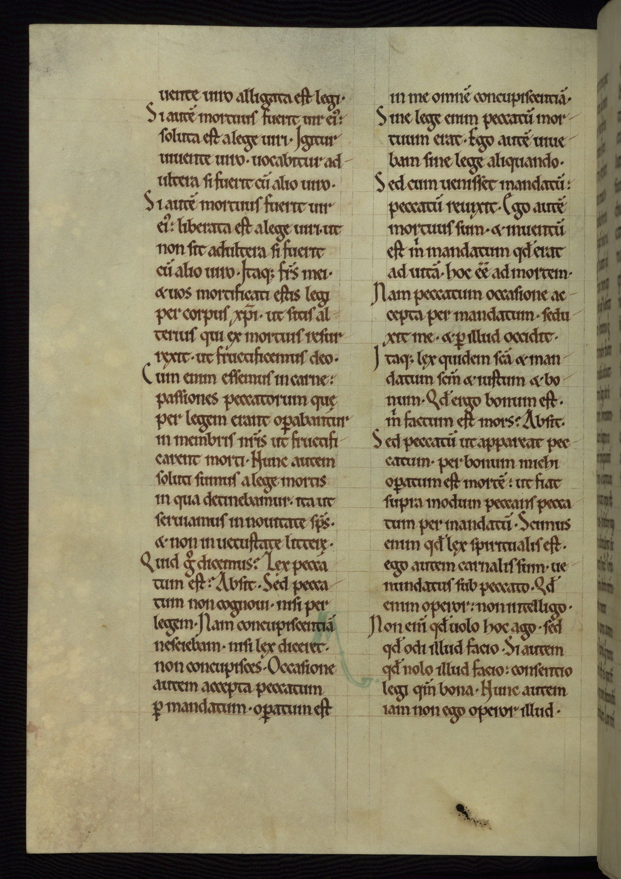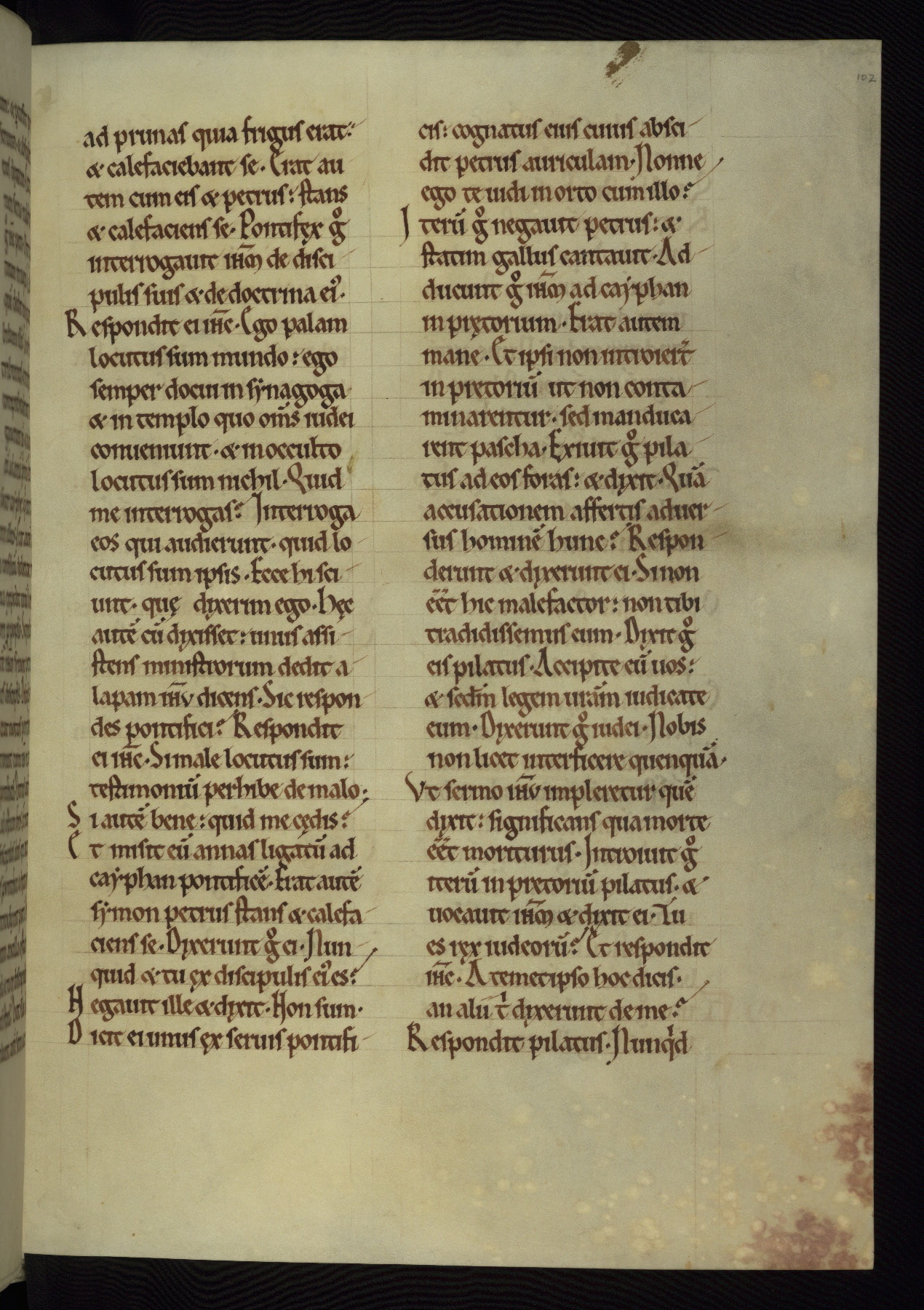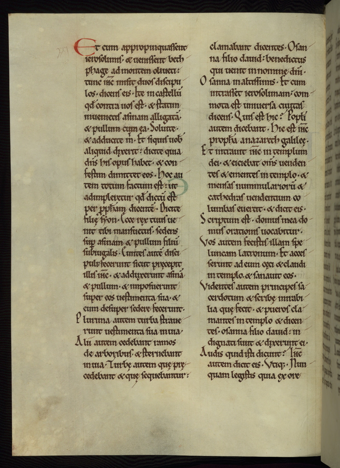 This large-format copy of the New Testament was almost certainly created at Rochester Cathedral Priory, England, in the first half of the twelfth century. It was part of a five-volume Bible, only one other volume of which, London, British Library Ms. Royal I.C.VII, has survived. The decorated initials in these manuscripts compare closely with those in other books securely attributed to Rochester. Textually these books are closely related to the Gundulph Bible (San Marino, Huntington Library Ms. HM 62), known to have been produced at Rochester in the second half of the eleventh century. Although neither the Walters' nor the British Library's volume includes an inscription associating this Bible with Rochester, the two medieval catalogs of the Rochester Cathedral library, produced around 1130 and in 1202, contain references to manuscripts that correspond well with them. The book’s large size indicates it that was designed to be read aloud, either during services or at meals in the refectory. Large, fanciful initials filled with succulent foliage, fruit, dragons, animals, and human faces begin each section of the text. Executed in a vibrant palette of red, blue, green, ochre (in place of gold), and yellow, the intricate, dynamic designs capture the essence of Romanesque manuscript illumination. Royal I.C.VII also includes four historiated initials (for the books of Joshua, I Samuel, 2 Samuel, and 2 Kings). Although the Bible was made at Rochester, the pre-Gothic script of W.18 in particular is extremely close to that practiced at nearby Canterbury at the time.