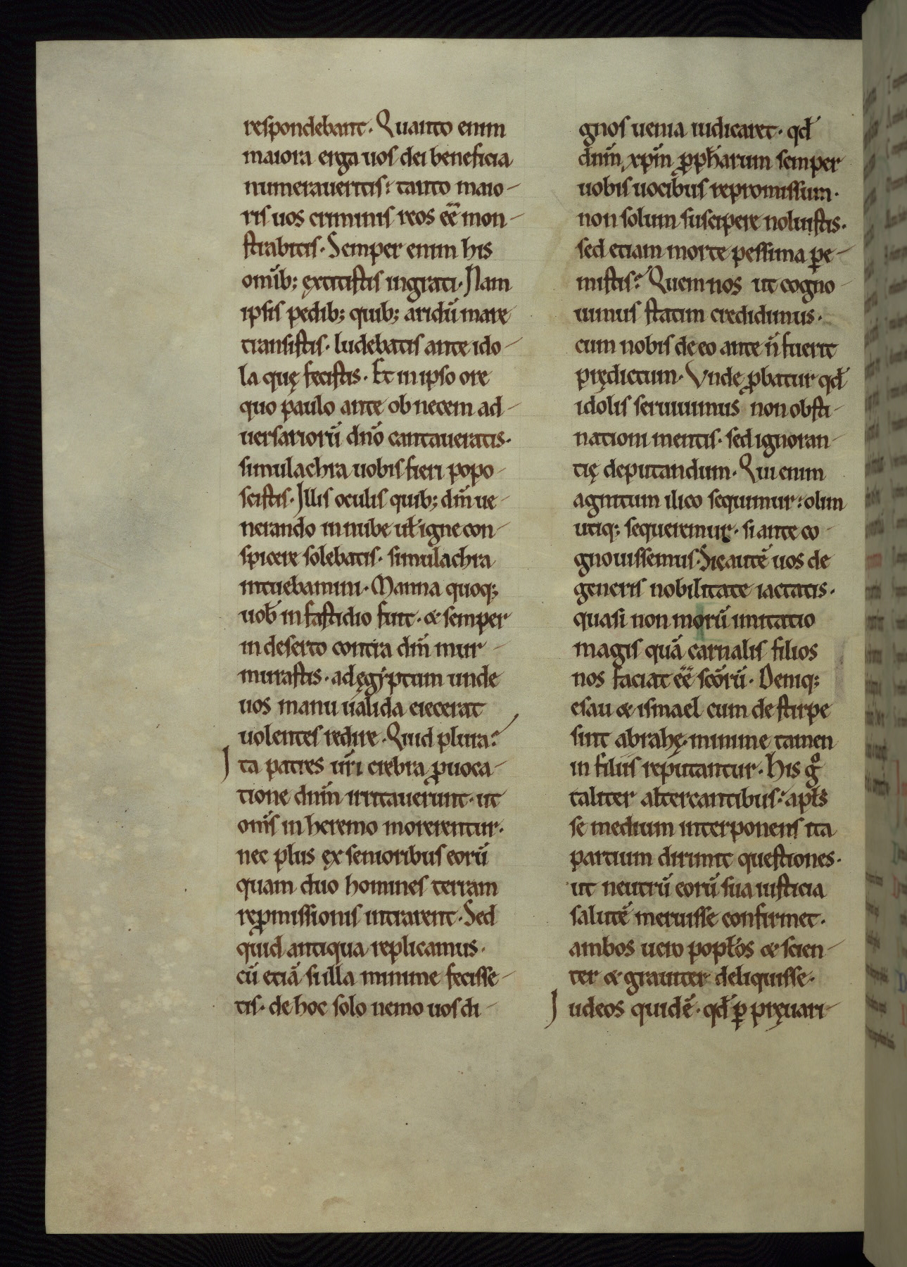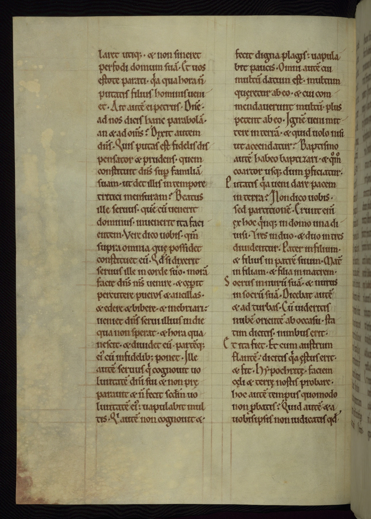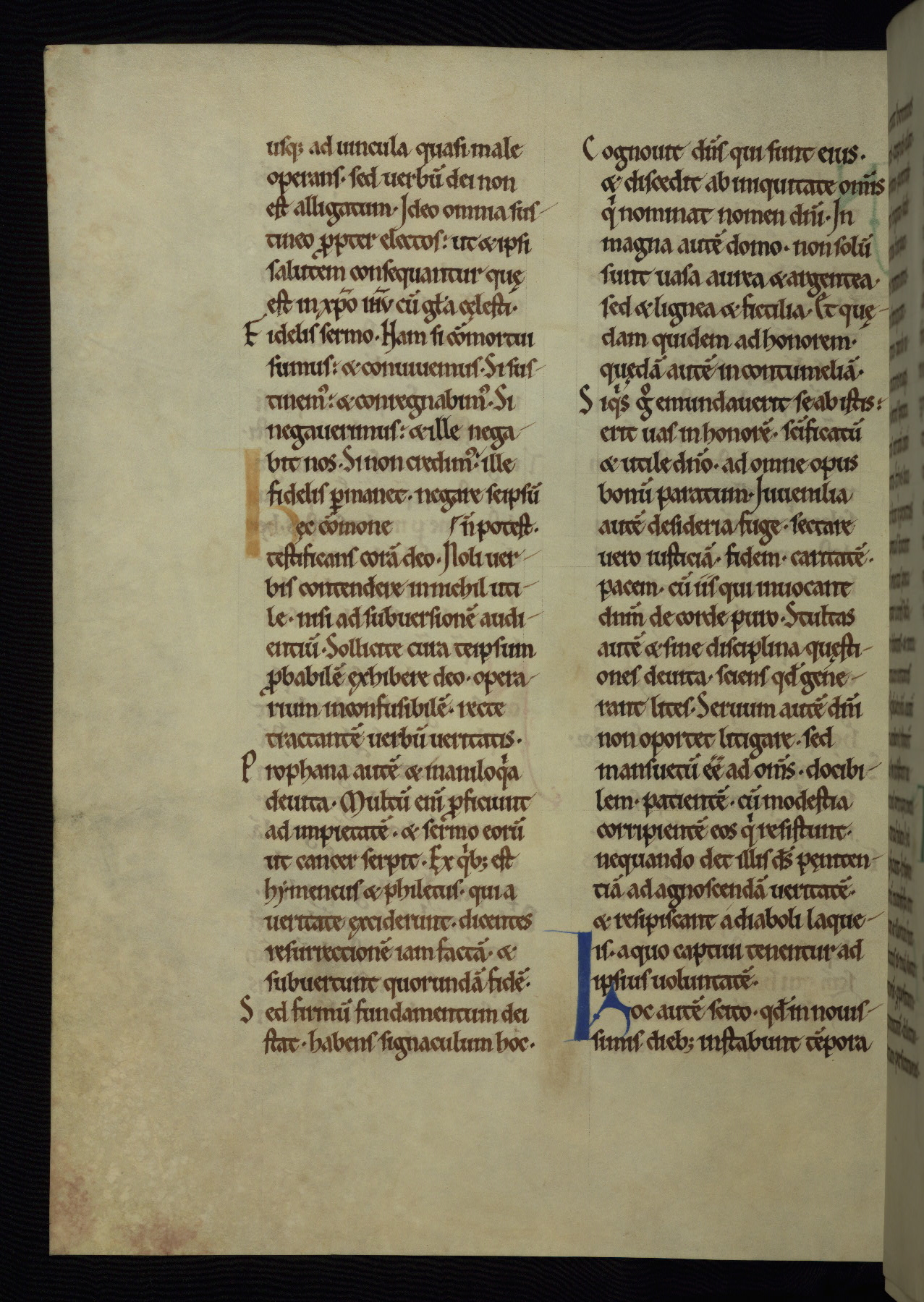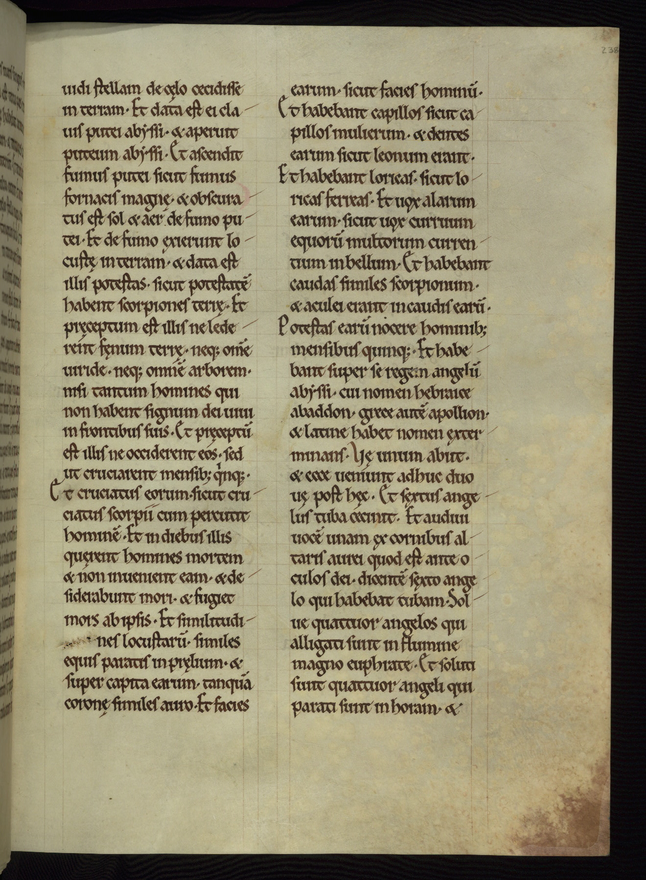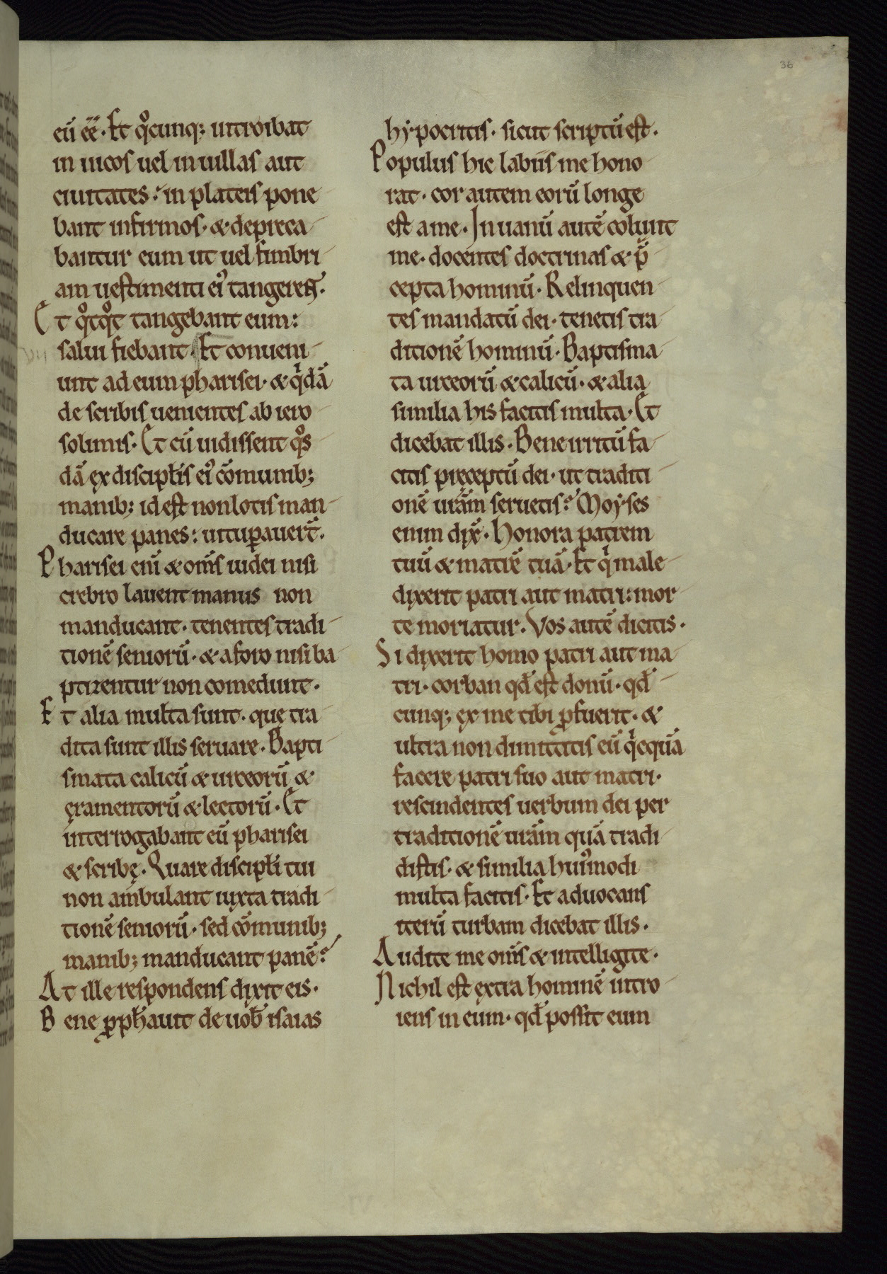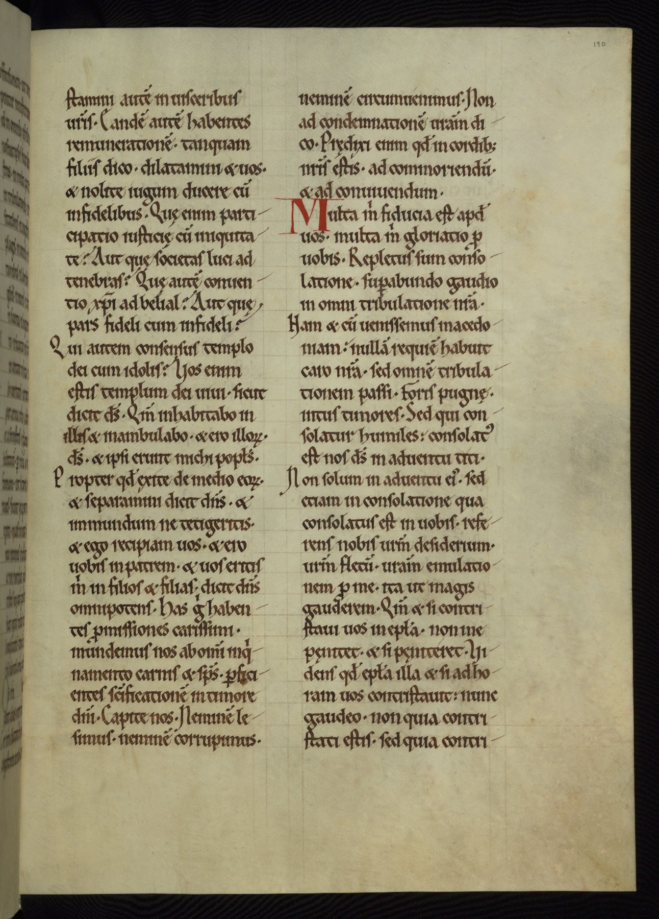 This large-format copy of the New Testament was almost certainly created at Rochester Cathedral Priory, England, in the first half of the twelfth century. It was part of a five-volume Bible, only one other volume of which, London, British Library Ms. Royal I.C.VII, has survived. The decorated initials in these manuscripts compare closely with those in other books securely attributed to Rochester. Textually these books are closely related to the Gundulph Bible (San Marino, Huntington Library Ms. HM 62), known to have been produced at Rochester in the second half of the eleventh century. Although neither the Walters' nor the British Library's volume includes an inscription associating this Bible with Rochester, the two medieval catalogs of the Rochester Cathedral library, produced around 1130 and in 1202, contain references to manuscripts that correspond well with them. The book’s large size indicates it that was designed to be read aloud, either during services or at meals in the refectory. Large, fanciful initials filled with succulent foliage, fruit, dragons, animals, and human faces begin each section of the text. Executed in a vibrant palette of red, blue, green, ochre (in place of gold), and yellow, the intricate, dynamic designs capture the essence of Romanesque manuscript illumination. Royal I.C.VII also includes four historiated initials (for the books of Joshua, I Samuel, 2 Samuel, and 2 Kings). Although the Bible was made at Rochester, the pre-Gothic script of W.18 in particular is extremely close to that practiced at nearby Canterbury at the time.