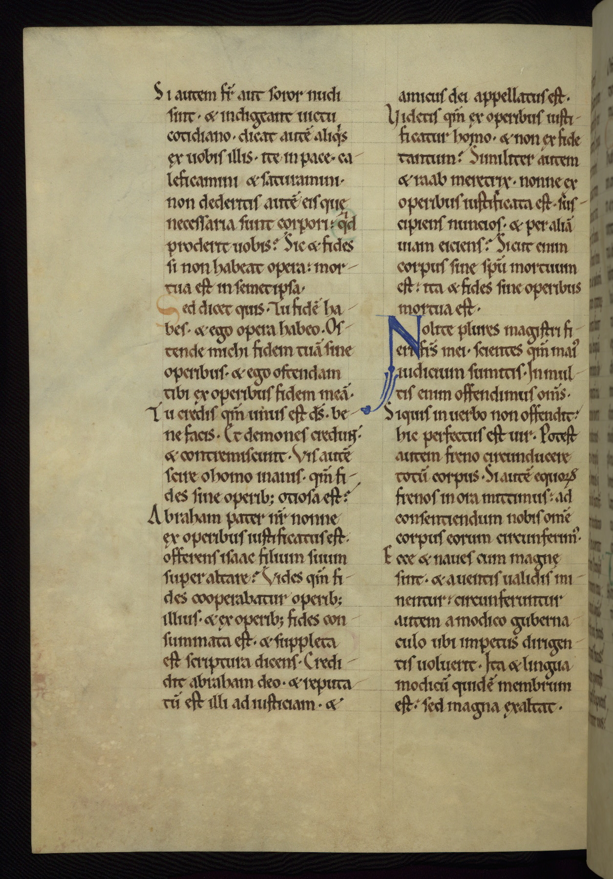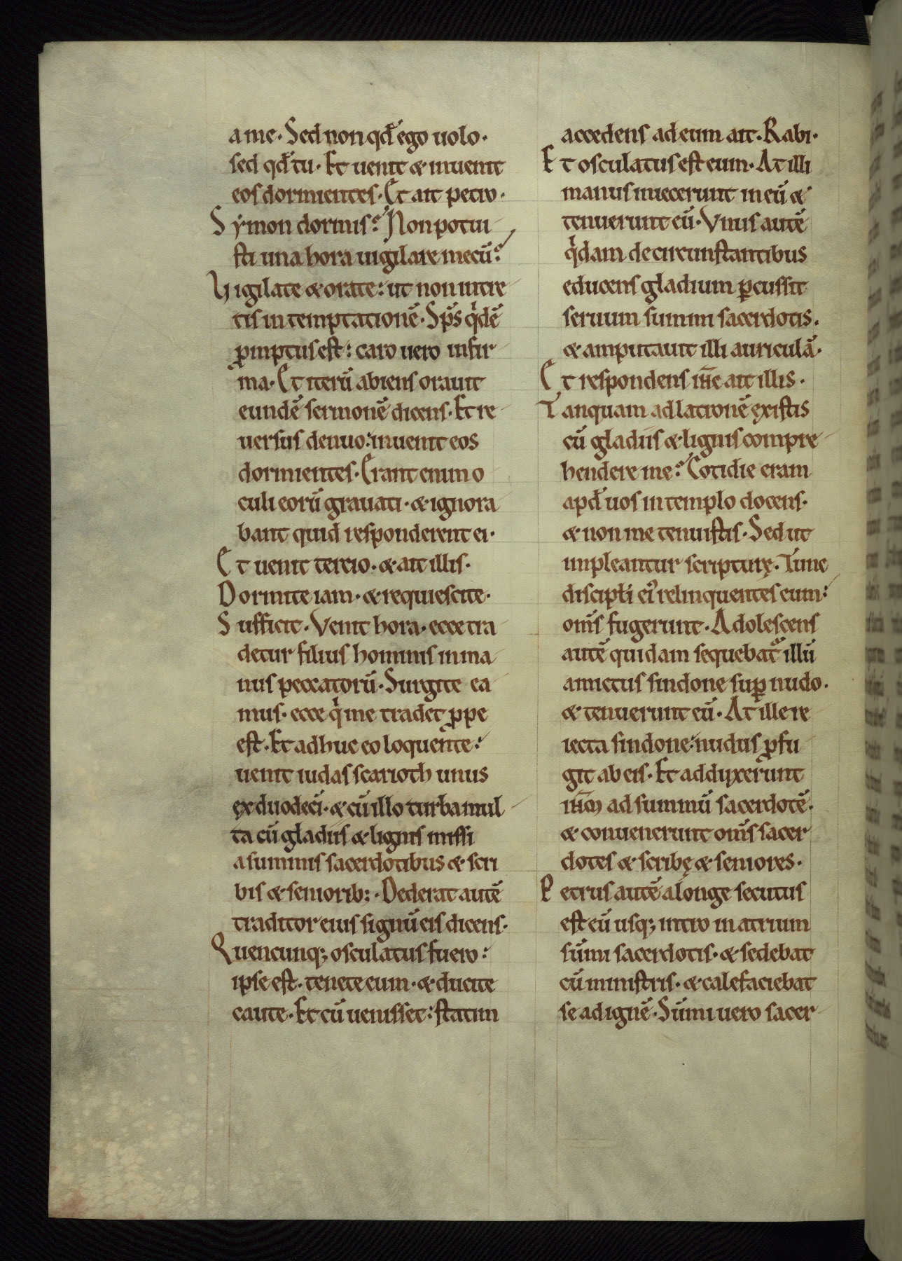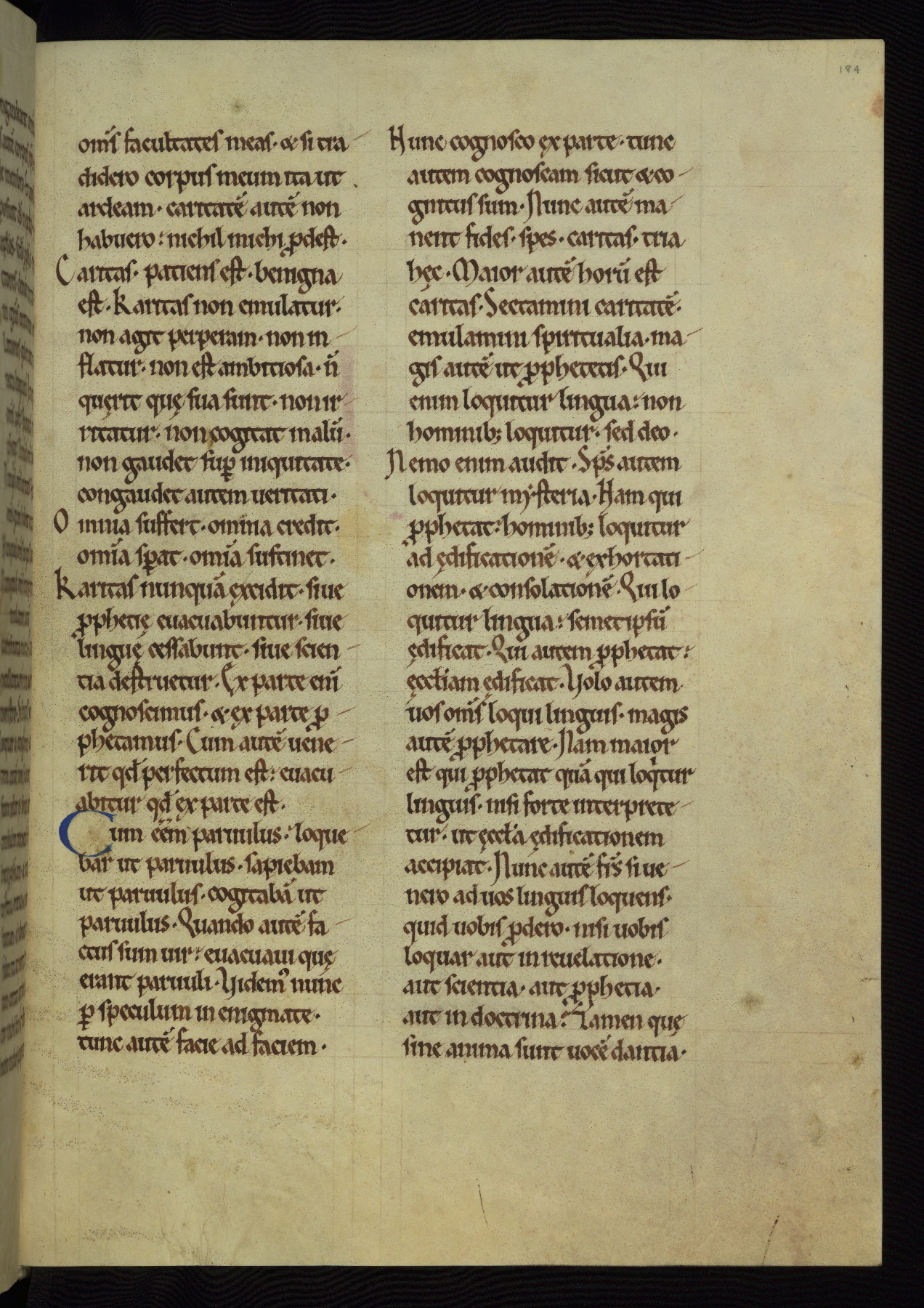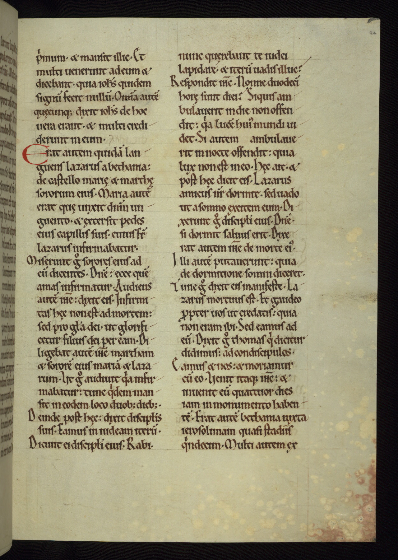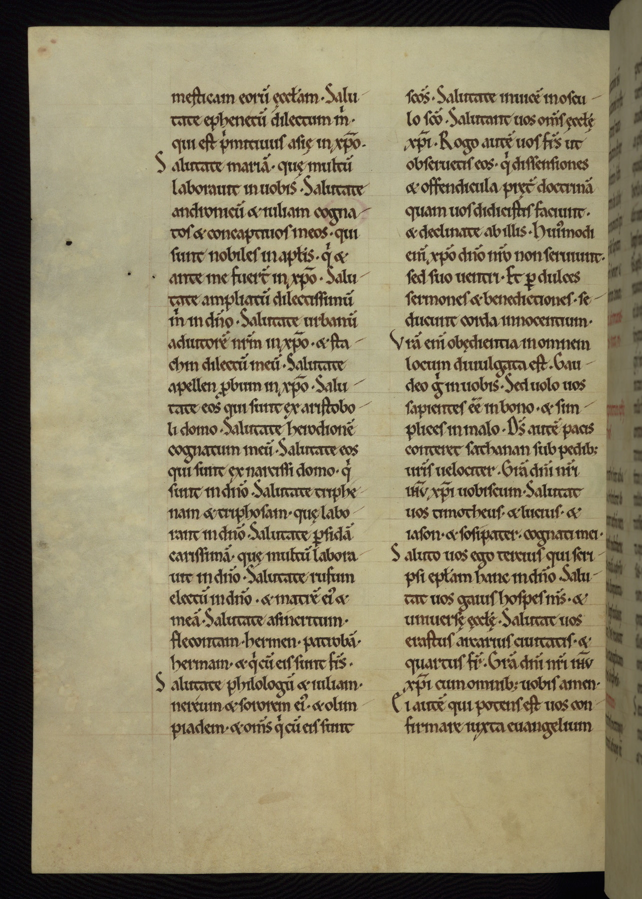 This large-format copy of the New Testament was almost certainly created at Rochester Cathedral Priory, England, in the first half of the twelfth century. It was part of a five-volume Bible, only one other volume of which, London, British Library Ms. Royal I.C.VII, has survived. The decorated initials in these manuscripts compare closely with those in other books securely attributed to Rochester. Textually these books are closely related to the Gundulph Bible (San Marino, Huntington Library Ms. HM 62), known to have been produced at Rochester in the second half of the eleventh century. Although neither the Walters' nor the British Library's volume includes an inscription associating this Bible with Rochester, the two medieval catalogs of the Rochester Cathedral library, produced around 1130 and in 1202, contain references to manuscripts that correspond well with them. The book’s large size indicates it that was designed to be read aloud, either during services or at meals in the refectory. Large, fanciful initials filled with succulent foliage, fruit, dragons, animals, and human faces begin each section of the text. Executed in a vibrant palette of red, blue, green, ochre (in place of gold), and yellow, the intricate, dynamic designs capture the essence of Romanesque manuscript illumination. Royal I.C.VII also includes four historiated initials (for the books of Joshua, I Samuel, 2 Samuel, and 2 Kings). Although the Bible was made at Rochester, the pre-Gothic script of W.18 in particular is extremely close to that practiced at nearby Canterbury at the time.