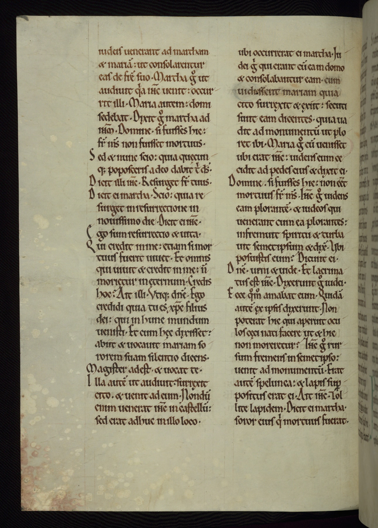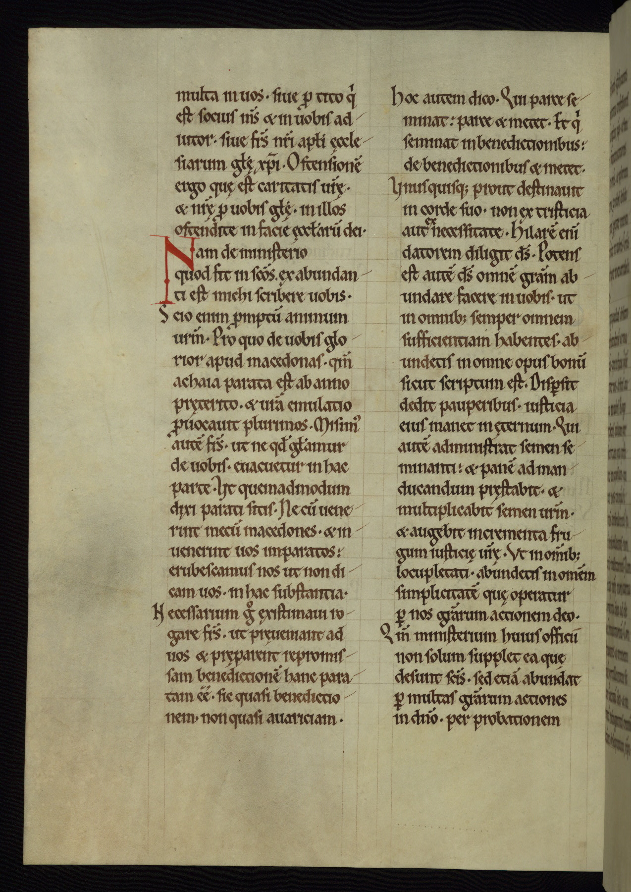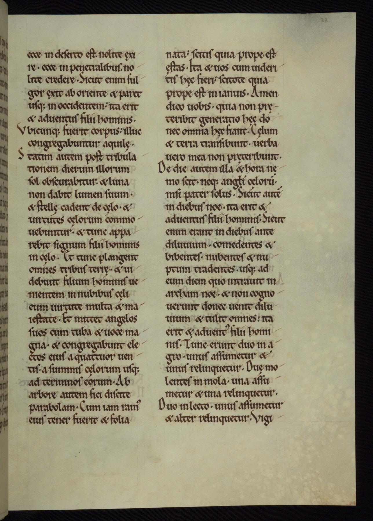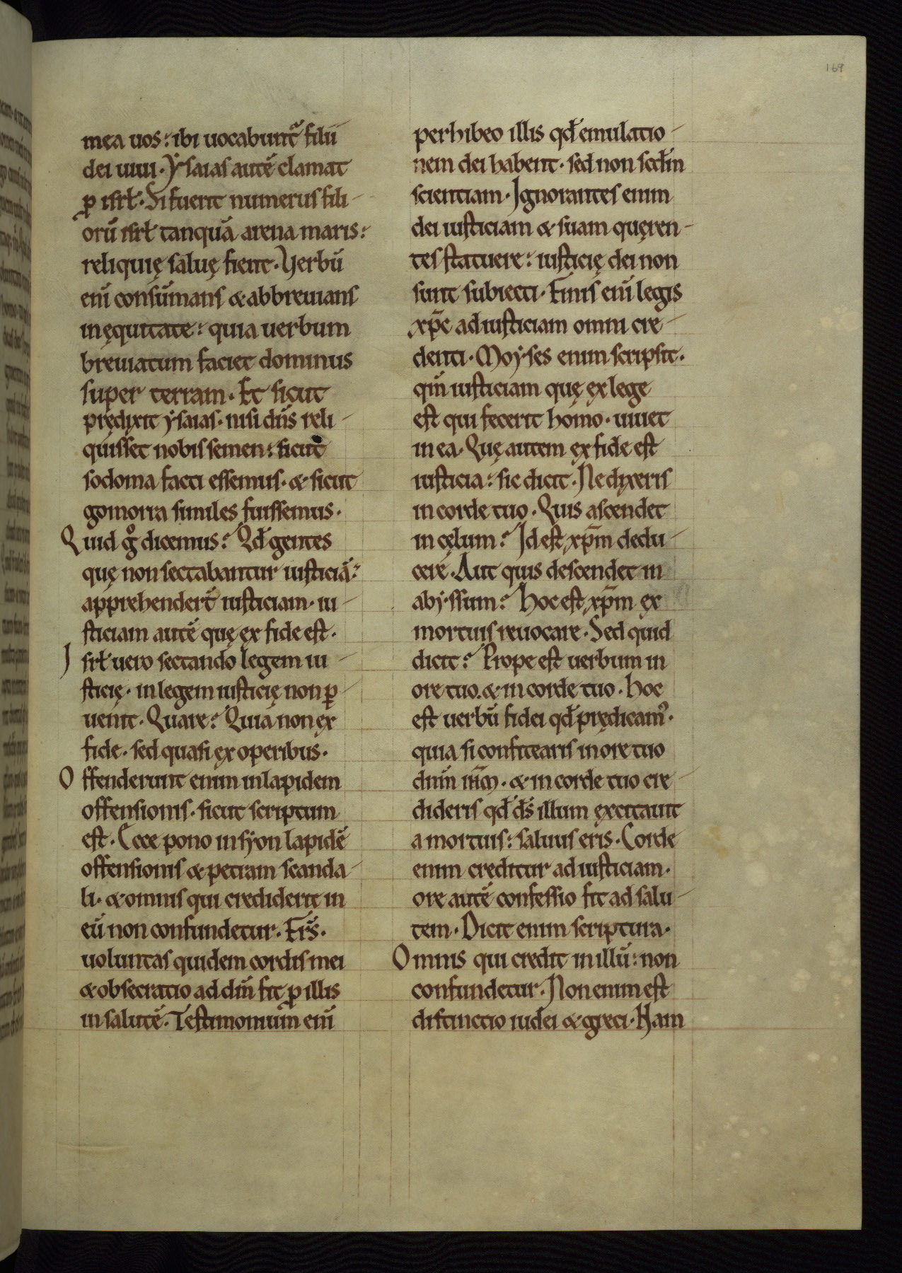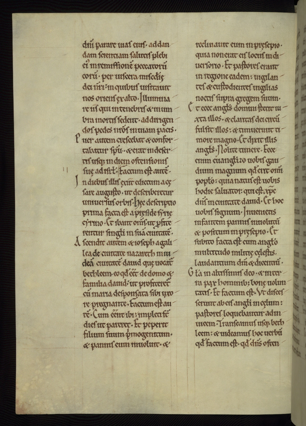 This large-format copy of the New Testament was almost certainly created at Rochester Cathedral Priory, England, in the first half of the twelfth century. It was part of a five-volume Bible, only one other volume of which, London, British Library Ms. Royal I.C.VII, has survived. The decorated initials in these manuscripts compare closely with those in other books securely attributed to Rochester. Textually these books are closely related to the Gundulph Bible (San Marino, Huntington Library Ms. HM 62), known to have been produced at Rochester in the second half of the eleventh century. Although neither the Walters' nor the British Library's volume includes an inscription associating this Bible with Rochester, the two medieval catalogs of the Rochester Cathedral library, produced around 1130 and in 1202, contain references to manuscripts that correspond well with them. The book’s large size indicates it that was designed to be read aloud, either during services or at meals in the refectory. Large, fanciful initials filled with succulent foliage, fruit, dragons, animals, and human faces begin each section of the text. Executed in a vibrant palette of red, blue, green, ochre (in place of gold), and yellow, the intricate, dynamic designs capture the essence of Romanesque manuscript illumination. Royal I.C.VII also includes four historiated initials (for the books of Joshua, I Samuel, 2 Samuel, and 2 Kings). Although the Bible was made at Rochester, the pre-Gothic script of W.18 in particular is extremely close to that practiced at nearby Canterbury at the time.