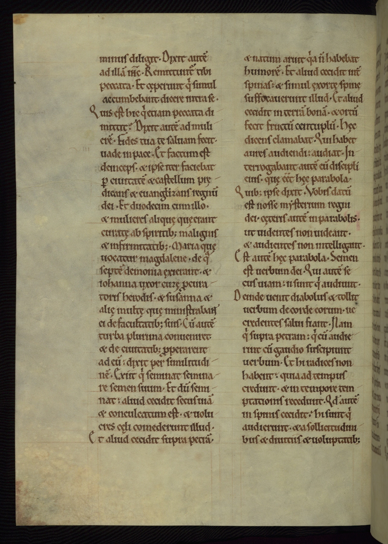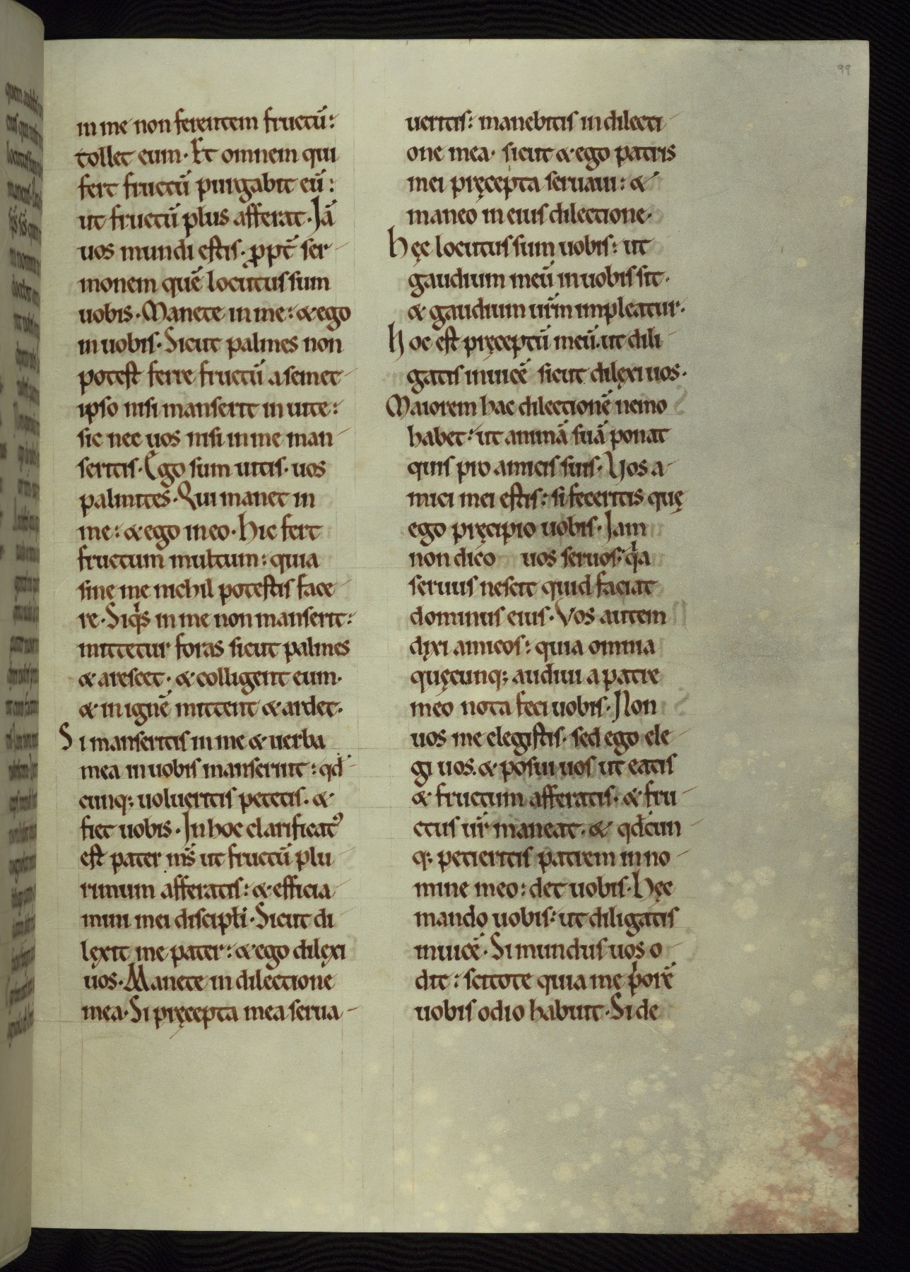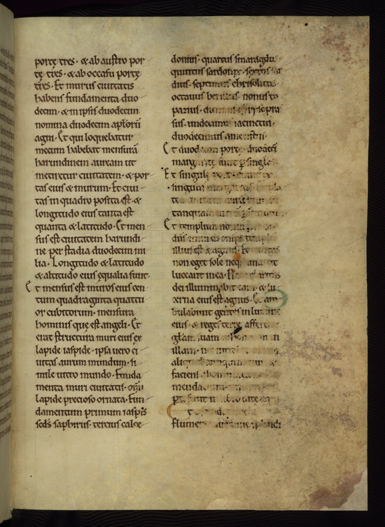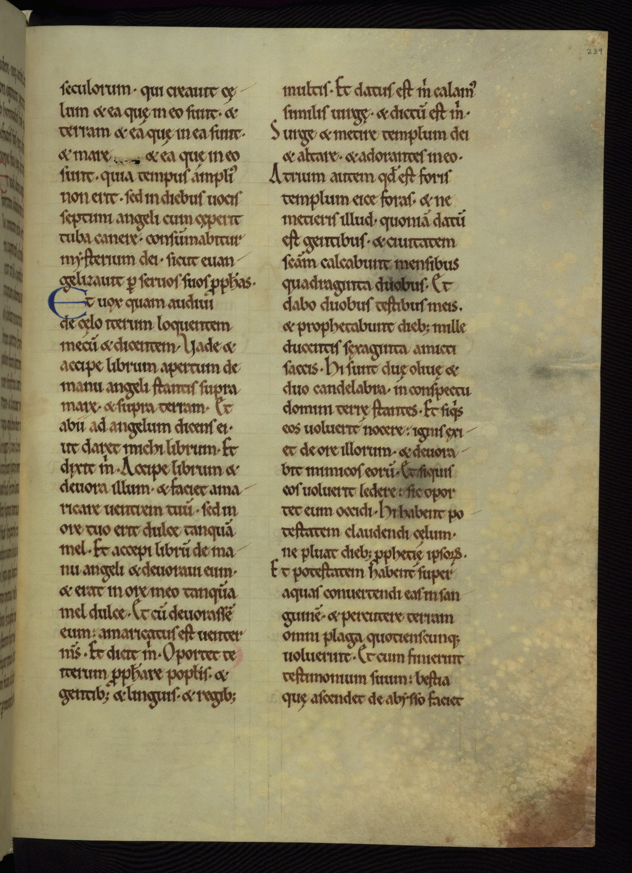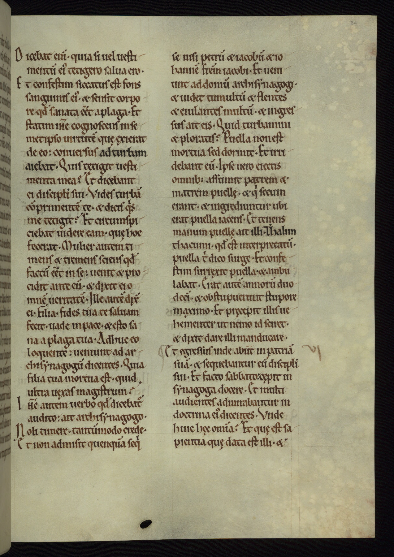 This large-format copy of the New Testament was almost certainly created at Rochester Cathedral Priory, England, in the first half of the twelfth century. It was part of a five-volume Bible, only one other volume of which, London, British Library Ms. Royal I.C.VII, has survived. The decorated initials in these manuscripts compare closely with those in other books securely attributed to Rochester. Textually these books are closely related to the Gundulph Bible (San Marino, Huntington Library Ms. HM 62), known to have been produced at Rochester in the second half of the eleventh century. Although neither the Walters' nor the British Library's volume includes an inscription associating this Bible with Rochester, the two medieval catalogs of the Rochester Cathedral library, produced around 1130 and in 1202, contain references to manuscripts that correspond well with them. The book’s large size indicates it that was designed to be read aloud, either during services or at meals in the refectory. Large, fanciful initials filled with succulent foliage, fruit, dragons, animals, and human faces begin each section of the text. Executed in a vibrant palette of red, blue, green, ochre (in place of gold), and yellow, the intricate, dynamic designs capture the essence of Romanesque manuscript illumination. Royal I.C.VII also includes four historiated initials (for the books of Joshua, I Samuel, 2 Samuel, and 2 Kings). Although the Bible was made at Rochester, the pre-Gothic script of W.18 in particular is extremely close to that practiced at nearby Canterbury at the time.