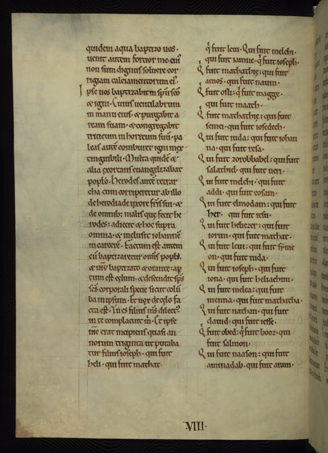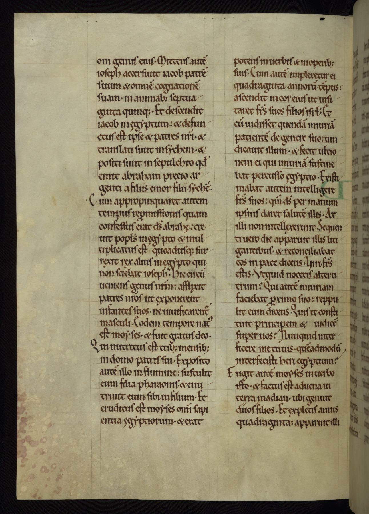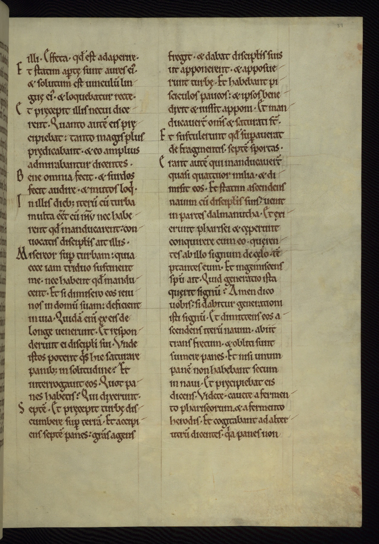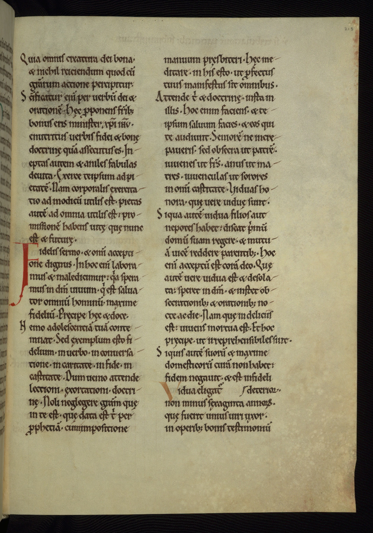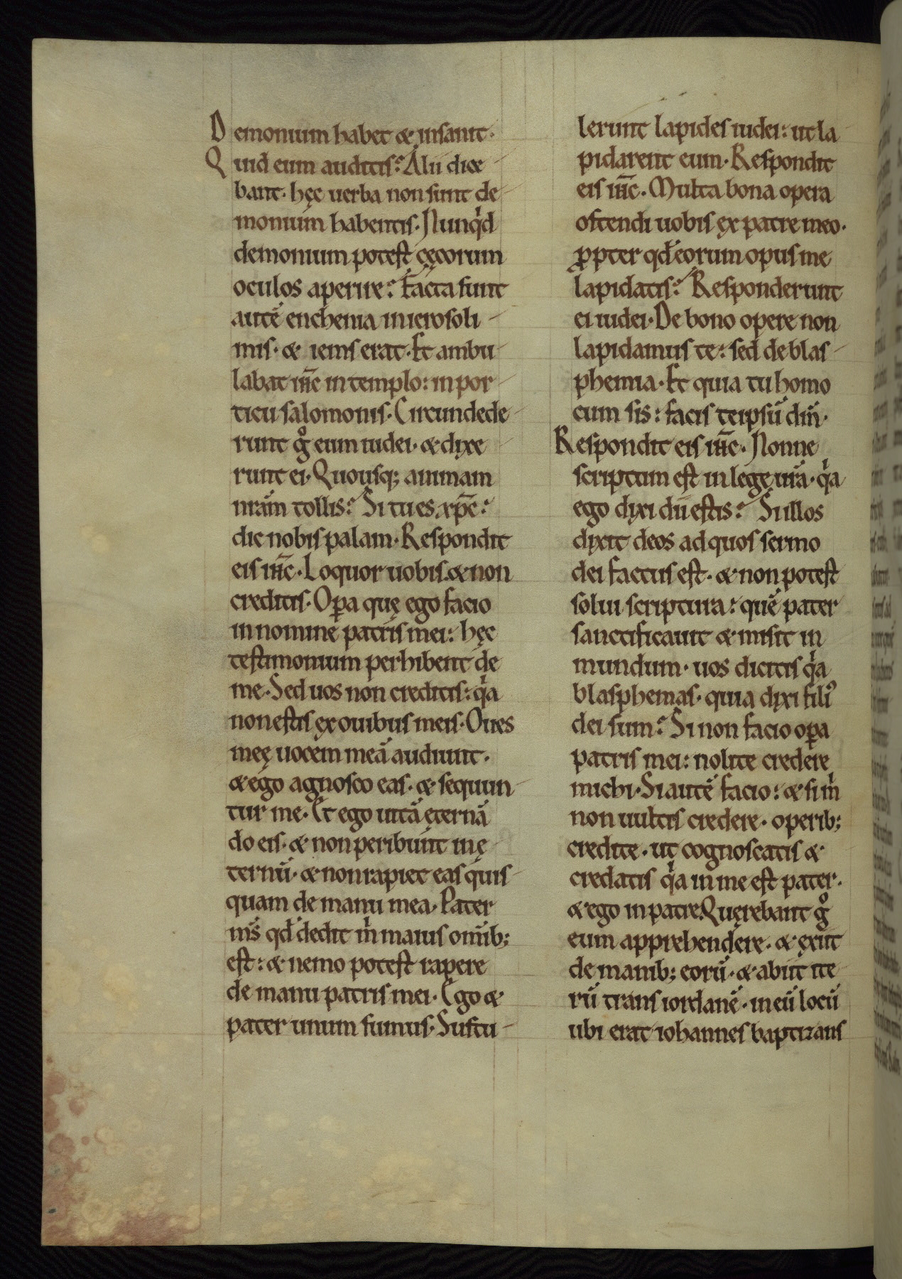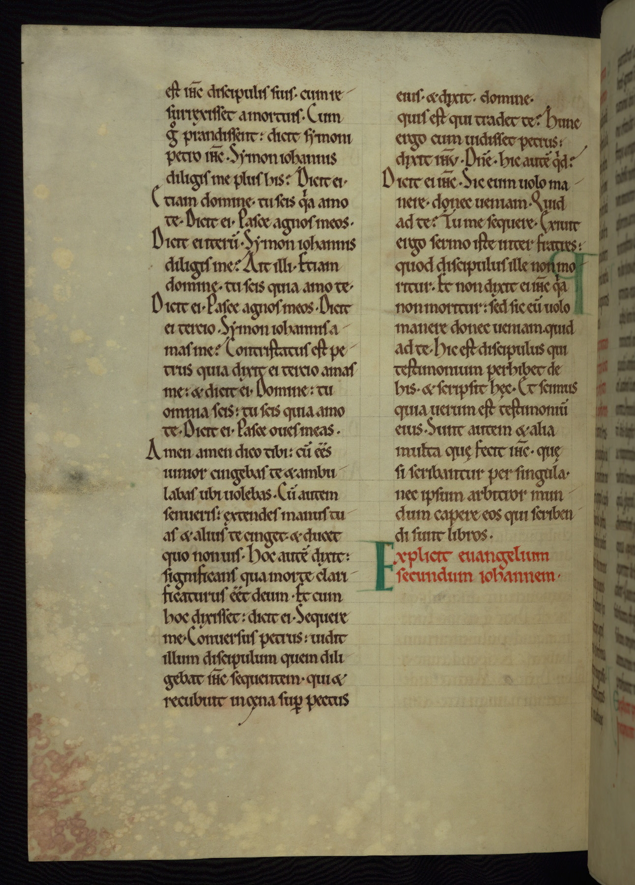 This large-format copy of the New Testament was almost certainly created at Rochester Cathedral Priory, England, in the first half of the twelfth century. It was part of a five-volume Bible, only one other volume of which, London, British Library Ms. Royal I.C.VII, has survived. The decorated initials in these manuscripts compare closely with those in other books securely attributed to Rochester. Textually these books are closely related to the Gundulph Bible (San Marino, Huntington Library Ms. HM 62), known to have been produced at Rochester in the second half of the eleventh century. Although neither the Walters' nor the British Library's volume includes an inscription associating this Bible with Rochester, the two medieval catalogs of the Rochester Cathedral library, produced around 1130 and in 1202, contain references to manuscripts that correspond well with them. The book’s large size indicates it that was designed to be read aloud, either during services or at meals in the refectory. Large, fanciful initials filled with succulent foliage, fruit, dragons, animals, and human faces begin each section of the text. Executed in a vibrant palette of red, blue, green, ochre (in place of gold), and yellow, the intricate, dynamic designs capture the essence of Romanesque manuscript illumination. Royal I.C.VII also includes four historiated initials (for the books of Joshua, I Samuel, 2 Samuel, and 2 Kings). Although the Bible was made at Rochester, the pre-Gothic script of W.18 in particular is extremely close to that practiced at nearby Canterbury at the time.