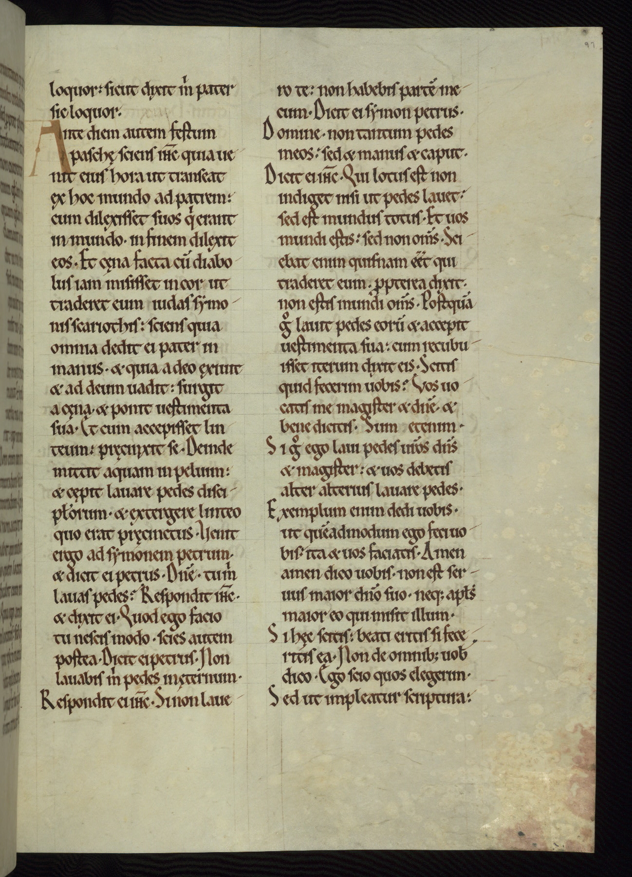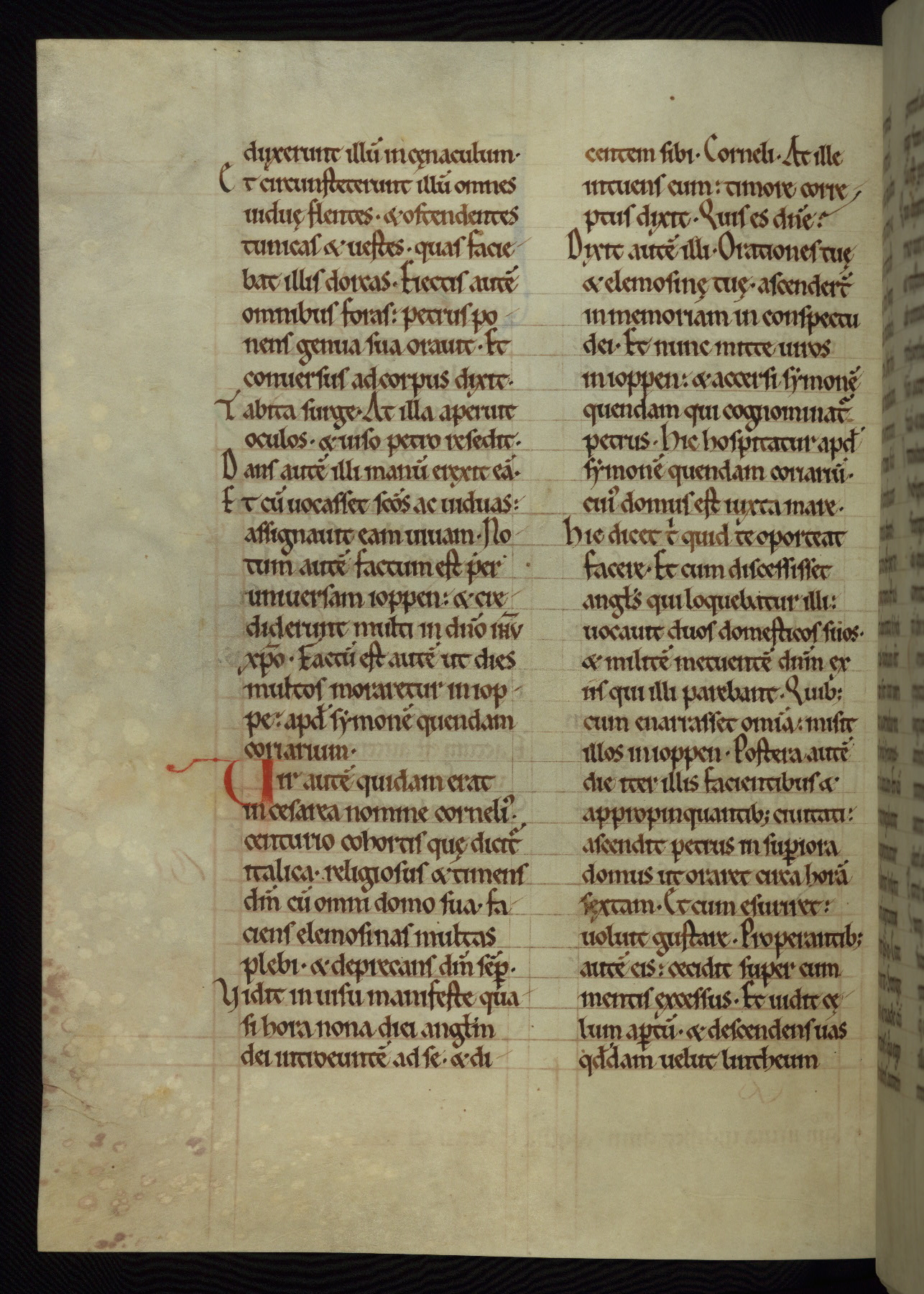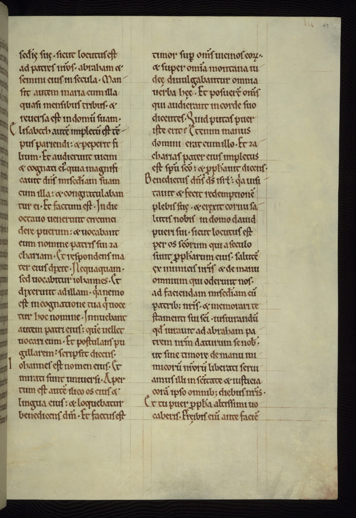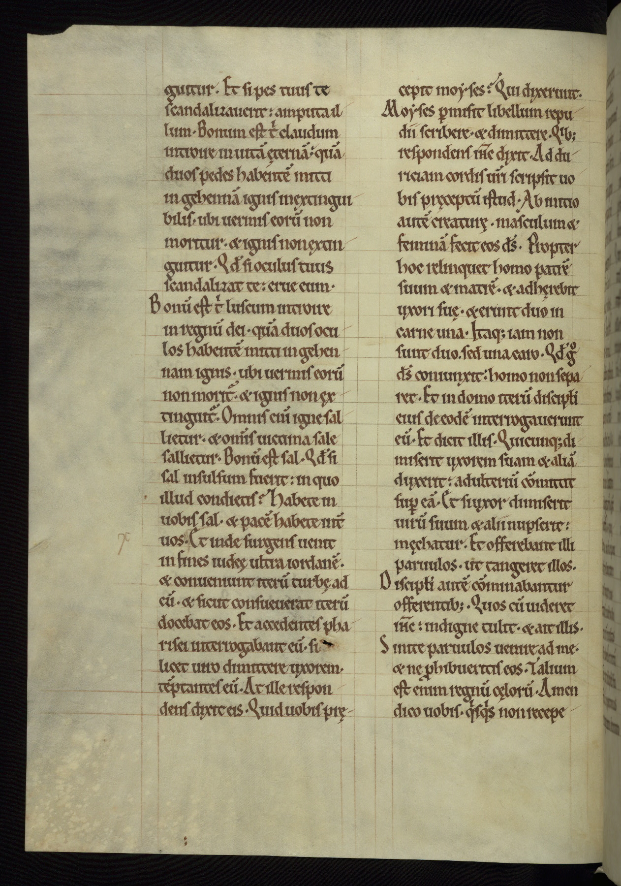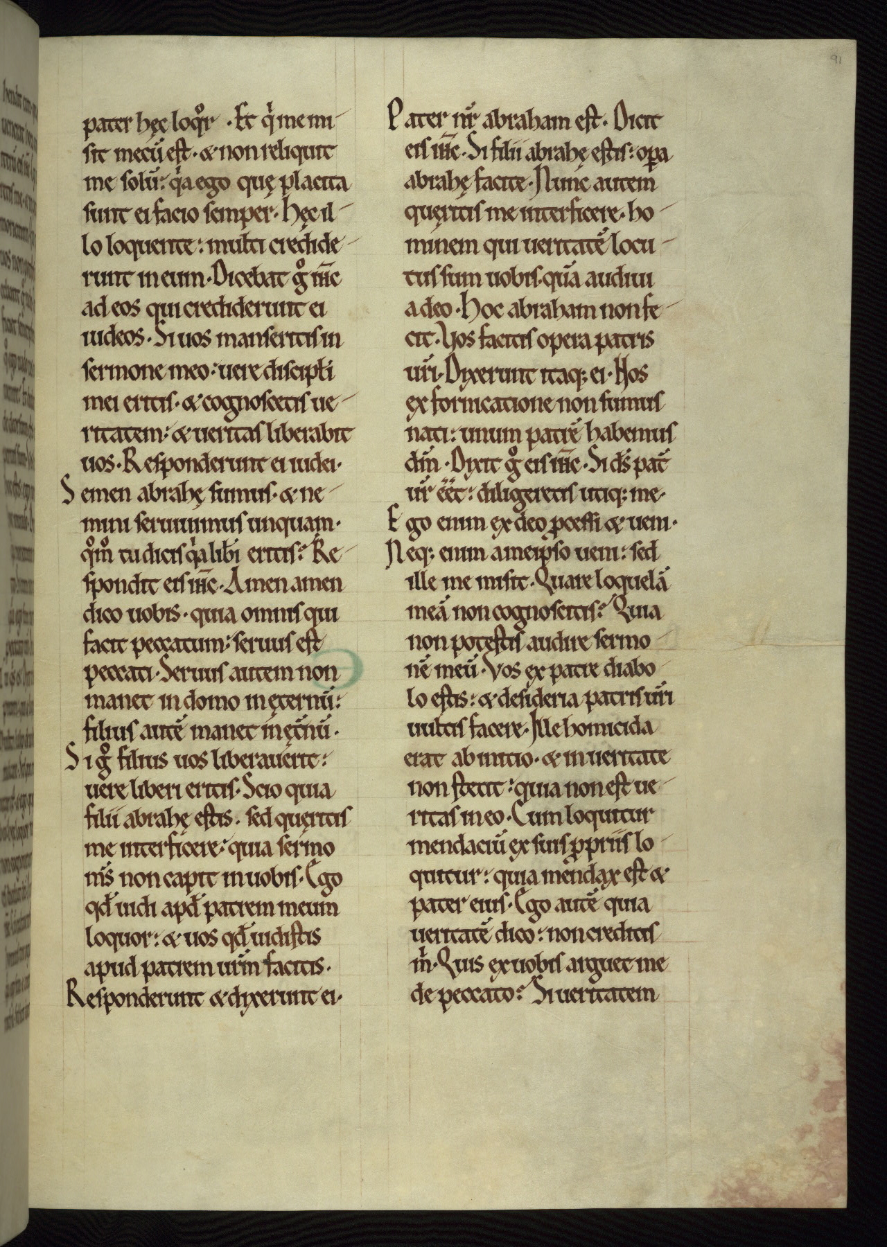 This large-format copy of the New Testament was almost certainly created at Rochester Cathedral Priory, England, in the first half of the twelfth century. It was part of a five-volume Bible, only one other volume of which, London, British Library Ms. Royal I.C.VII, has survived. The decorated initials in these manuscripts compare closely with those in other books securely attributed to Rochester. Textually these books are closely related to the Gundulph Bible (San Marino, Huntington Library Ms. HM 62), known to have been produced at Rochester in the second half of the eleventh century. Although neither the Walters' nor the British Library's volume includes an inscription associating this Bible with Rochester, the two medieval catalogs of the Rochester Cathedral library, produced around 1130 and in 1202, contain references to manuscripts that correspond well with them. The book’s large size indicates it that was designed to be read aloud, either during services or at meals in the refectory. Large, fanciful initials filled with succulent foliage, fruit, dragons, animals, and human faces begin each section of the text. Executed in a vibrant palette of red, blue, green, ochre (in place of gold), and yellow, the intricate, dynamic designs capture the essence of Romanesque manuscript illumination. Royal I.C.VII also includes four historiated initials (for the books of Joshua, I Samuel, 2 Samuel, and 2 Kings). Although the Bible was made at Rochester, the pre-Gothic script of W.18 in particular is extremely close to that practiced at nearby Canterbury at the time.