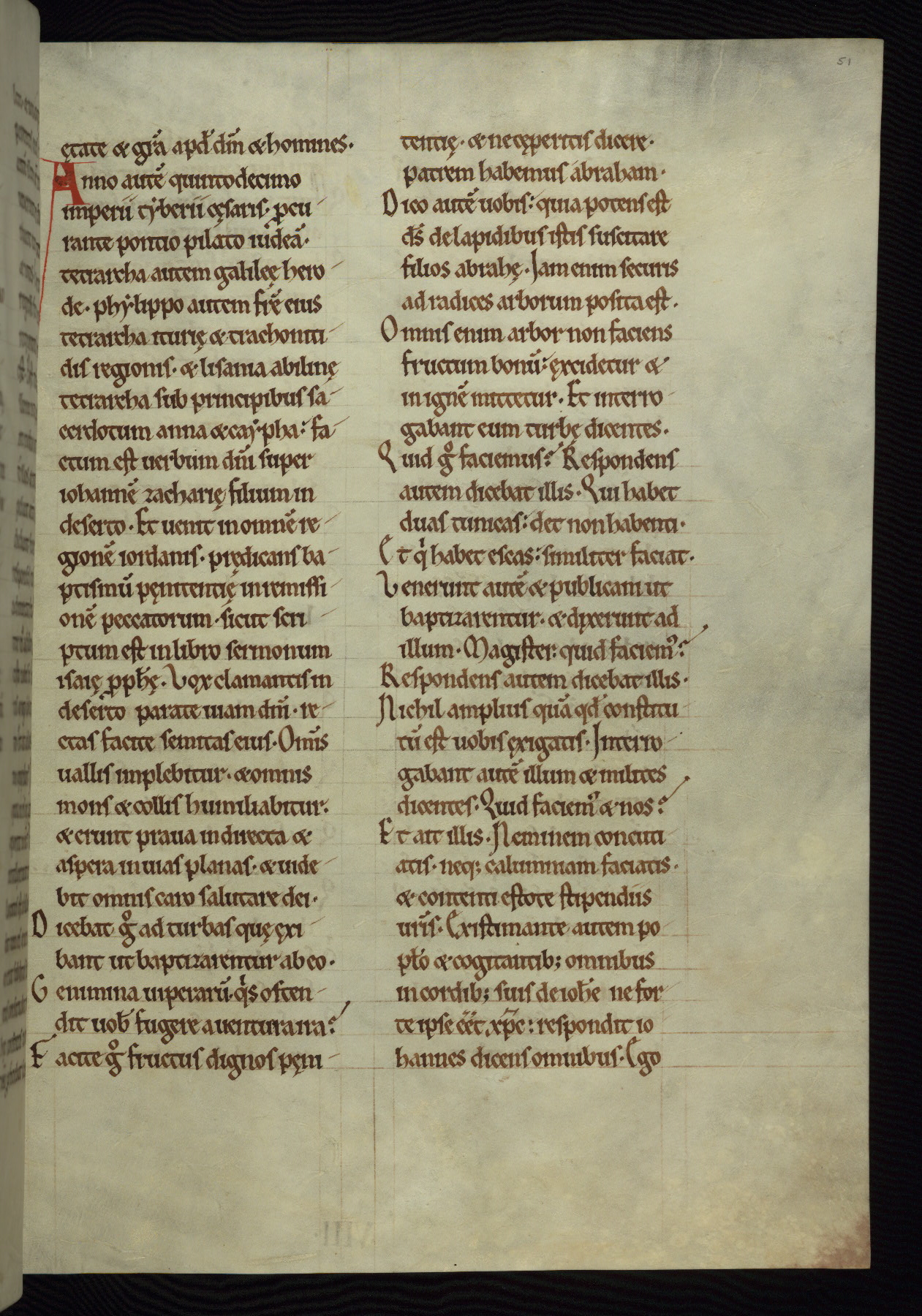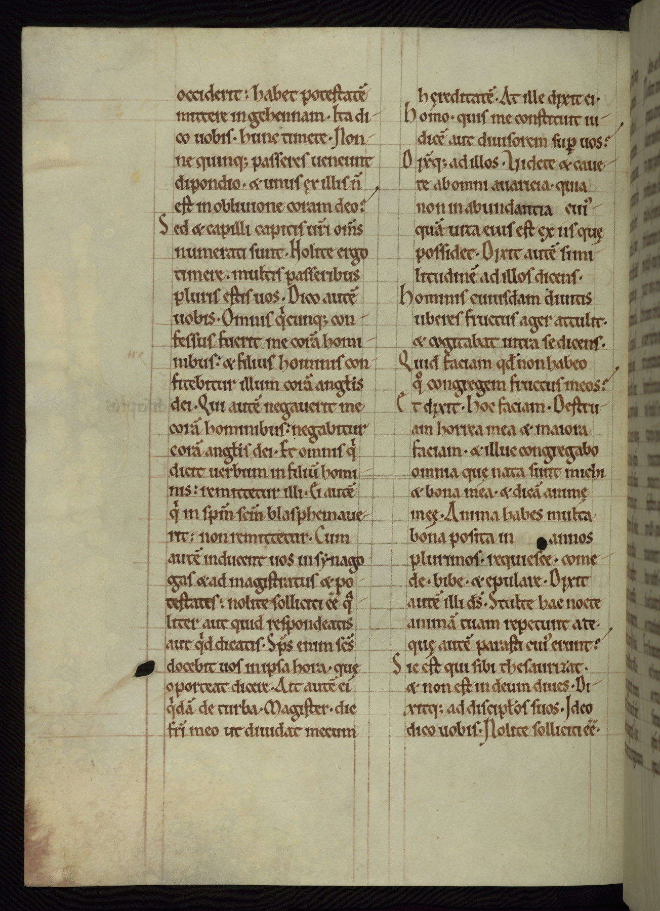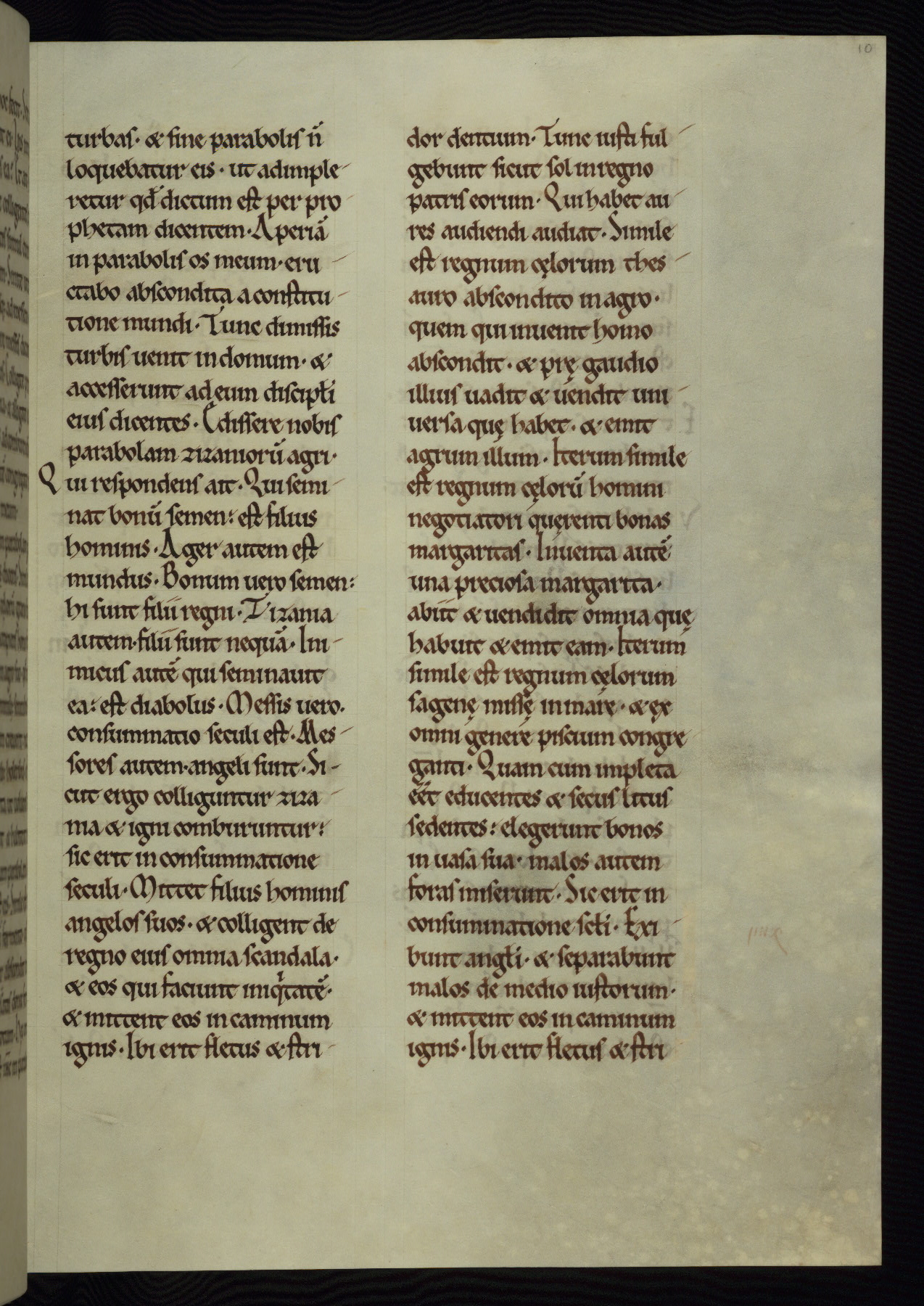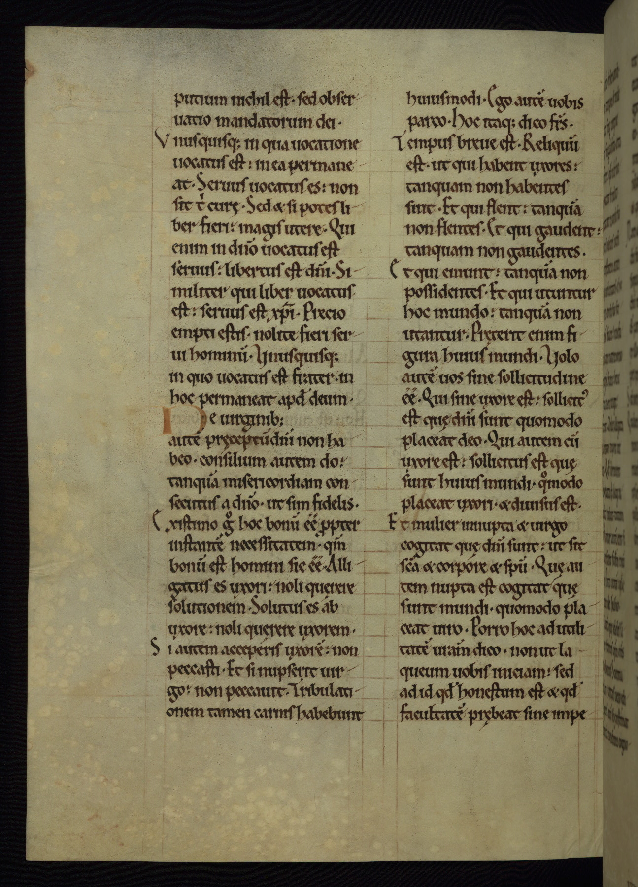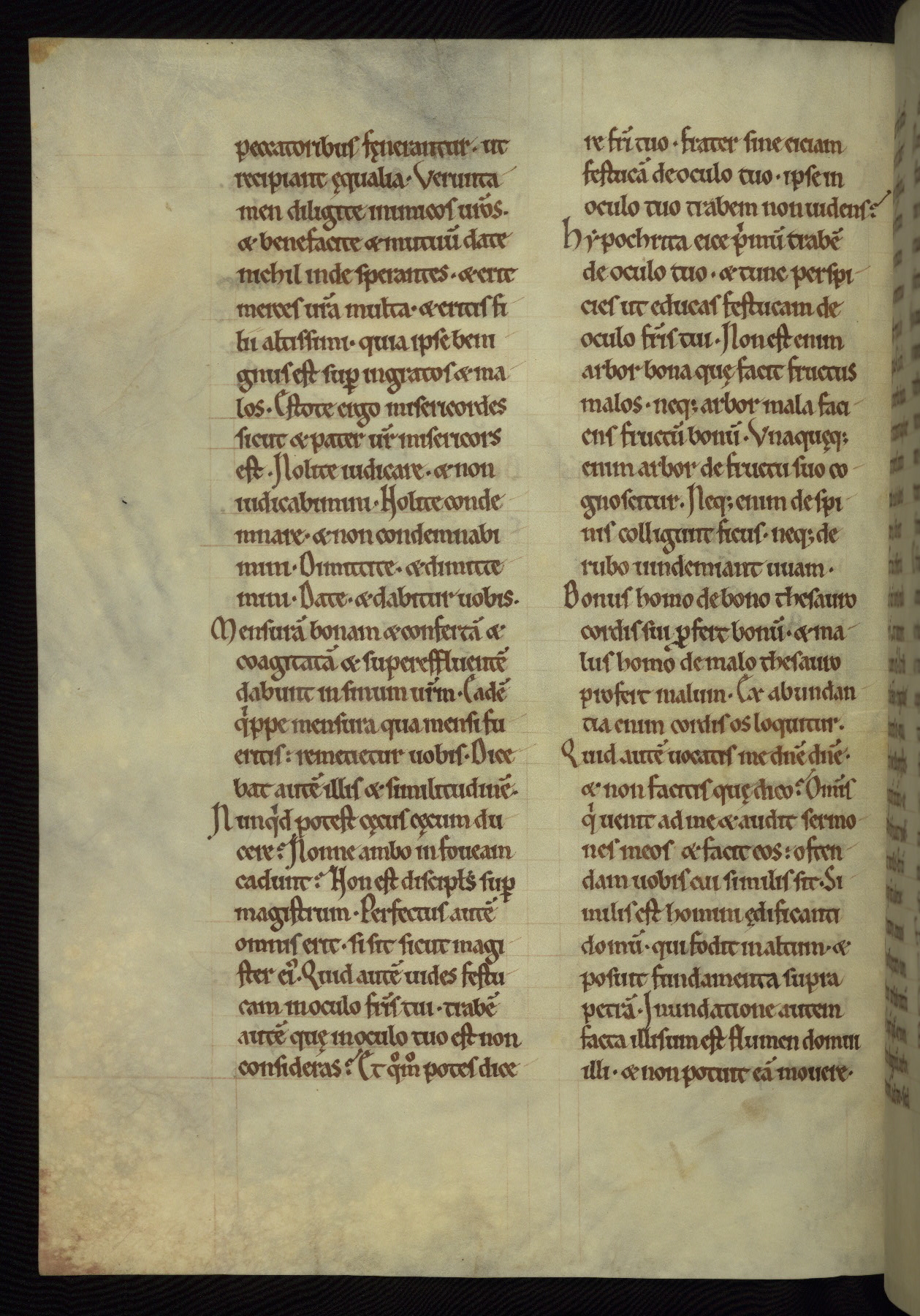 This large-format copy of the New Testament was almost certainly created at Rochester Cathedral Priory, England, in the first half of the twelfth century. It was part of a five-volume Bible, only one other volume of which, London, British Library Ms. Royal I.C.VII, has survived. The decorated initials in these manuscripts compare closely with those in other books securely attributed to Rochester. Textually these books are closely related to the Gundulph Bible (San Marino, Huntington Library Ms. HM 62), known to have been produced at Rochester in the second half of the eleventh century. Although neither the Walters' nor the British Library's volume includes an inscription associating this Bible with Rochester, the two medieval catalogs of the Rochester Cathedral library, produced around 1130 and in 1202, contain references to manuscripts that correspond well with them. The book’s large size indicates it that was designed to be read aloud, either during services or at meals in the refectory. Large, fanciful initials filled with succulent foliage, fruit, dragons, animals, and human faces begin each section of the text. Executed in a vibrant palette of red, blue, green, ochre (in place of gold), and yellow, the intricate, dynamic designs capture the essence of Romanesque manuscript illumination. Royal I.C.VII also includes four historiated initials (for the books of Joshua, I Samuel, 2 Samuel, and 2 Kings). Although the Bible was made at Rochester, the pre-Gothic script of W.18 in particular is extremely close to that practiced at nearby Canterbury at the time.