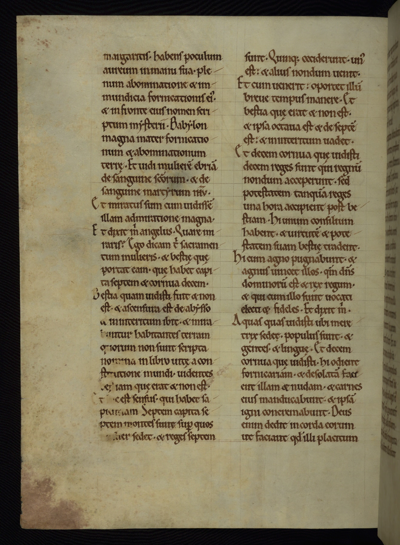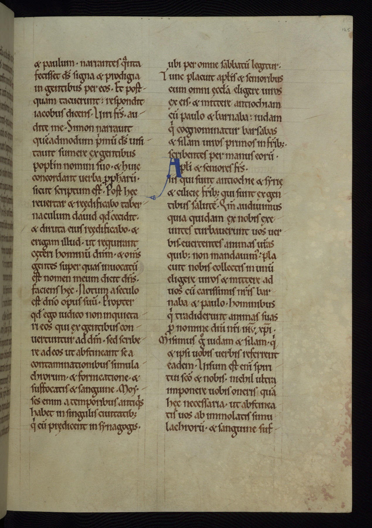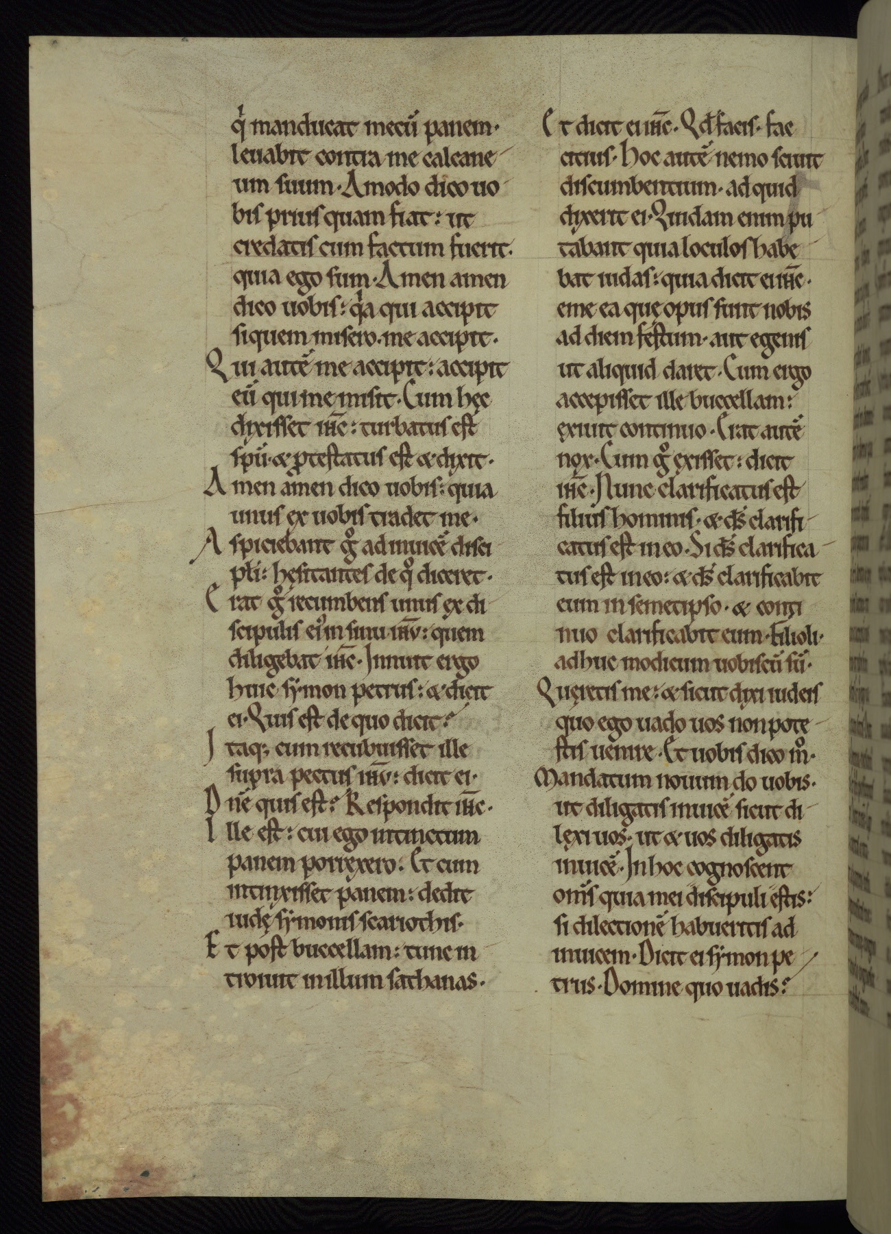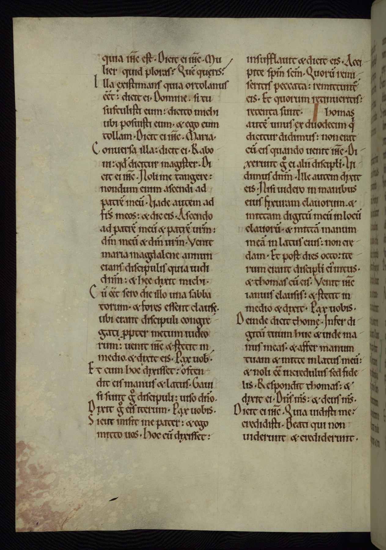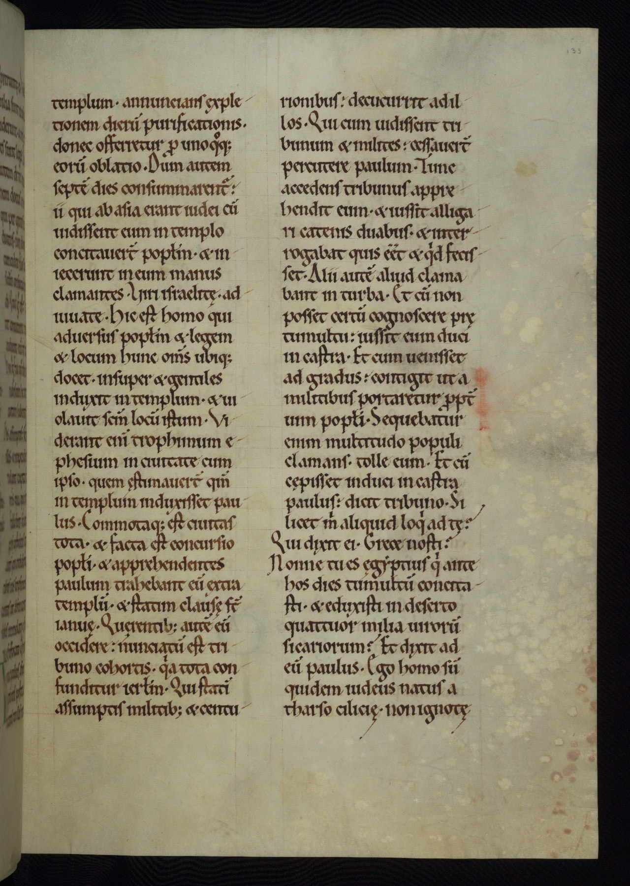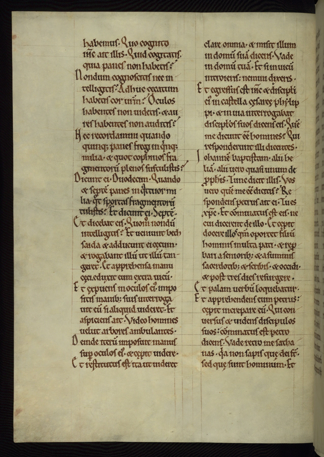 This large-format copy of the New Testament was almost certainly created at Rochester Cathedral Priory, England, in the first half of the twelfth century. It was part of a five-volume Bible, only one other volume of which, London, British Library Ms. Royal I.C.VII, has survived. The decorated initials in these manuscripts compare closely with those in other books securely attributed to Rochester. Textually these books are closely related to the Gundulph Bible (San Marino, Huntington Library Ms. HM 62), known to have been produced at Rochester in the second half of the eleventh century. Although neither the Walters' nor the British Library's volume includes an inscription associating this Bible with Rochester, the two medieval catalogs of the Rochester Cathedral library, produced around 1130 and in 1202, contain references to manuscripts that correspond well with them. The book’s large size indicates it that was designed to be read aloud, either during services or at meals in the refectory. Large, fanciful initials filled with succulent foliage, fruit, dragons, animals, and human faces begin each section of the text. Executed in a vibrant palette of red, blue, green, ochre (in place of gold), and yellow, the intricate, dynamic designs capture the essence of Romanesque manuscript illumination. Royal I.C.VII also includes four historiated initials (for the books of Joshua, I Samuel, 2 Samuel, and 2 Kings). Although the Bible was made at Rochester, the pre-Gothic script of W.18 in particular is extremely close to that practiced at nearby Canterbury at the time.