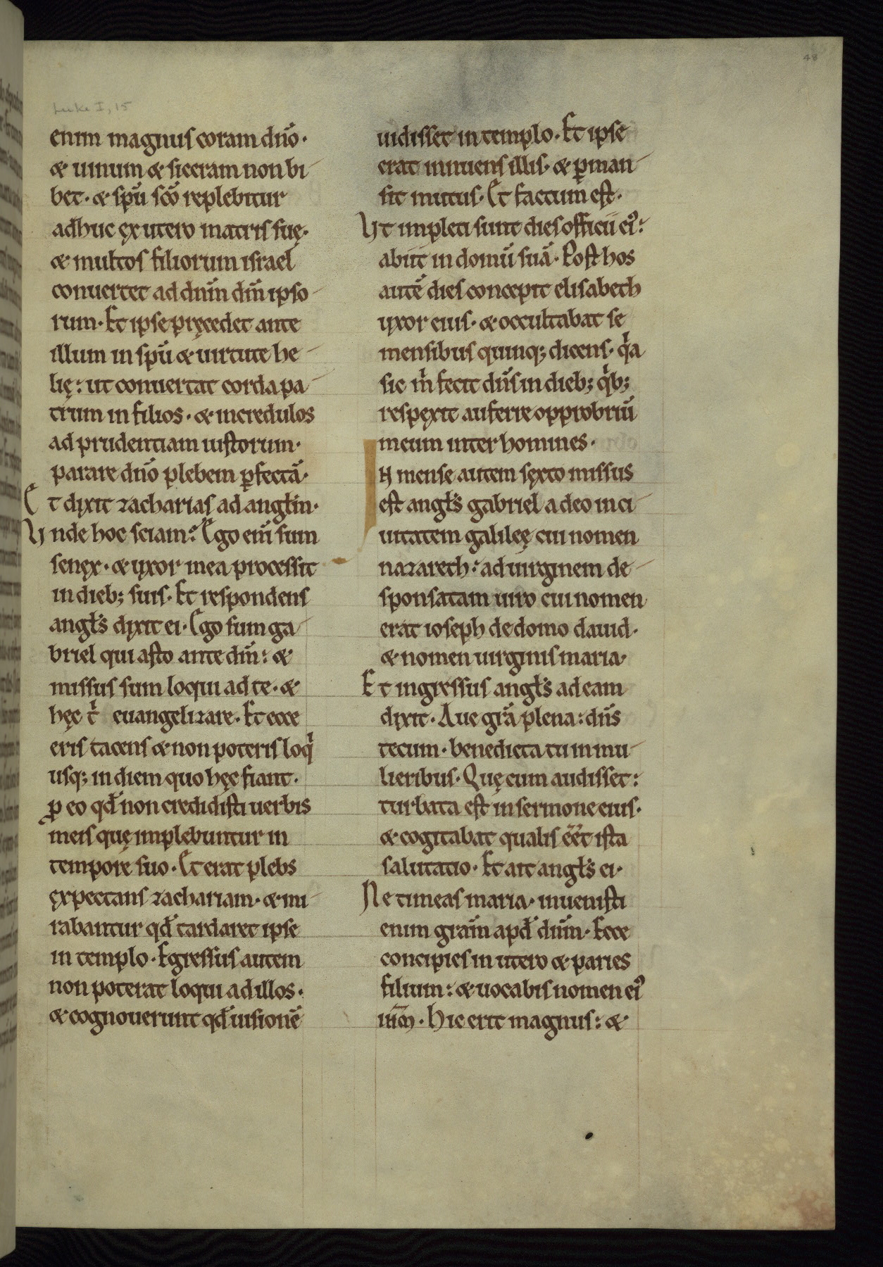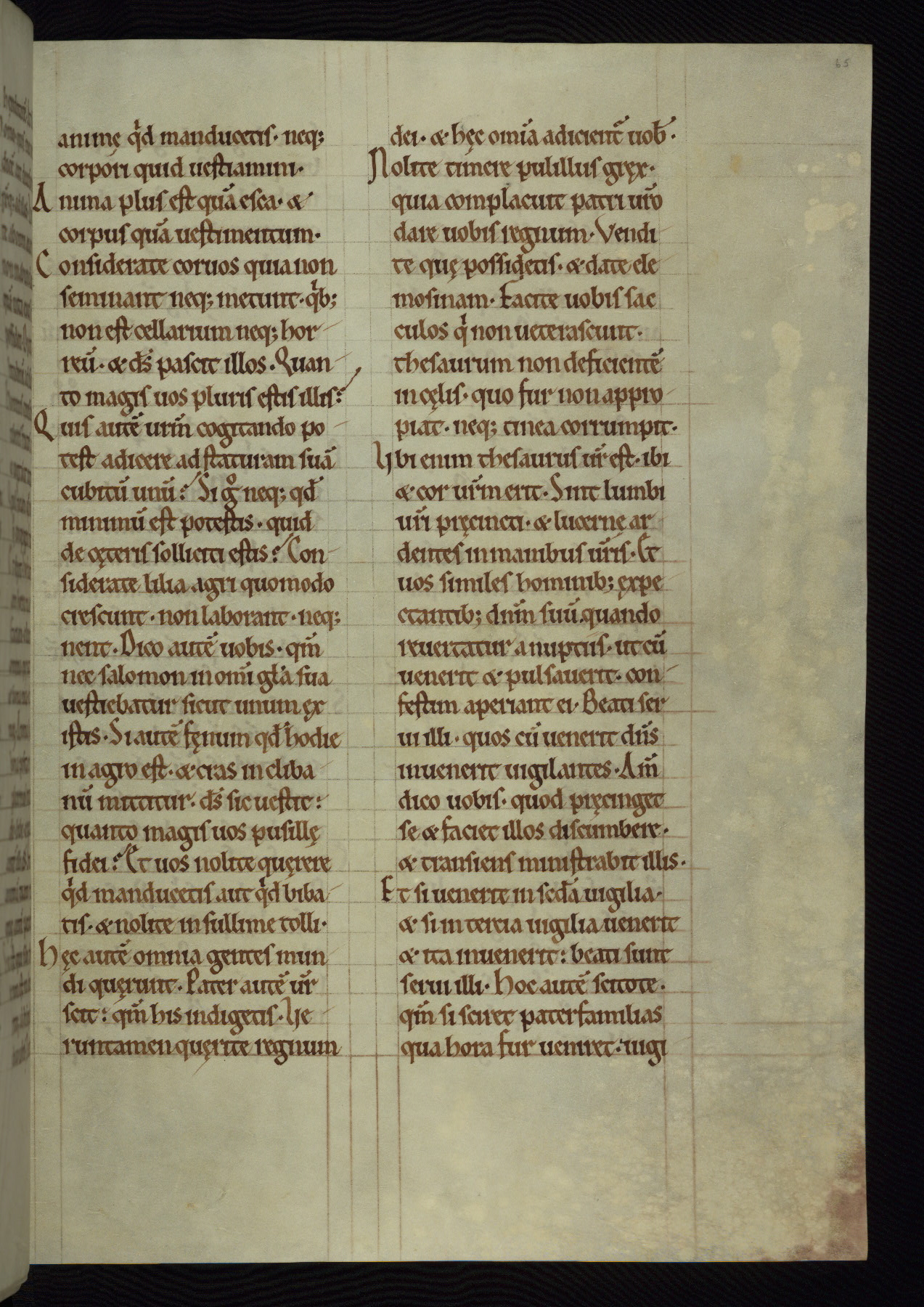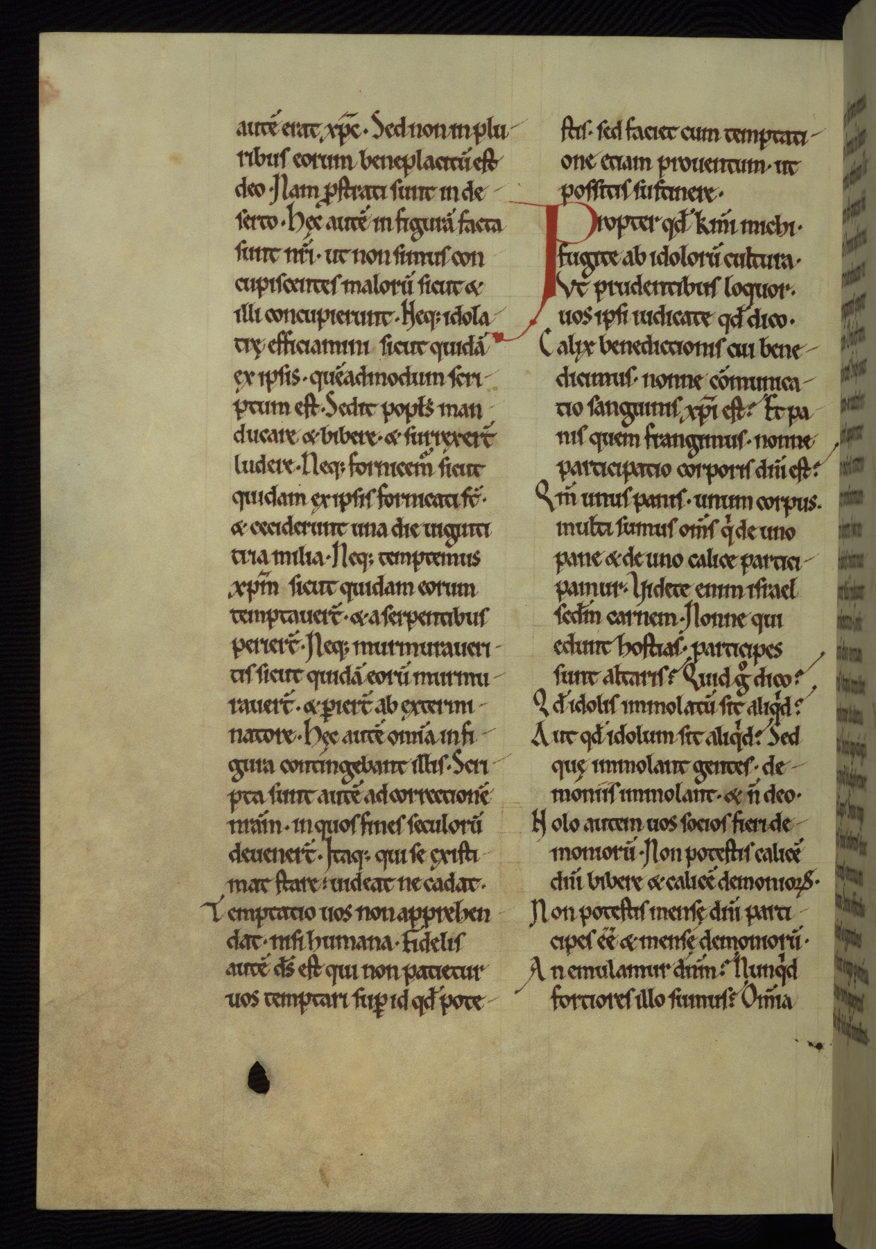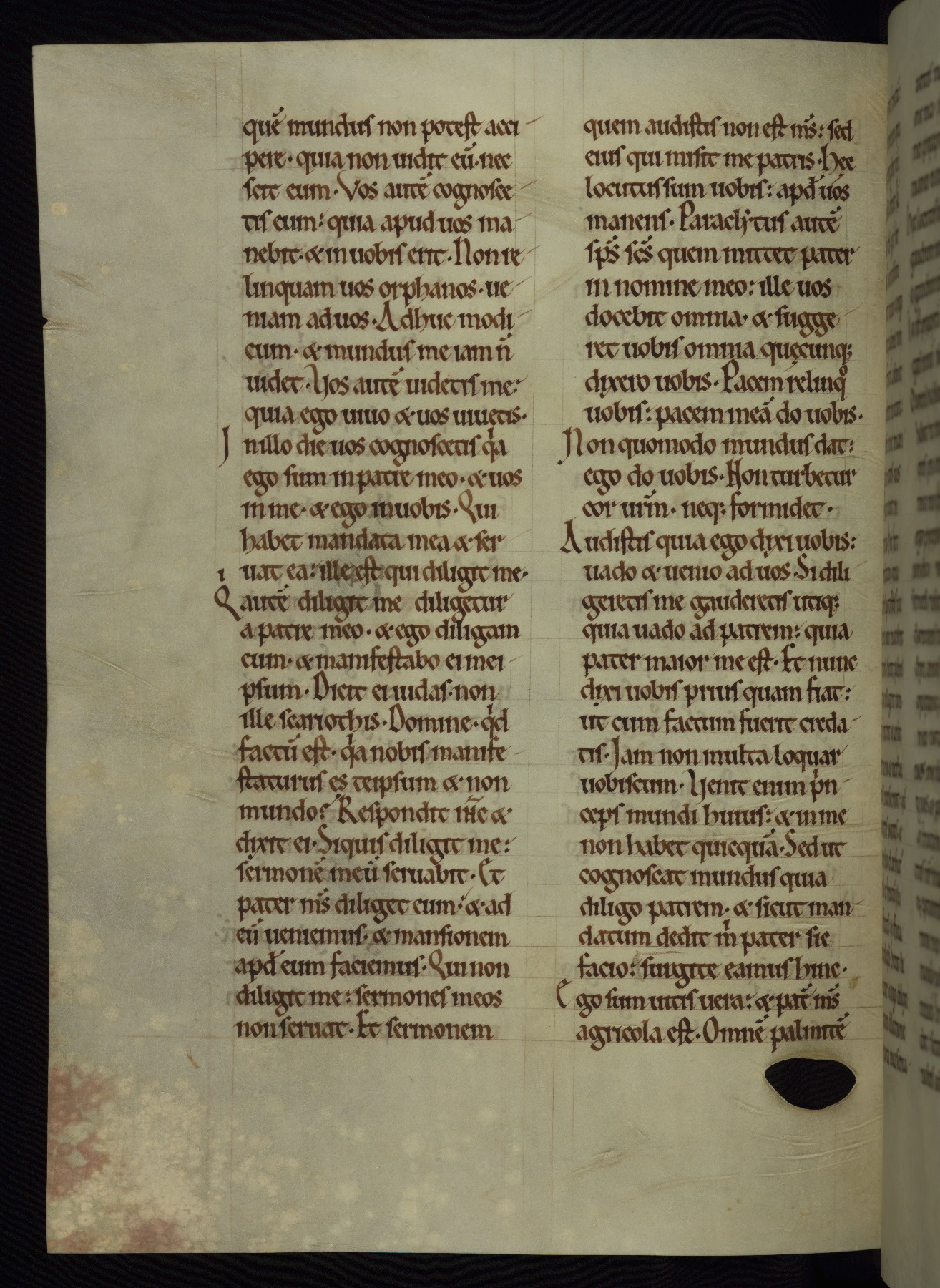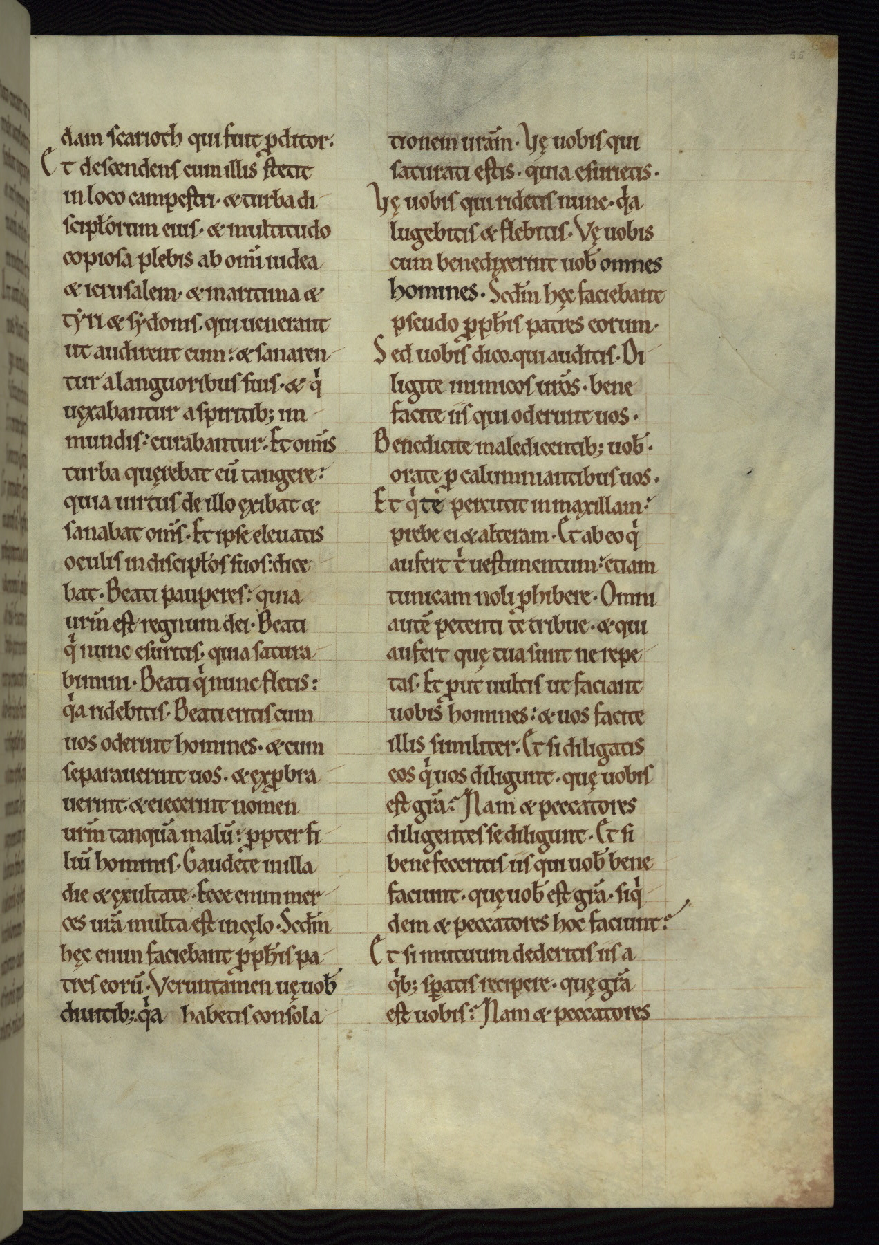 This large-format copy of the New Testament was almost certainly created at Rochester Cathedral Priory, England, in the first half of the twelfth century. It was part of a five-volume Bible, only one other volume of which, London, British Library Ms. Royal I.C.VII, has survived. The decorated initials in these manuscripts compare closely with those in other books securely attributed to Rochester. Textually these books are closely related to the Gundulph Bible (San Marino, Huntington Library Ms. HM 62), known to have been produced at Rochester in the second half of the eleventh century. Although neither the Walters' nor the British Library's volume includes an inscription associating this Bible with Rochester, the two medieval catalogs of the Rochester Cathedral library, produced around 1130 and in 1202, contain references to manuscripts that correspond well with them. The book’s large size indicates it that was designed to be read aloud, either during services or at meals in the refectory. Large, fanciful initials filled with succulent foliage, fruit, dragons, animals, and human faces begin each section of the text. Executed in a vibrant palette of red, blue, green, ochre (in place of gold), and yellow, the intricate, dynamic designs capture the essence of Romanesque manuscript illumination. Royal I.C.VII also includes four historiated initials (for the books of Joshua, I Samuel, 2 Samuel, and 2 Kings). Although the Bible was made at Rochester, the pre-Gothic script of W.18 in particular is extremely close to that practiced at nearby Canterbury at the time.