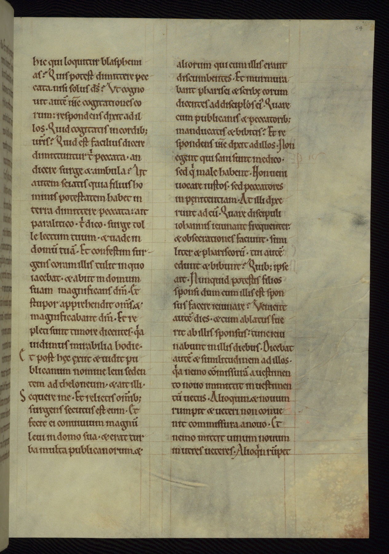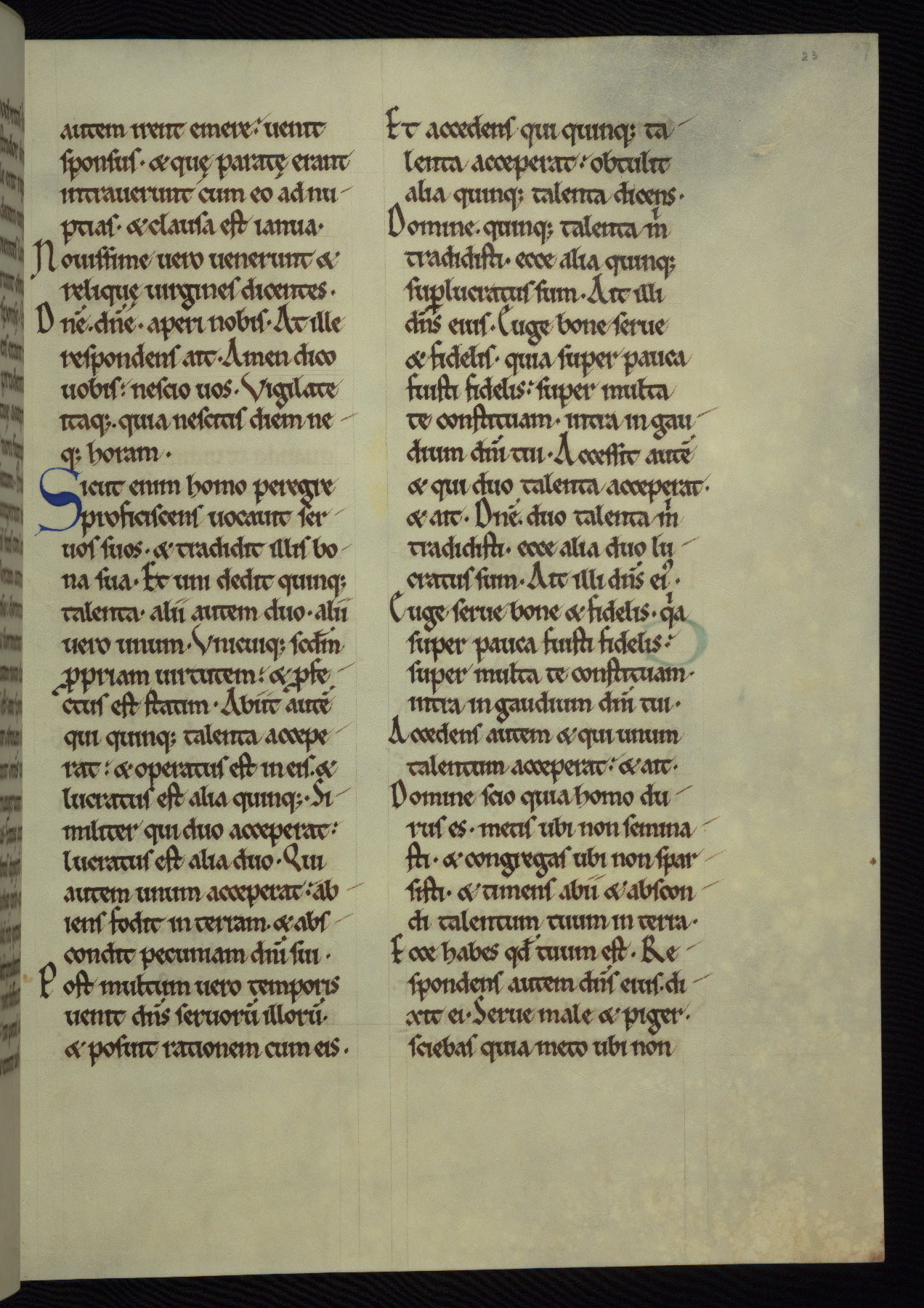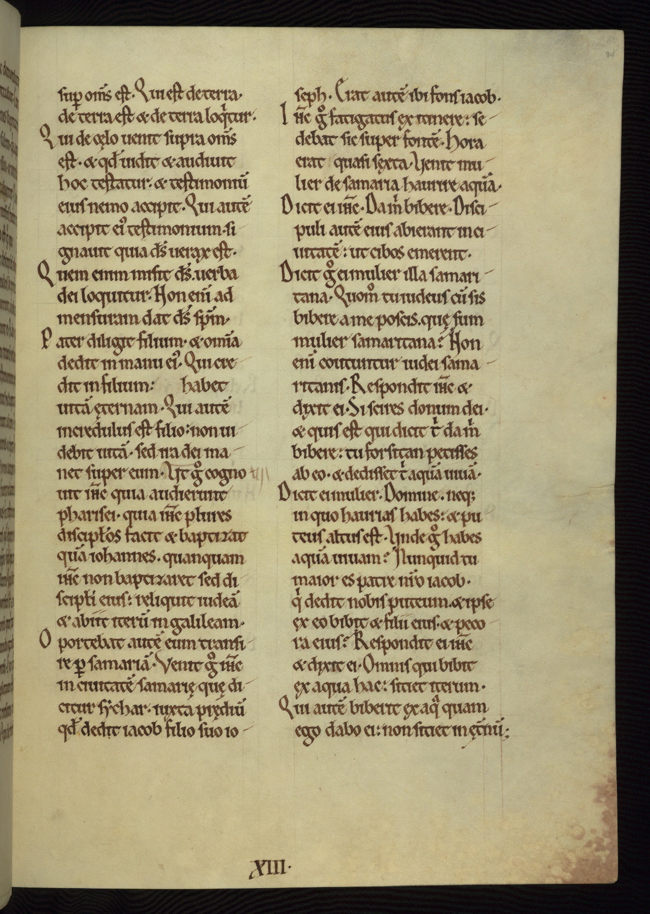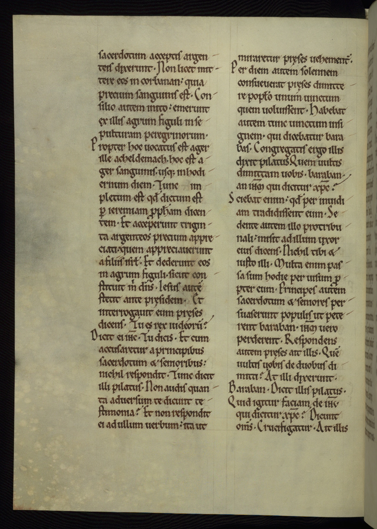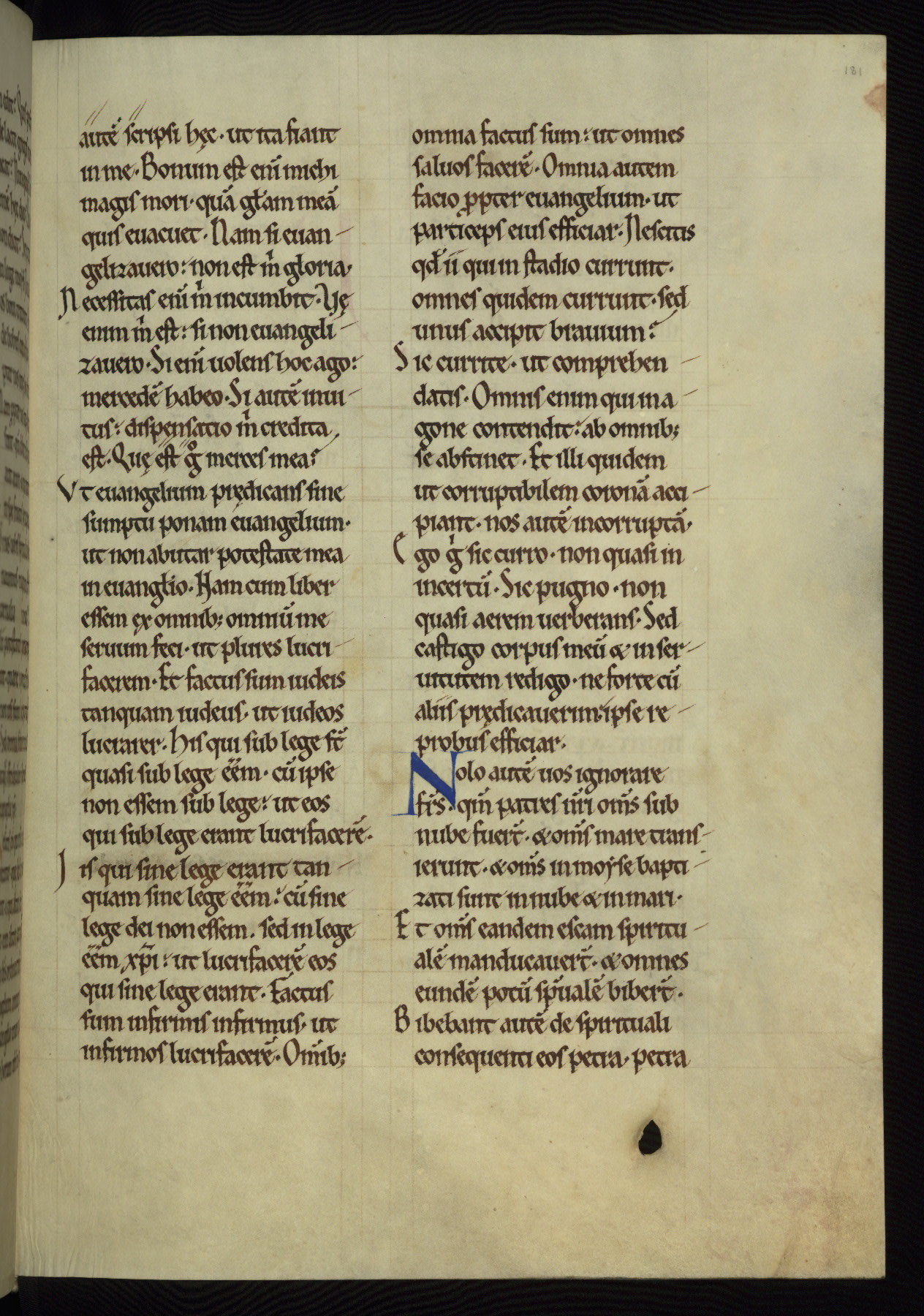 This large-format copy of the New Testament was almost certainly created at Rochester Cathedral Priory, England, in the first half of the twelfth century. It was part of a five-volume Bible, only one other volume of which, London, British Library Ms. Royal I.C.VII, has survived. The decorated initials in these manuscripts compare closely with those in other books securely attributed to Rochester. Textually these books are closely related to the Gundulph Bible (San Marino, Huntington Library Ms. HM 62), known to have been produced at Rochester in the second half of the eleventh century. Although neither the Walters' nor the British Library's volume includes an inscription associating this Bible with Rochester, the two medieval catalogs of the Rochester Cathedral library, produced around 1130 and in 1202, contain references to manuscripts that correspond well with them. The book’s large size indicates it that was designed to be read aloud, either during services or at meals in the refectory. Large, fanciful initials filled with succulent foliage, fruit, dragons, animals, and human faces begin each section of the text. Executed in a vibrant palette of red, blue, green, ochre (in place of gold), and yellow, the intricate, dynamic designs capture the essence of Romanesque manuscript illumination. Royal I.C.VII also includes four historiated initials (for the books of Joshua, I Samuel, 2 Samuel, and 2 Kings). Although the Bible was made at Rochester, the pre-Gothic script of W.18 in particular is extremely close to that practiced at nearby Canterbury at the time.